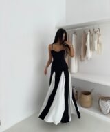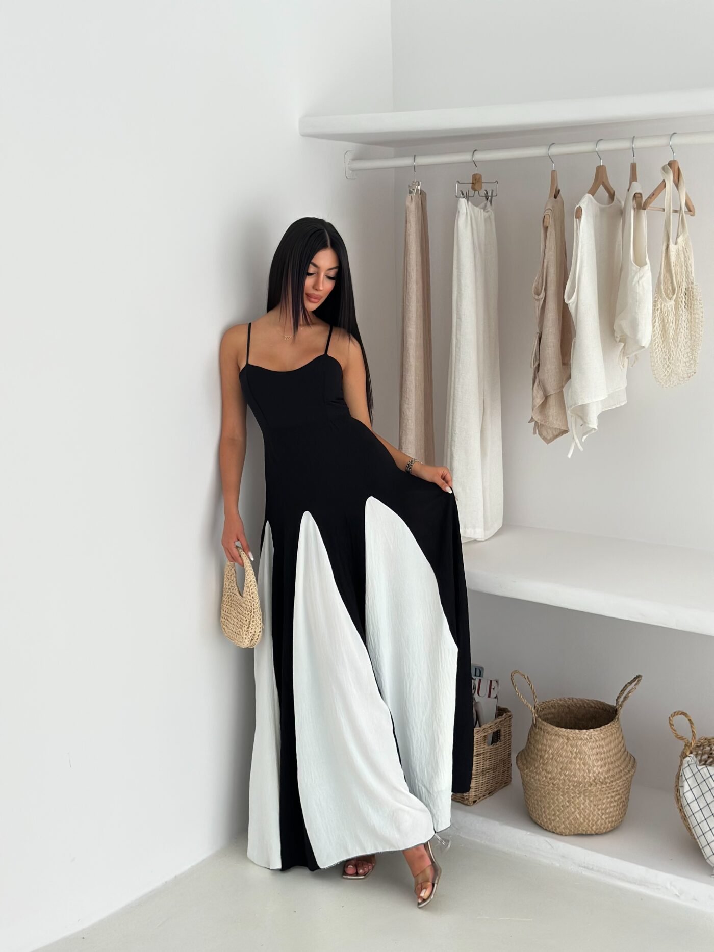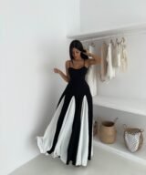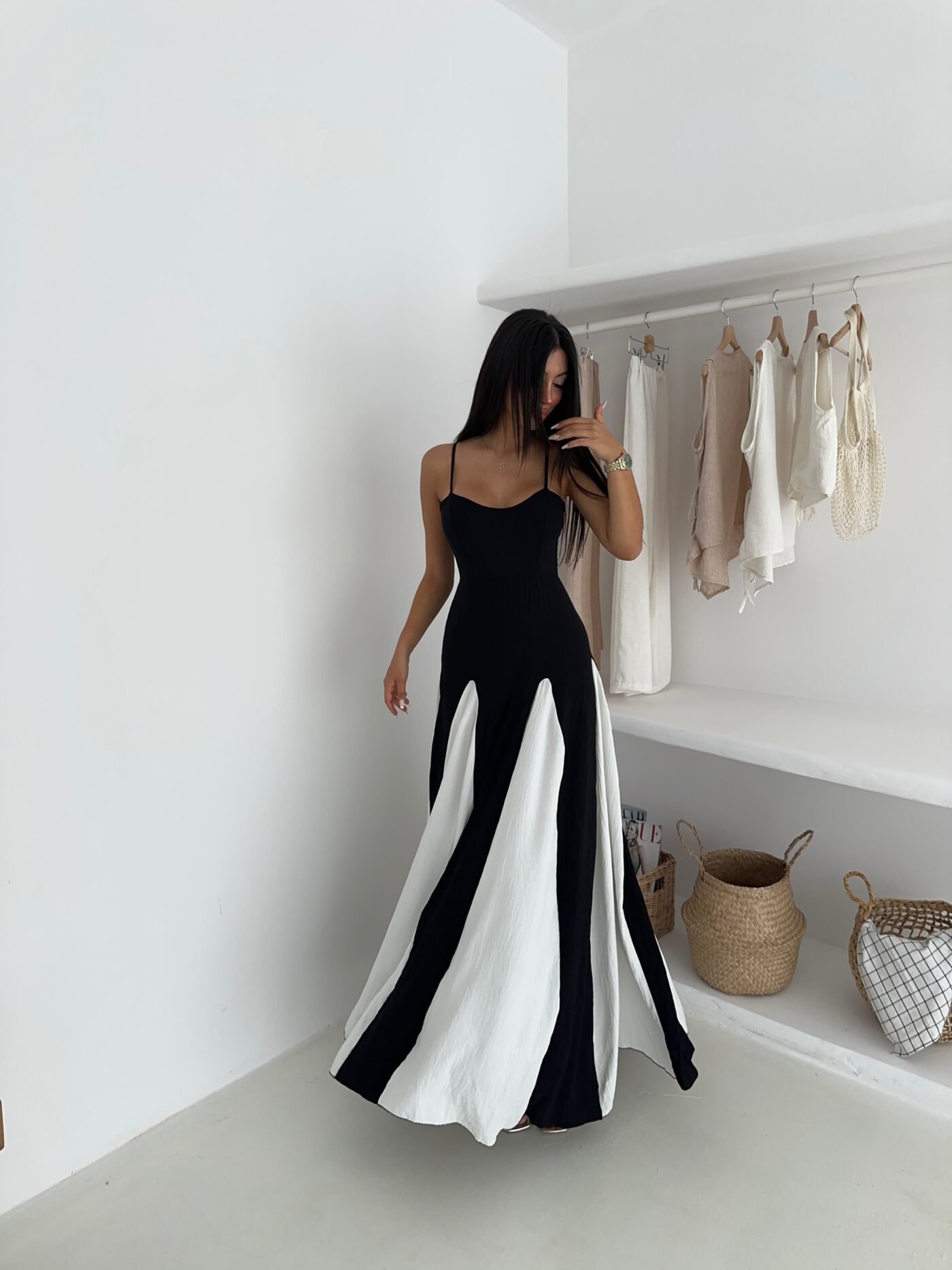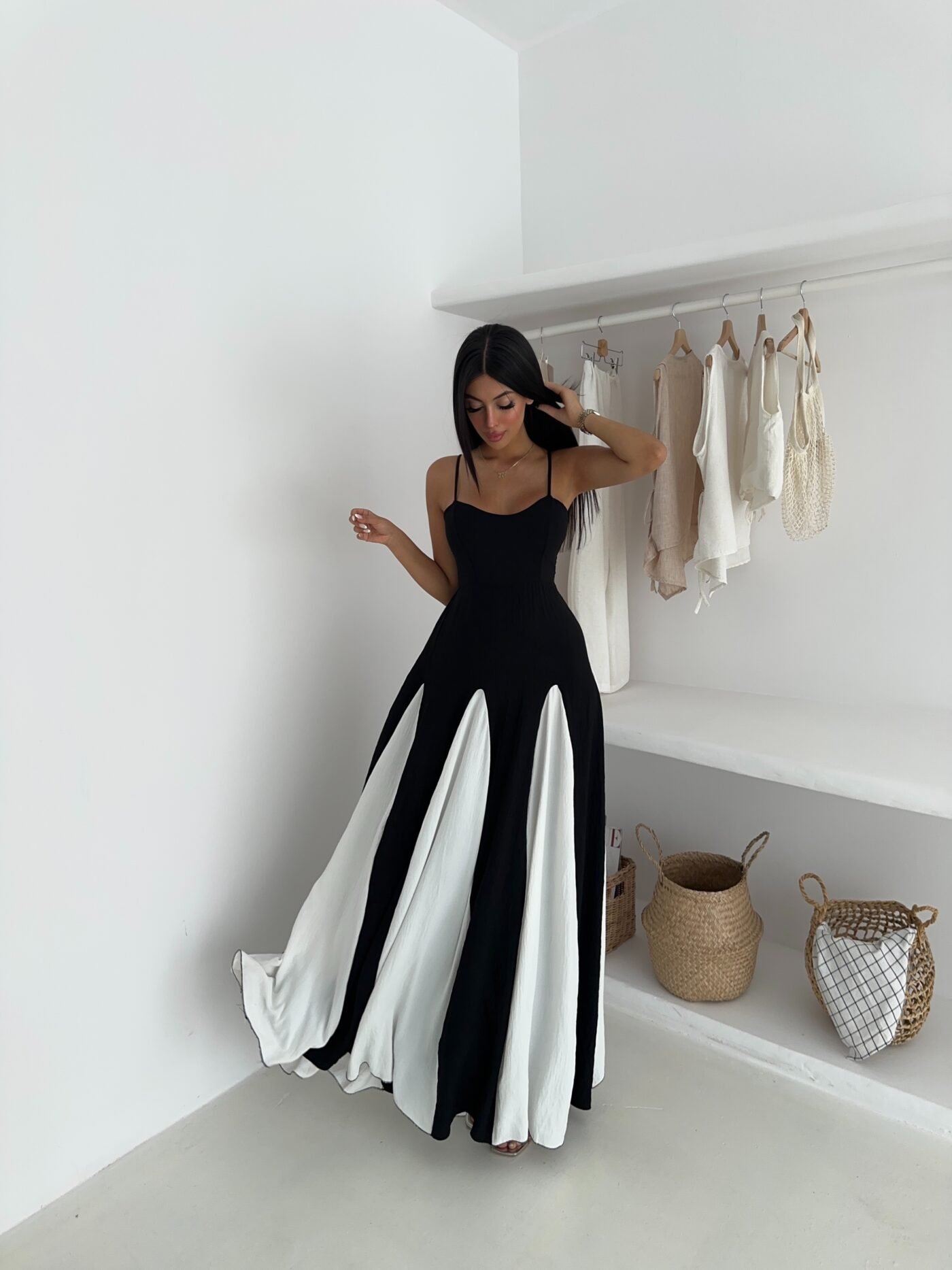 A statement monochrome maxi dress featuring a sleek black bodice and flowing white contrast panels. Designed for effortless elegance and ultimate comfort, perfect for both day and evening occasions.