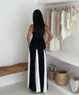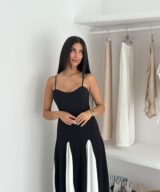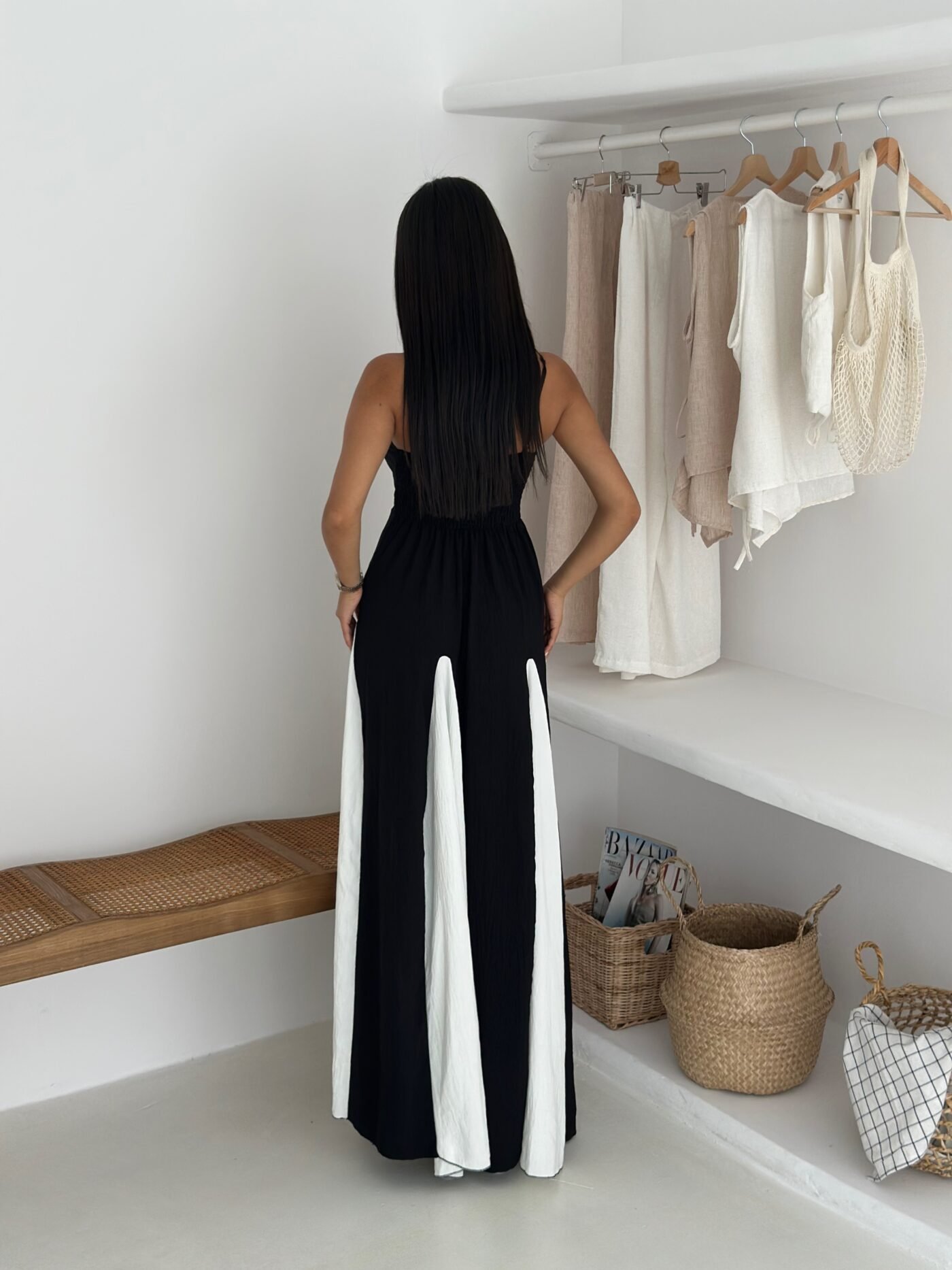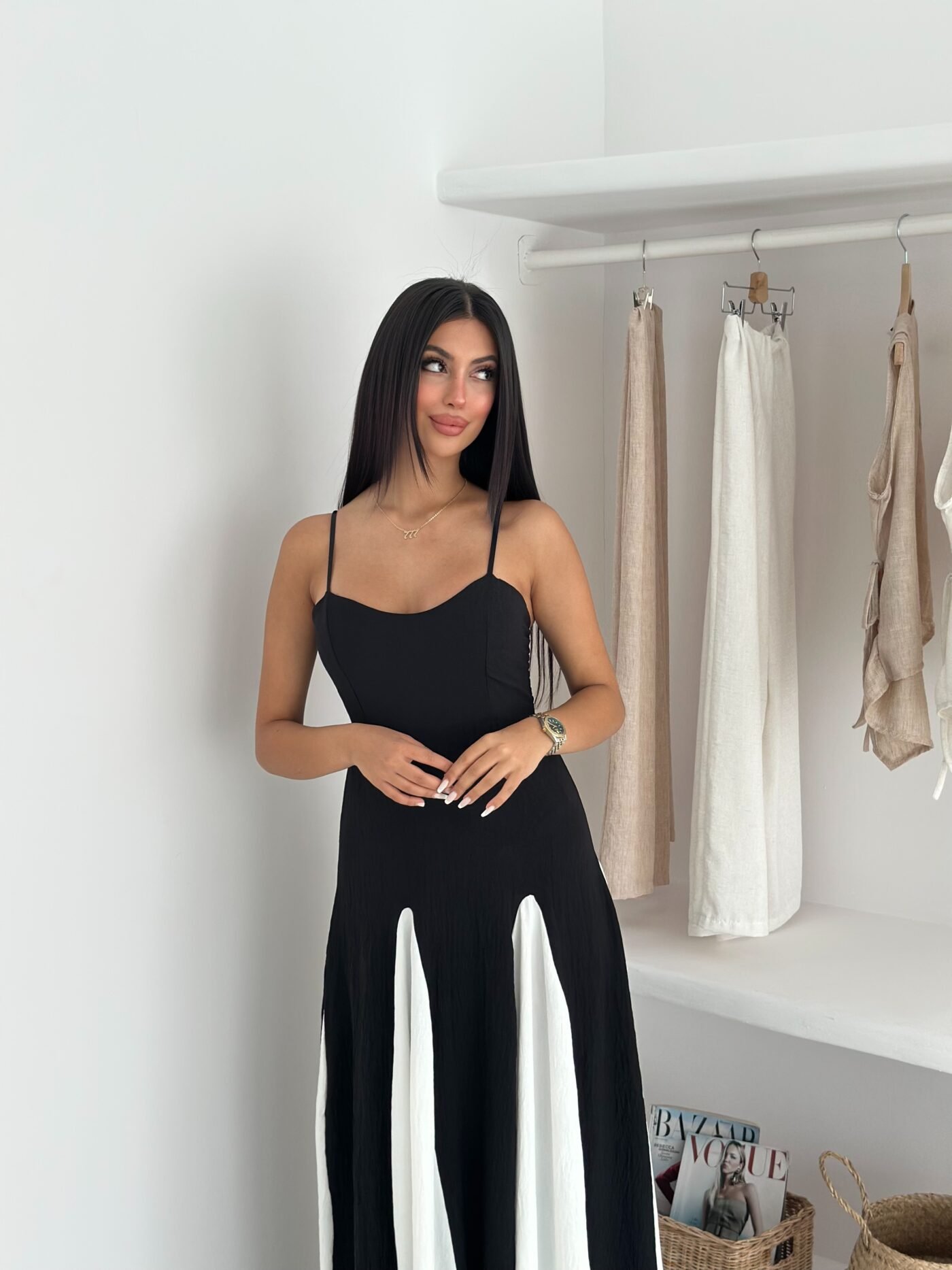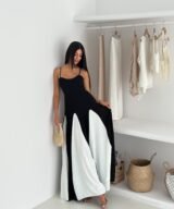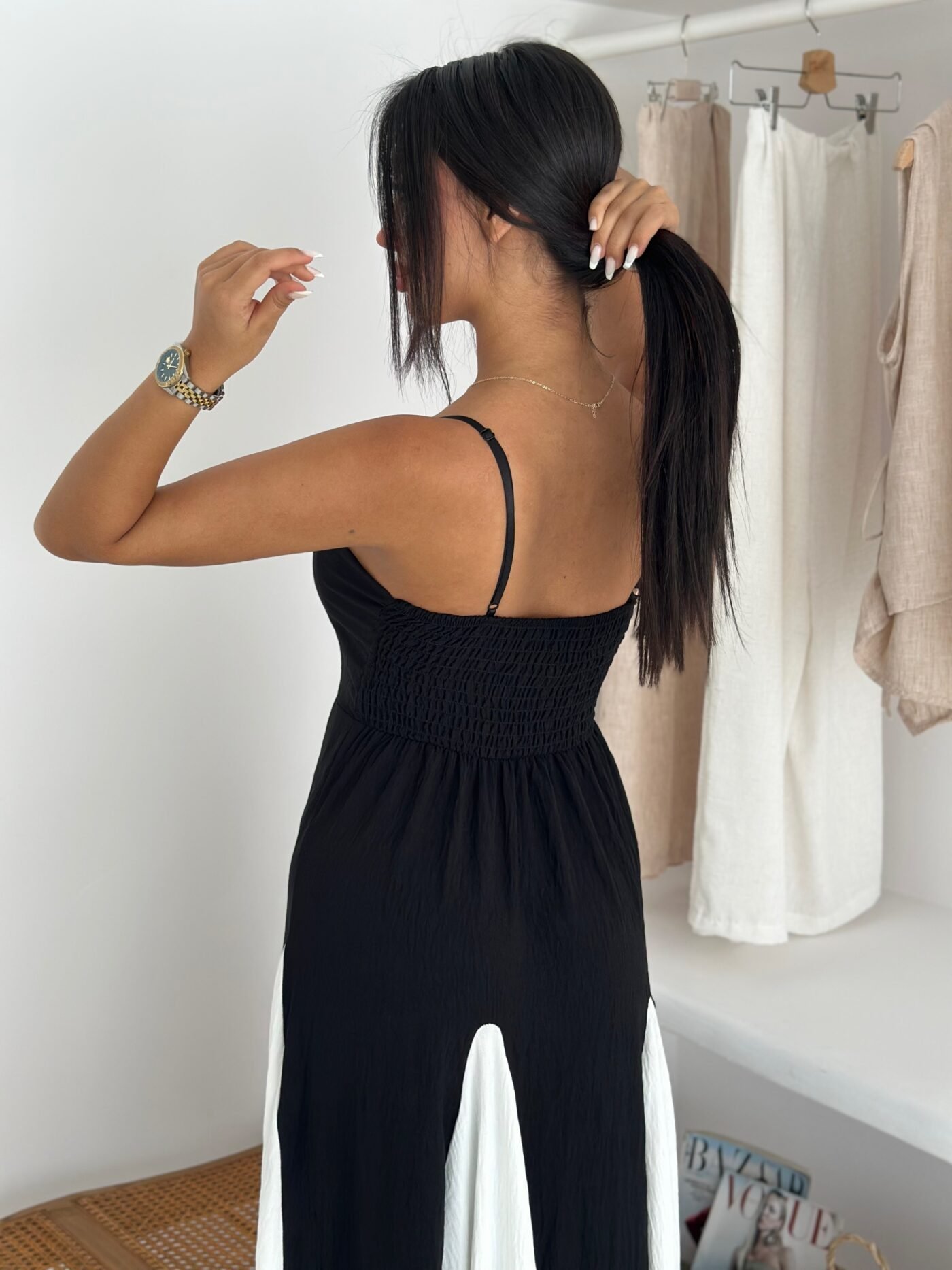 A statement monochrome maxi dress featuring a sleek black bodice and flowing white contrast panels. Designed for effortless elegance and ultimate comfort, perfect for both day and evening occasions.