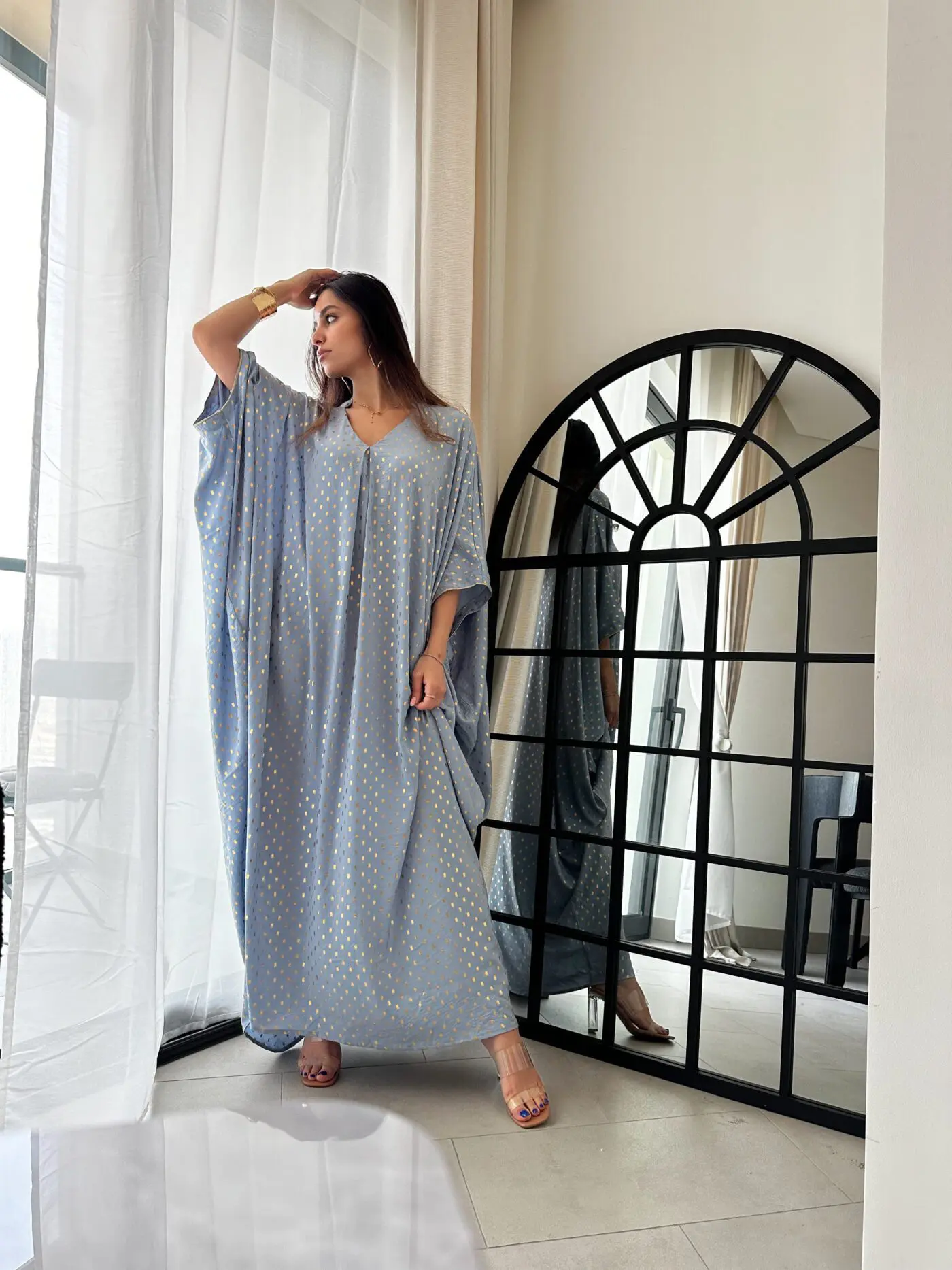 Indulge in luxury with our exquisite silk kaftan adorned with delicate golden dots. Crafted to perfection, this kaftan exudes elegance and sophistication, while the golden dots add a touch of opulence and charm. Whether you’re attending a glamorous event or lounging at home, this kaftan promises to elevate your style with its luxurious fabric and timeless design. Embrace the beauty of tradition and modernity effortlessly with this versatile piece. Ideal for celebrating Ramadan in style or adding a touch of elegance to any occasion. Don’t miss out on the chance to make a statement with this luxurious silk kaftan.