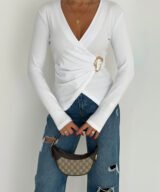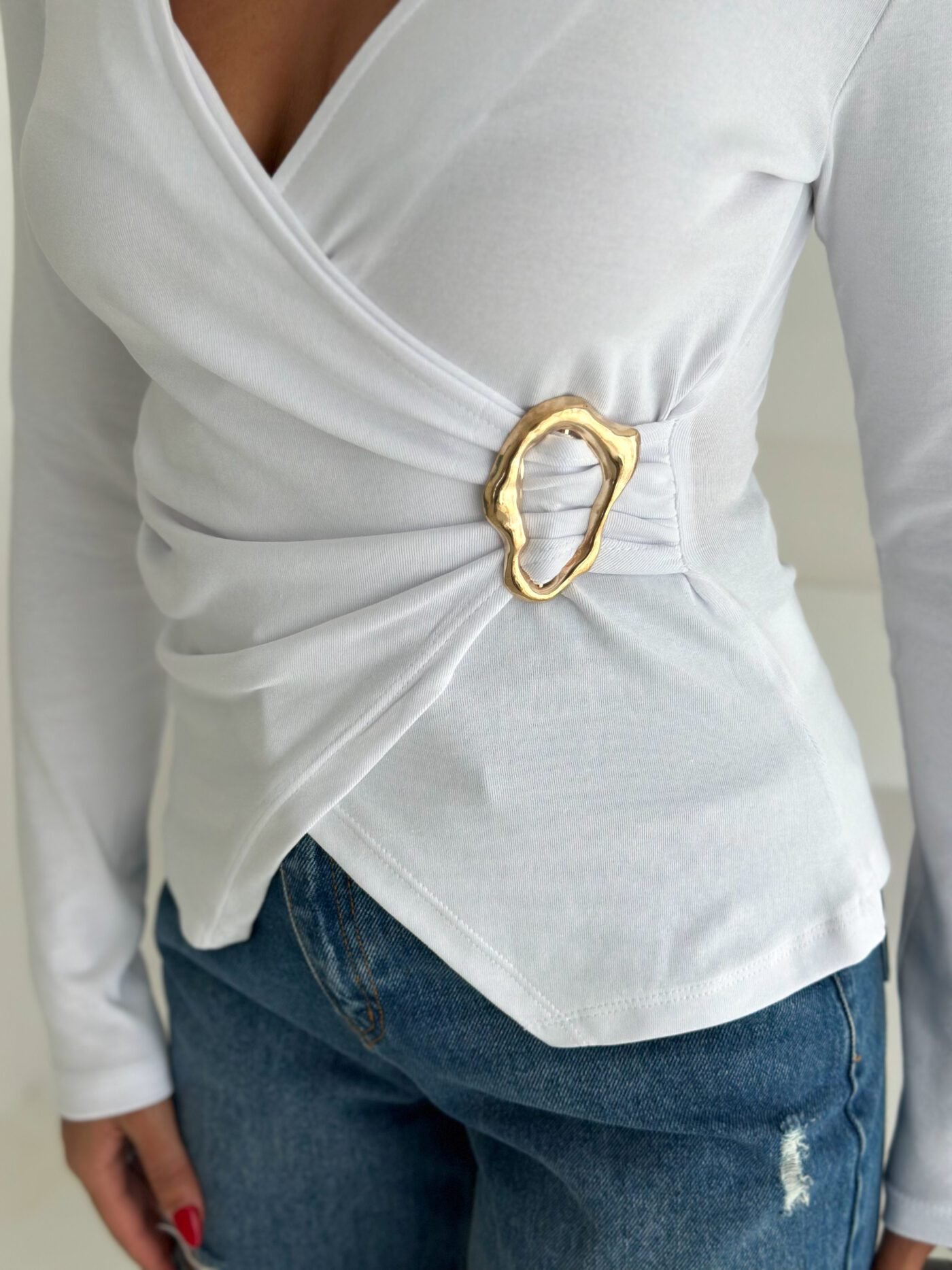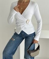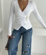 A chic wrap-style top designed with a flattering V-neckline and long sleeves. Features a stylish side buckle detail that enhances the waistline, giving an elegant yet modern look. Perfect for pairing with jeans or skirts for both day and evening outings.