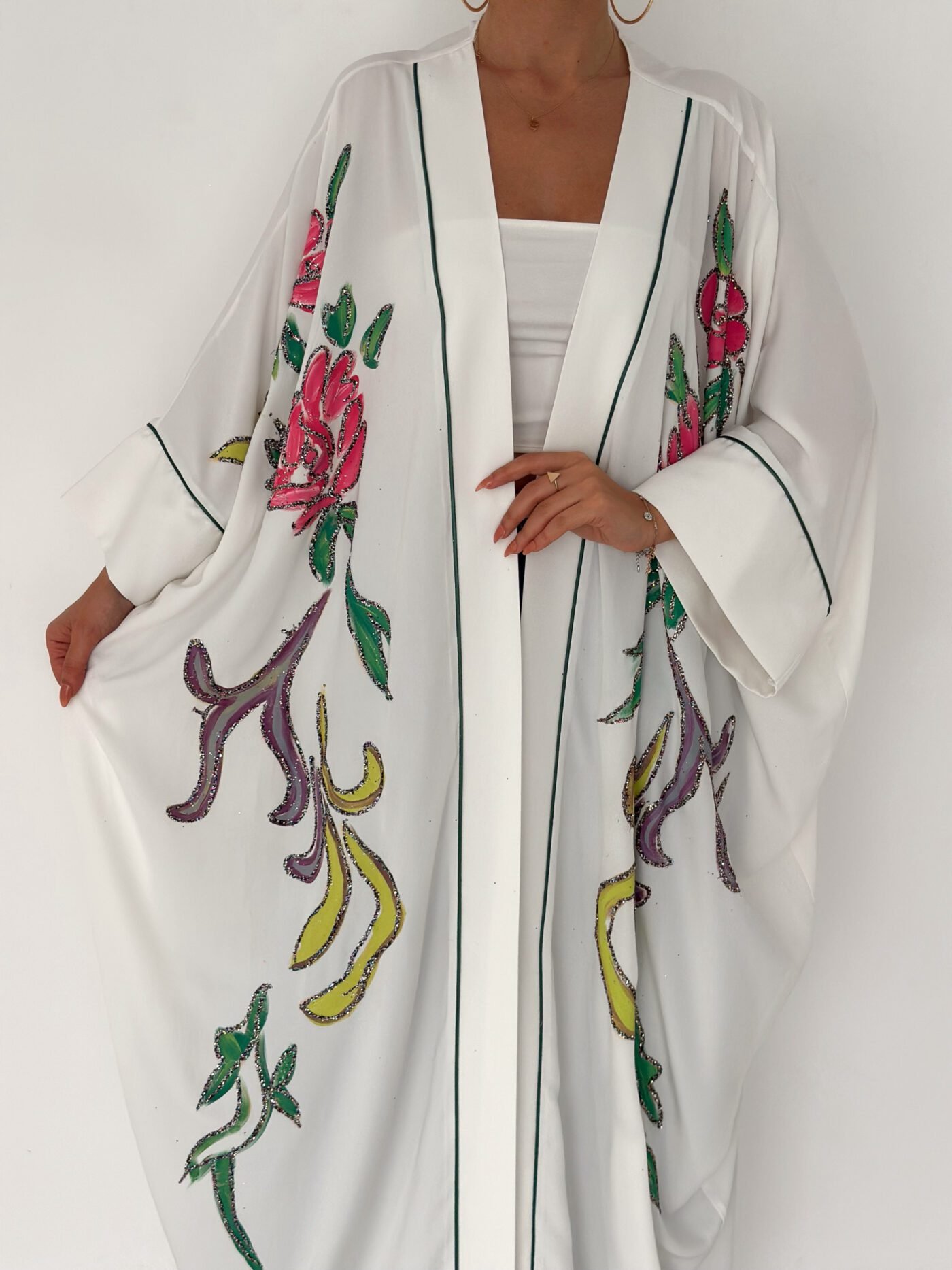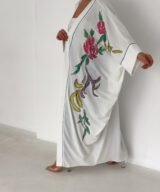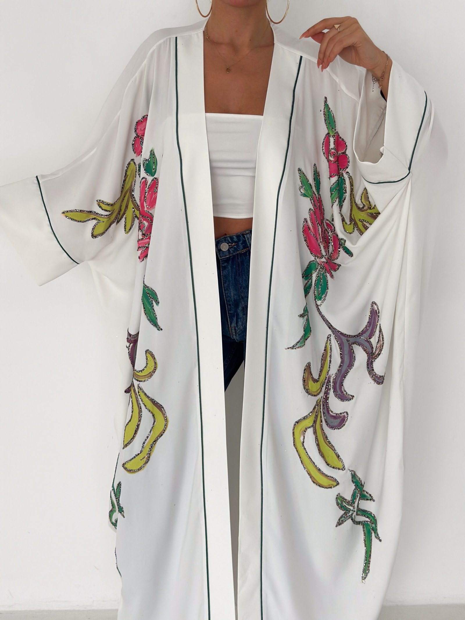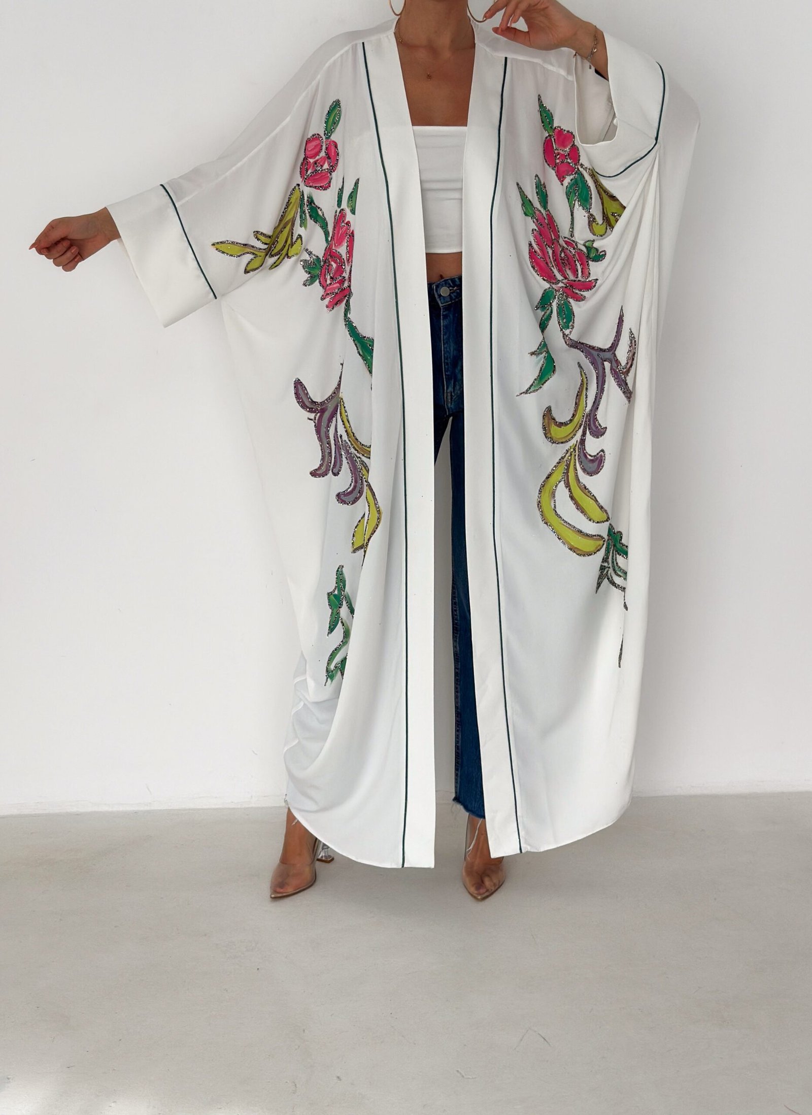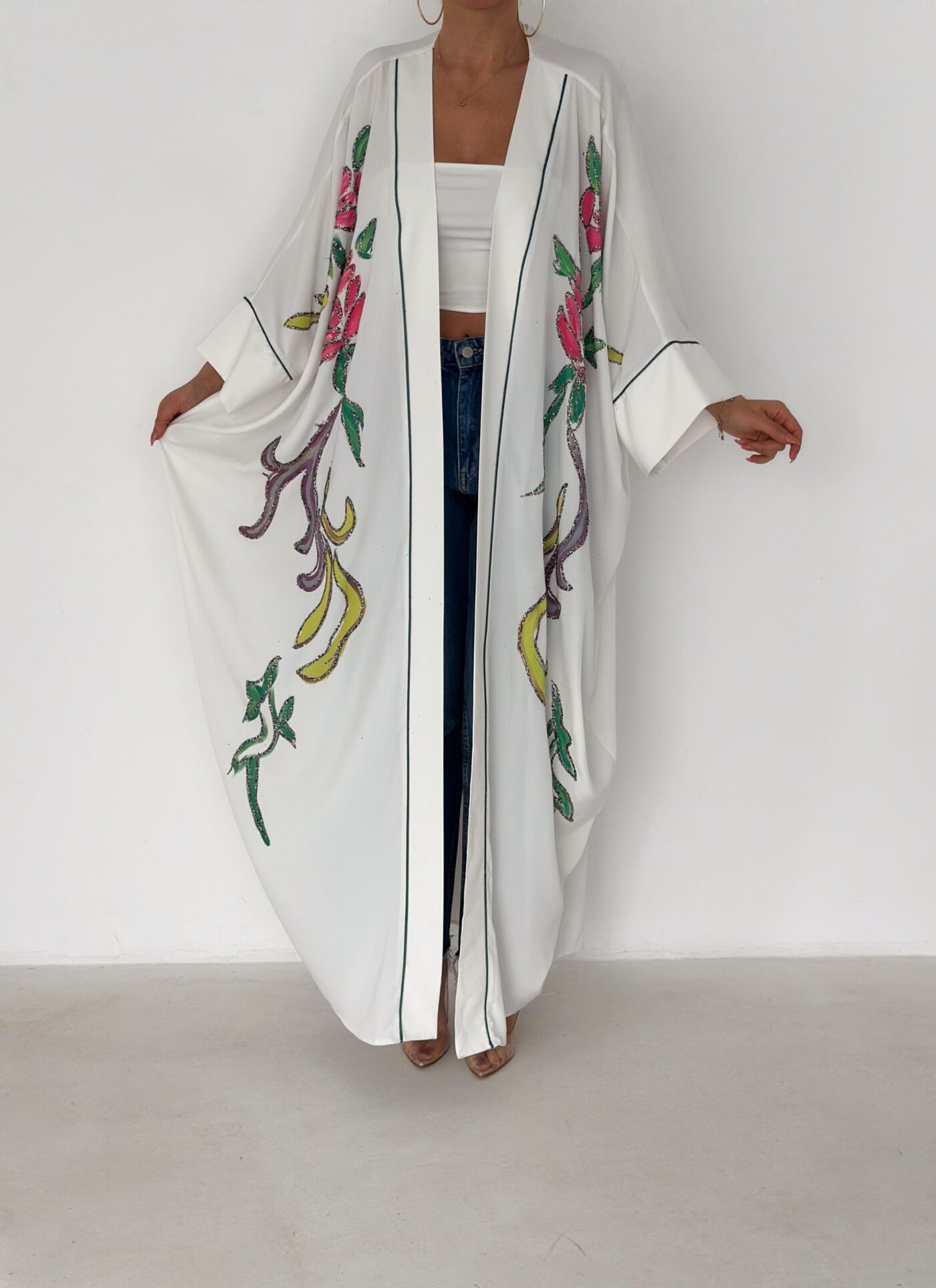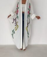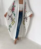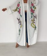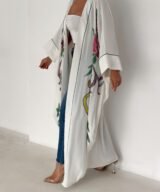 A graceful white open-front abaya featuring delicate hand-embroidered floral details in soft pink, green, and subtle accent tones. Designed with a relaxed, flowing silhouette and fine contrast piping along the edges, this piece blends elegance with effortless modern style. Lightweight and breathable, it’s perfect for daytime outings, Ramadan gatherings, or styled casually over jeans for a chic look.