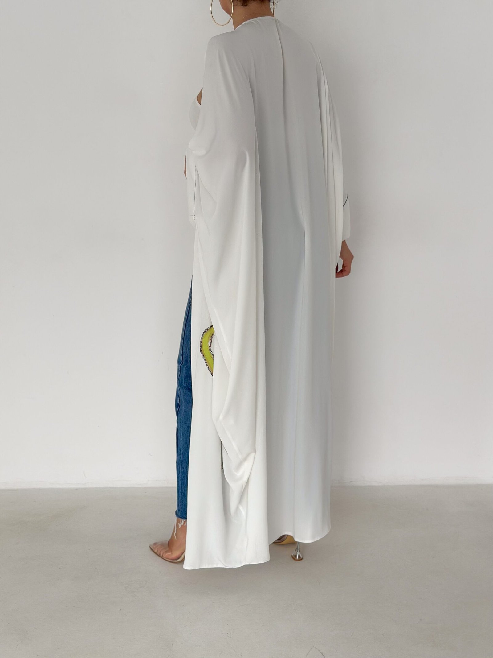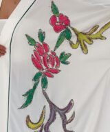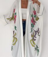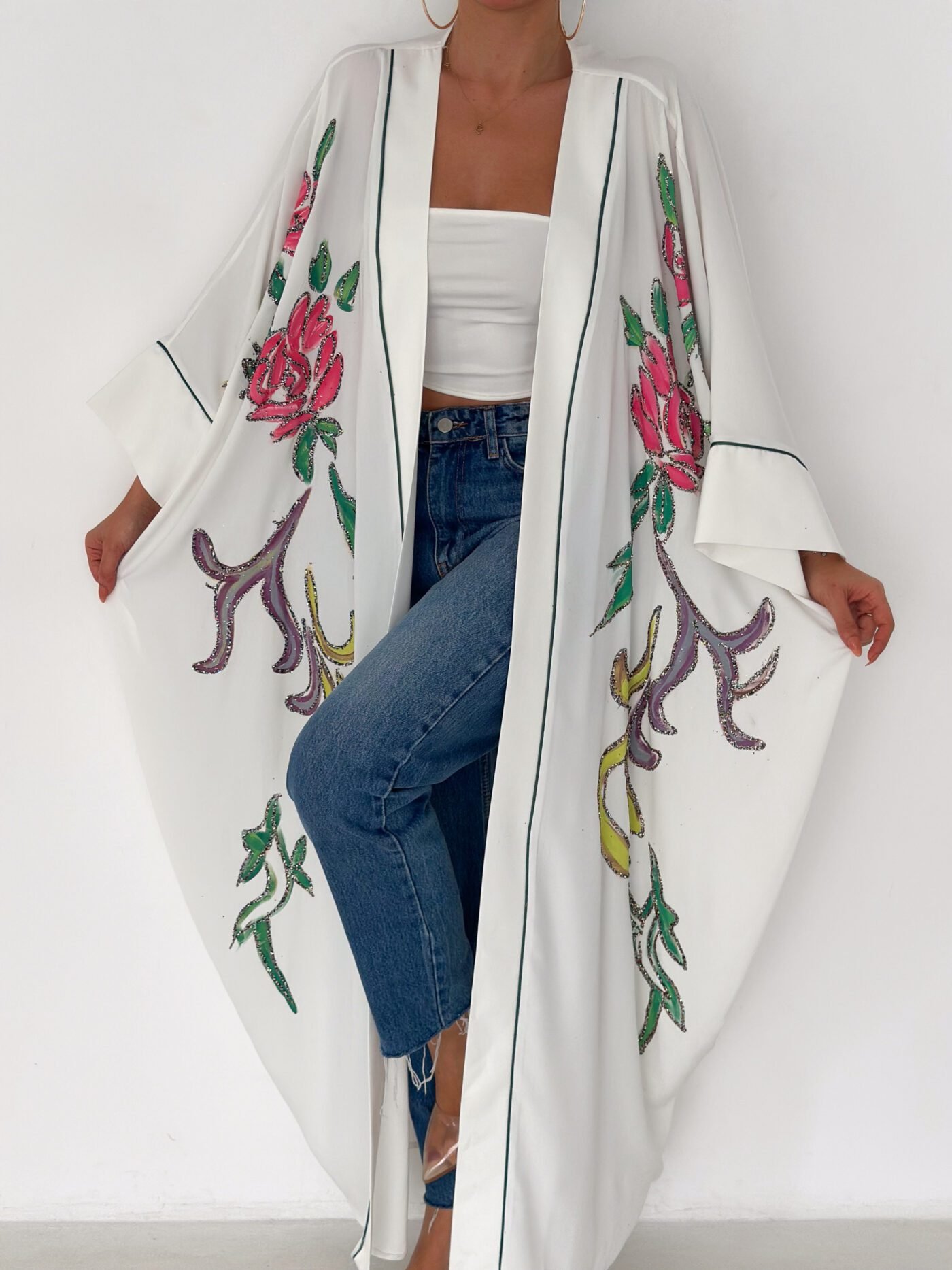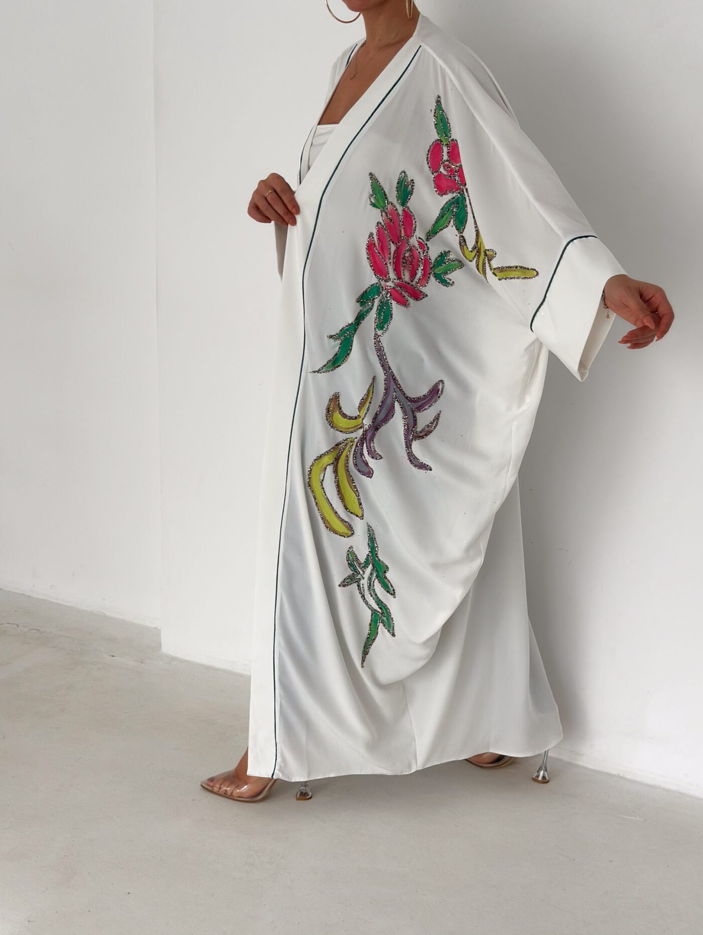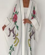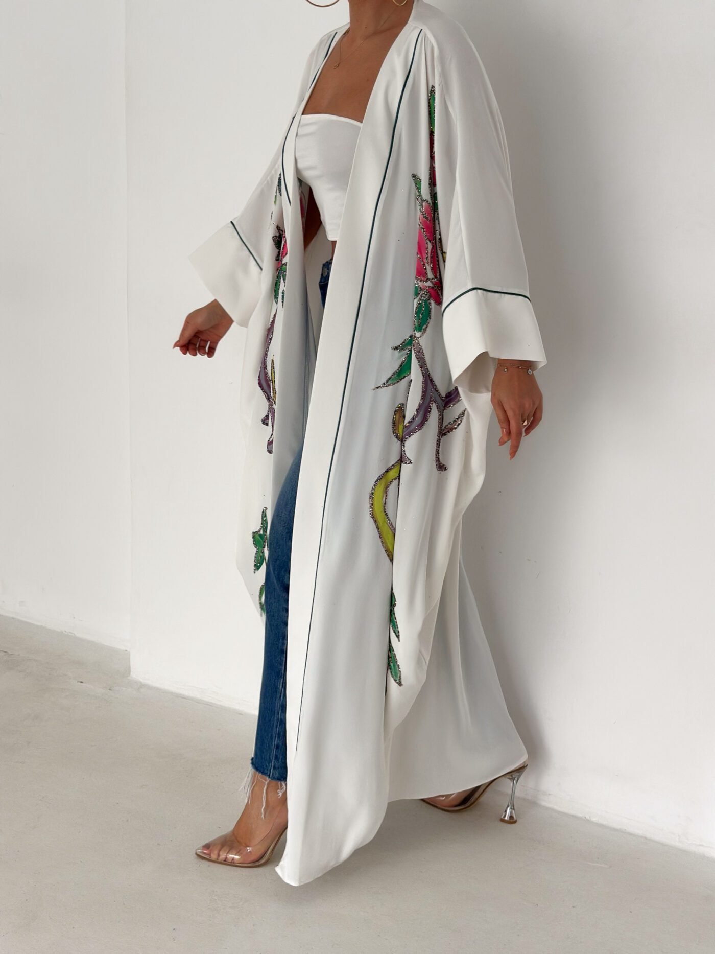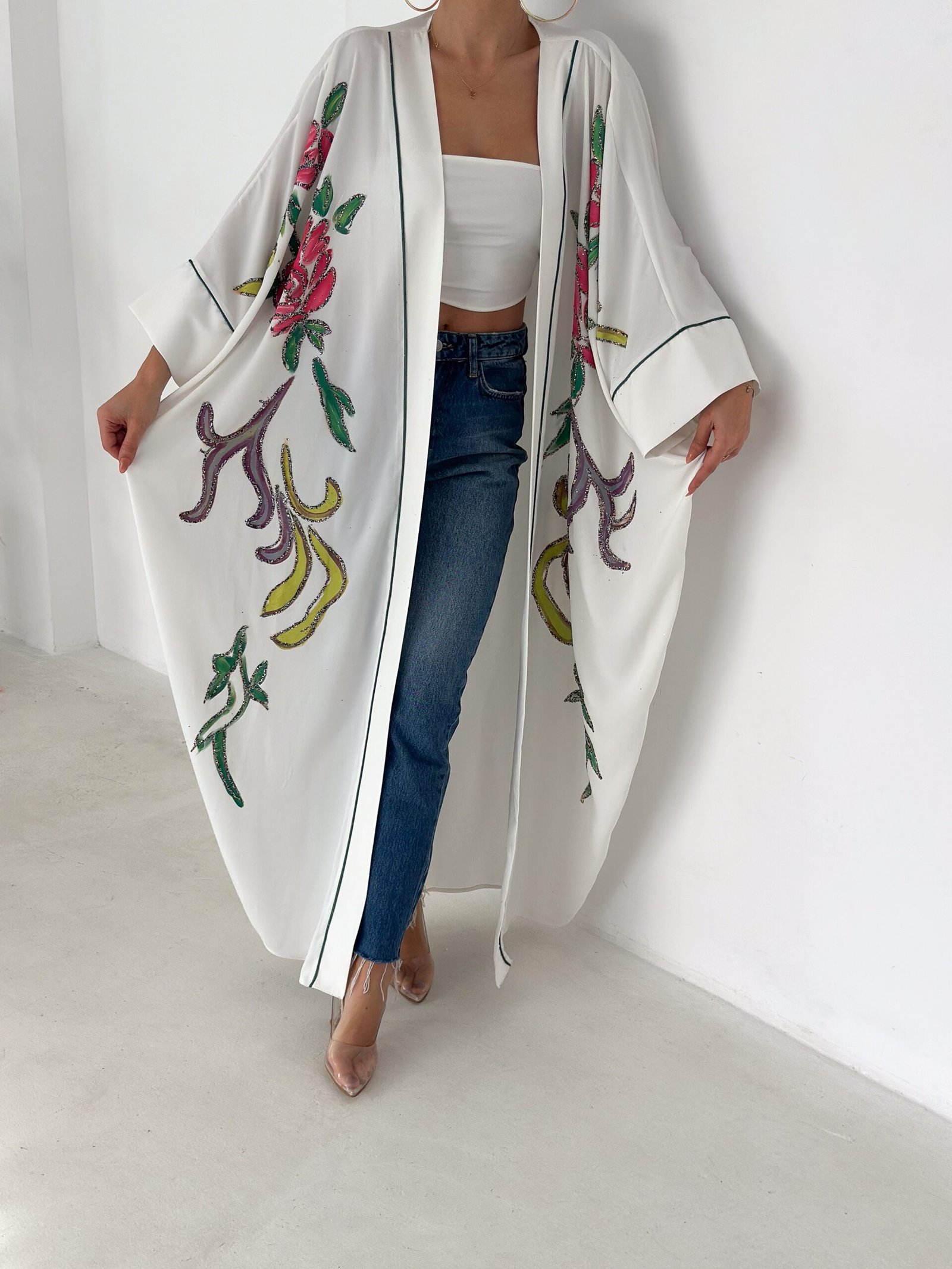 A graceful white open-front abaya featuring delicate hand-embroidered floral details in soft pink, green, and subtle accent tones. Designed with a relaxed, flowing silhouette and fine contrast piping along the edges, this piece blends elegance with effortless modern style. Lightweight and breathable, it’s perfect for daytime outings, Ramadan gatherings, or styled casually over jeans for a chic look.