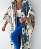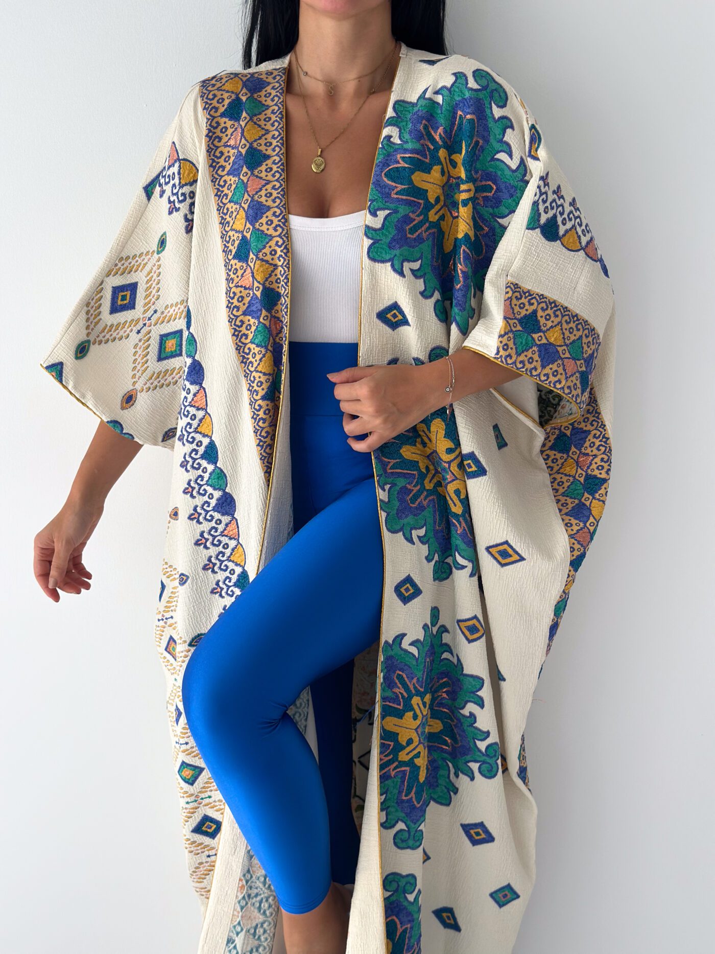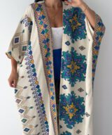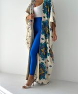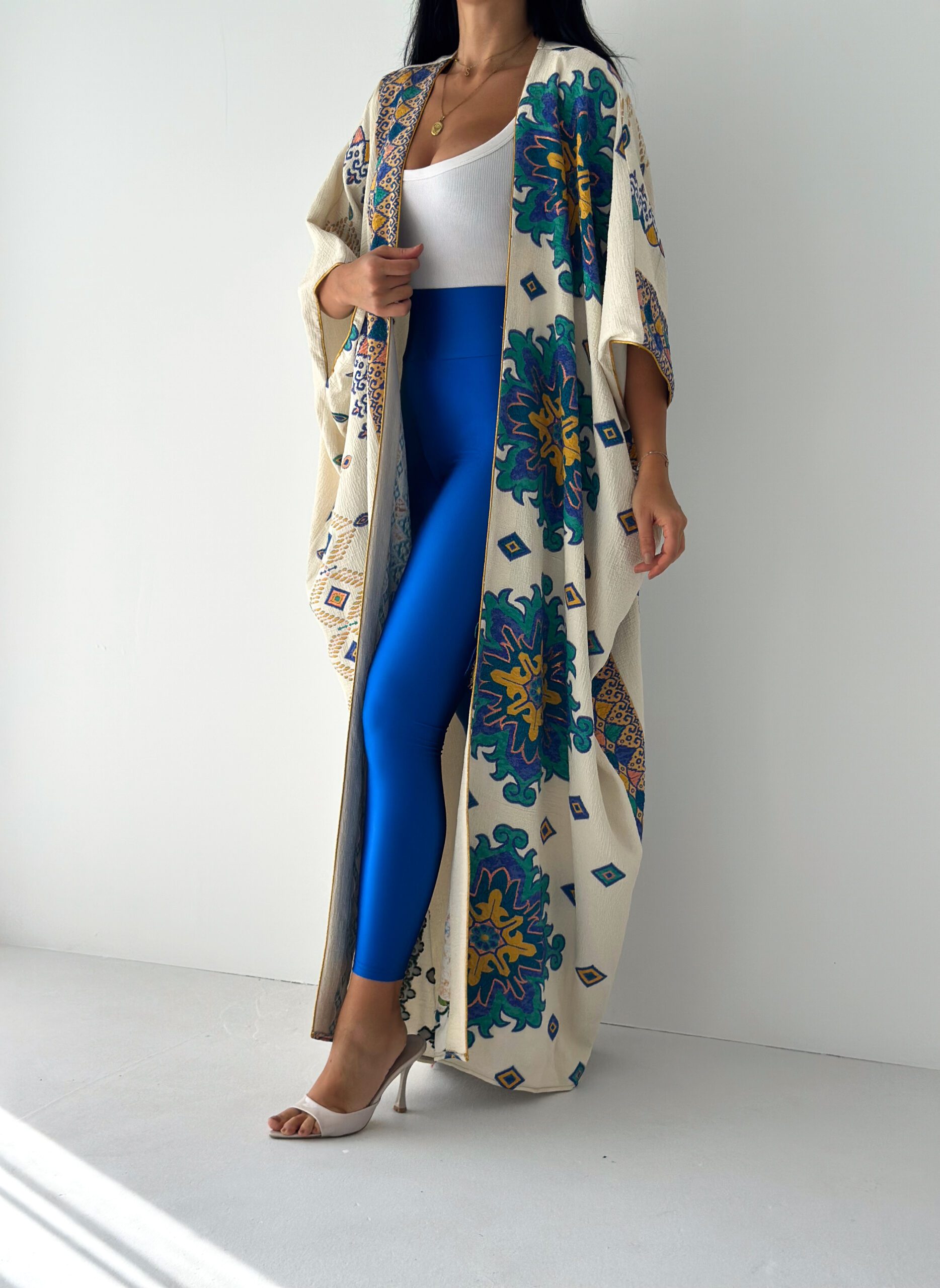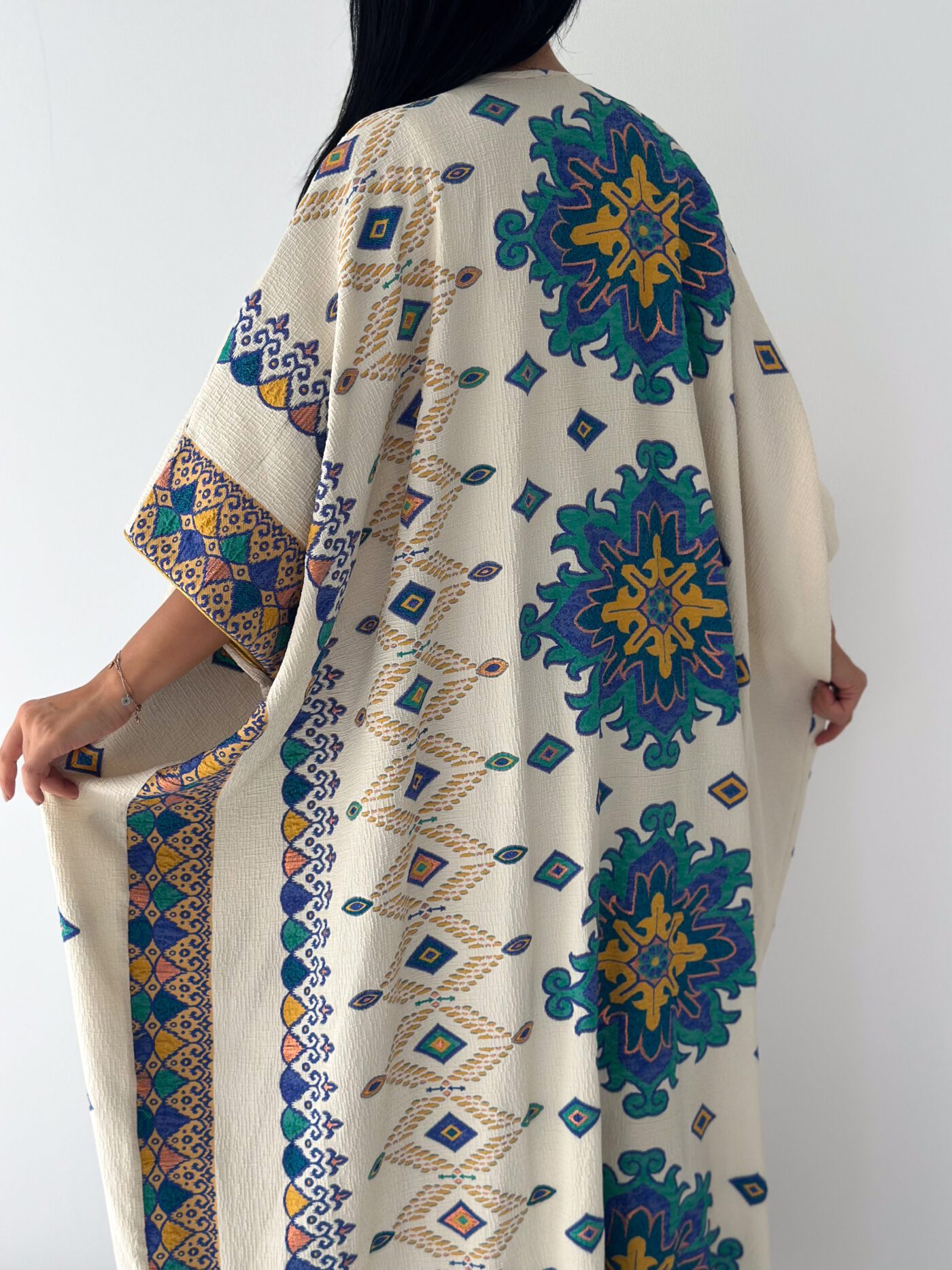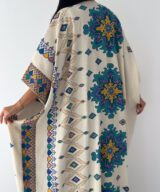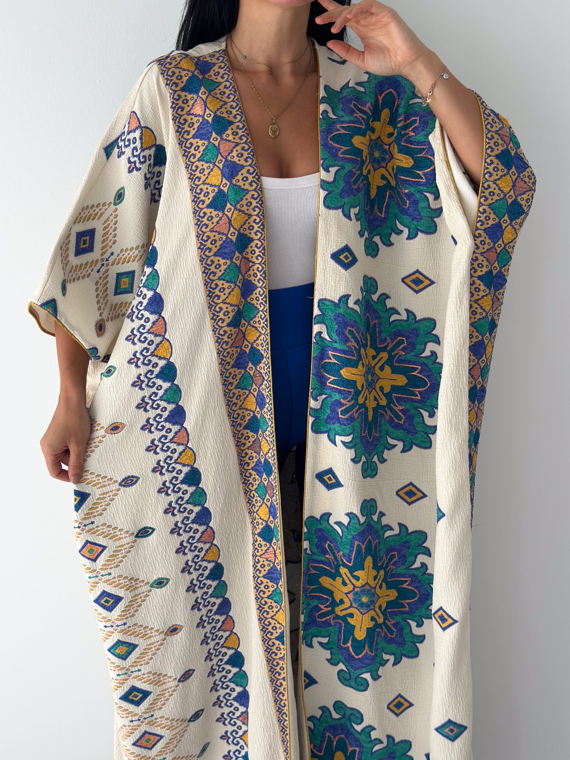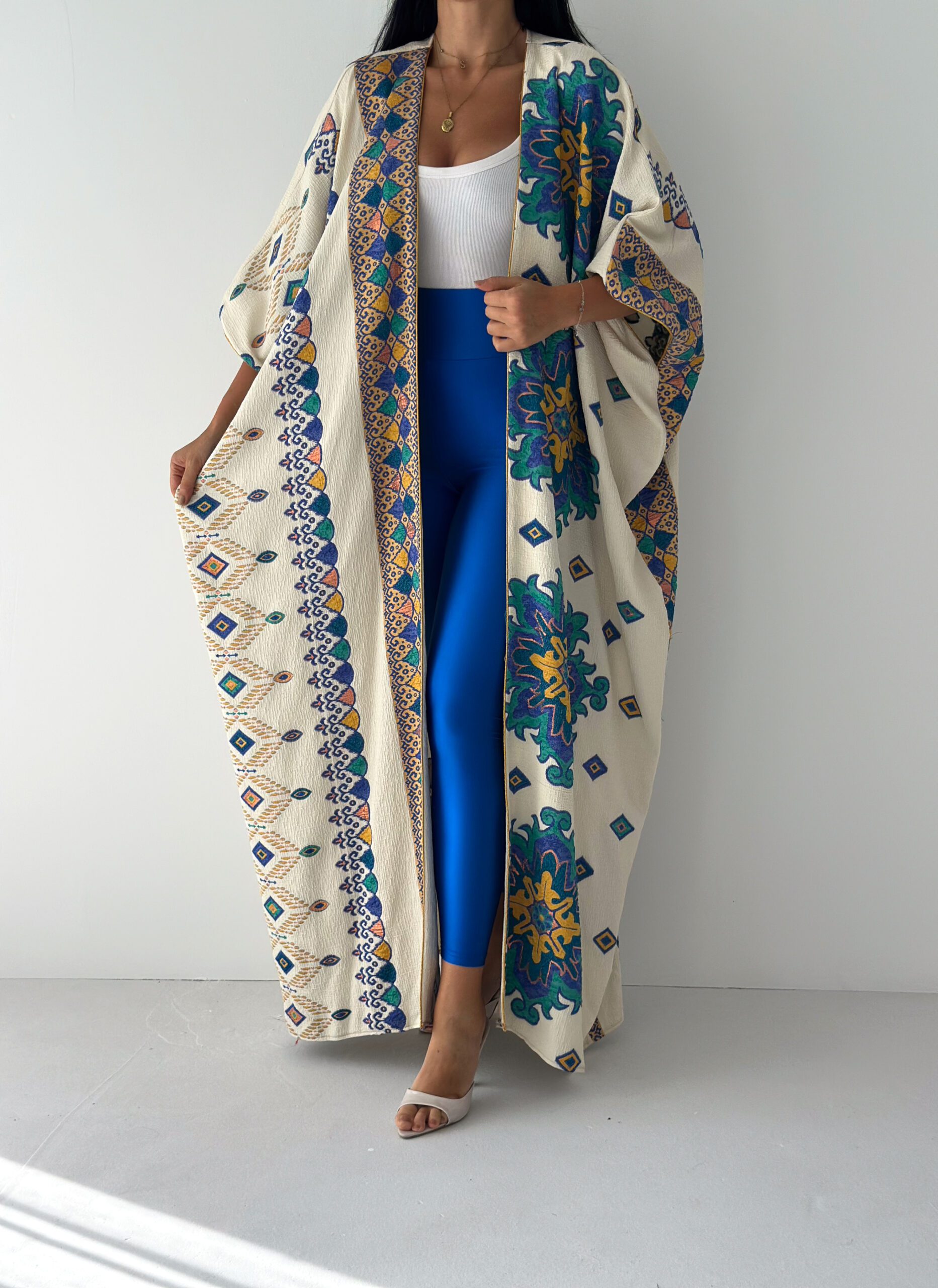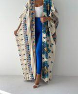 A statement open abaya inspired by desert oasis colors and artistic oriental patterns. Designed with a flowing silhouette and wide sleeves, featuring rich blue, green, and golden motifs on a soft cream base. The lightweight fabric makes it perfect for effortless styling, whether for daytime elegance or a chic evening look.