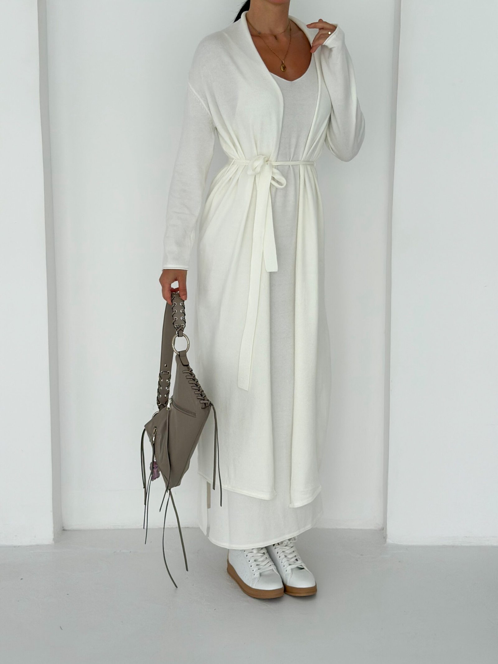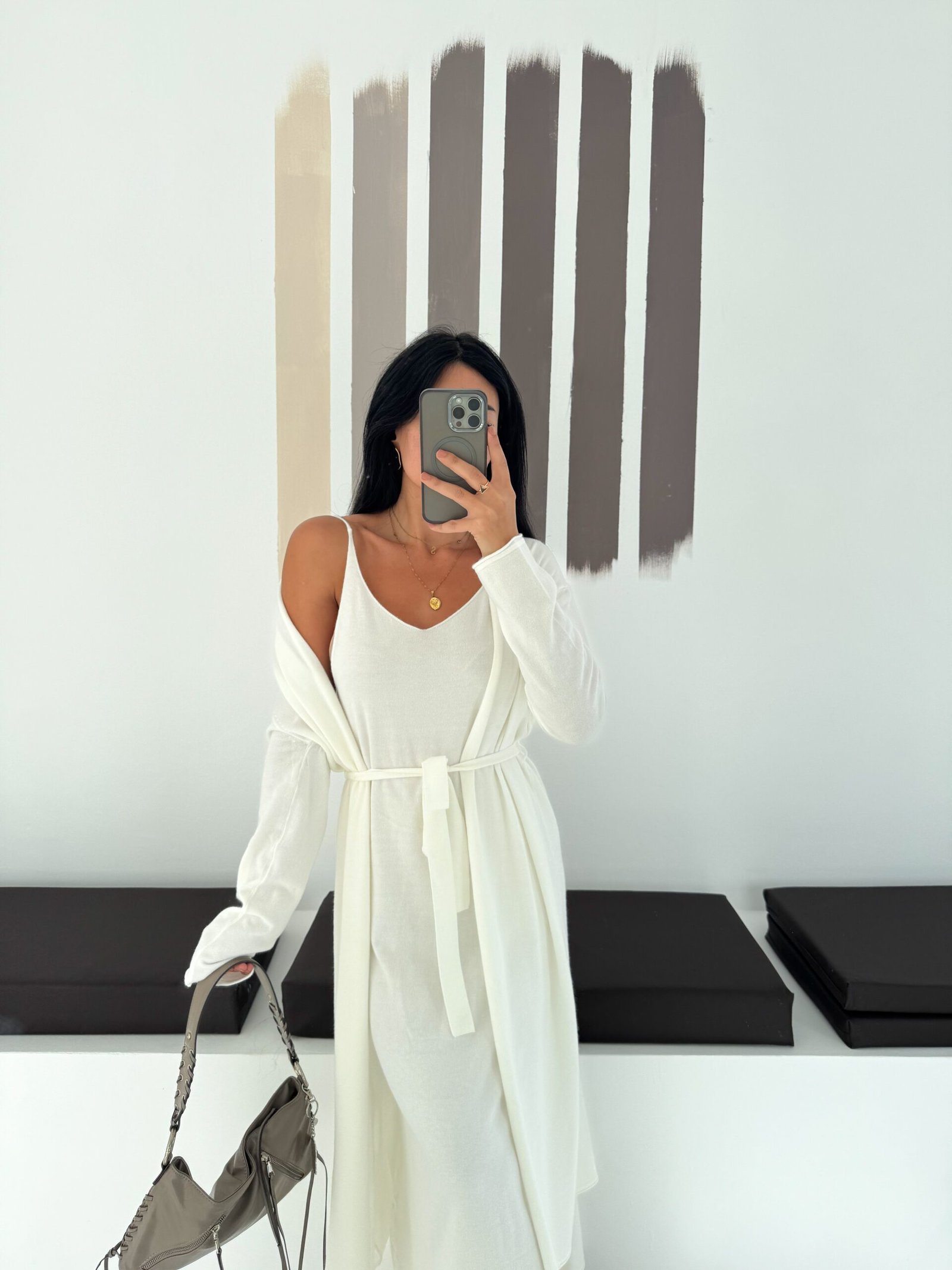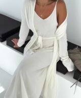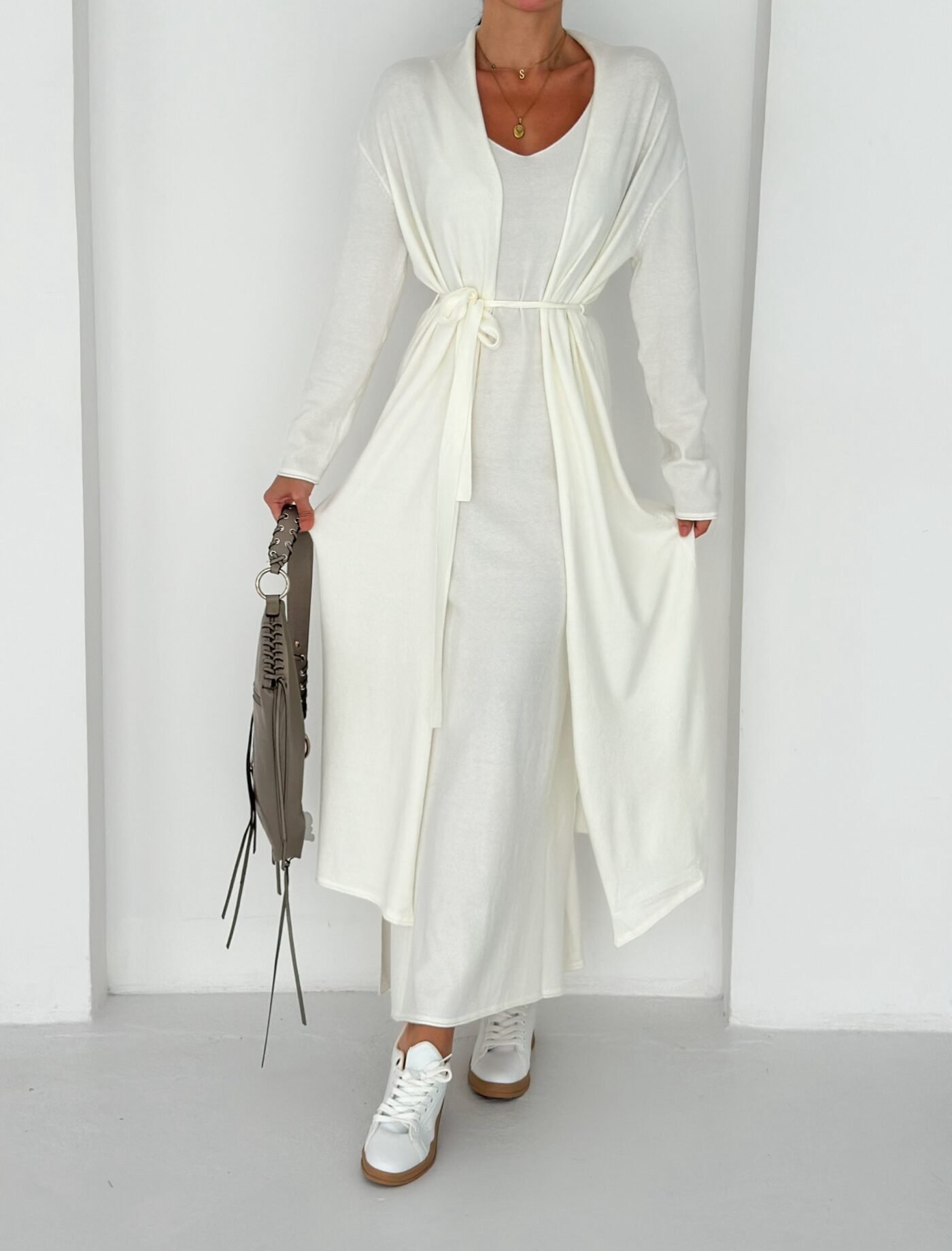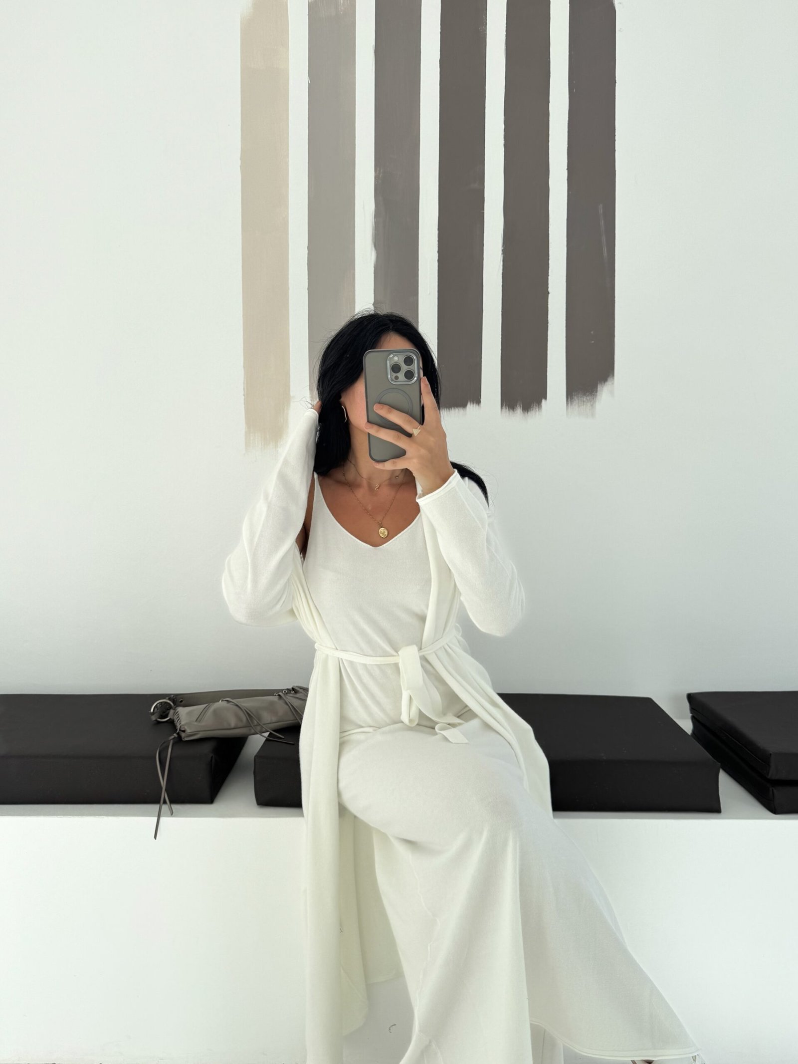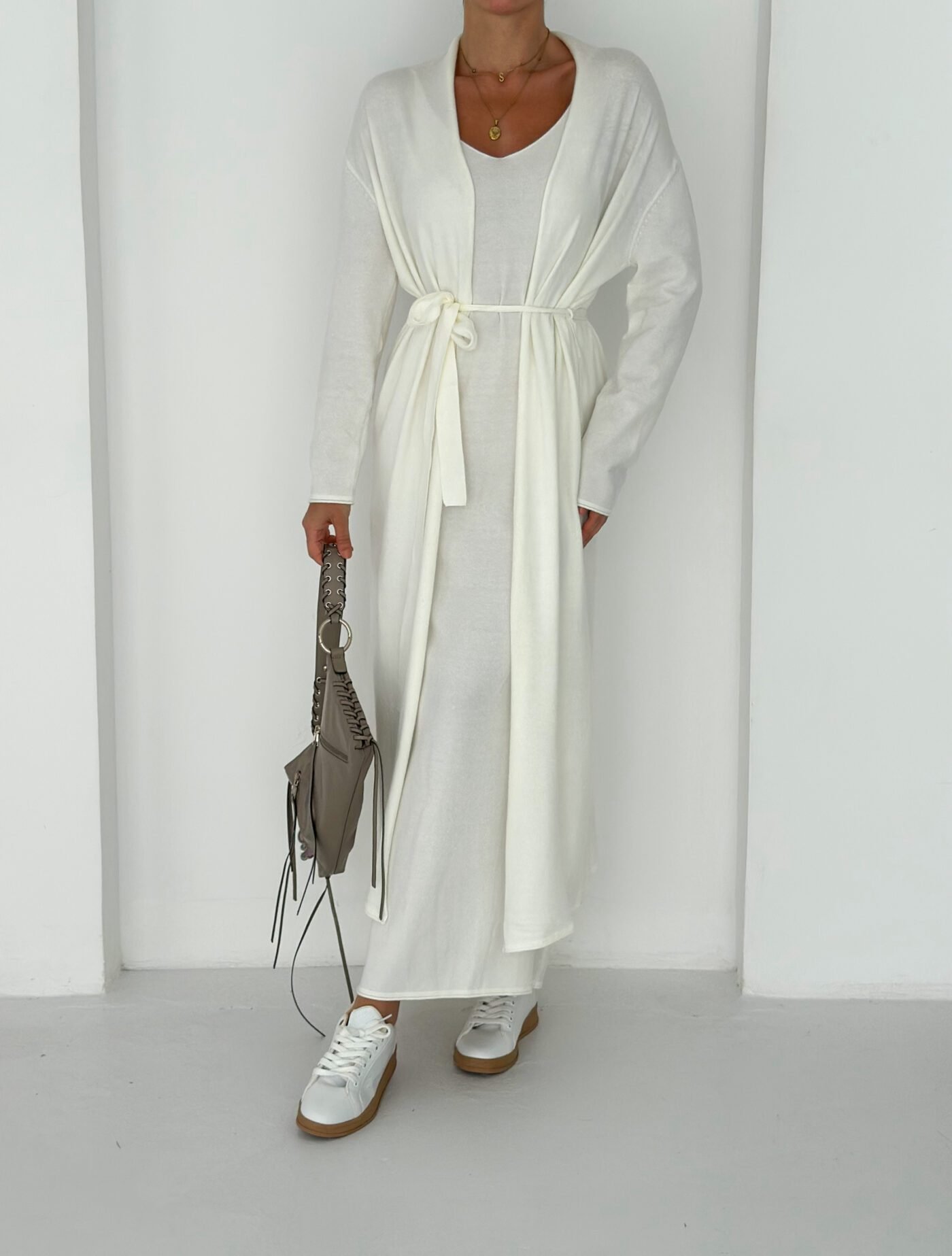 A soft, elegant lounge set designed for everyday luxury. Crafted from a premium lightweight knit with a subtle touch of cashmere for extra softness and comfort. The set includes a sleeveless maxi dress and a long belted cardigan for effortless layering and timeless style. Perfect for travel days, coffee runs, relaxed gatherings, or elevated home wear.