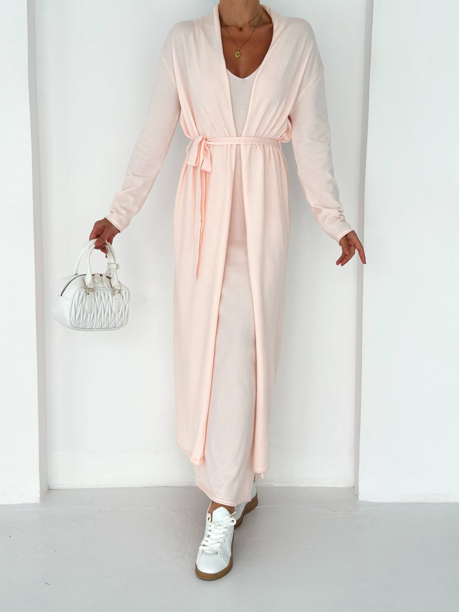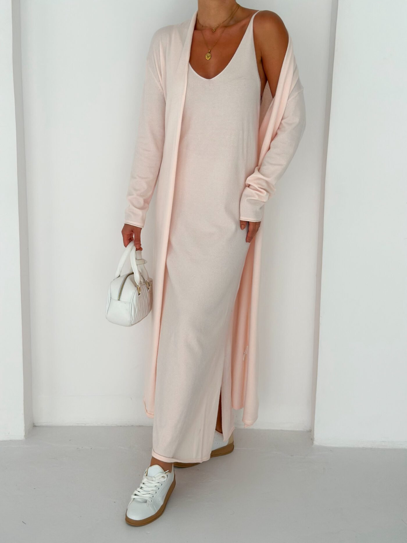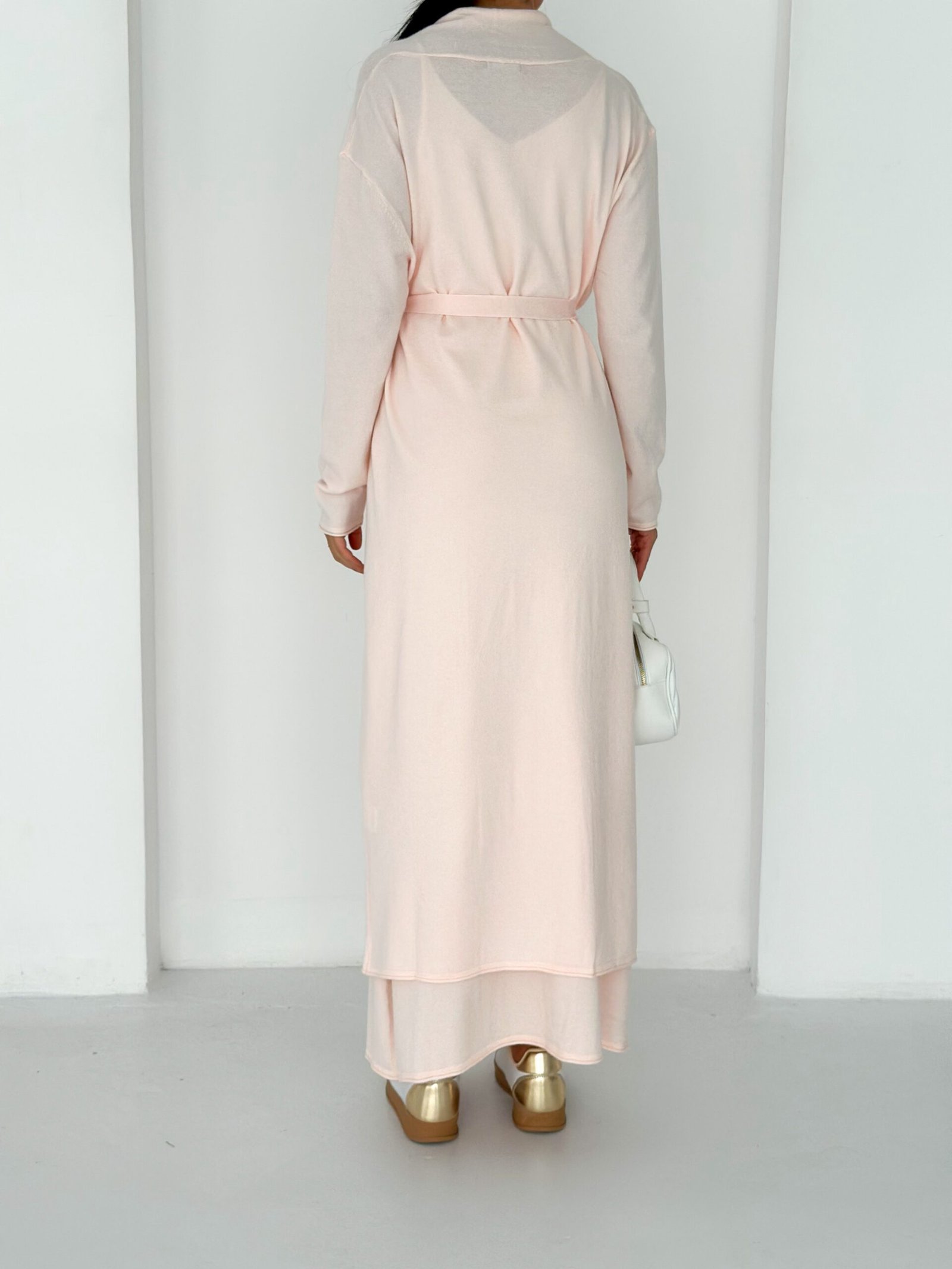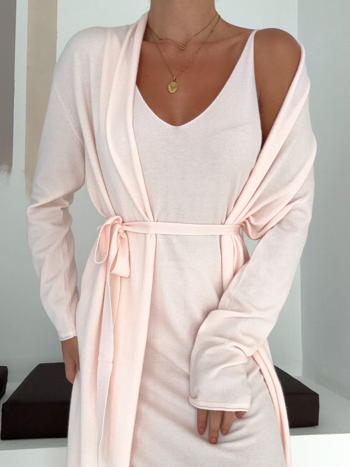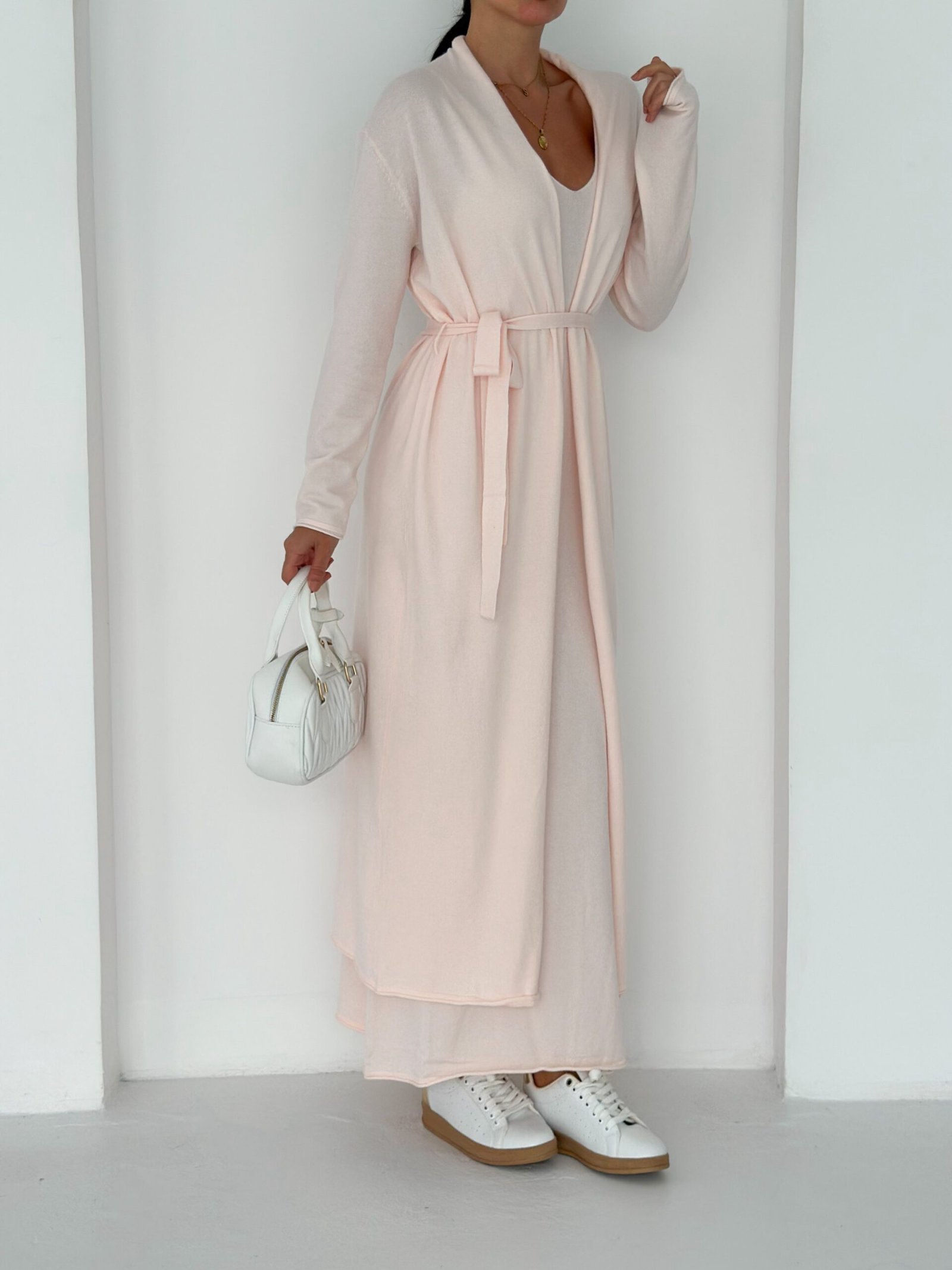 A soft, elegant lounge set designed for everyday luxury. Crafted from a premium lightweight knit with a subtle touch of cashmere for extra softness and comfort. The set includes a sleeveless maxi dress and a long belted cardigan for effortless layering and timeless style. Perfect for travel days, coffee runs, relaxed gatherings, or elevated home wear.