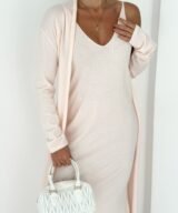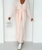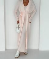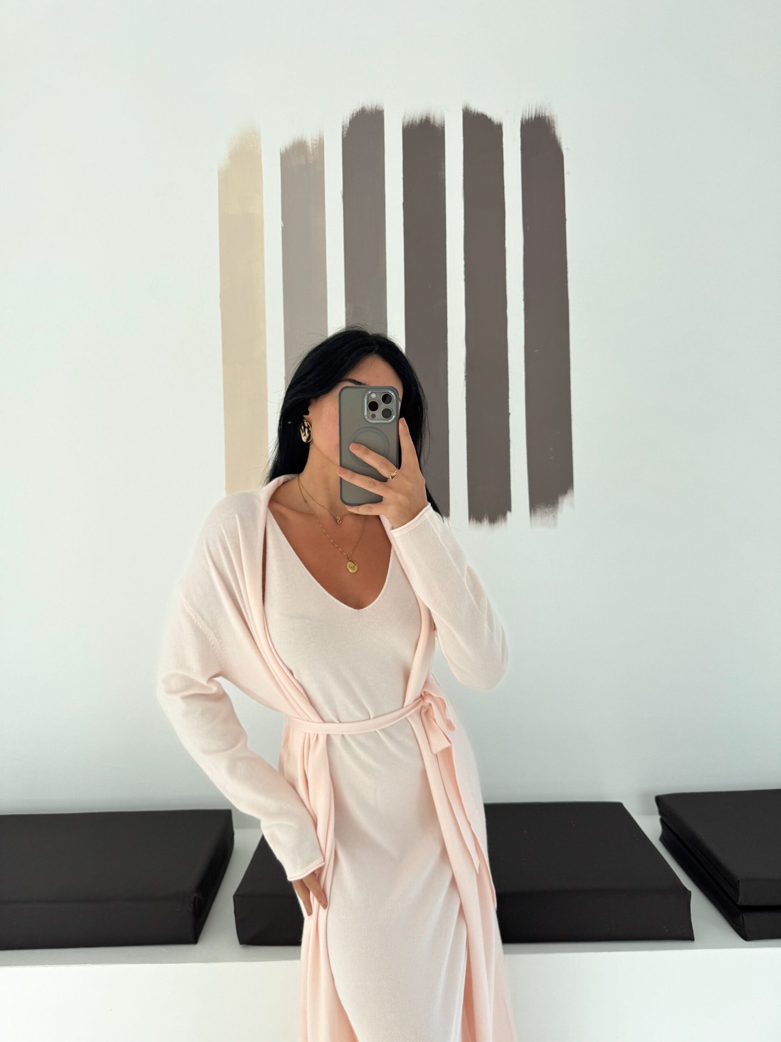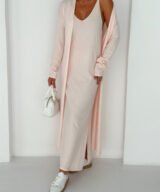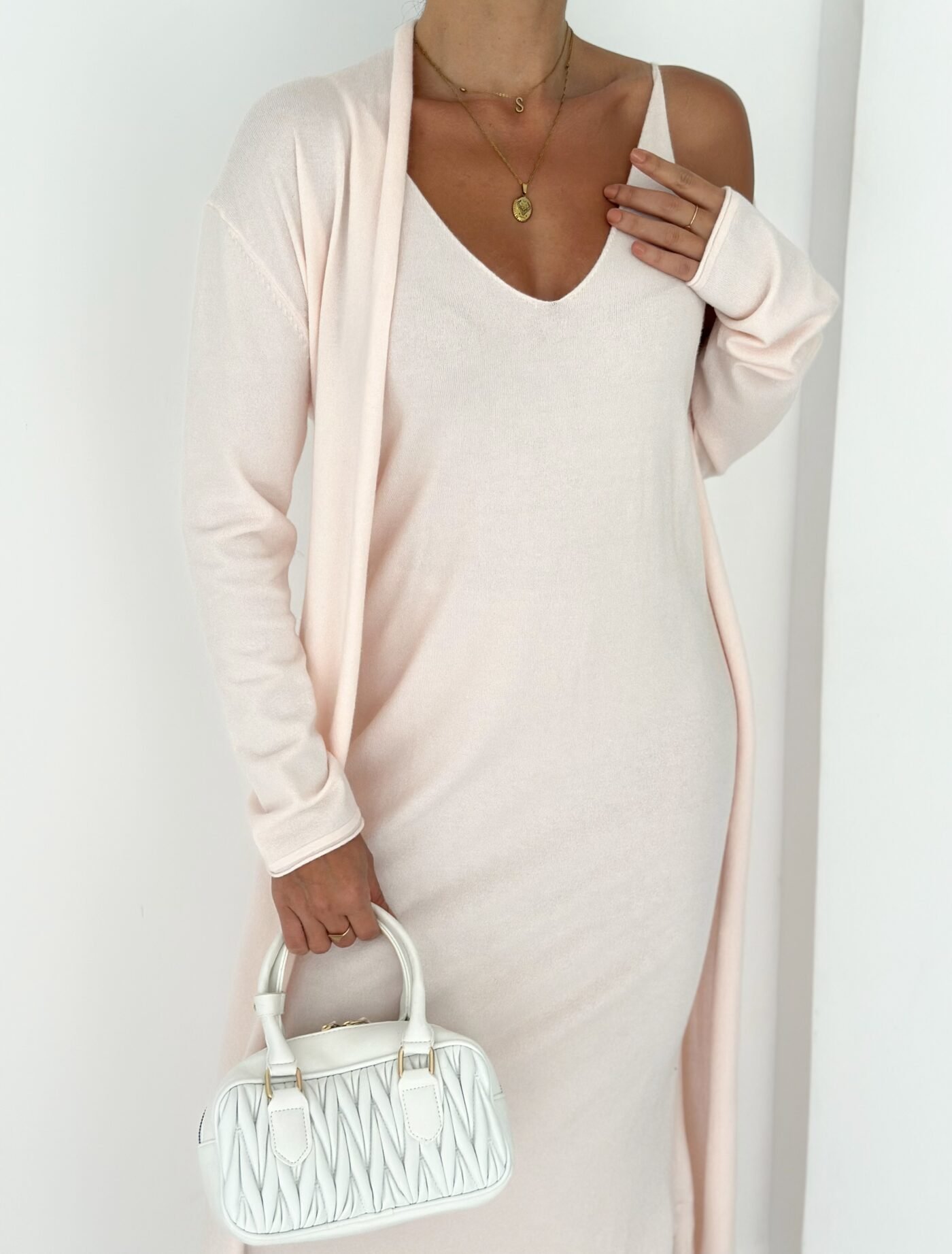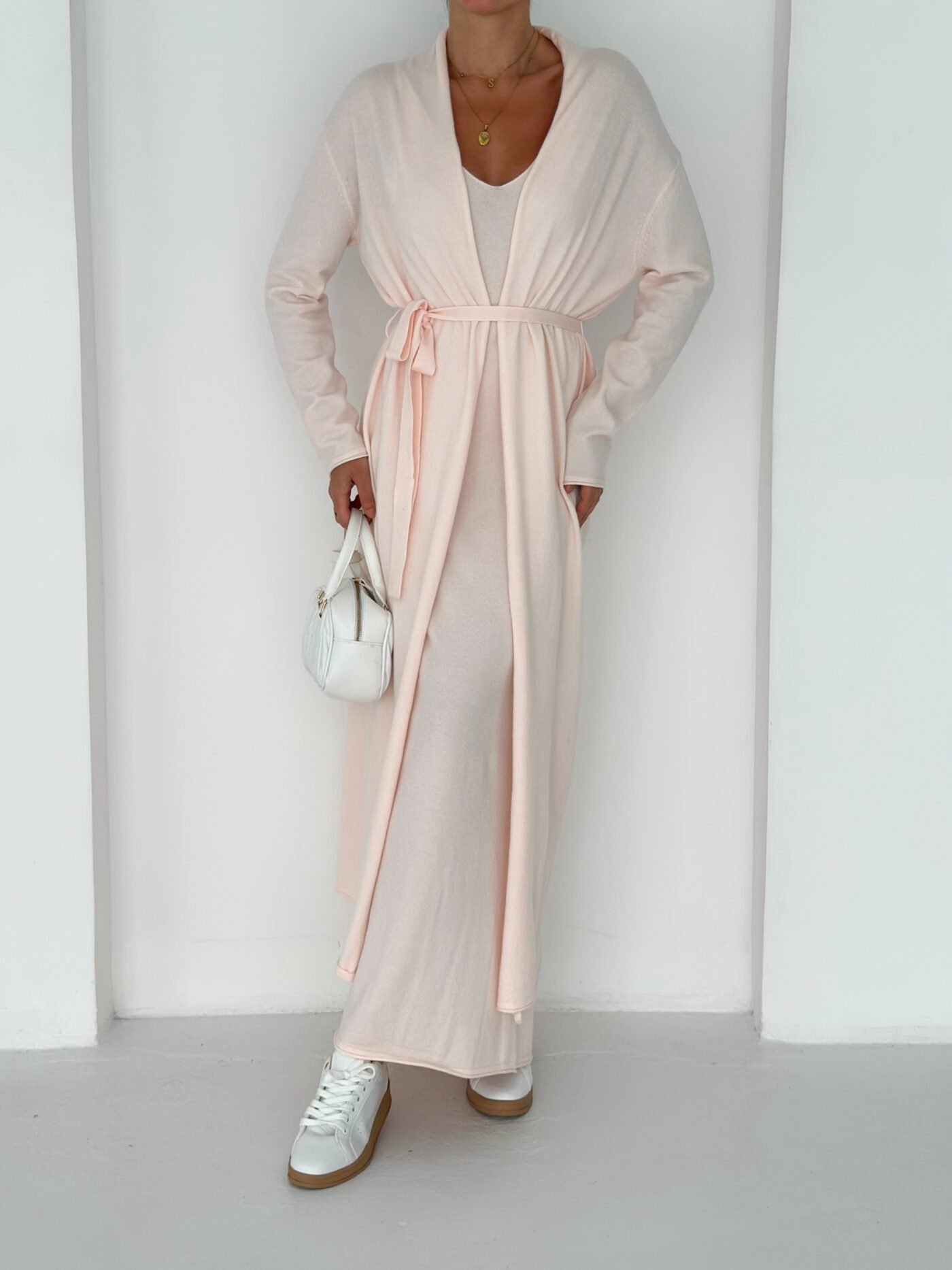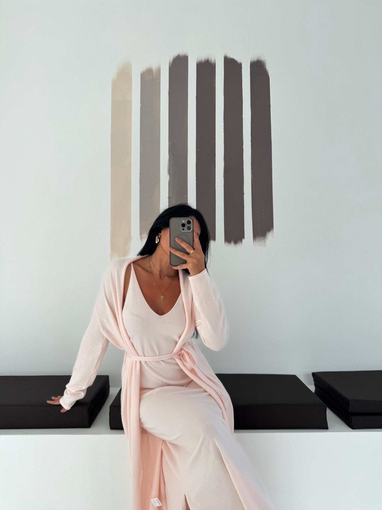 A soft, elegant lounge set designed for everyday luxury. Crafted from a premium lightweight knit with a subtle touch of cashmere for extra softness and comfort. The set includes a sleeveless maxi dress and a long belted cardigan for effortless layering and timeless style. Perfect for travel days, coffee runs, relaxed gatherings, or elevated home wear.