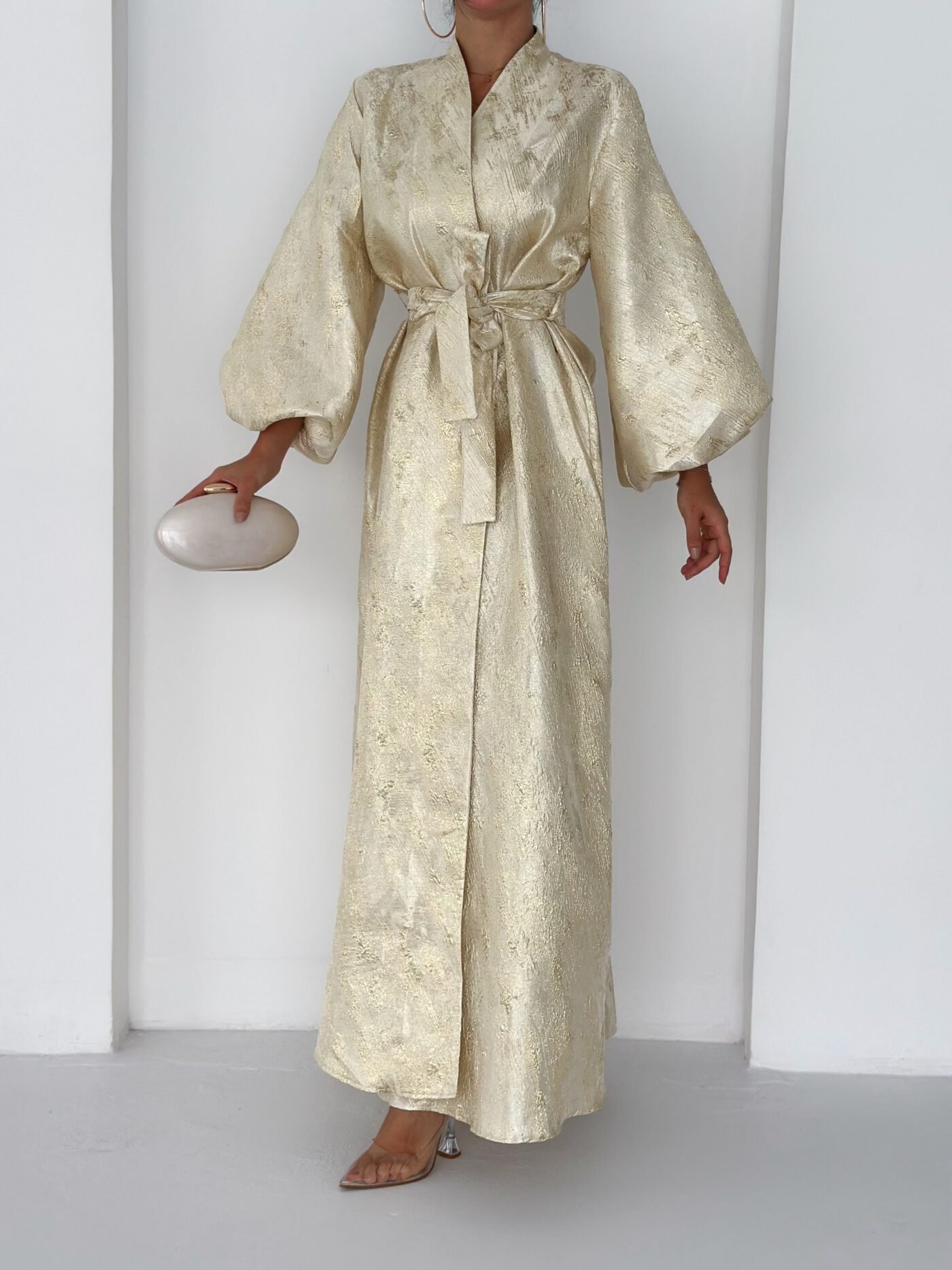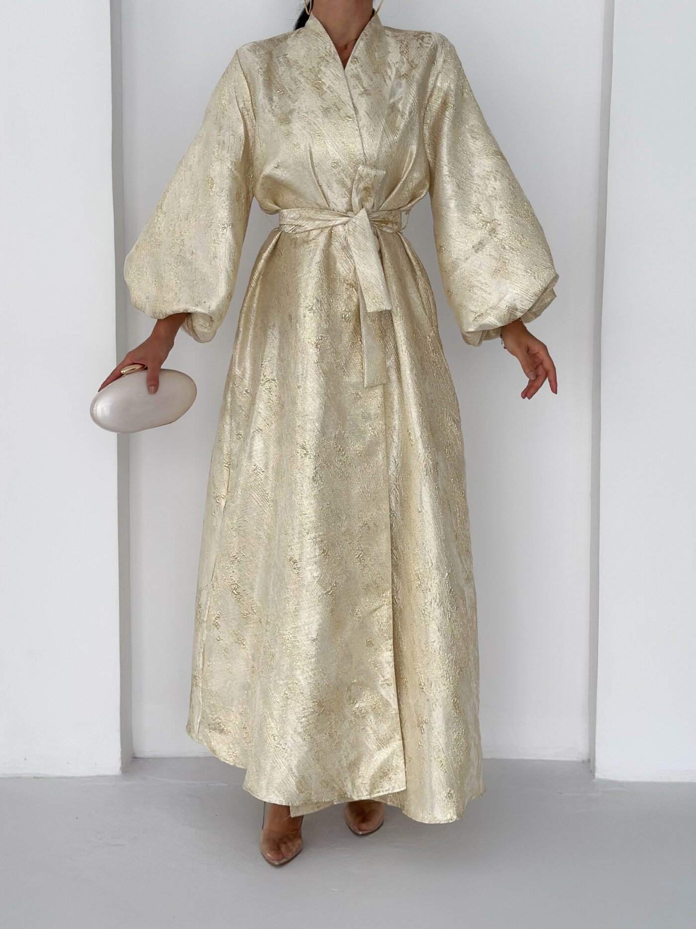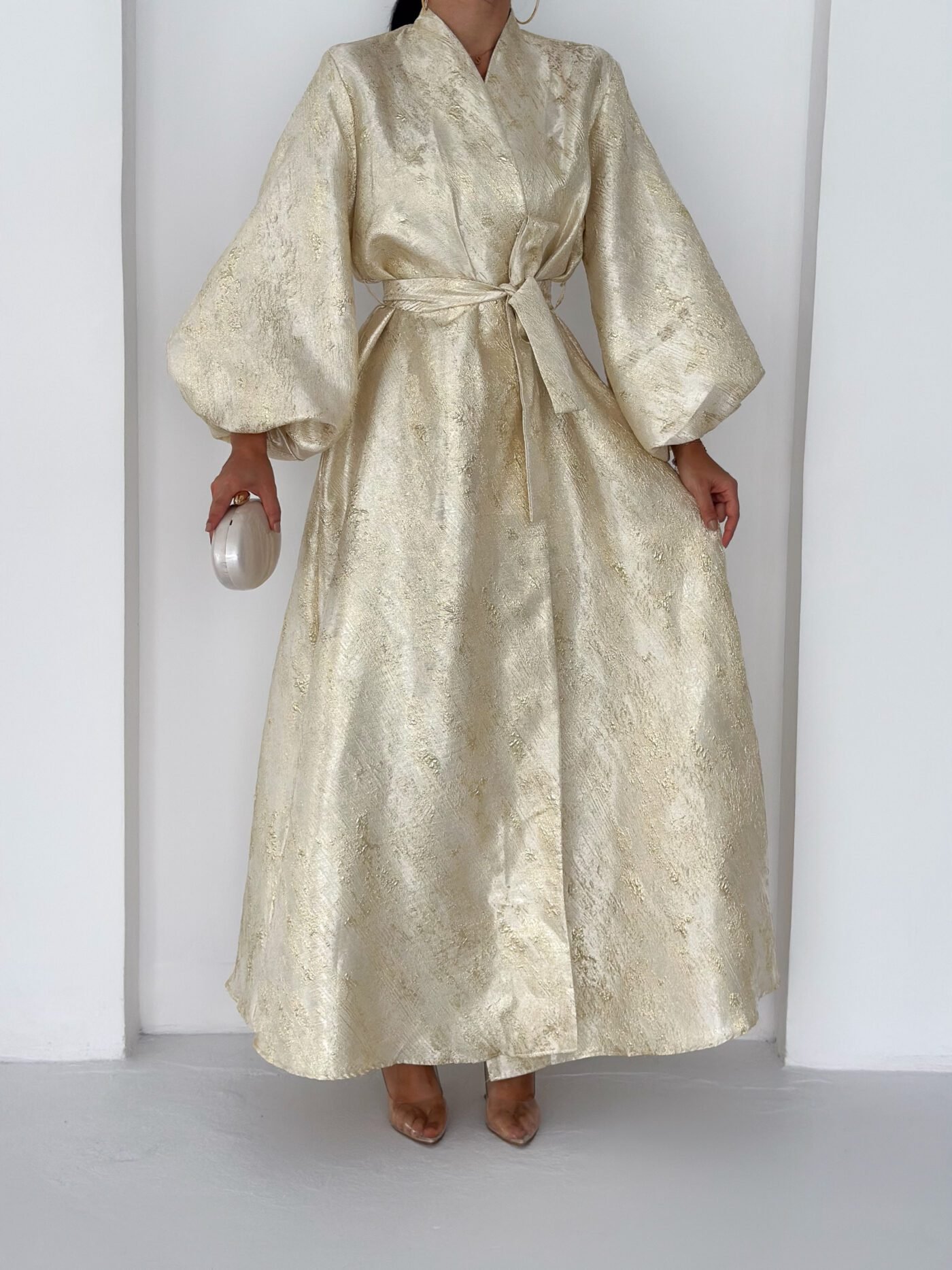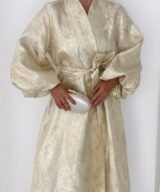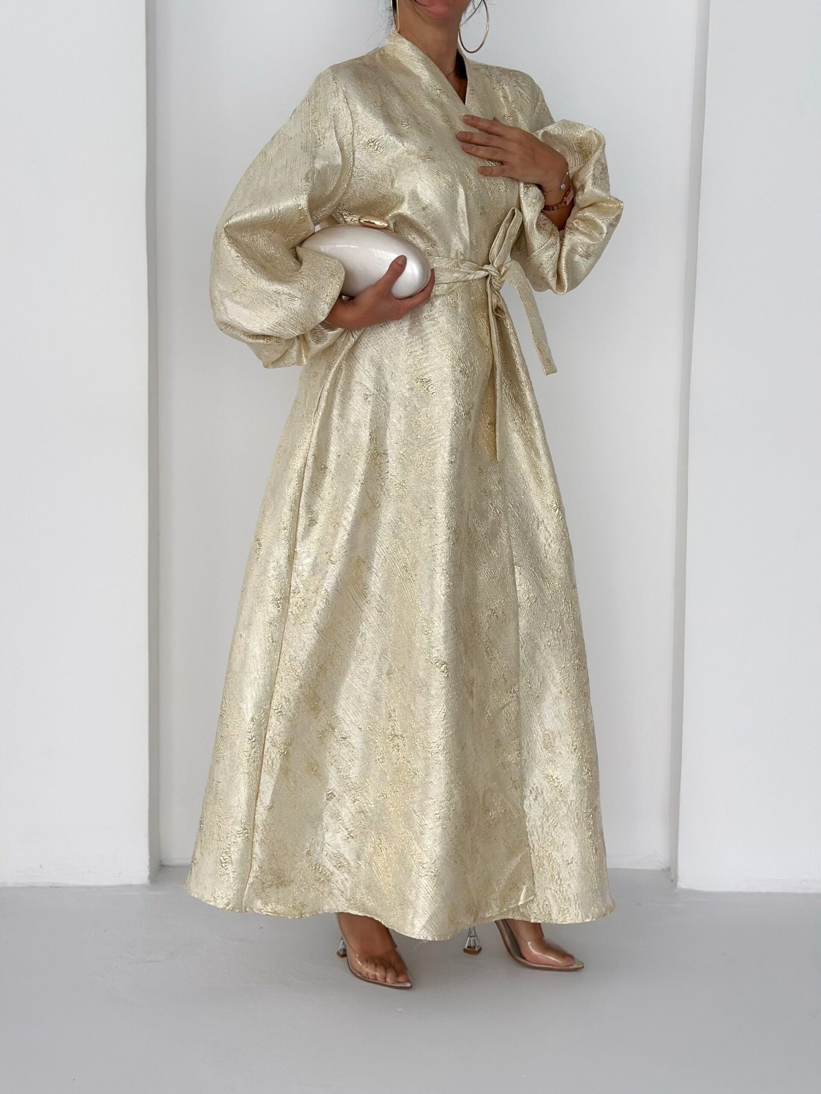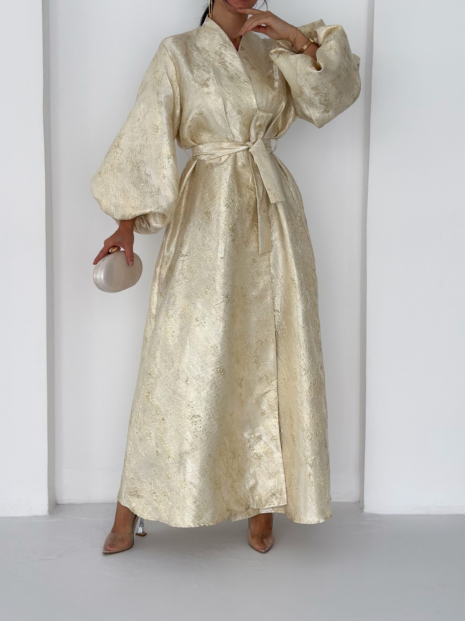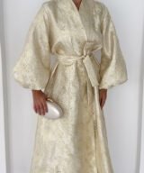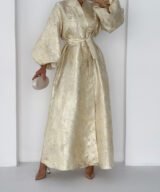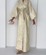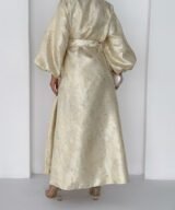 A luxurious shimmering champagne-gold abaya designed to make a statement. Featuring a wrap silhouette with a waist belt that enhances the shape and voluminous sleeves for a graceful, flowy look. The soft metallic finish makes it perfect for special occasions, Eid, and elegant evening outings.