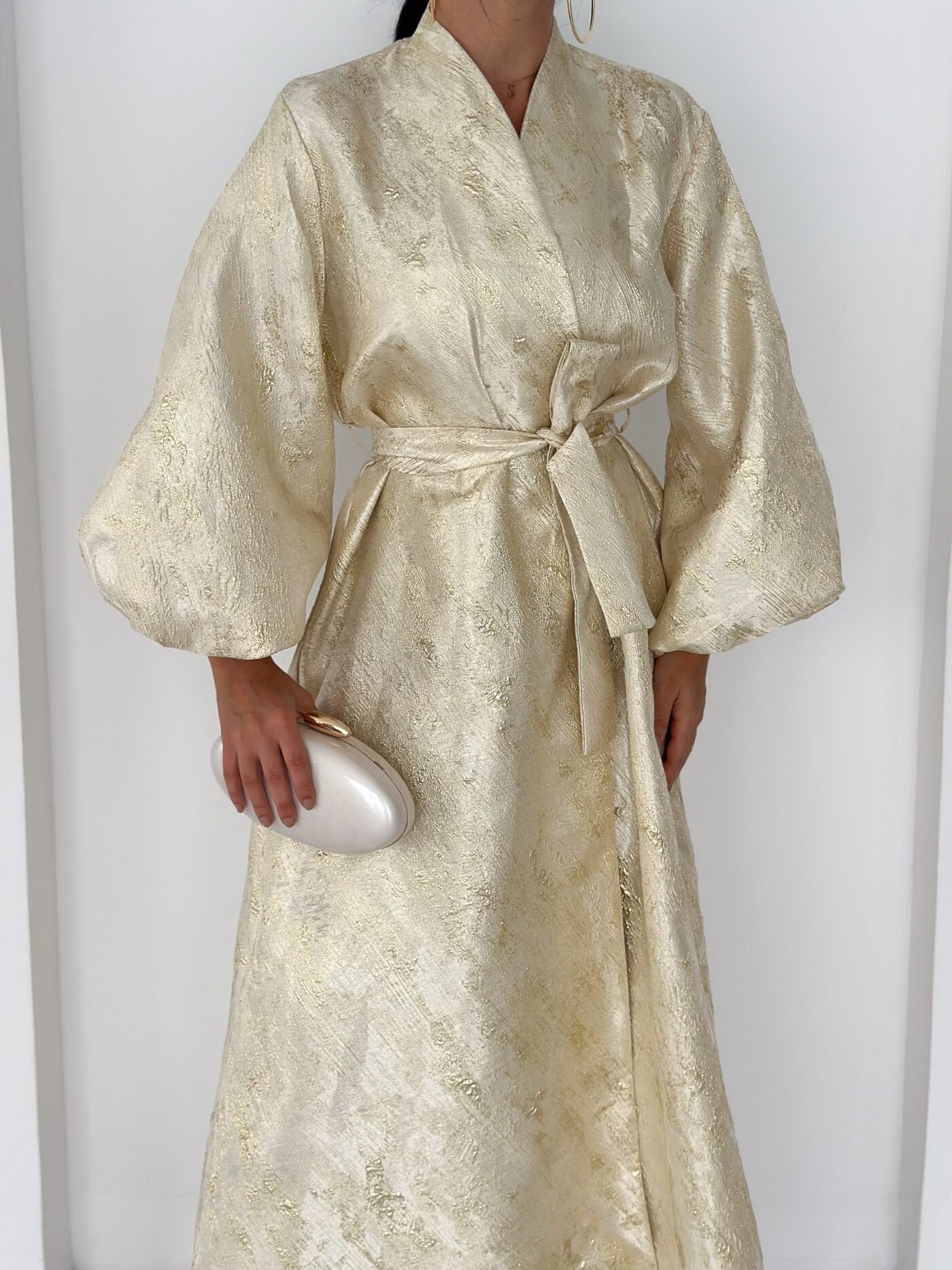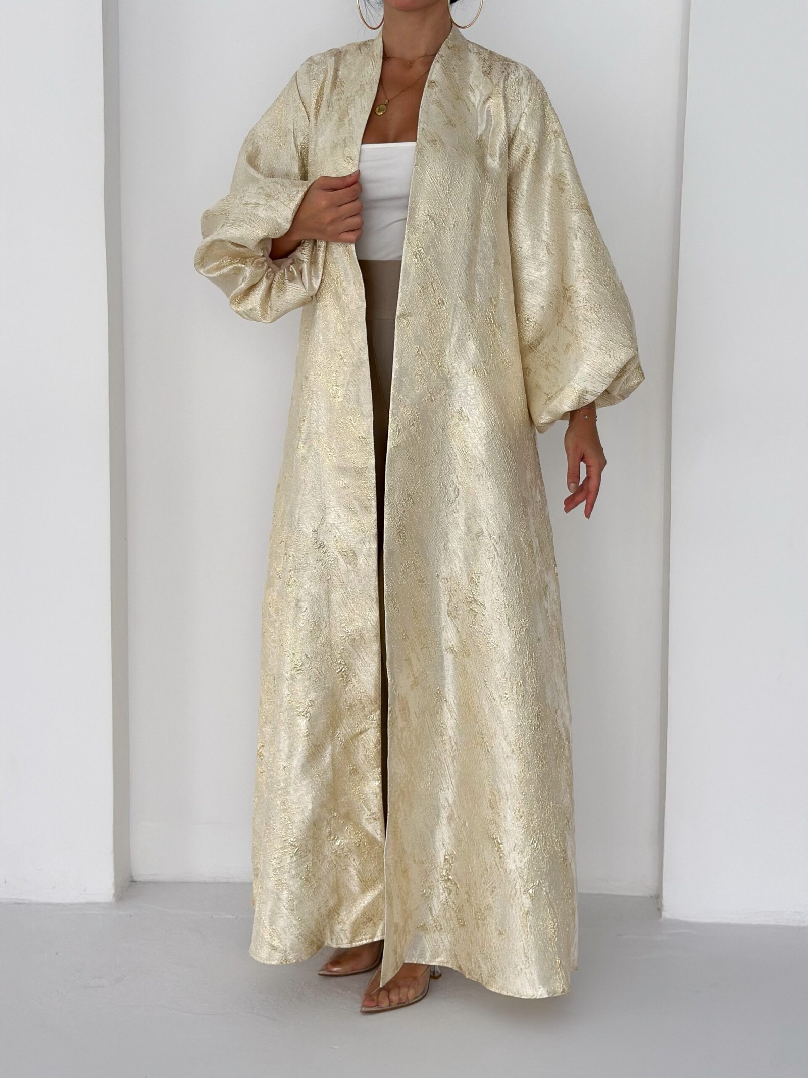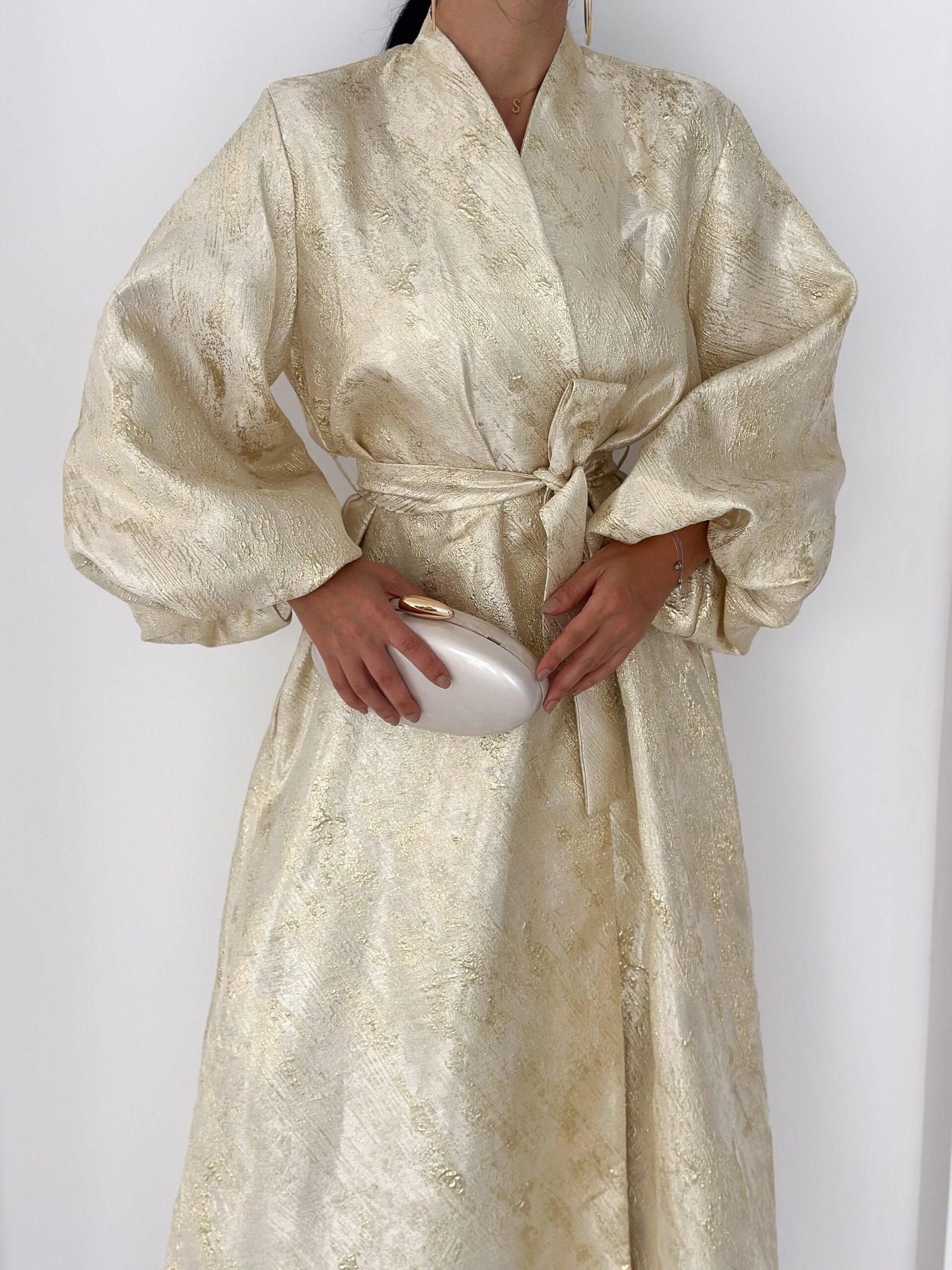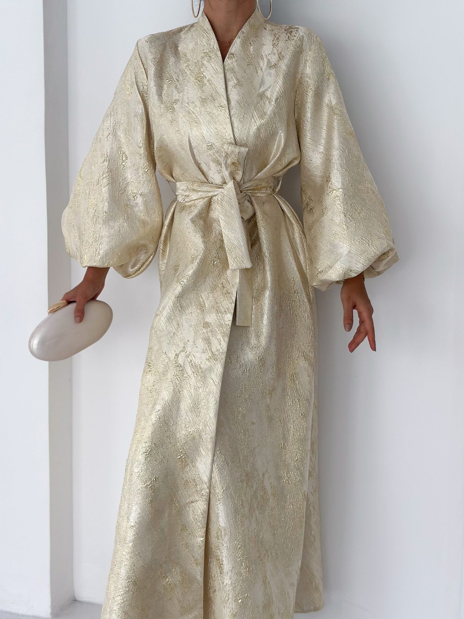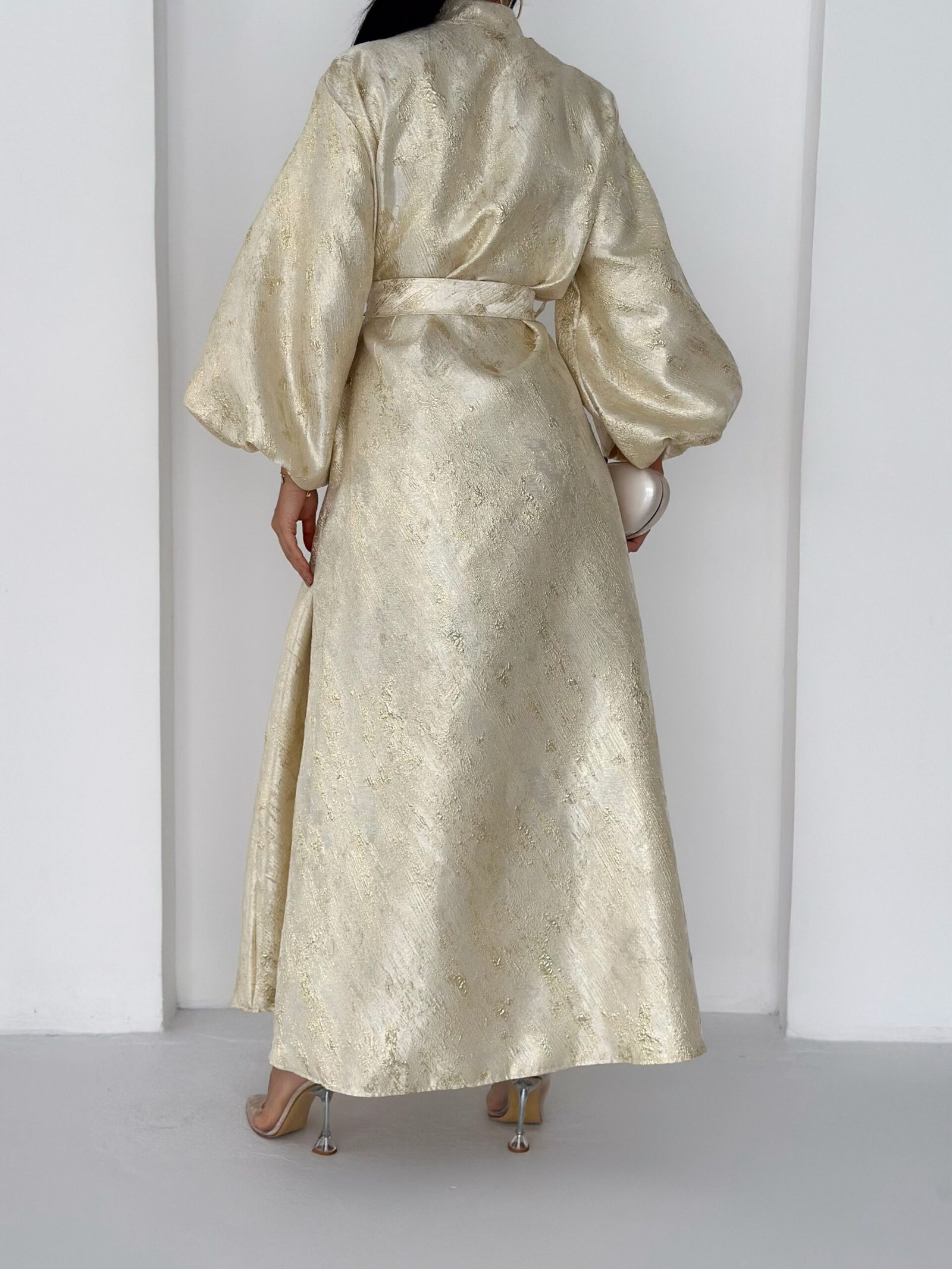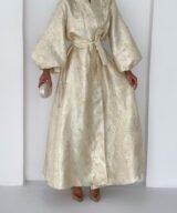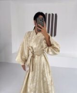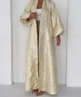 A luxurious shimmering champagne-gold abaya designed to make a statement. Featuring a wrap silhouette with a waist belt that enhances the shape and voluminous sleeves for a graceful, flowy look. The soft metallic finish makes it perfect for special occasions, Eid, and elegant evening outings.
