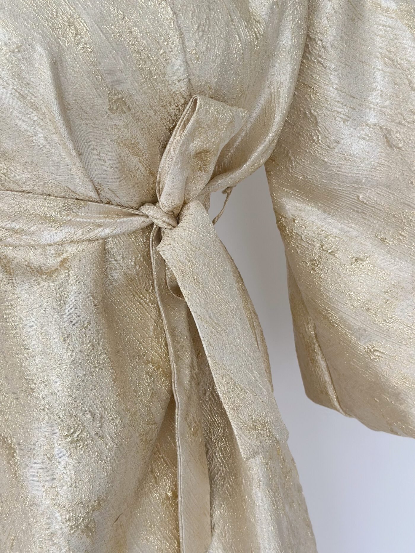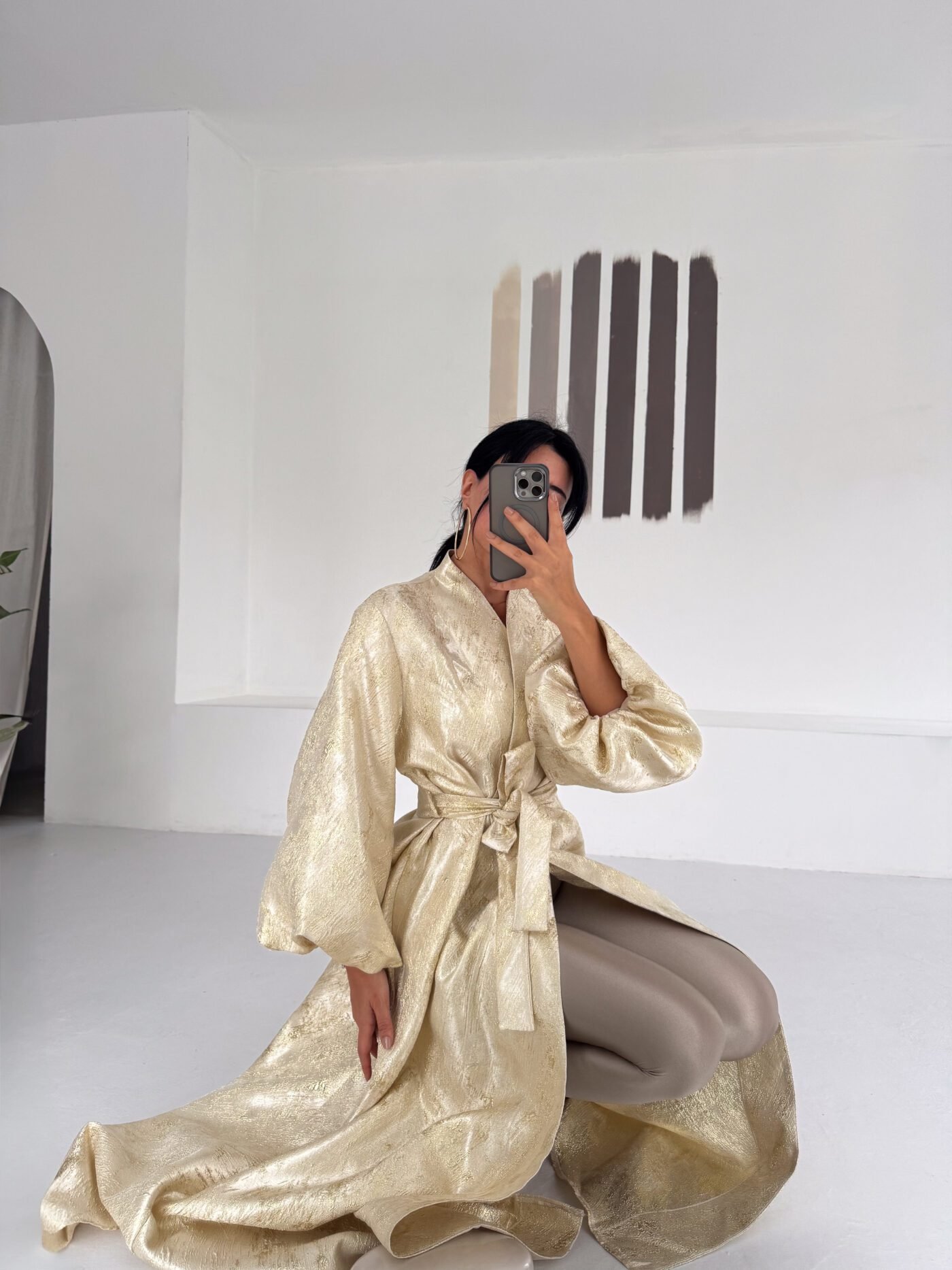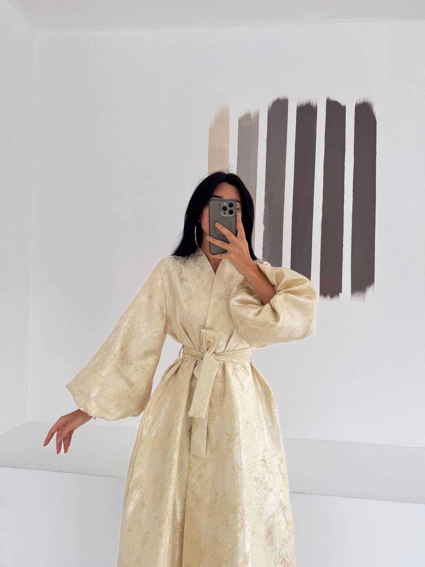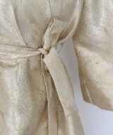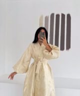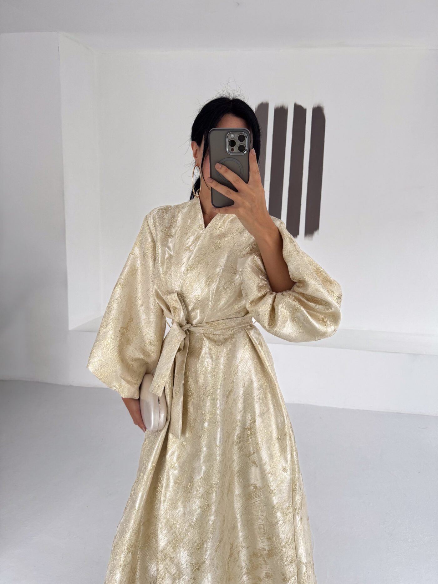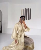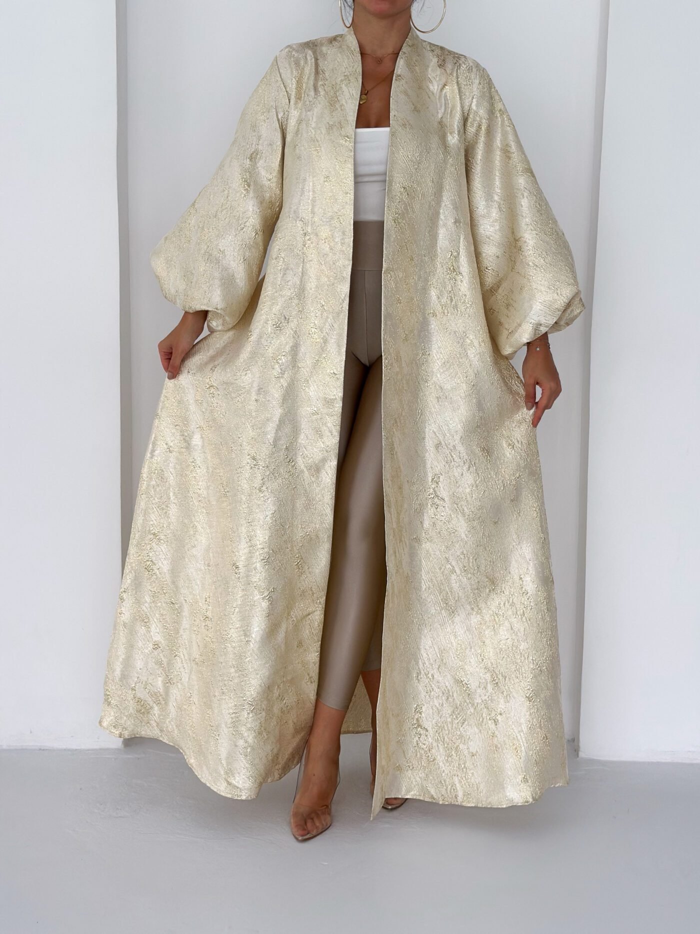 A luxurious shimmering champagne-gold abaya designed to make a statement. Featuring a wrap silhouette with a waist belt that enhances the shape and voluminous sleeves for a graceful, flowy look. The soft metallic finish makes it perfect for special occasions, Eid, and elegant evening outings.