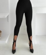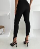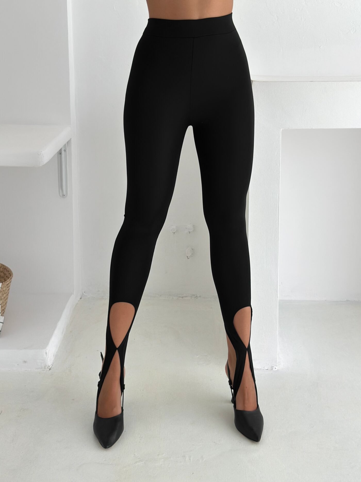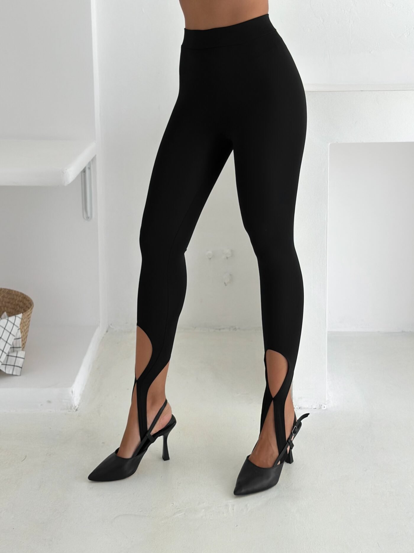 Sleek black leggings featuring a chic cut-out design at the ankle. Crafted from stretchy, comfortable fabric that sculpts the body while offering ease of movement. Perfect to style with heels for an elegant look or with casual shoes for everyday wear.