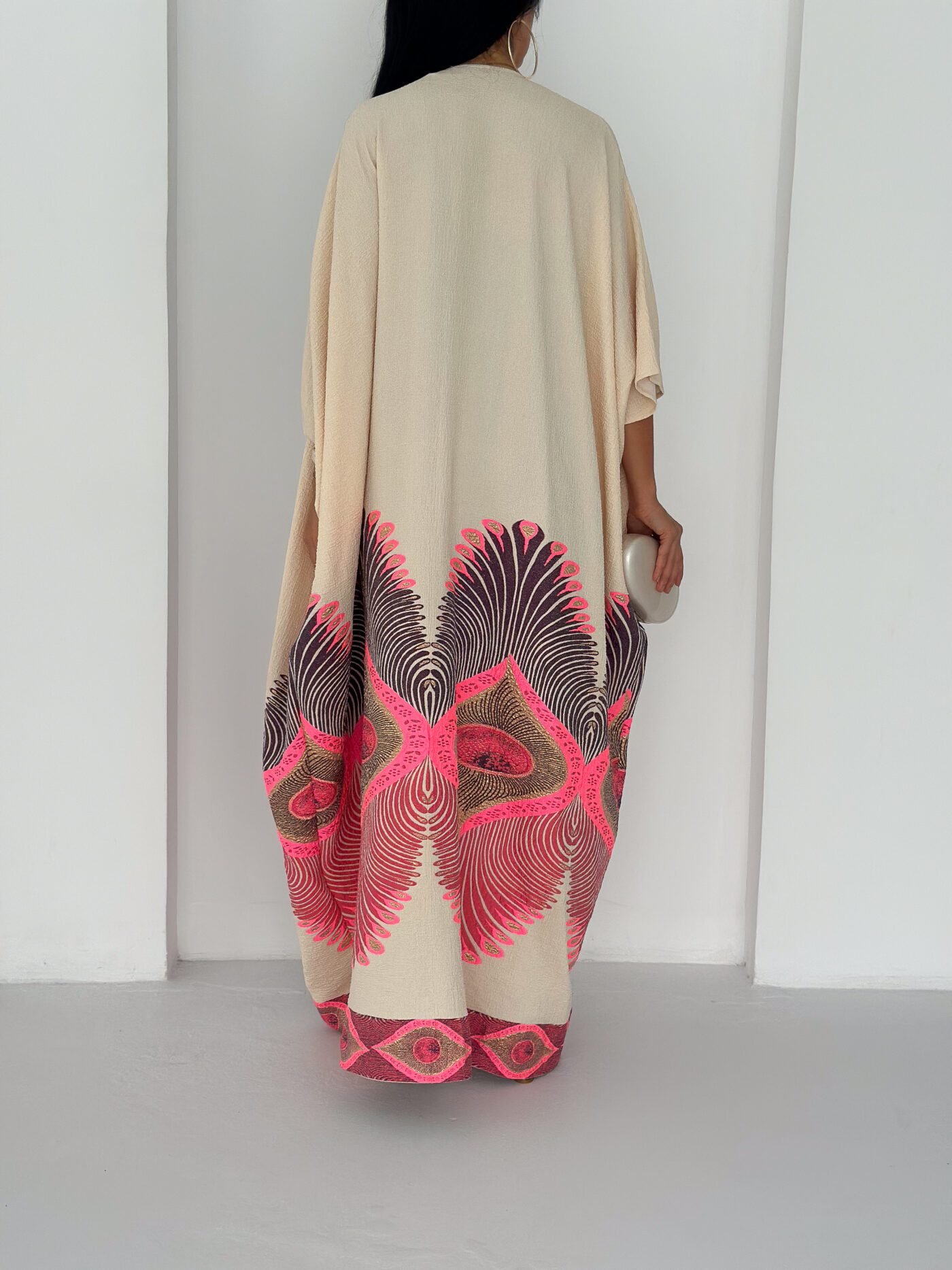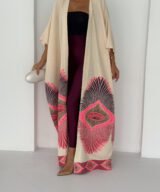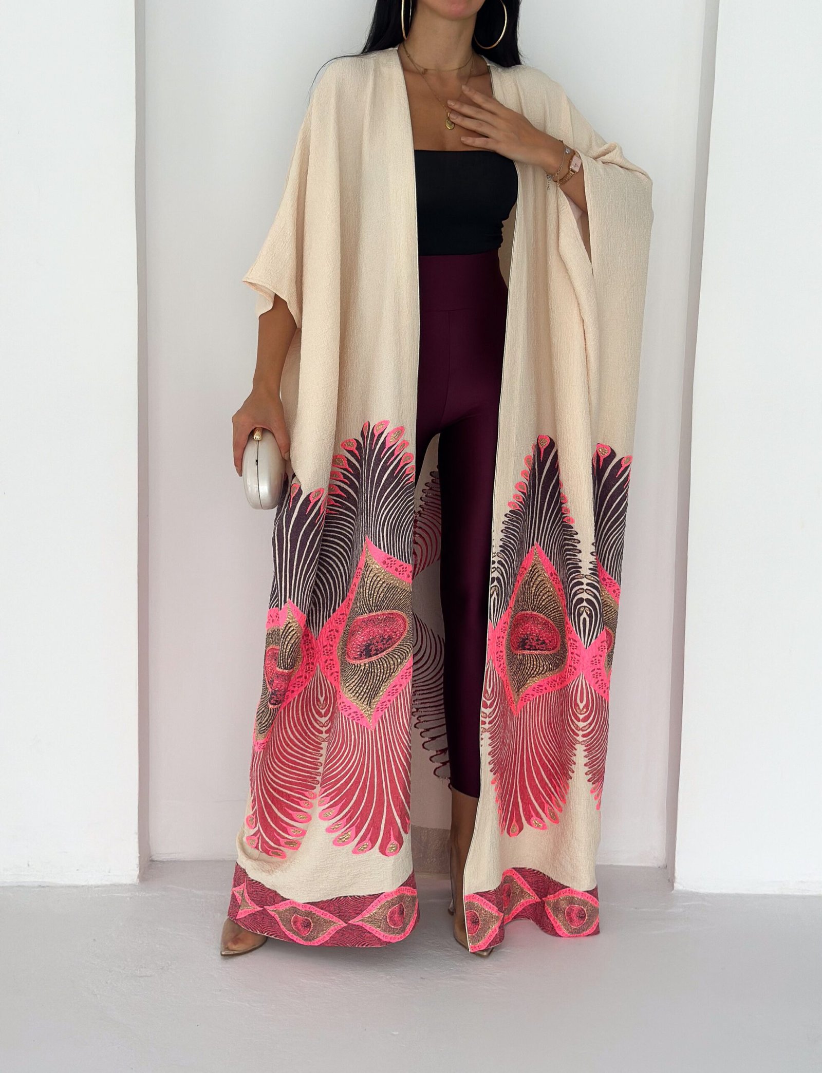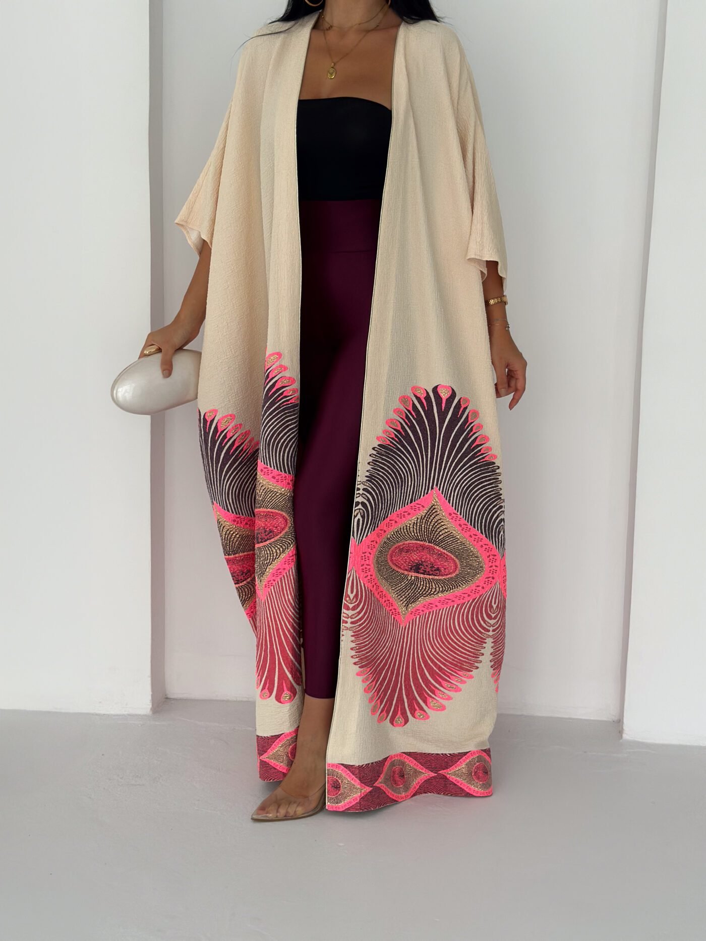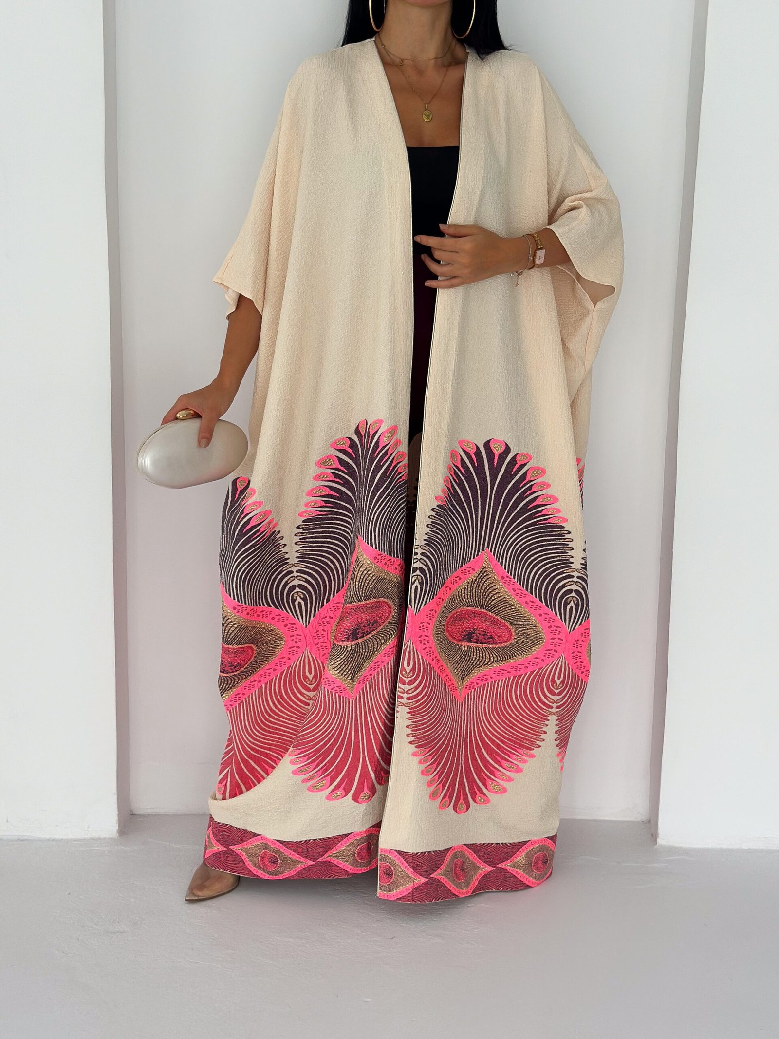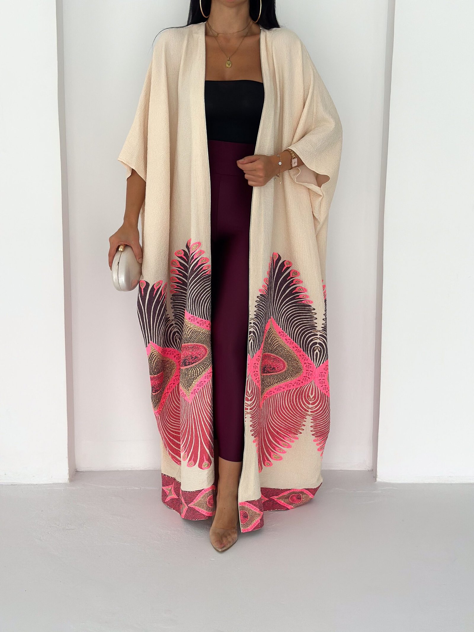 A statement Ramadan piece designed to capture elegance and warmth in one look. This abaya features a soft creamy base adorned with bold artistic motifs in rich pink, burgundy, and earthy tones, creating a striking yet graceful silhouette.