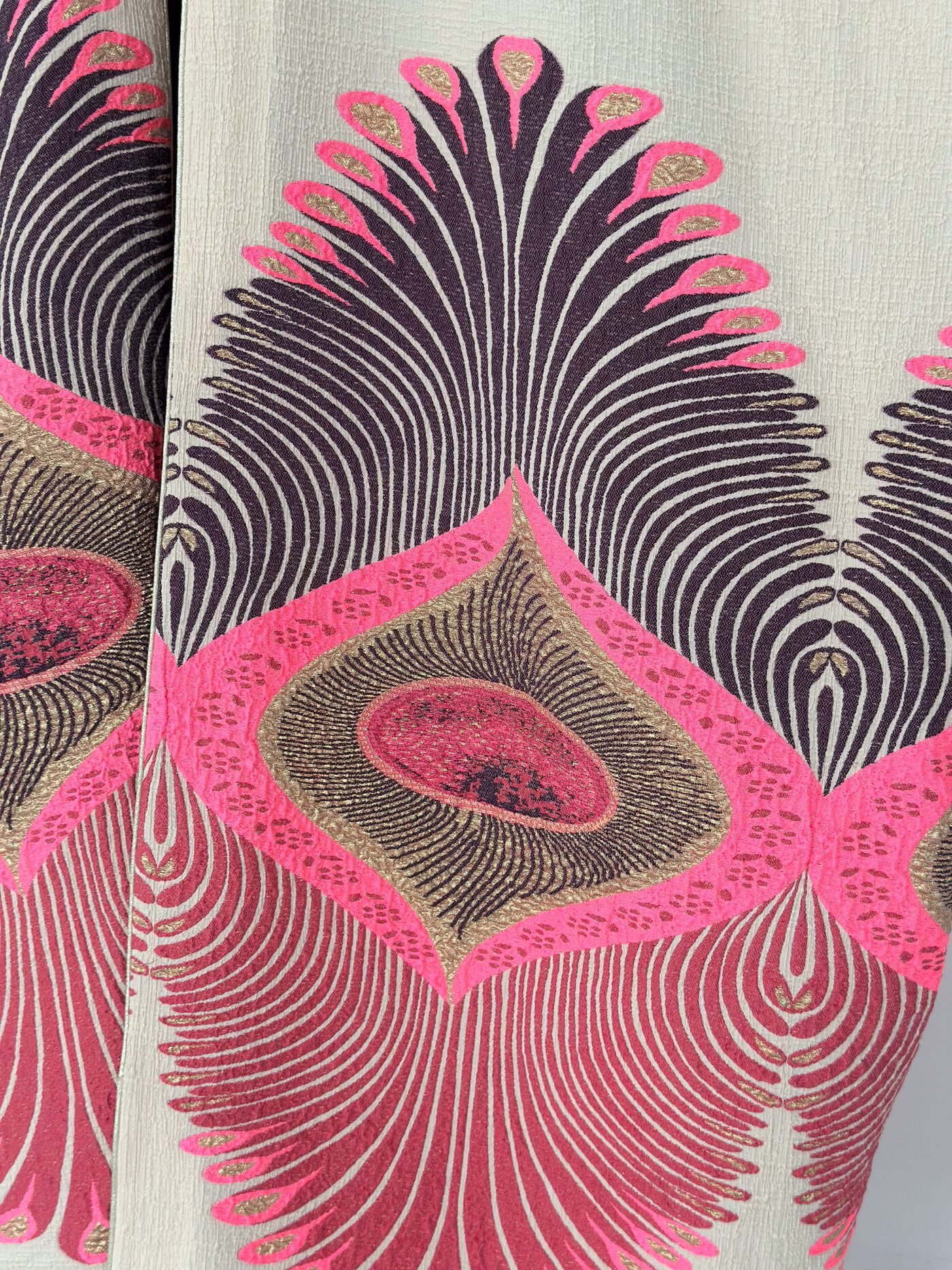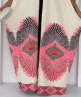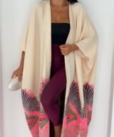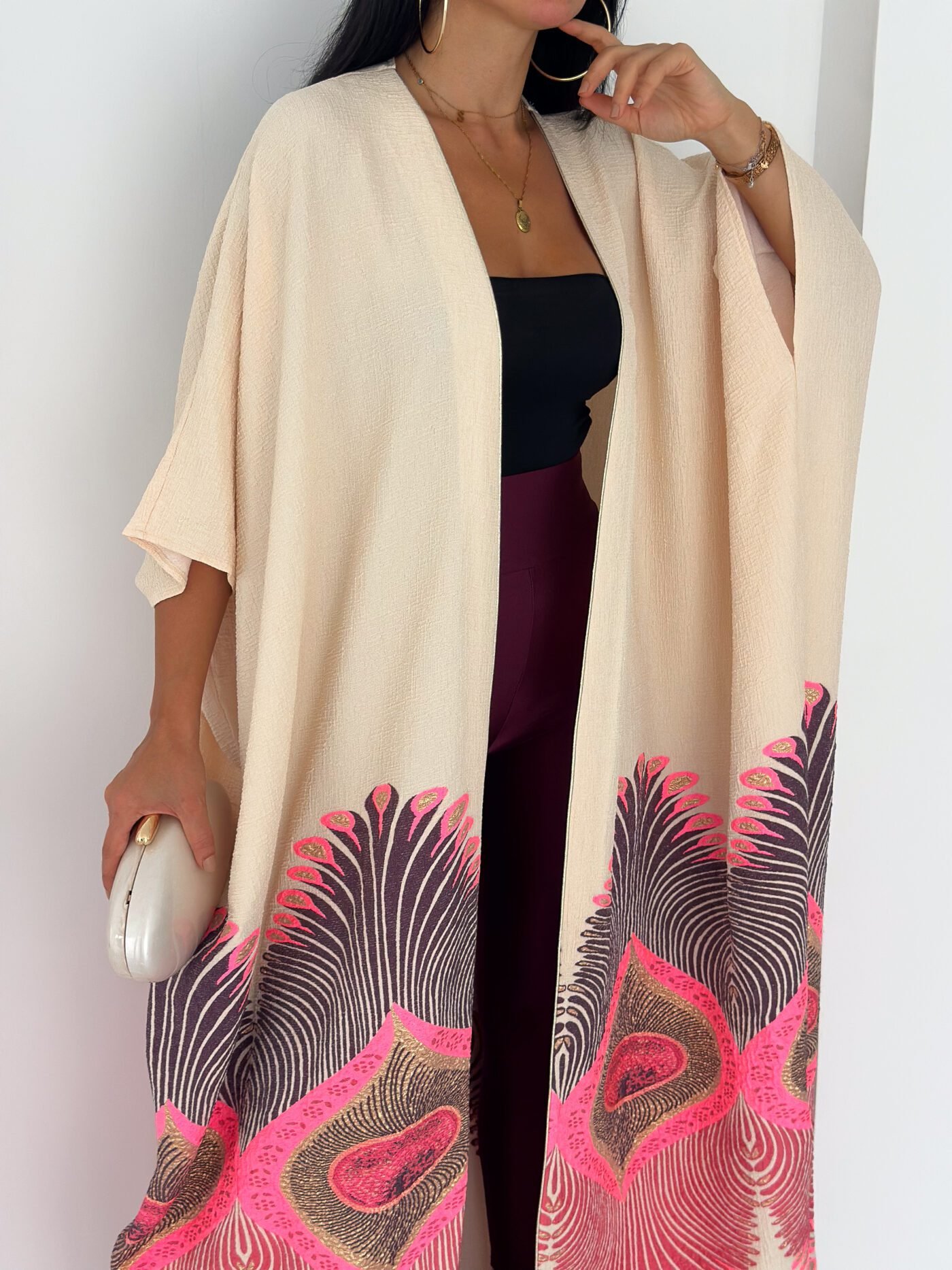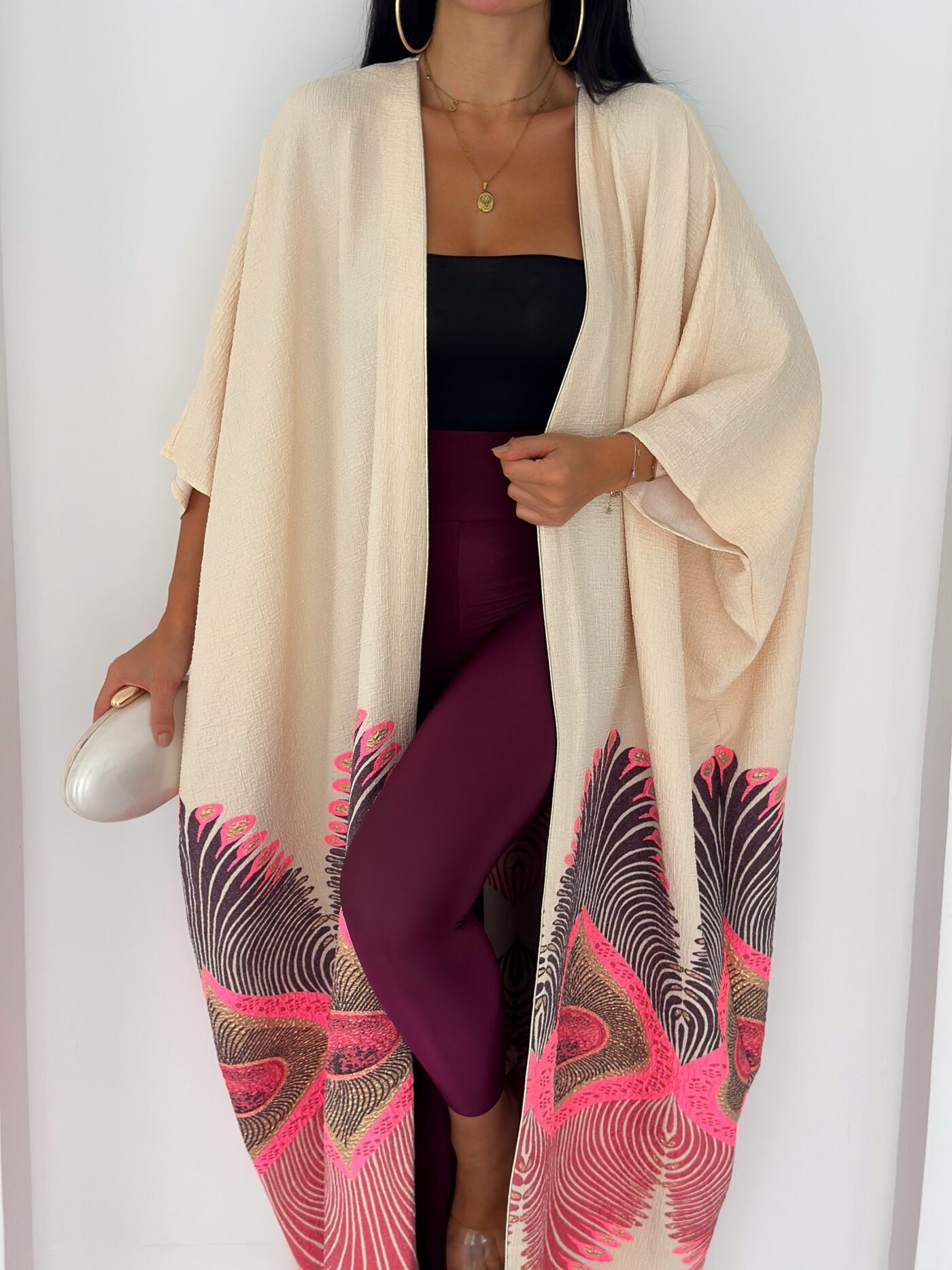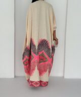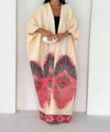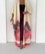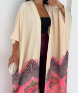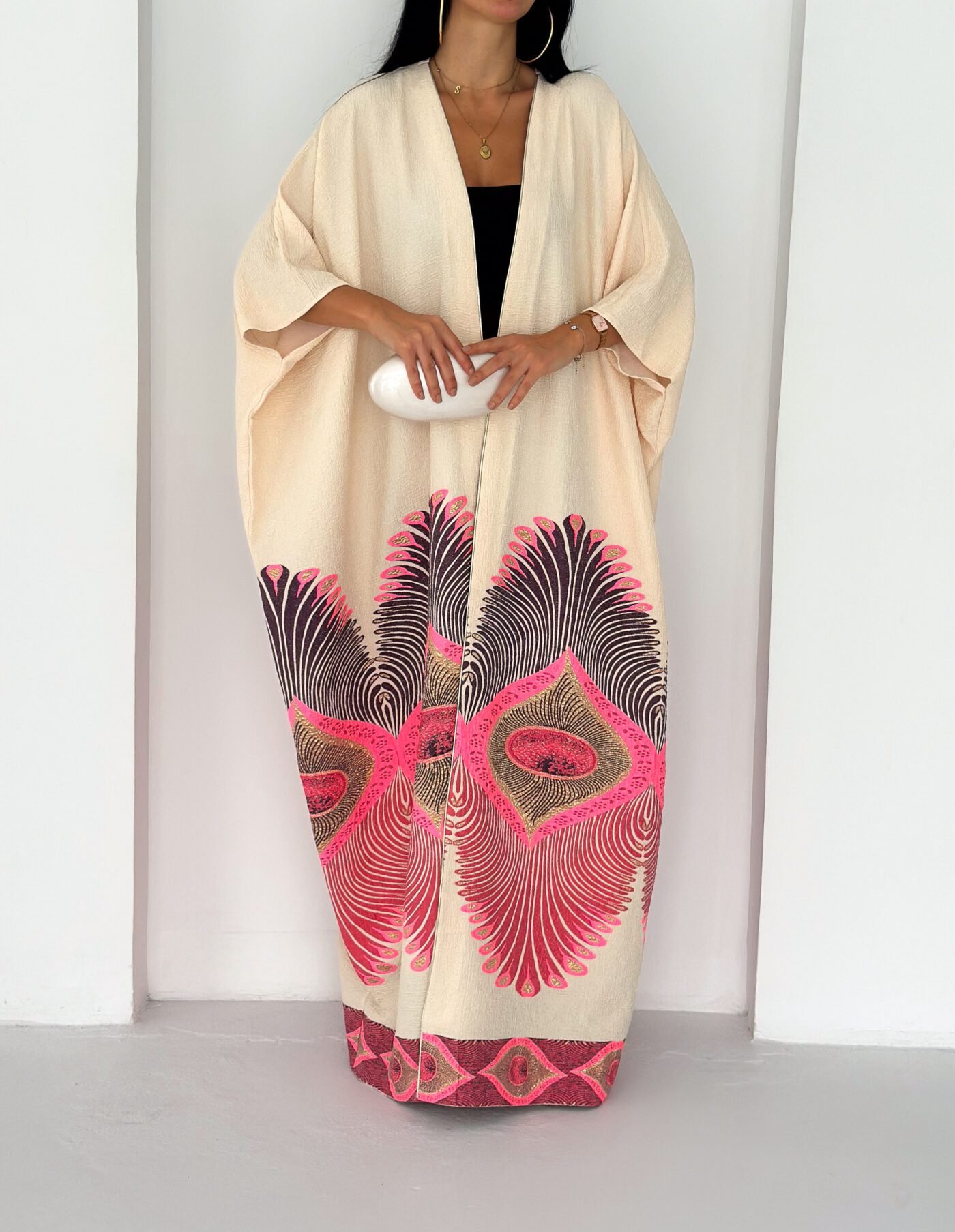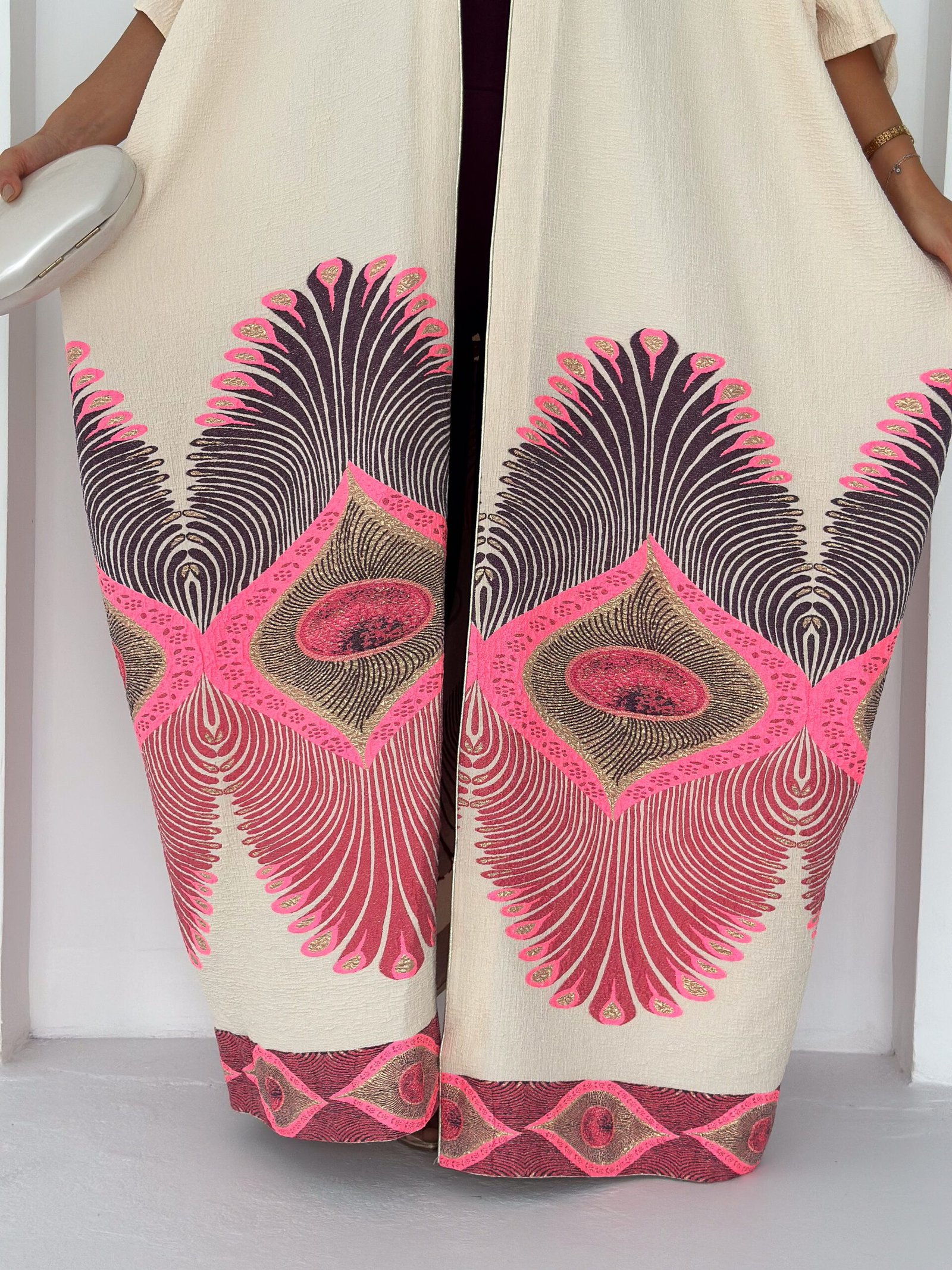 A statement Ramadan piece designed to capture elegance and warmth in one look. This abaya features a soft creamy base adorned with bold artistic motifs in rich pink, burgundy, and earthy tones, creating a striking yet graceful silhouette.