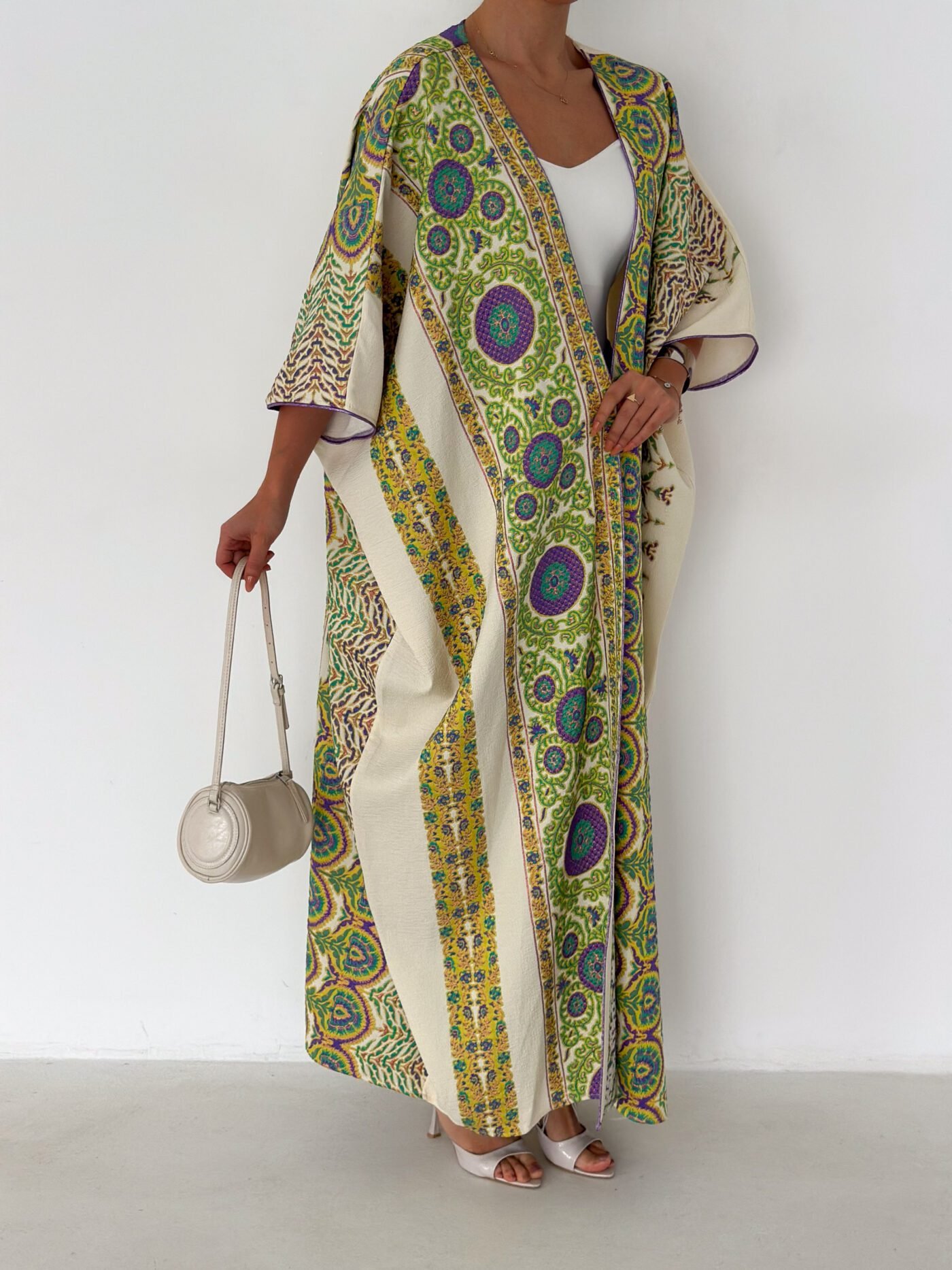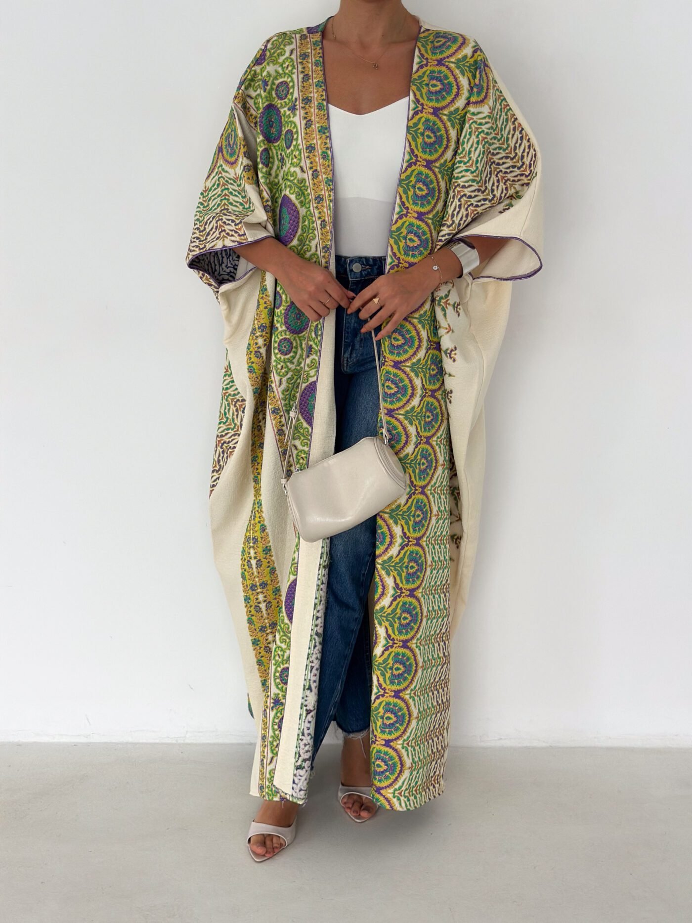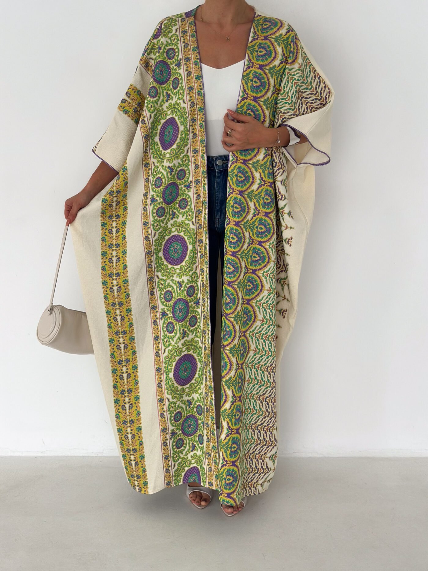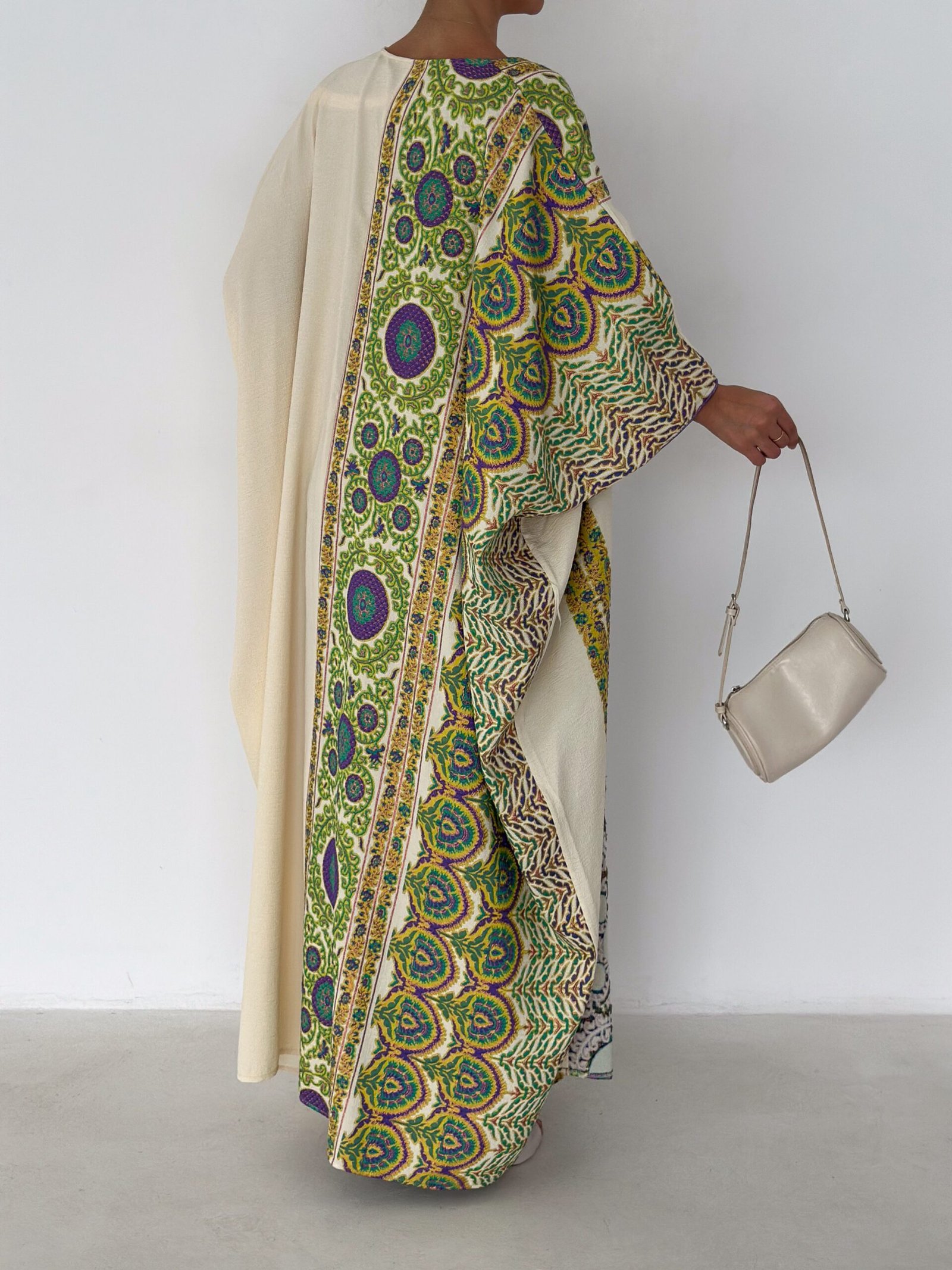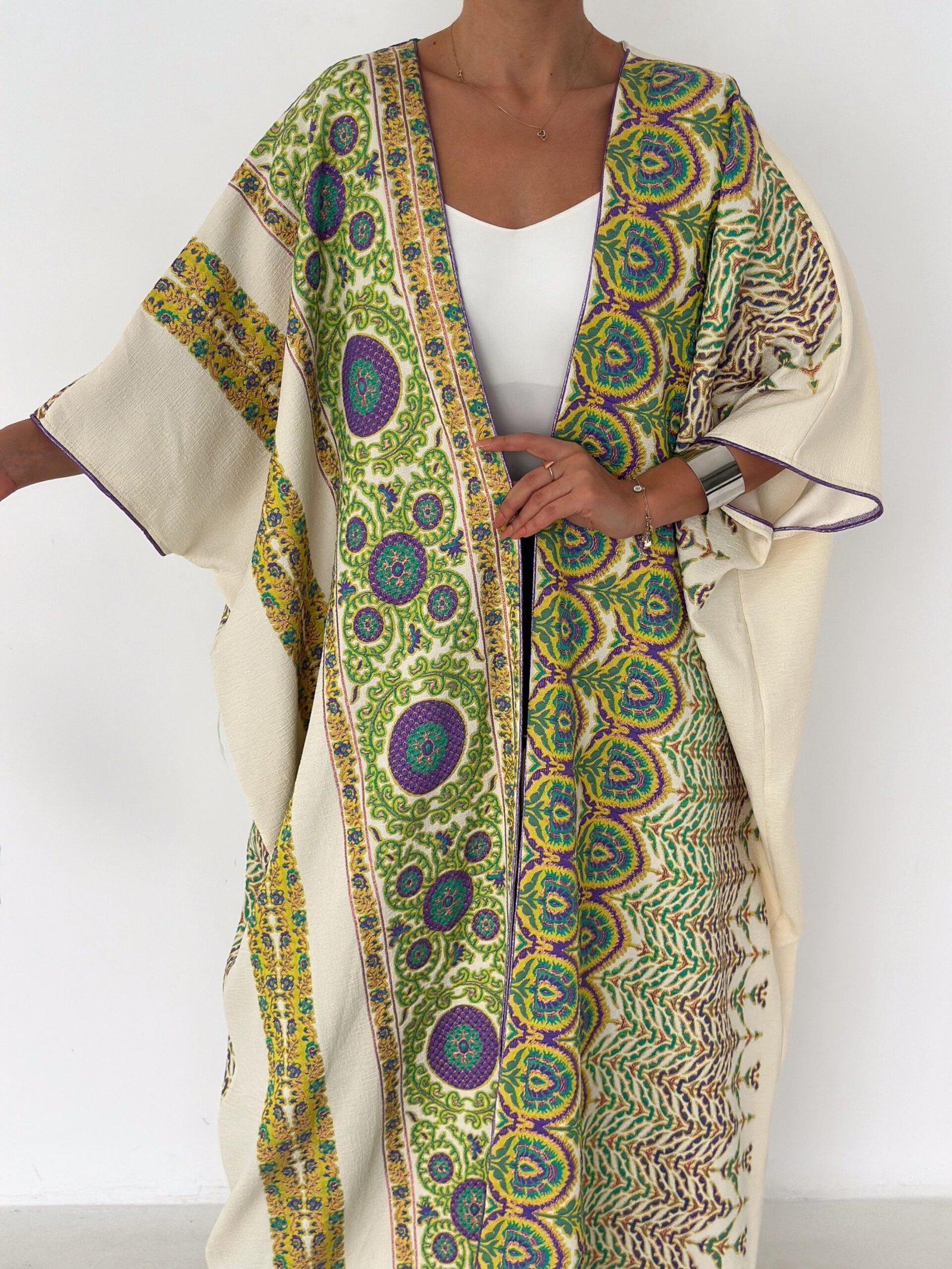 A statement abaya crafted in a soft ivory base, beautifully adorned with vibrant green, purple, and gold-inspired mosaic patterns.