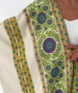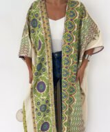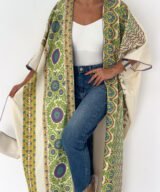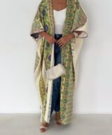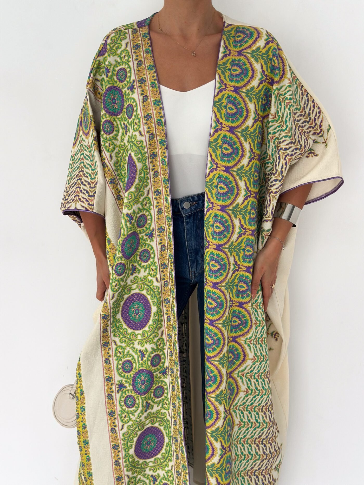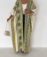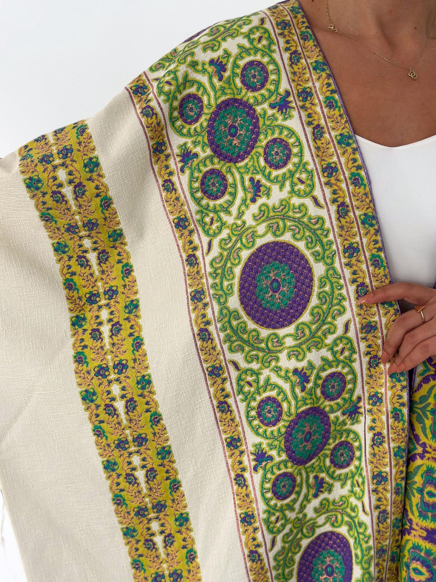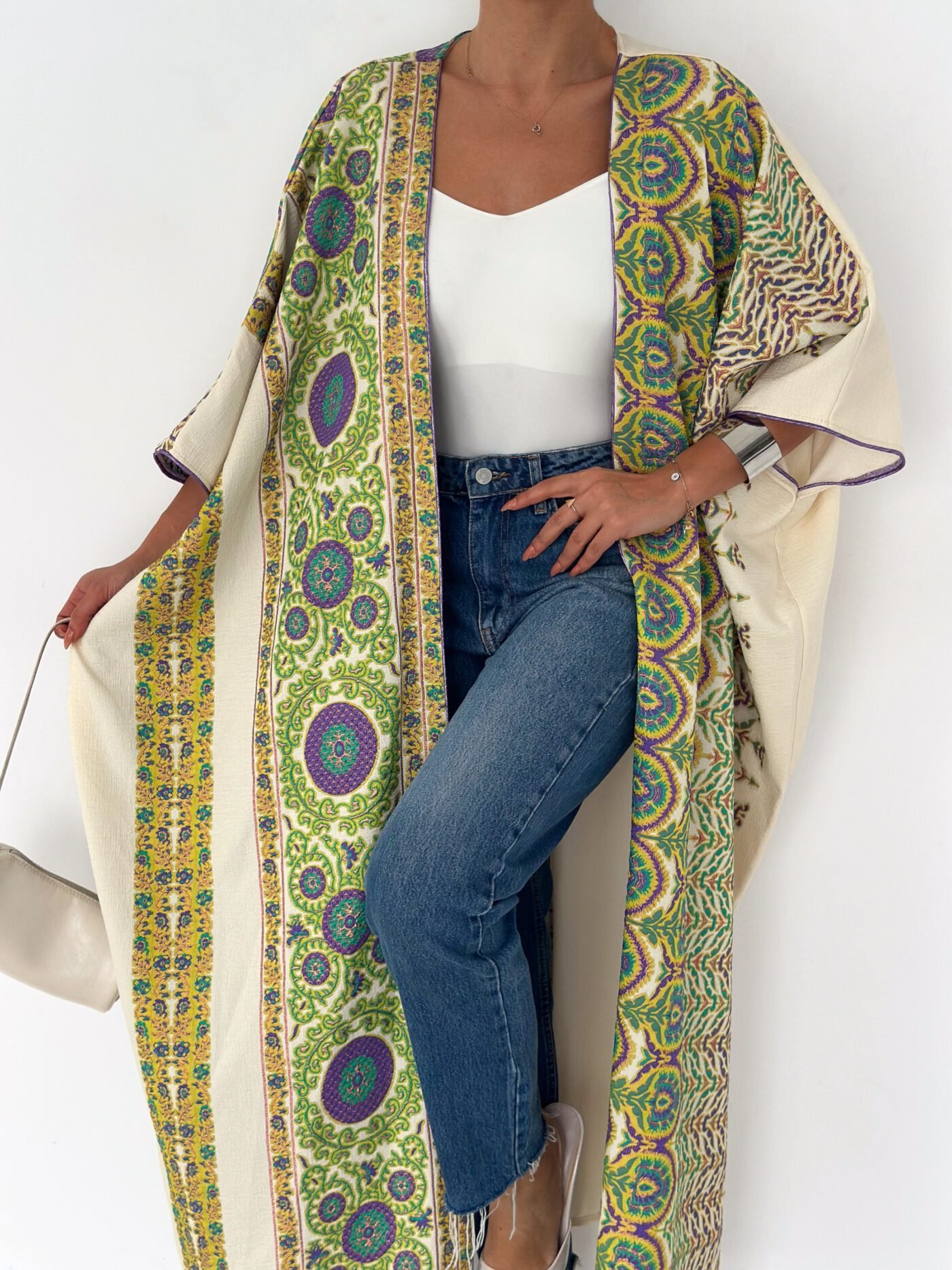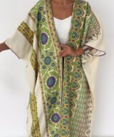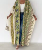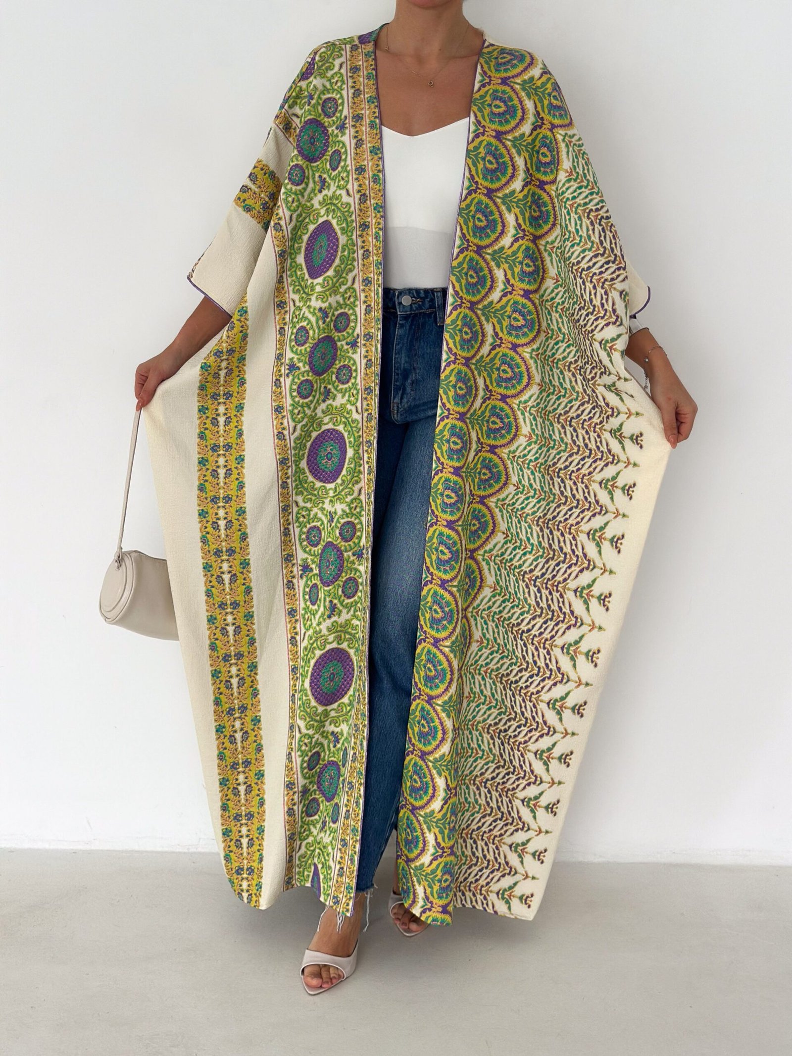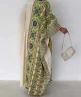 A statement abaya crafted in a soft ivory base, beautifully adorned with vibrant green, purple, and gold-inspired mosaic patterns.