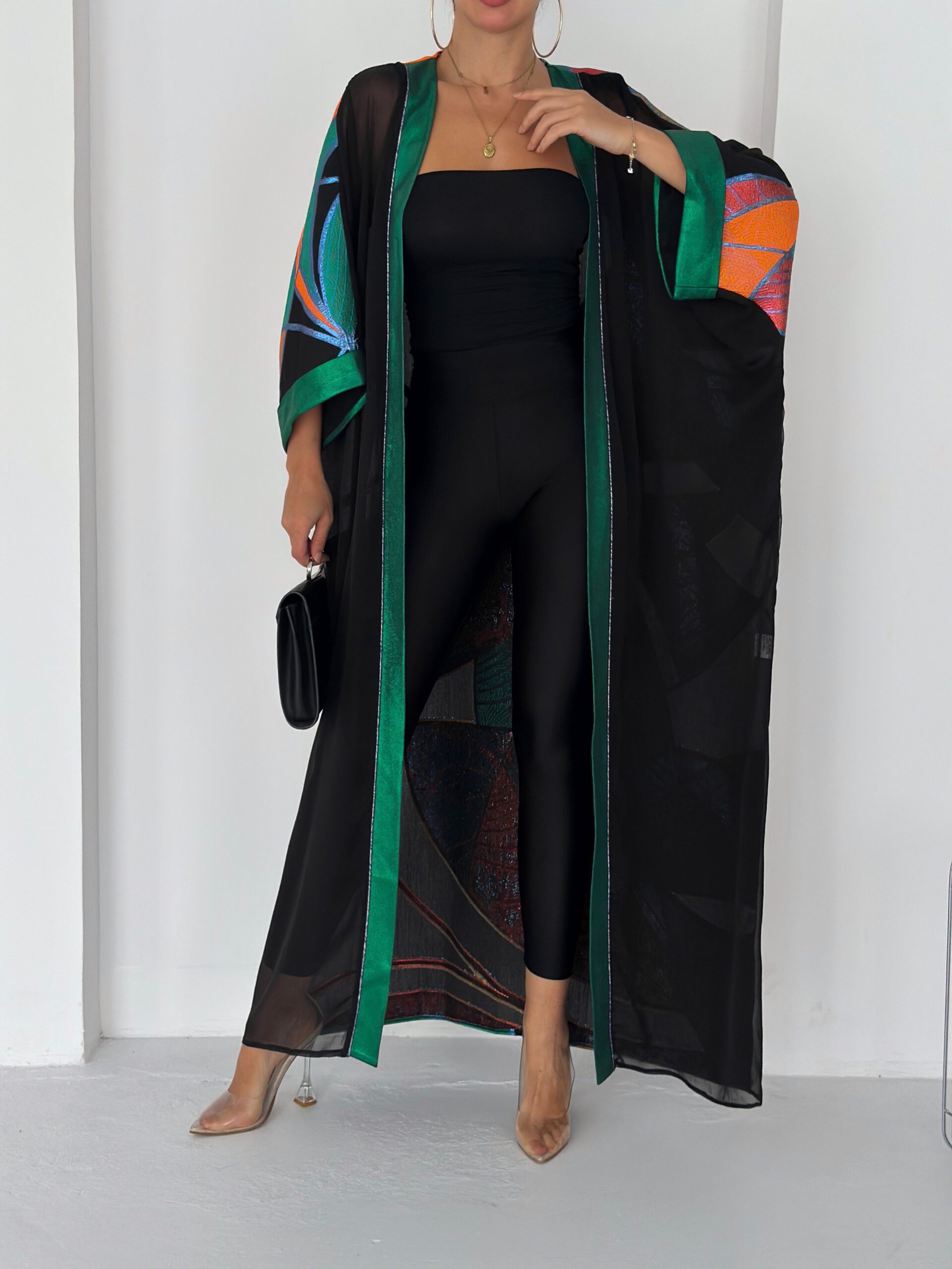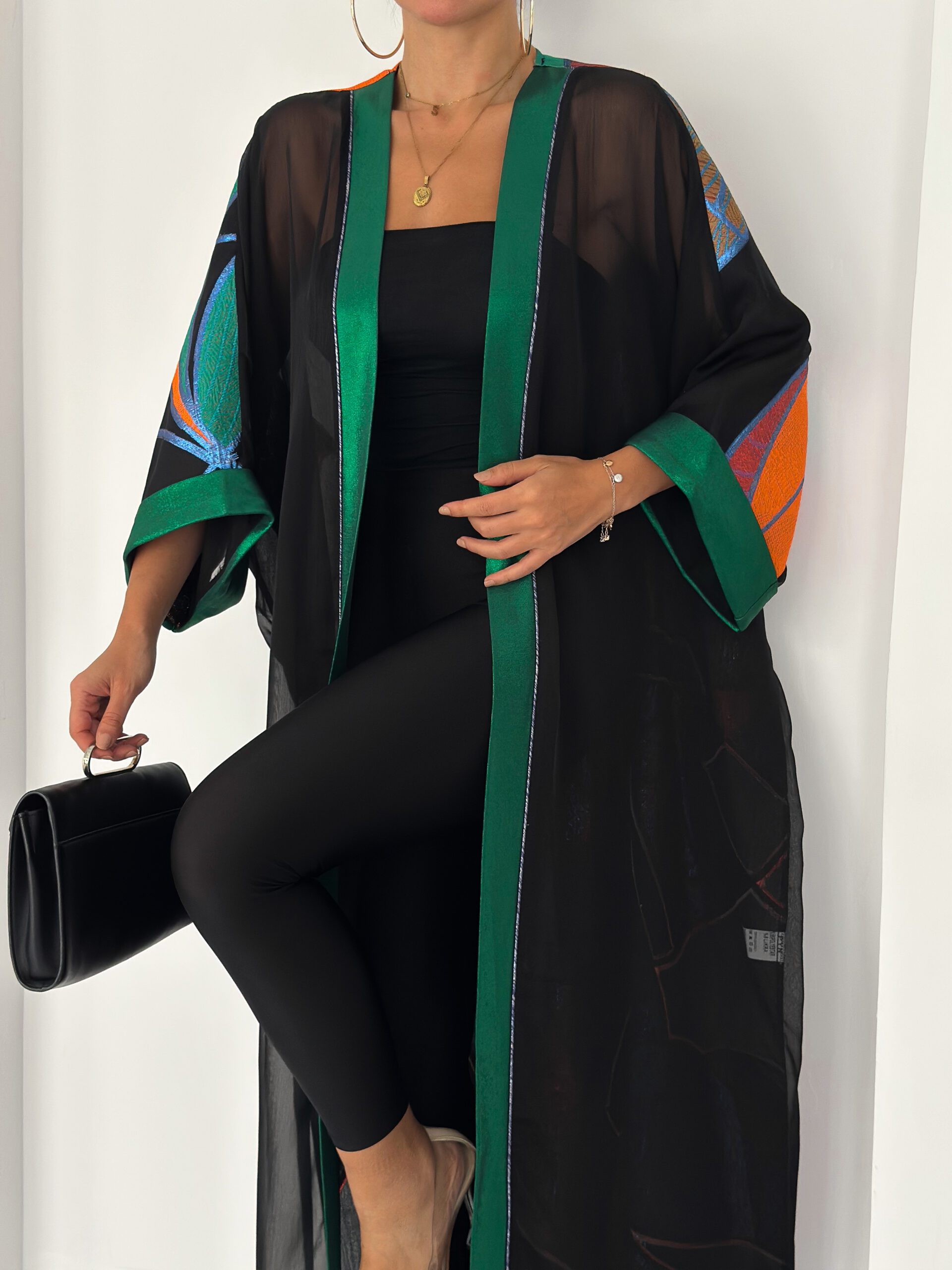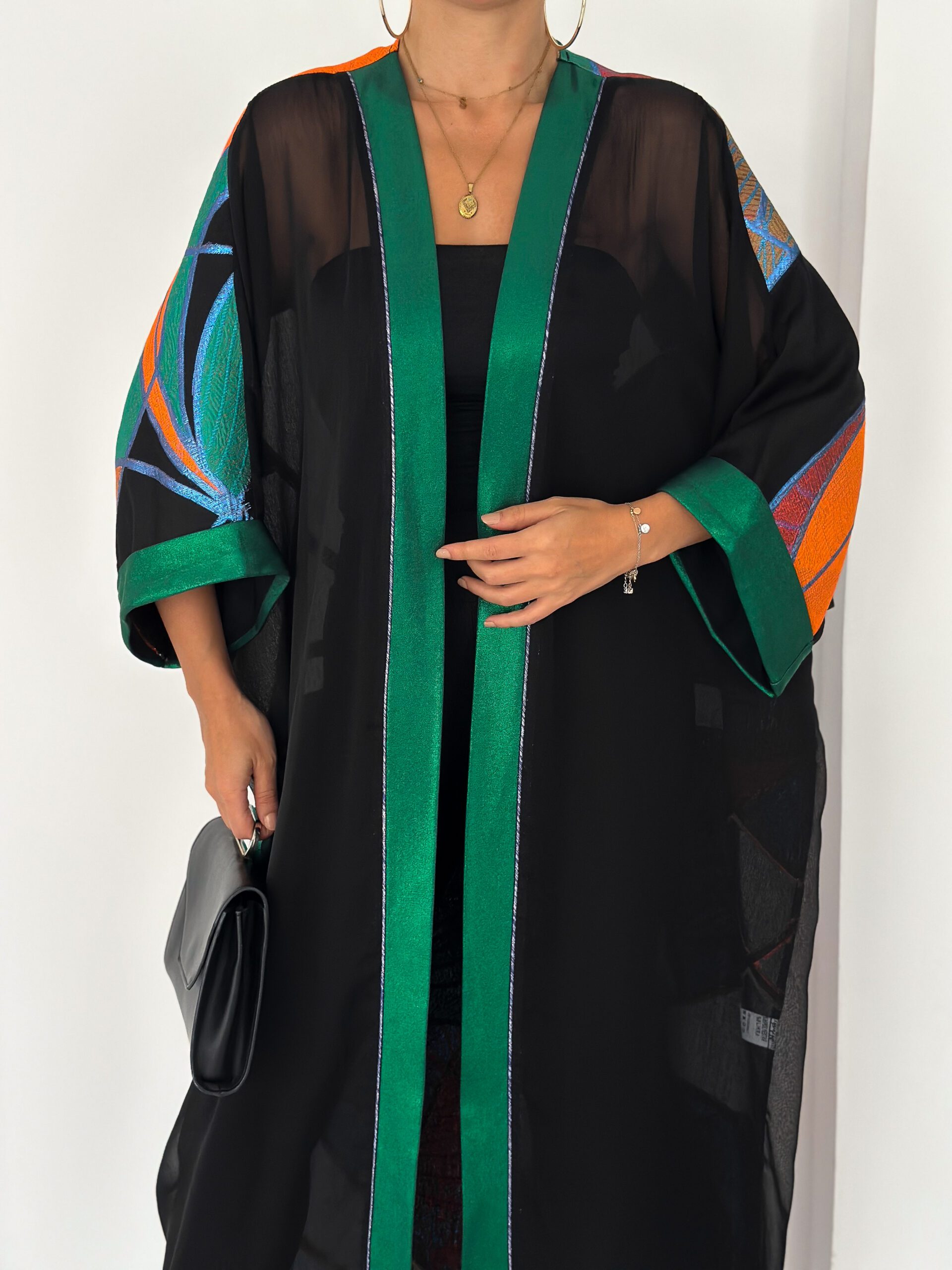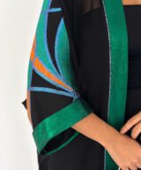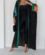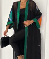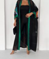 Finished with a rich emerald satin trim along the front and sleeves, adding structure and elegance to the fluid silhouette.