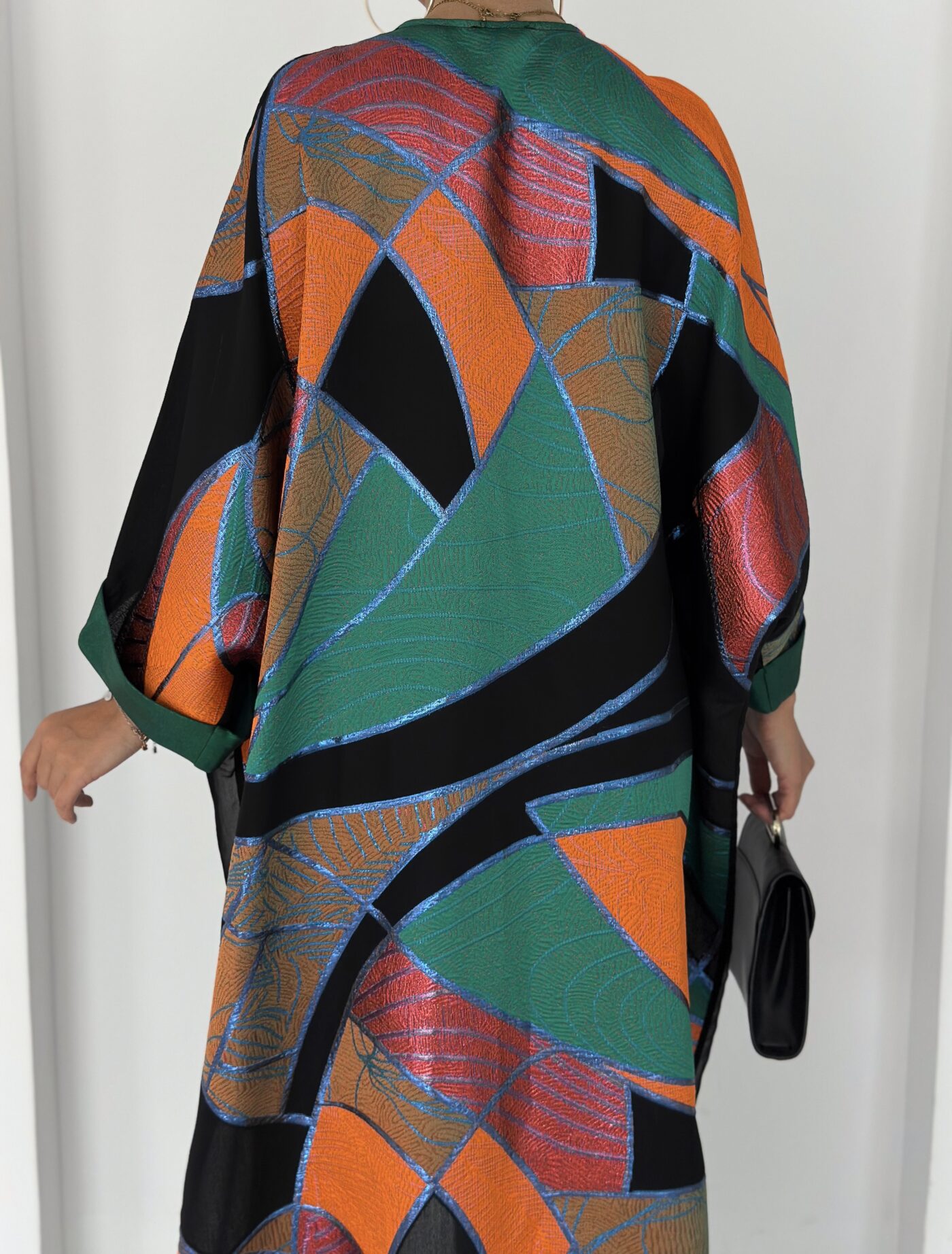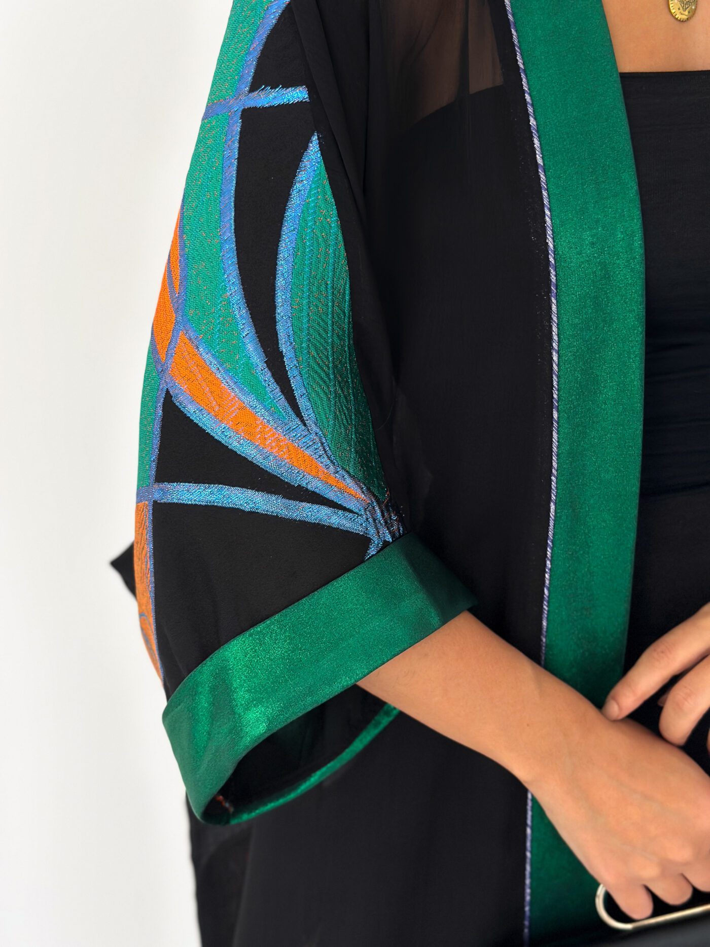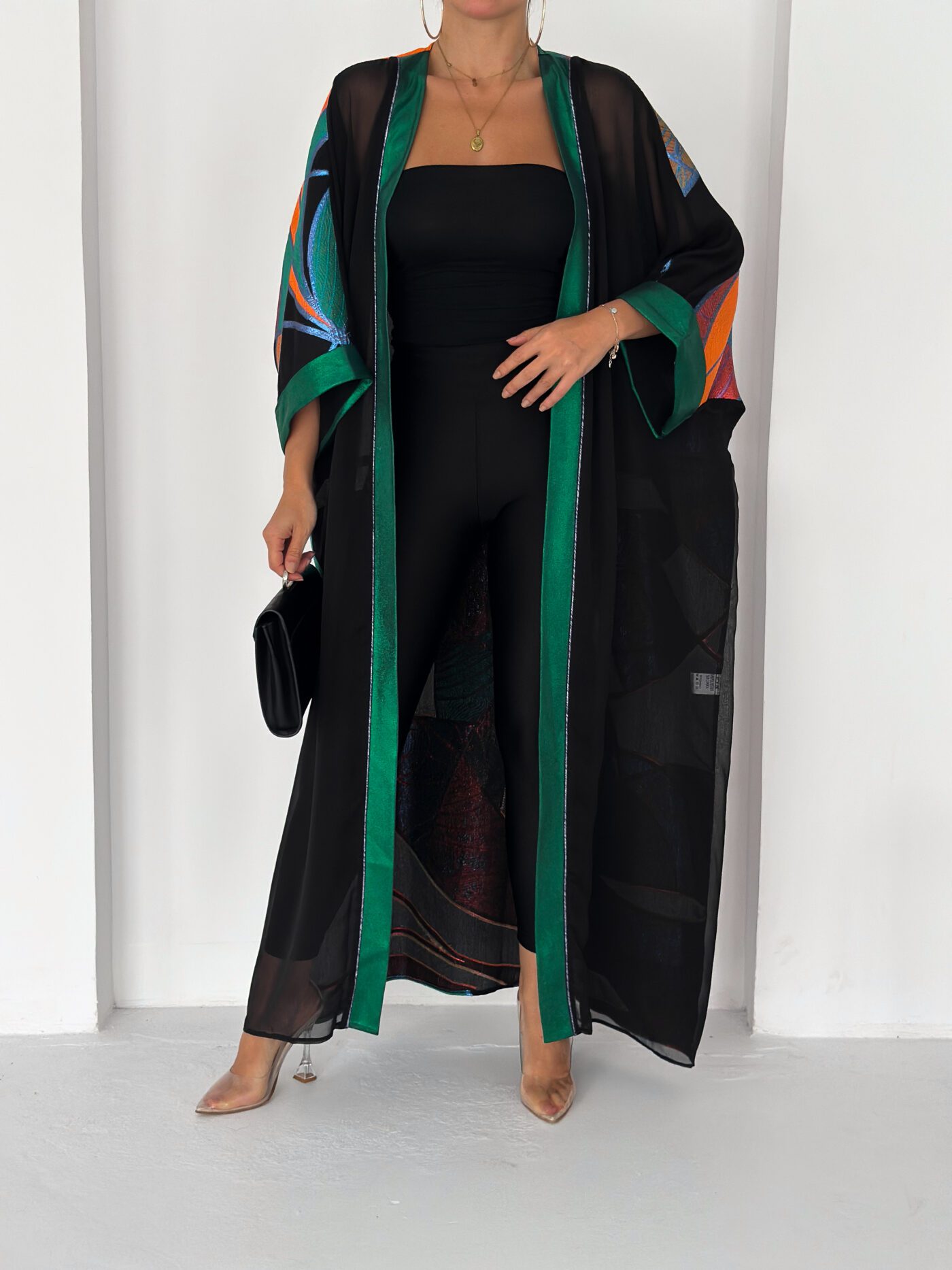 Finished with a rich emerald satin trim along the front and sleeves, adding structure and elegance to the fluid silhouette.