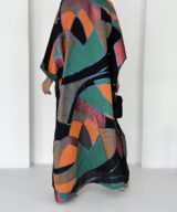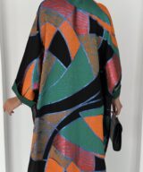 Crafted from lightweight chiffon with a striking mosaic-inspired print in emerald green, burnt orange, deep red, and earthy bronze tones.