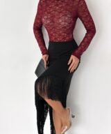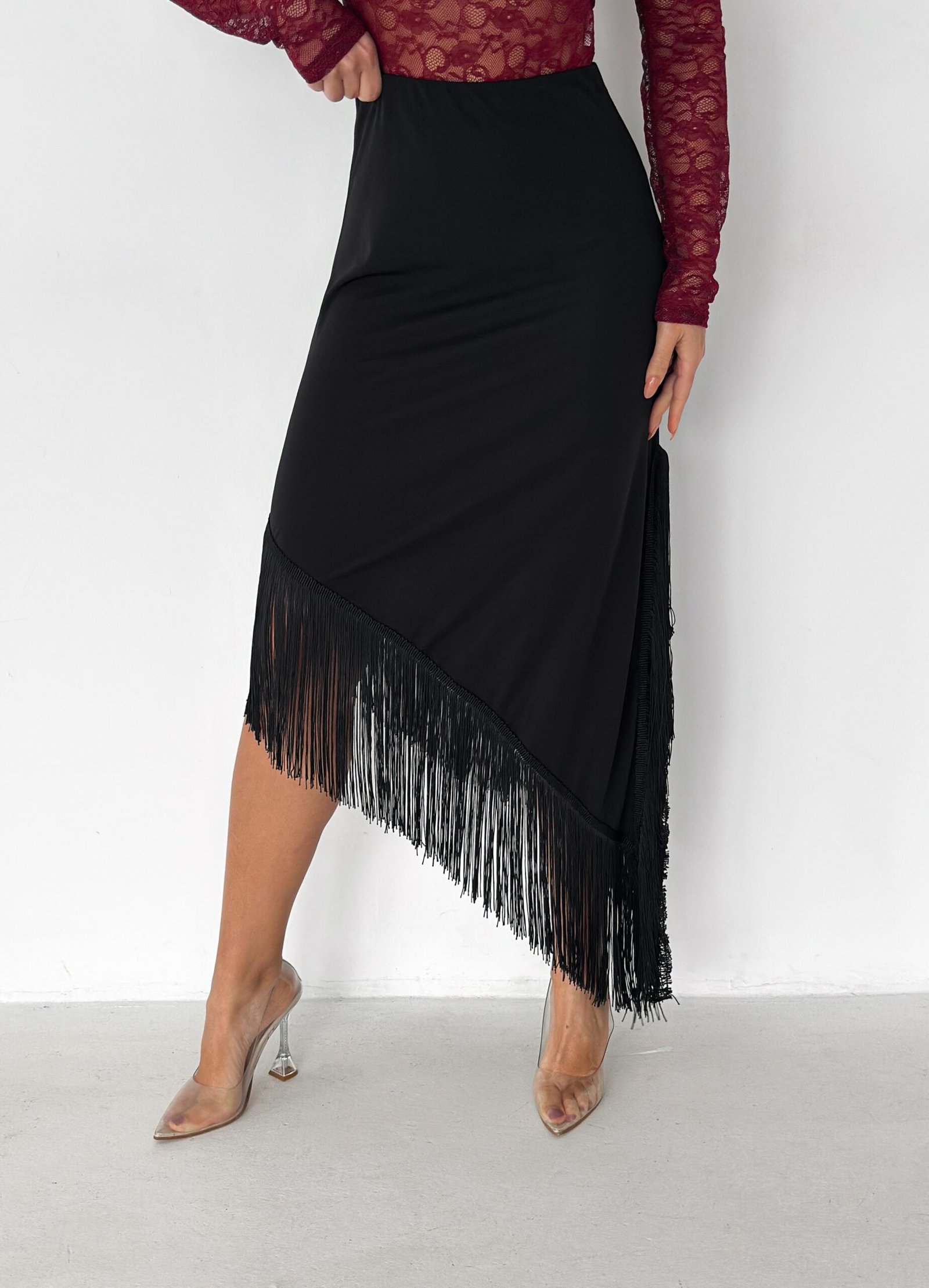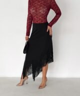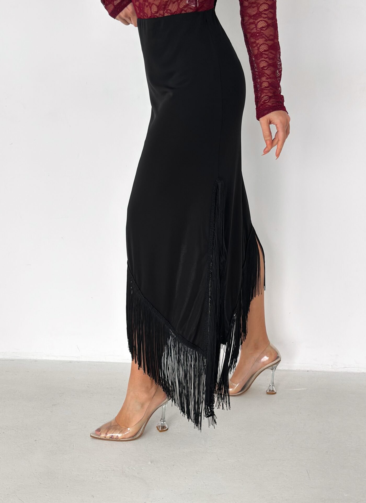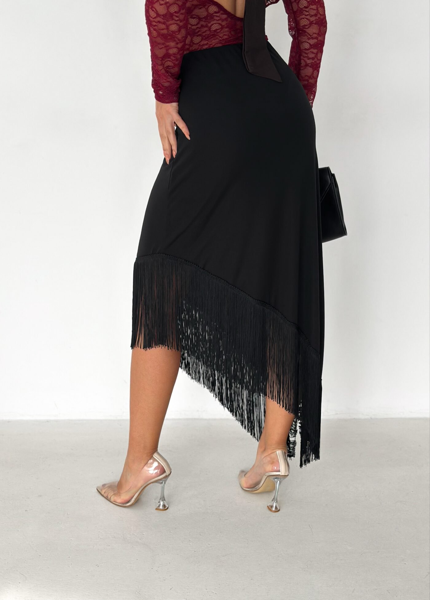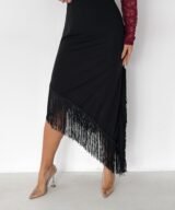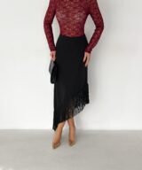 A sleek midi skirt designed to elevate your look effortlessly. Featuring an asymmetrical hemline finished with delicate fringe details, this skirt adds movement and elegance to every step. Made from a smooth, flattering fabric that hugs the body comfortably, it’s perfect for both day-to-night styling and special occasions.