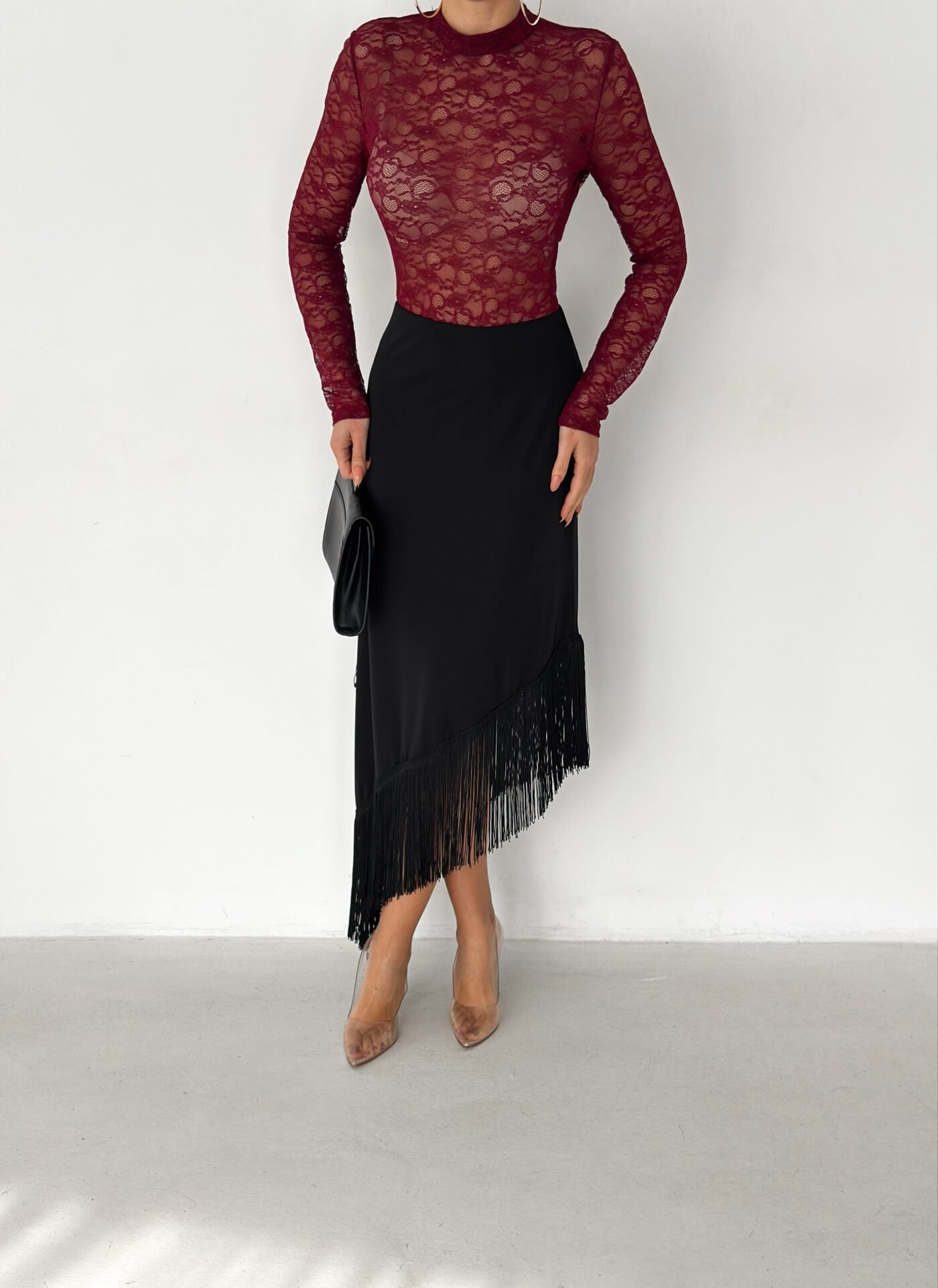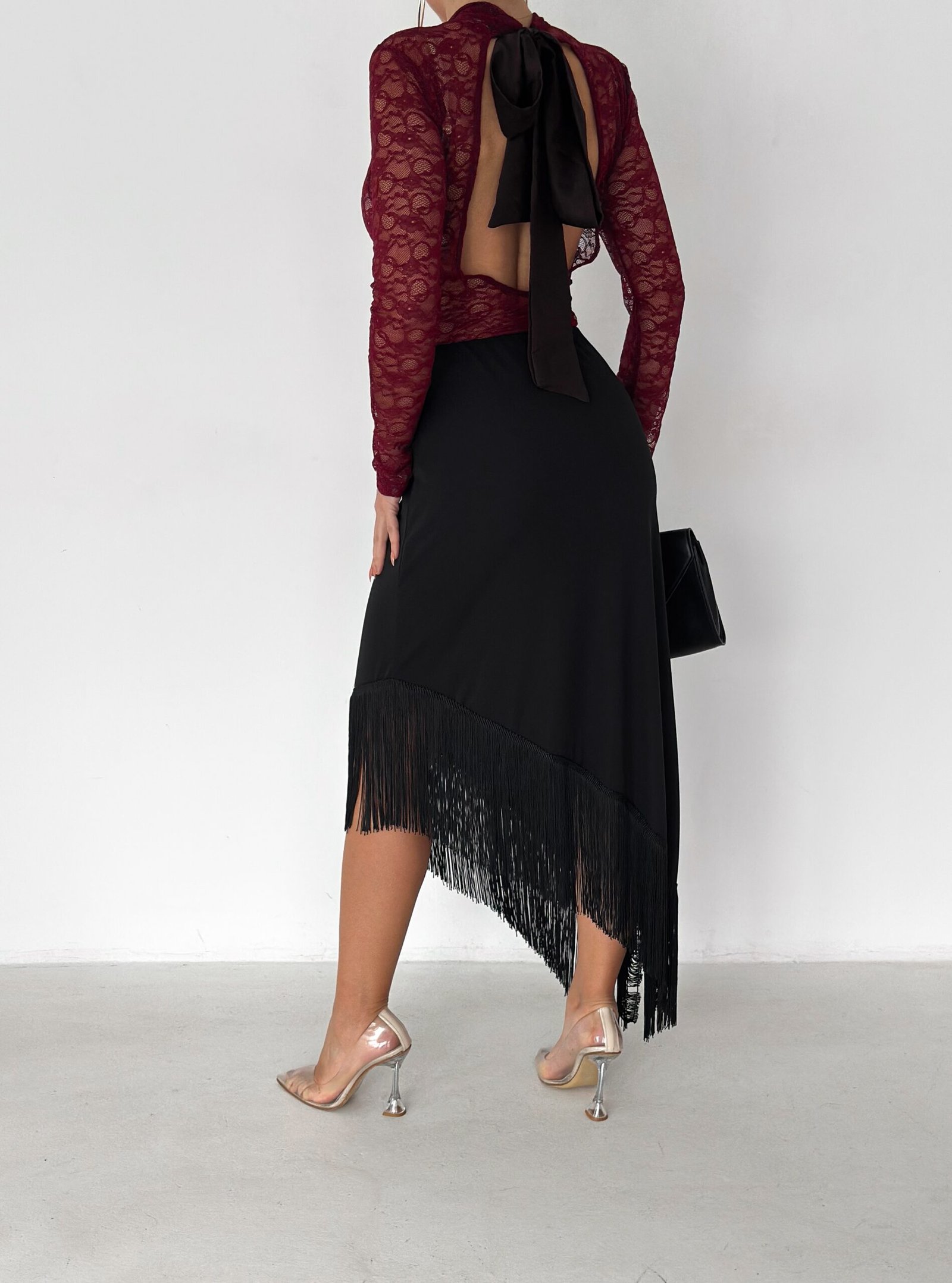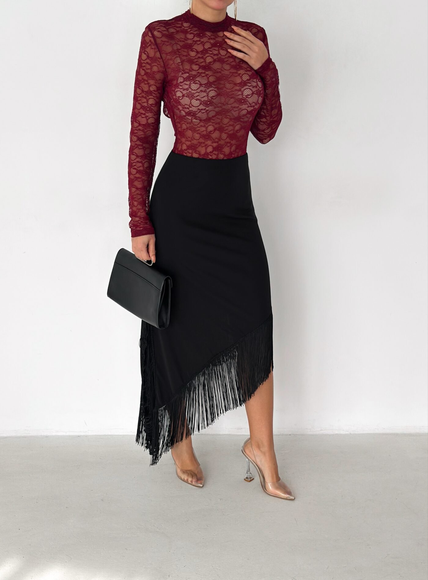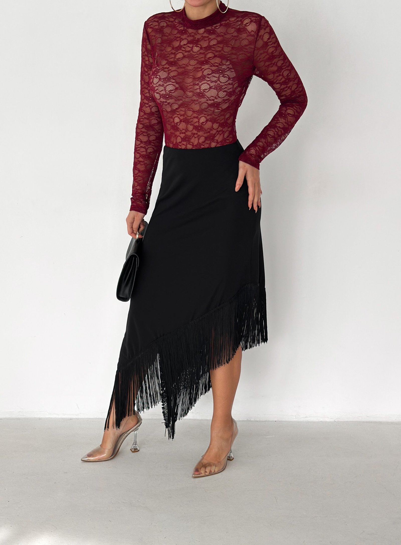 A sleek midi skirt designed to elevate your look effortlessly. Featuring an asymmetrical hemline finished with delicate fringe details, this skirt adds movement and elegance to every step. Made from a smooth, flattering fabric that hugs the body comfortably, it’s perfect for both day-to-night styling and special occasions.