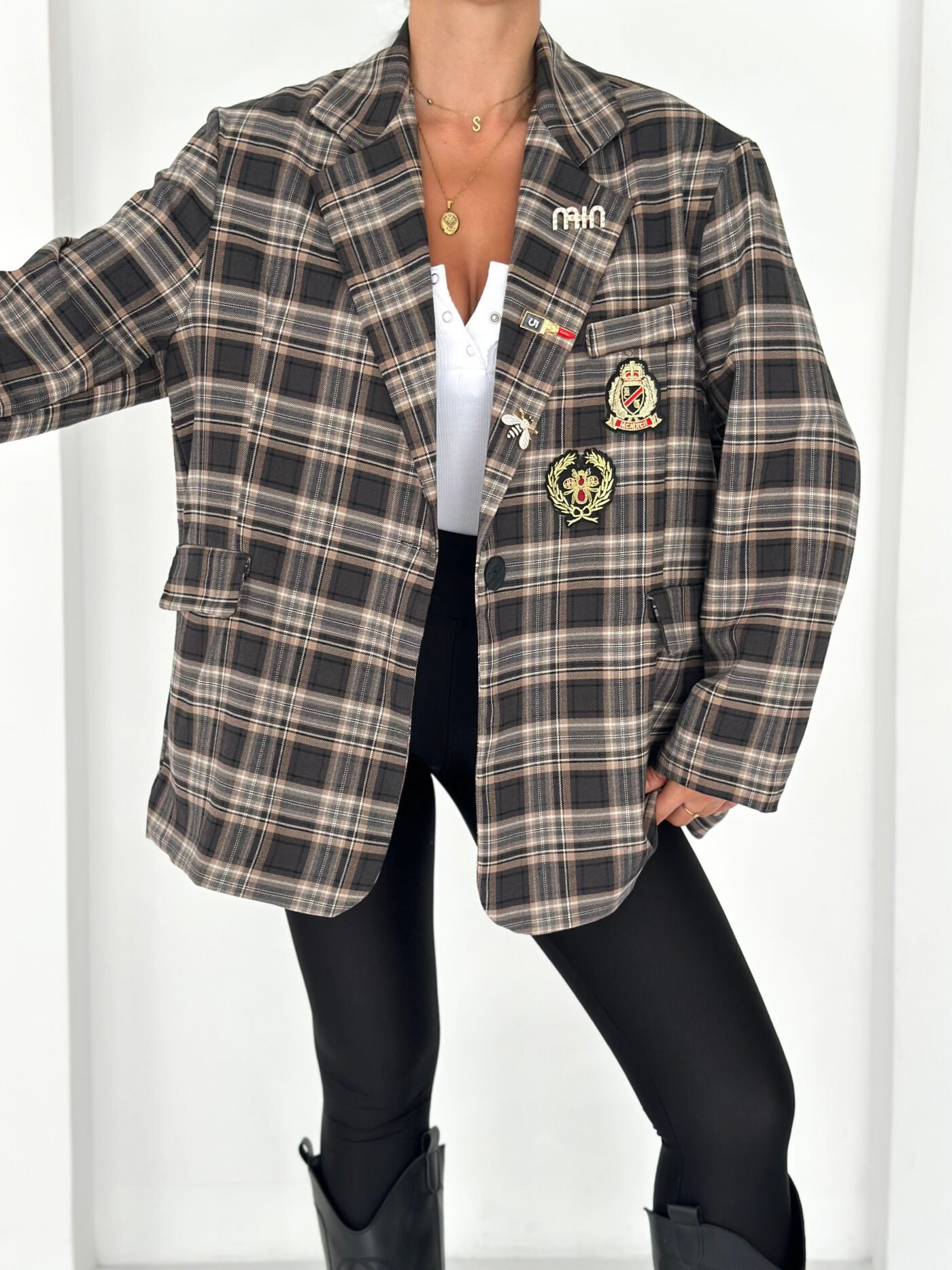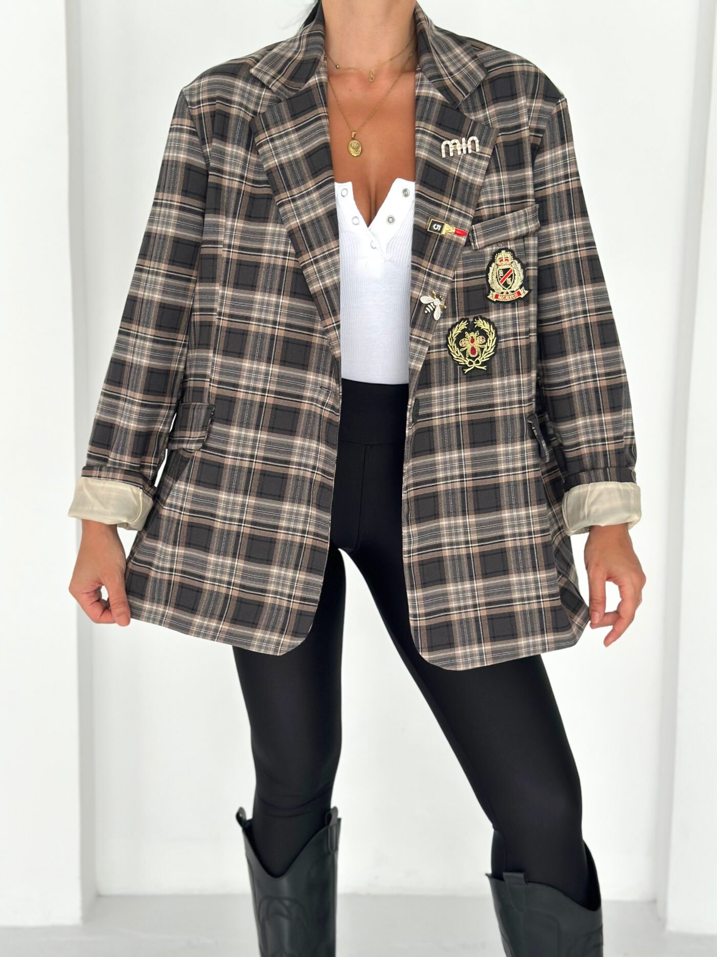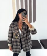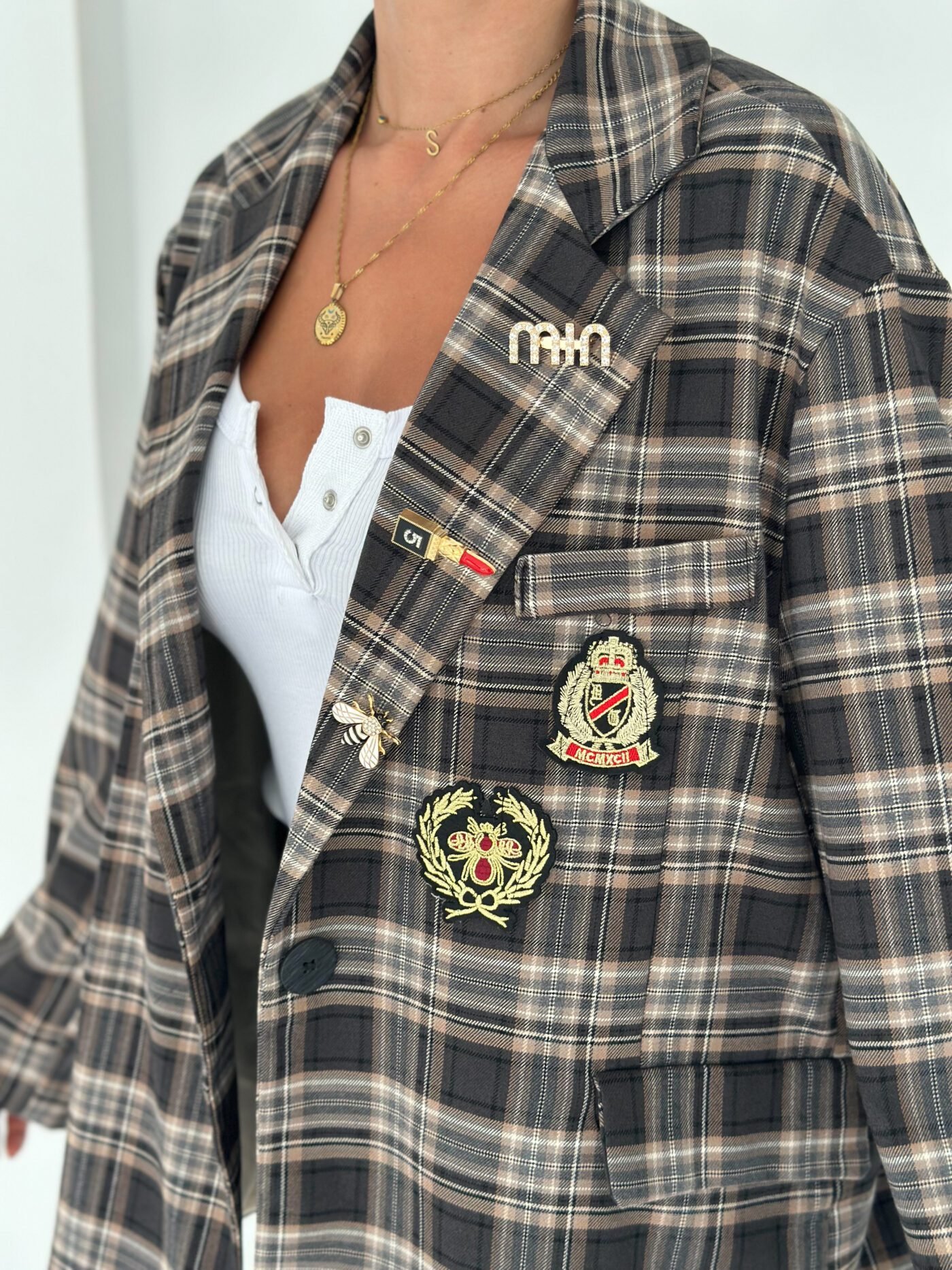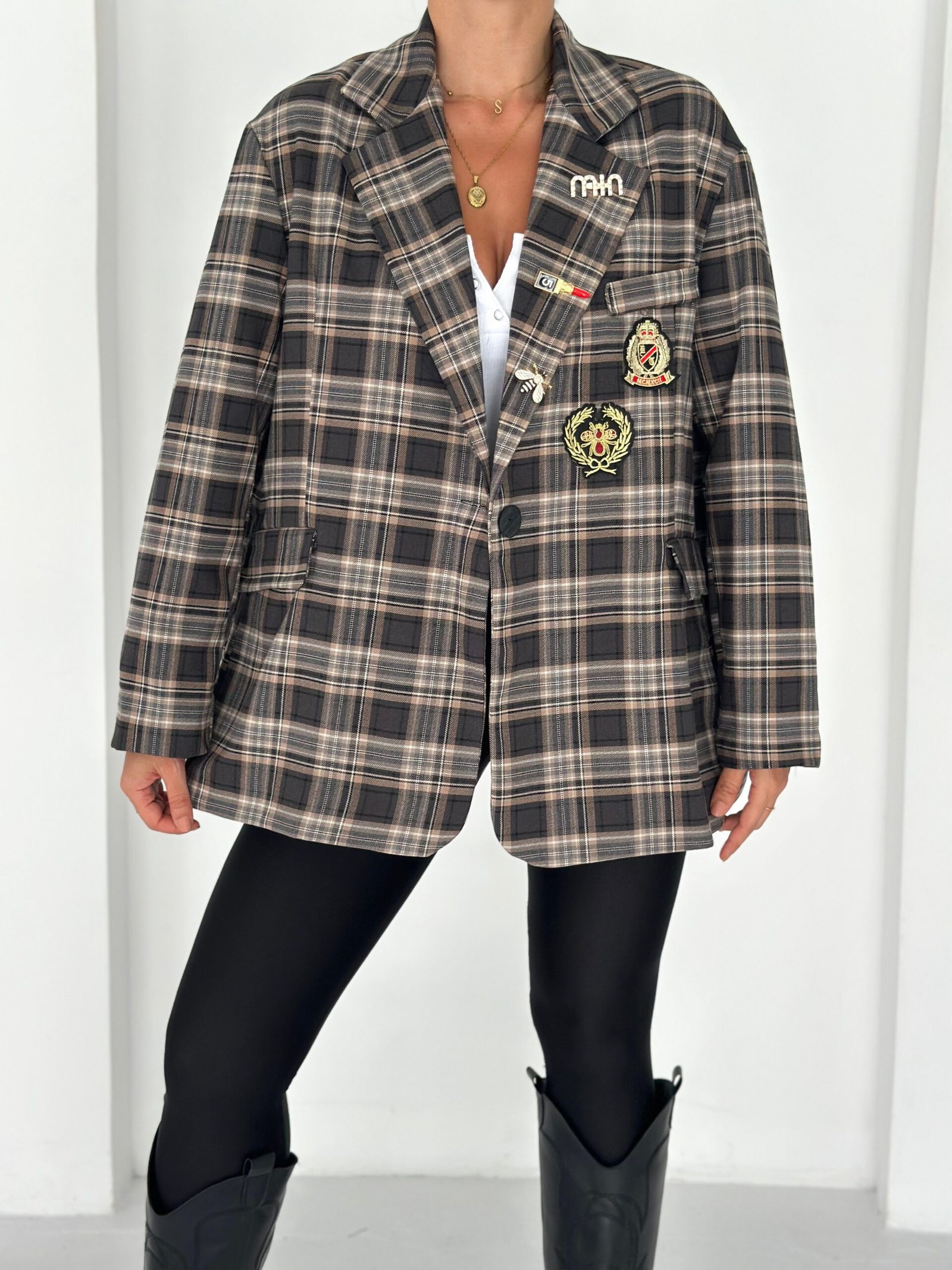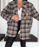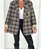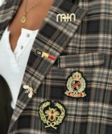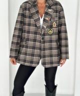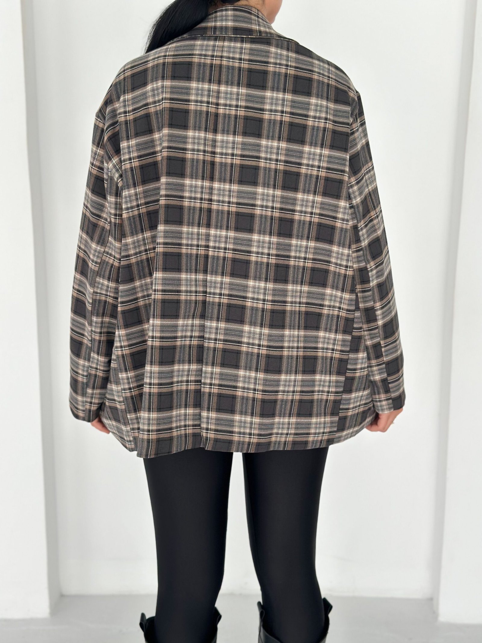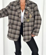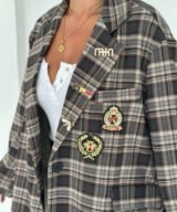 Oversized plaid blazer designed to elevate everyday looks with a refined vintage touch. Features elegant embroidered patches and soft rolled cuffs for a relaxed yet polished vibe. Easy to style from casual to chic, making it a standout layering piece for any season.