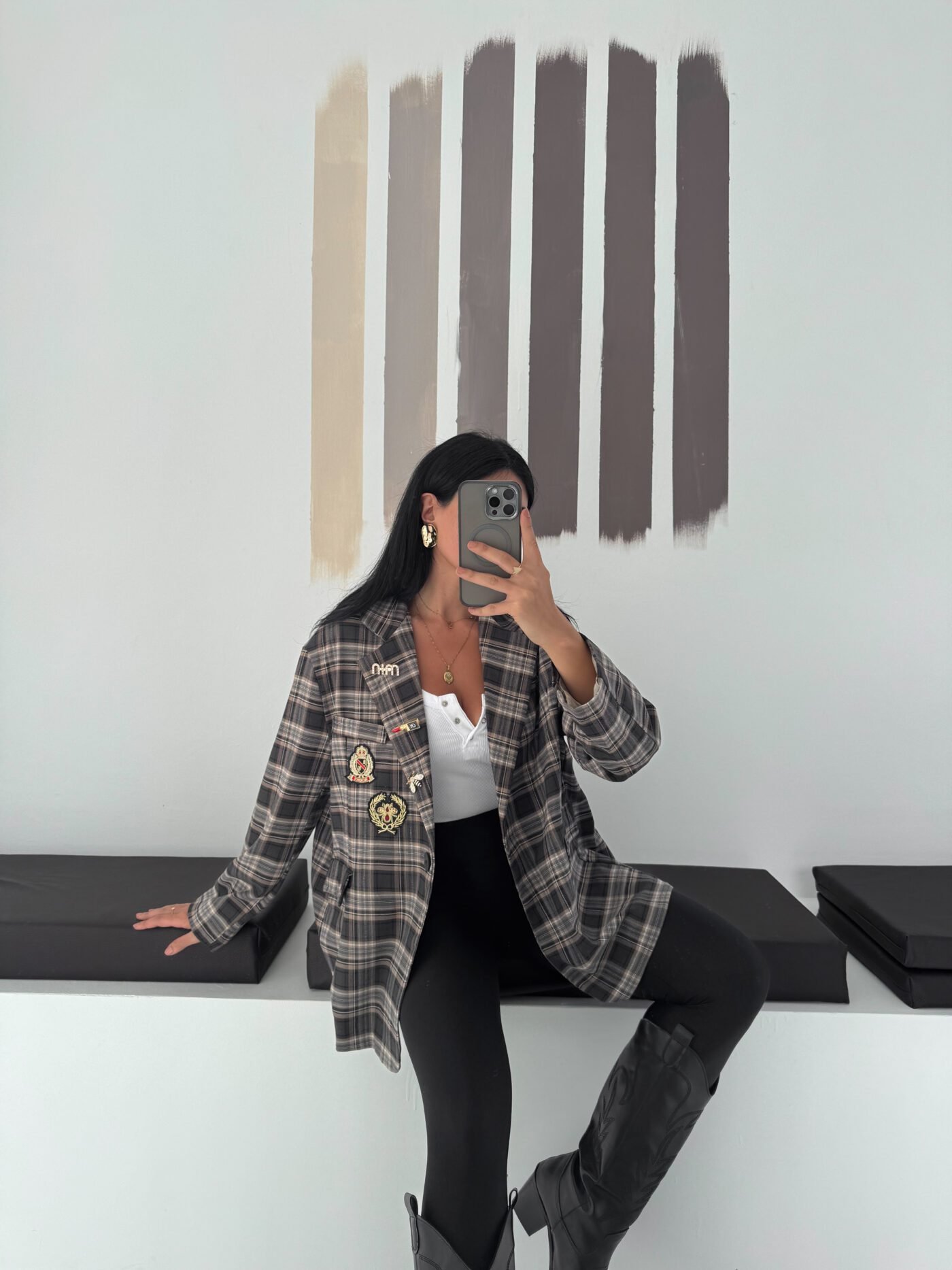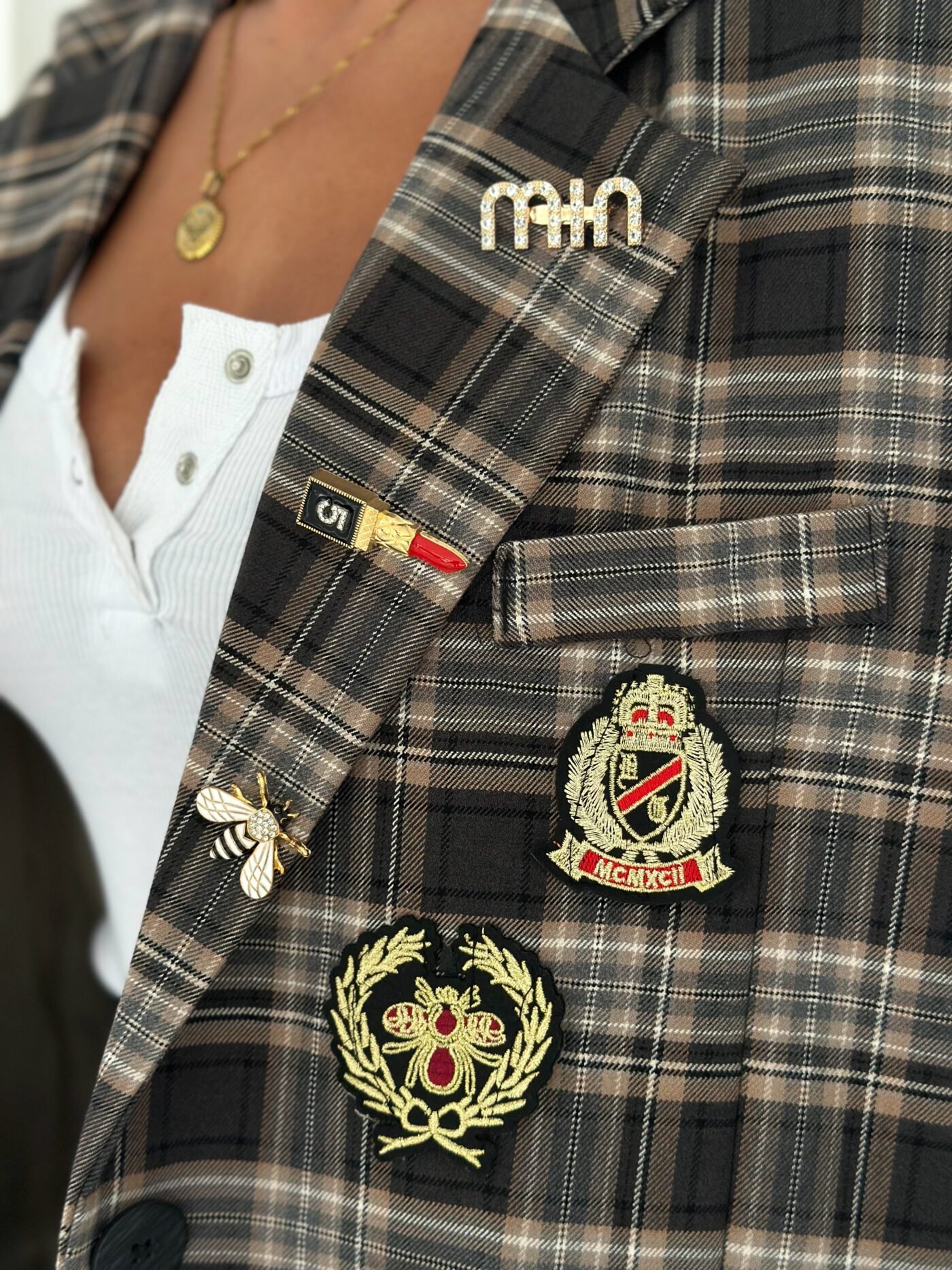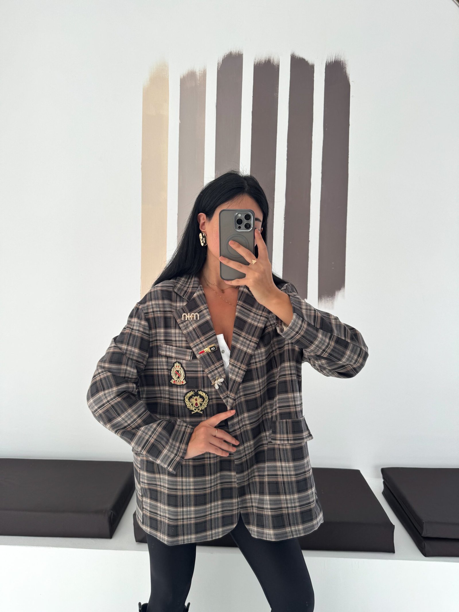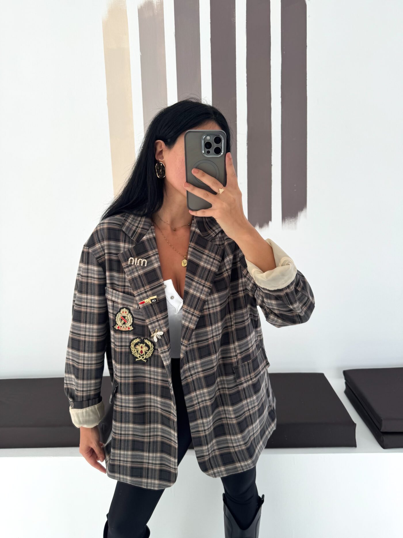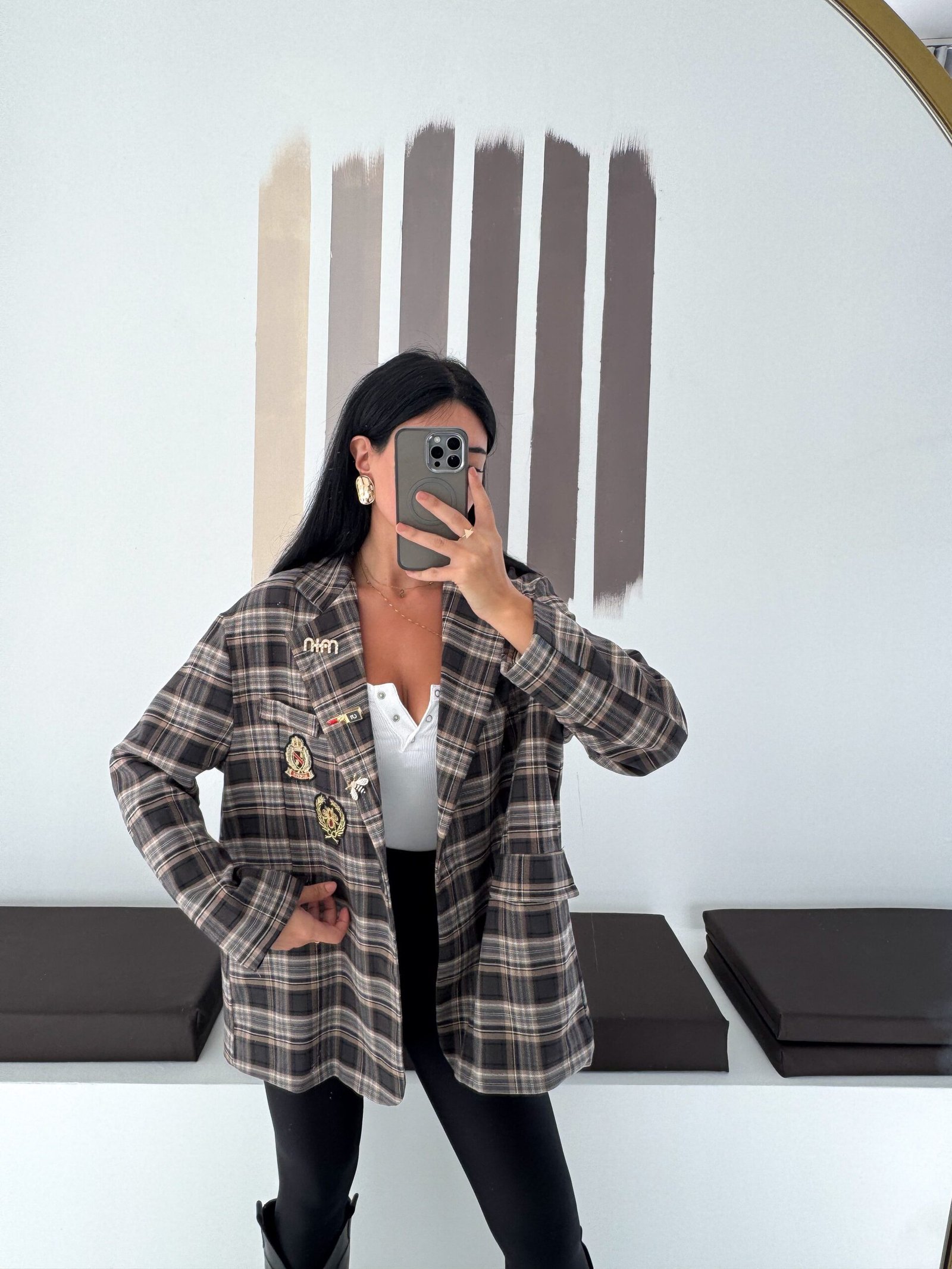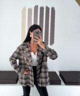 Oversized plaid blazer designed to elevate everyday looks with a refined vintage touch. Features elegant embroidered patches and soft rolled cuffs for a relaxed yet polished vibe. Easy to style from casual to chic, making it a standout layering piece for any season.