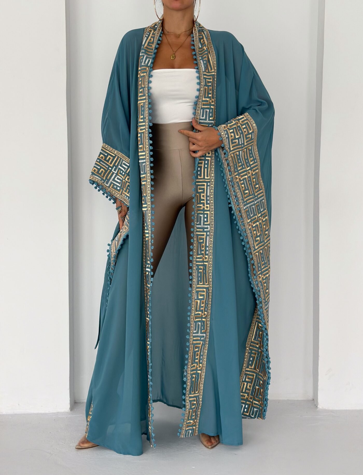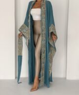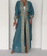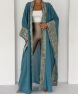 A flowing chiffon abaya in a rich in teal shade, elevated with intricate gold geometric embroidery along the front, sleeves, and edges. Designed with wide, graceful sleeves and delicate trim detailing that adds texture and movement. Lightweight, elegant, and effortlessly sophisticated — perfect for Ramadan gatherings, evening occasions, or layering over chic daywear.