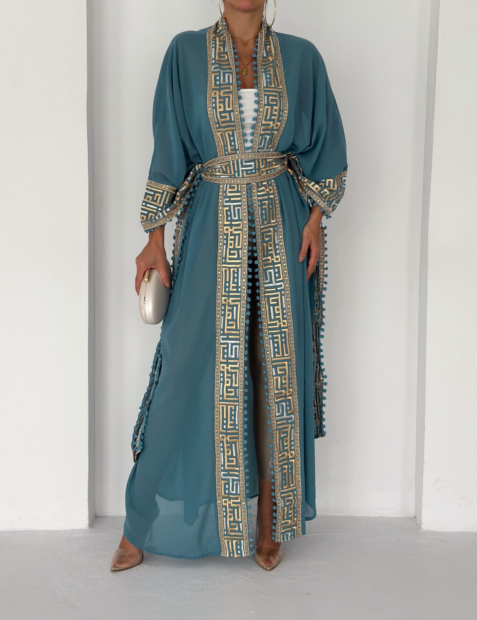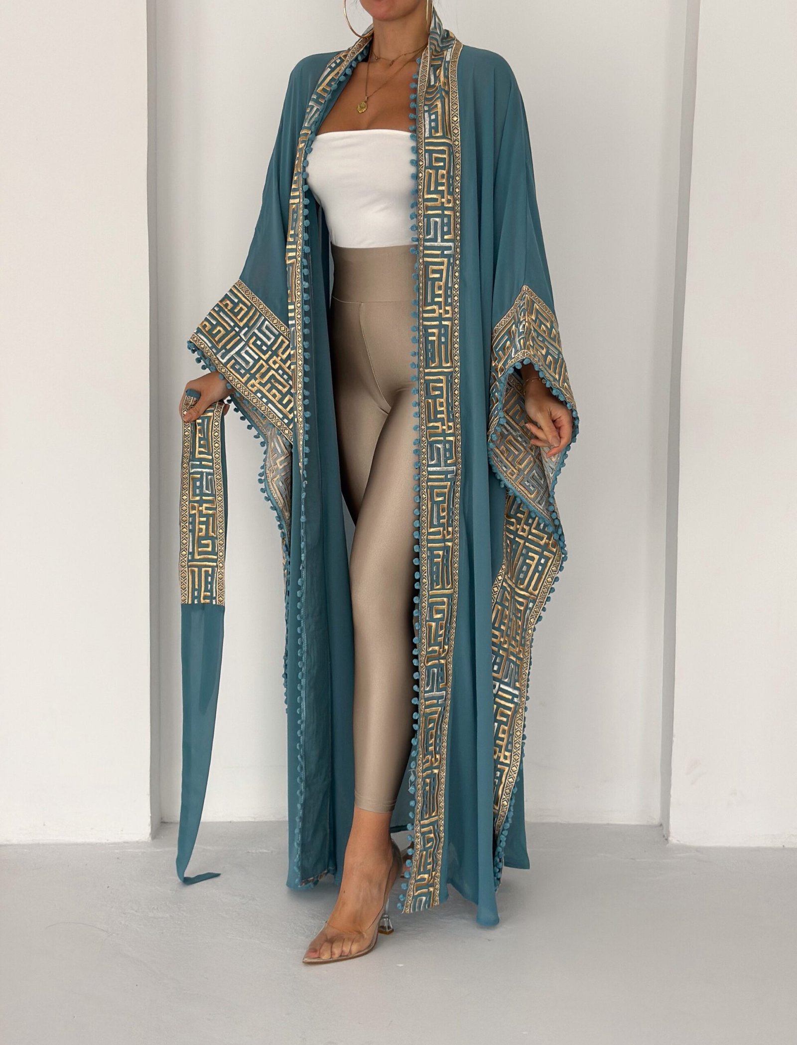 A flowing chiffon abaya in a rich in teal shade, elevated with intricate gold geometric embroidery along the front, sleeves, and edges. Designed with wide, graceful sleeves and delicate trim detailing that adds texture and movement. Lightweight, elegant, and effortlessly sophisticated — perfect for Ramadan gatherings, evening occasions, or layering over chic daywear.