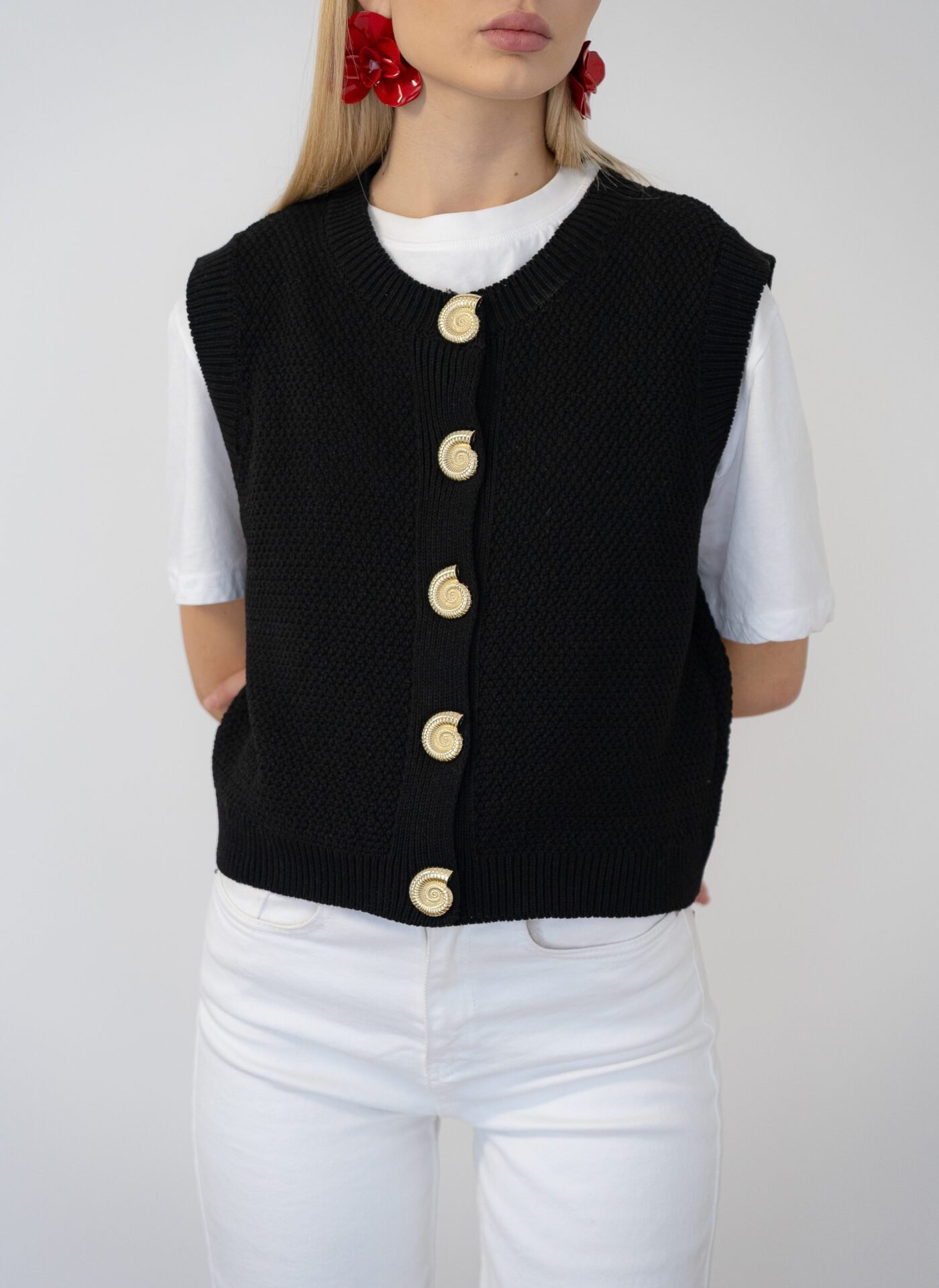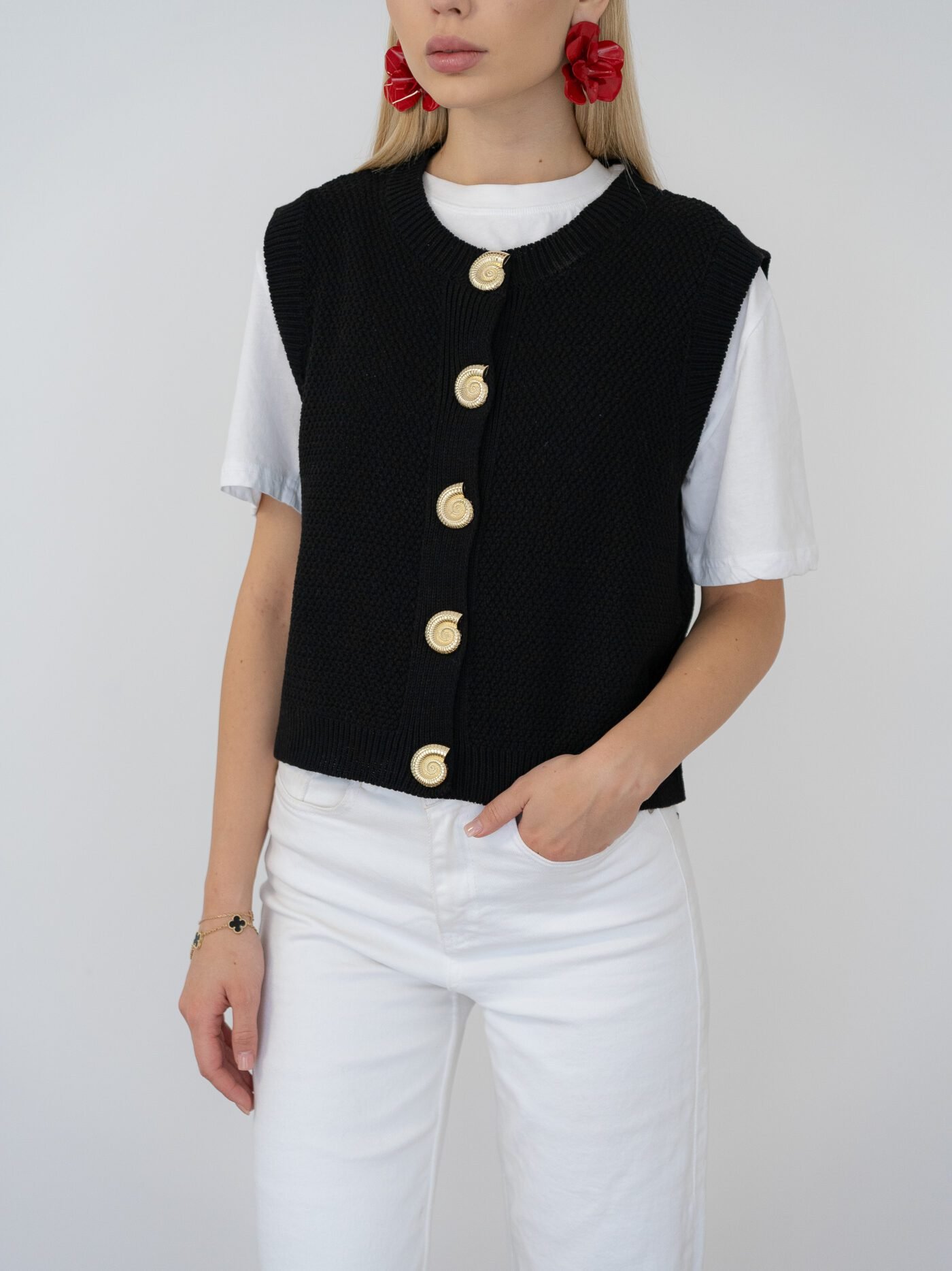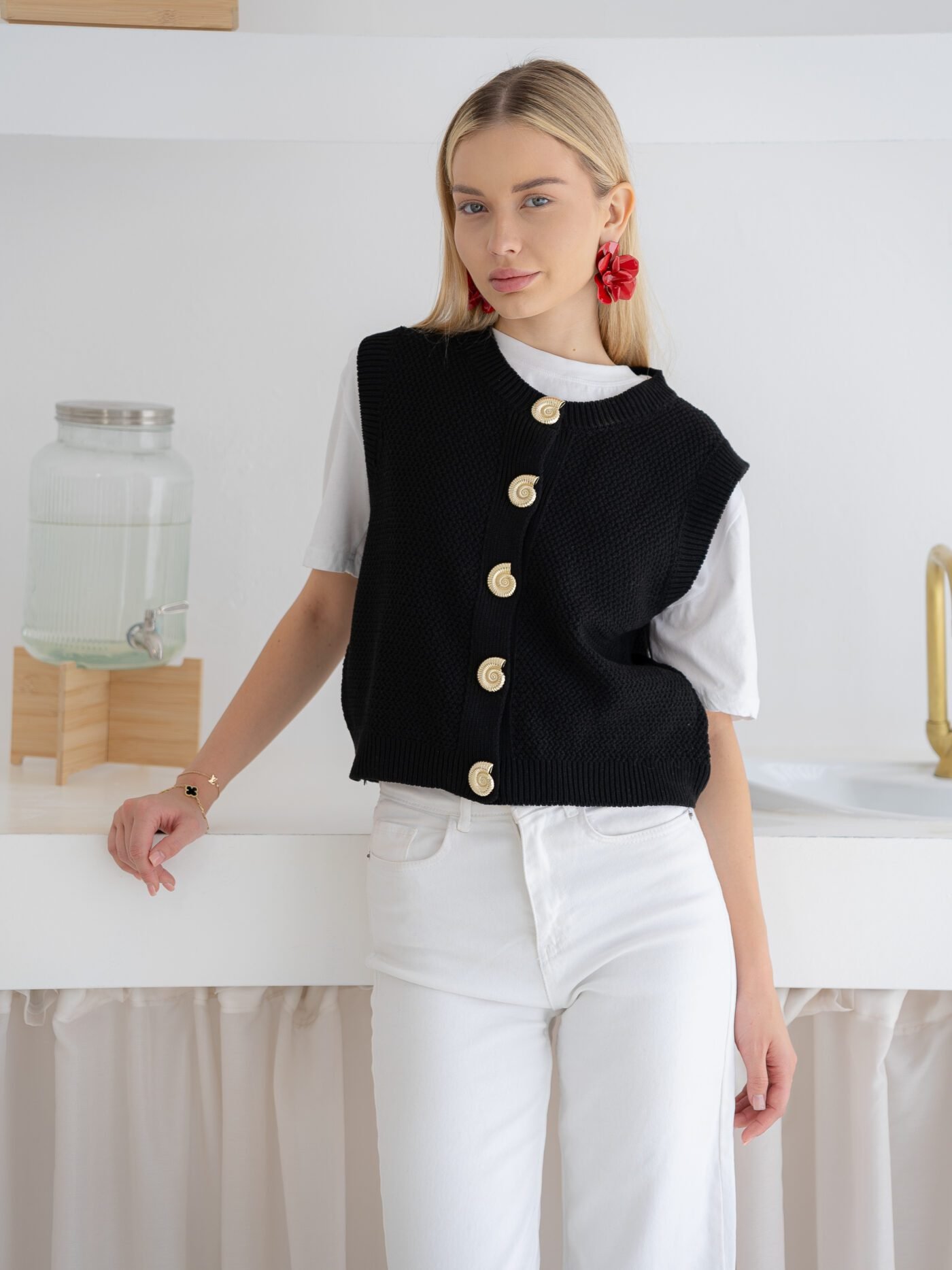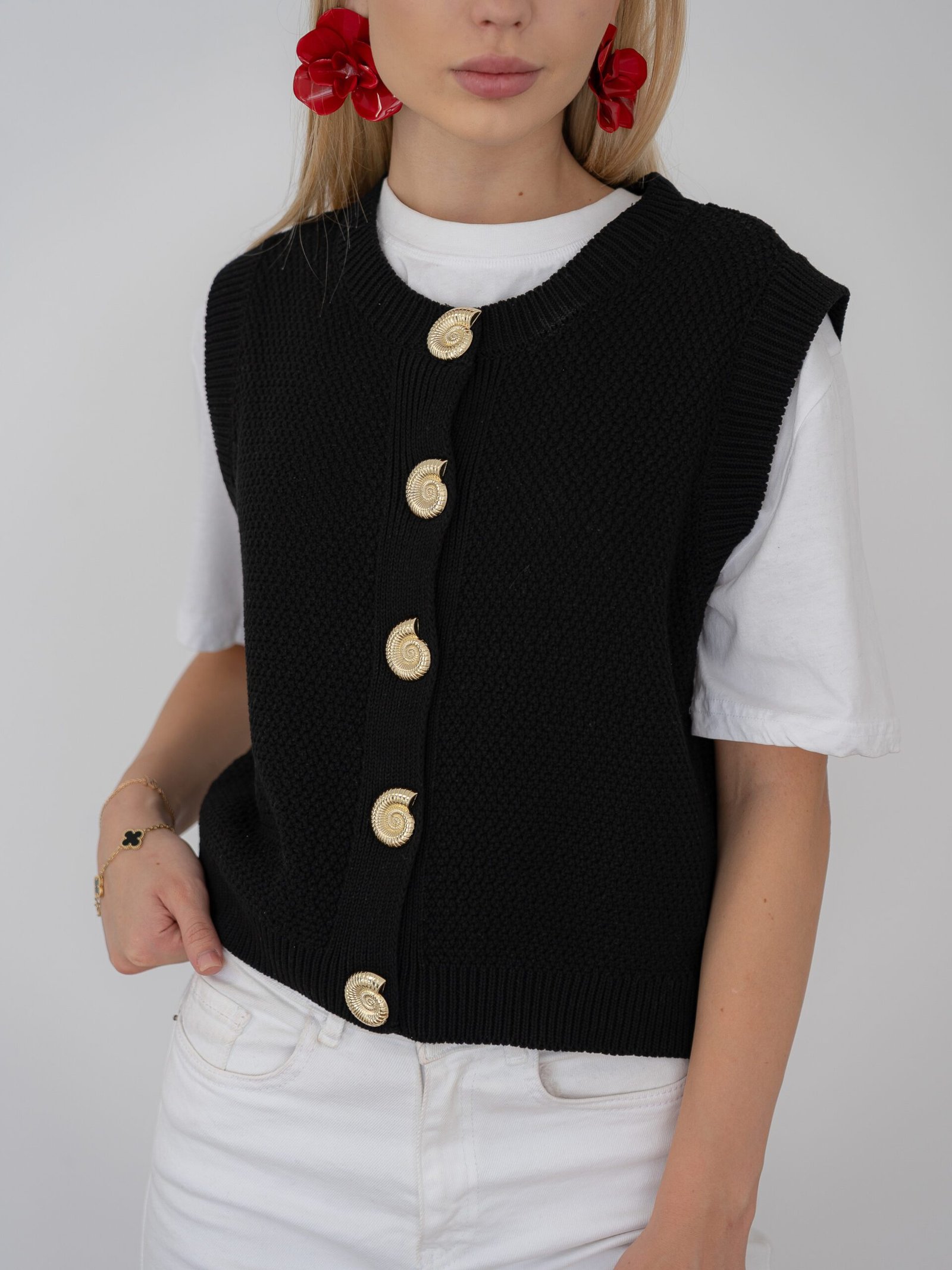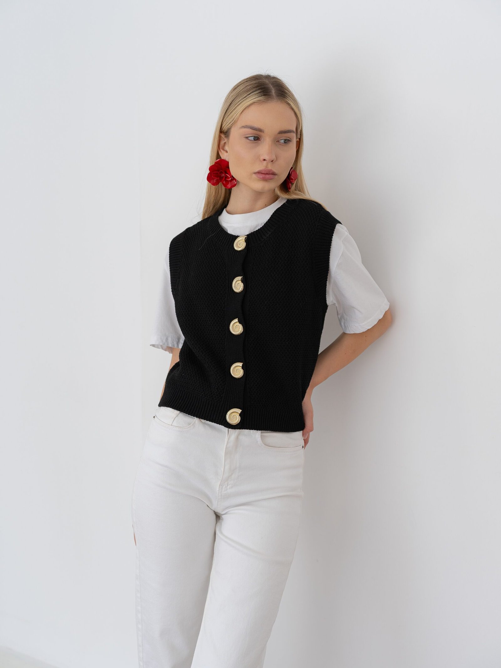 A classic sleeveless knit vest in black with statement swirl buttons. Perfect for layering over shirts or wearing alone for a chic look.