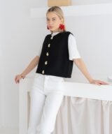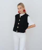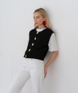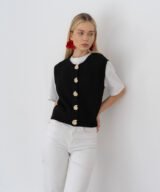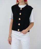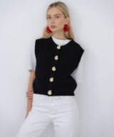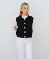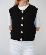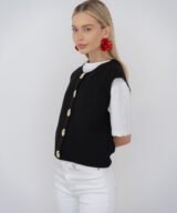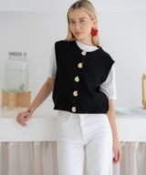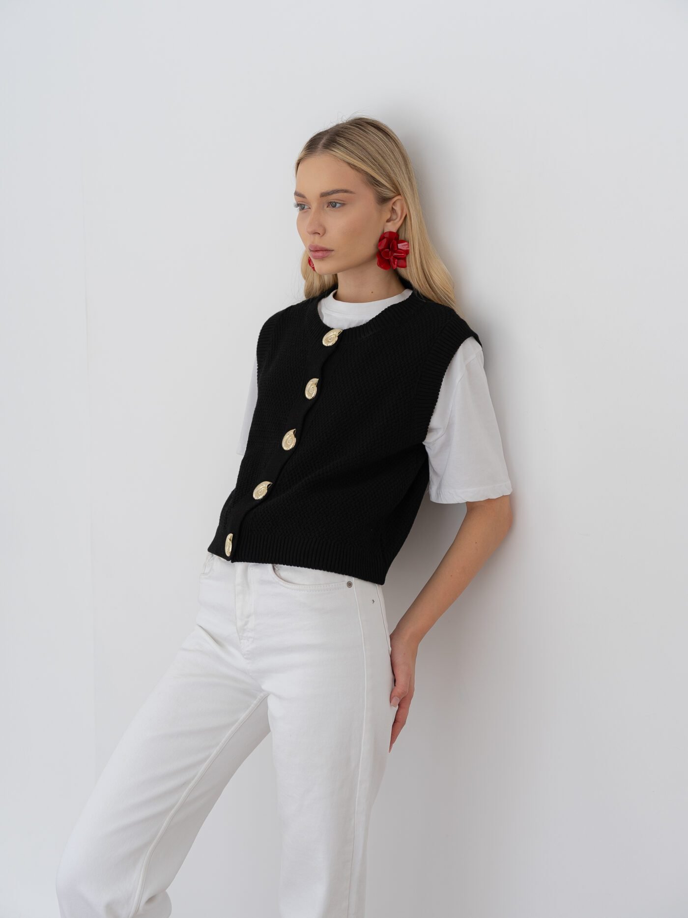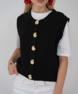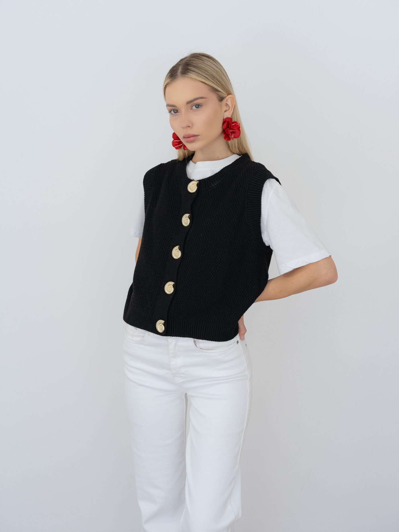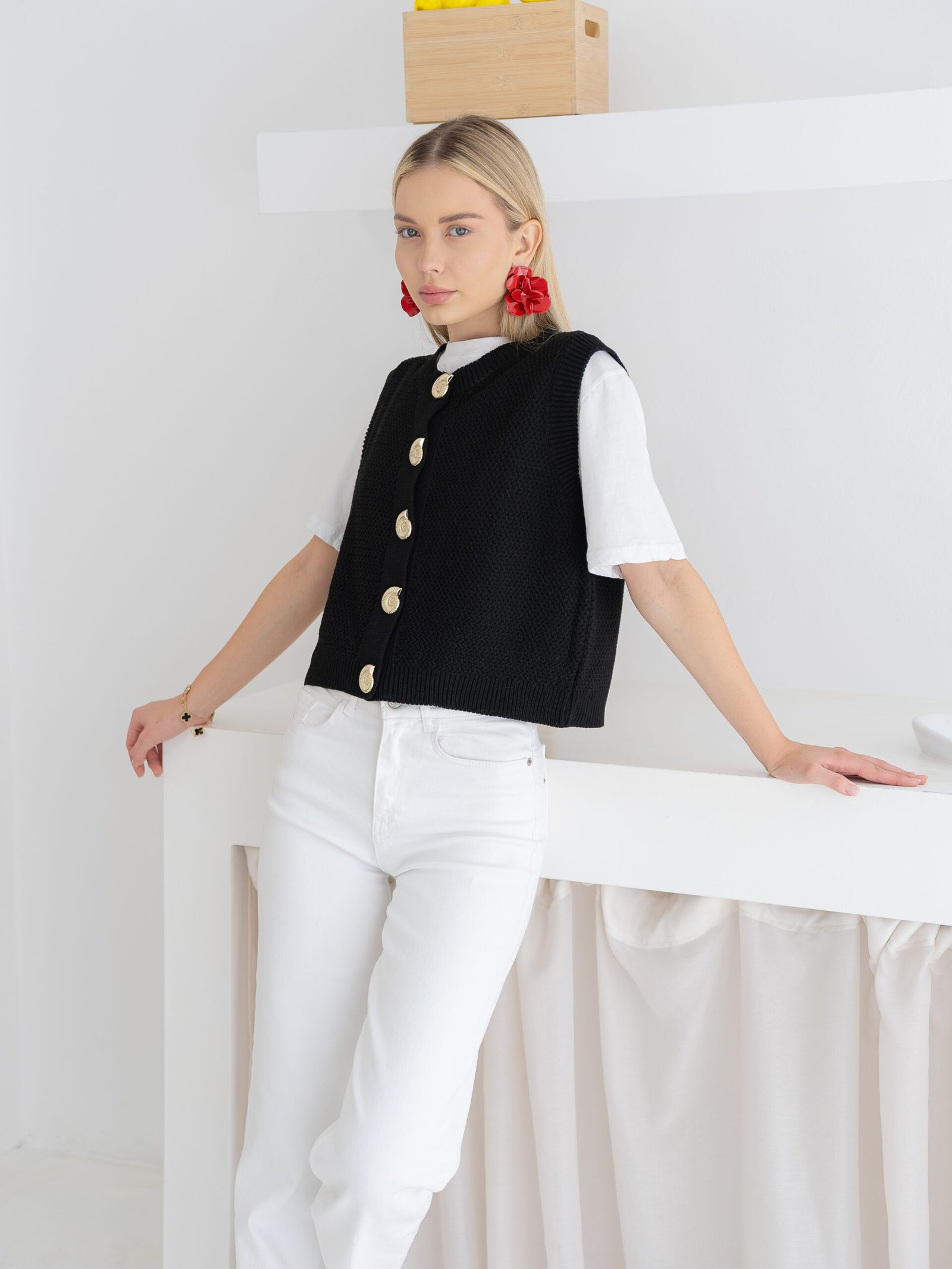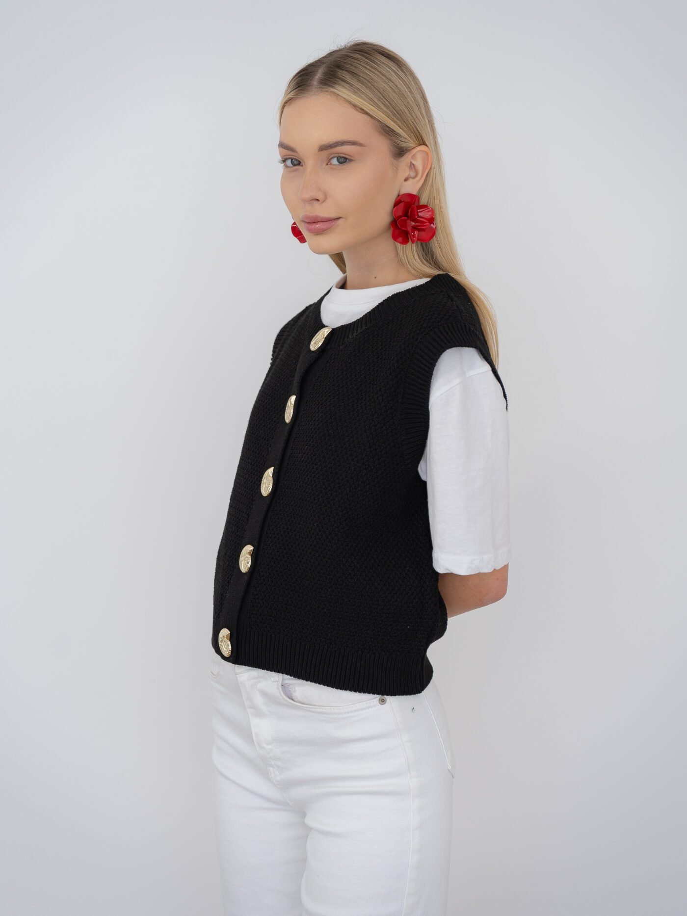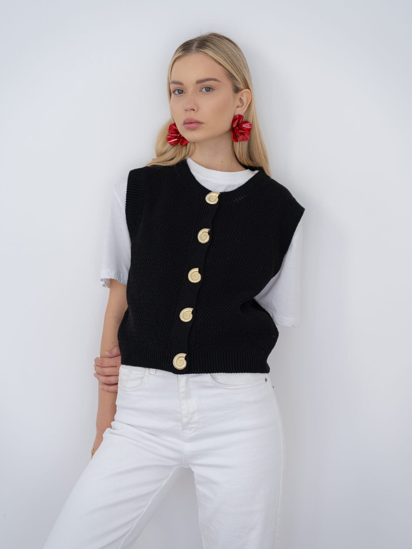 A classic sleeveless knit vest in black with statement swirl buttons. Perfect for layering over shirts or wearing alone for a chic look.