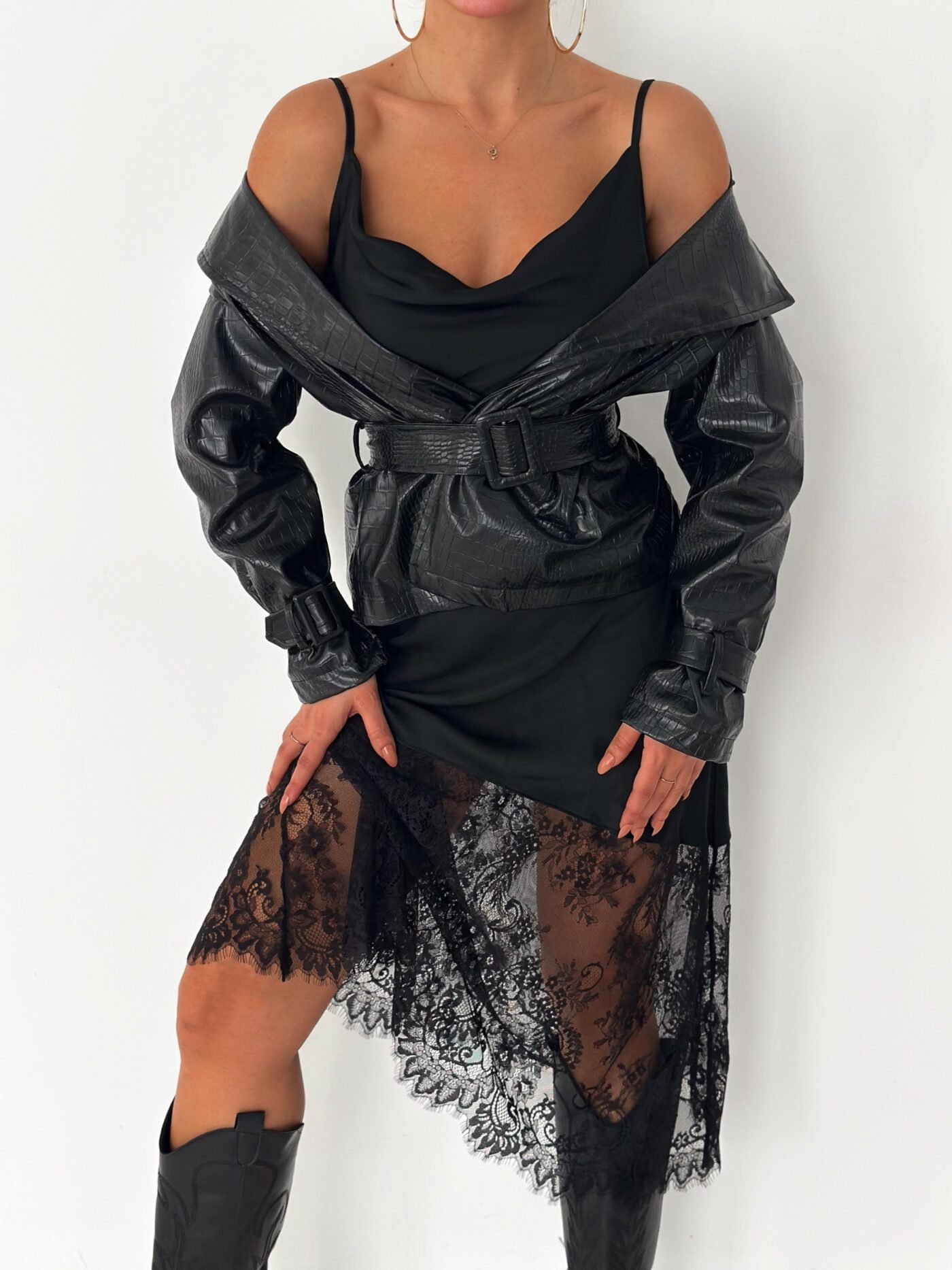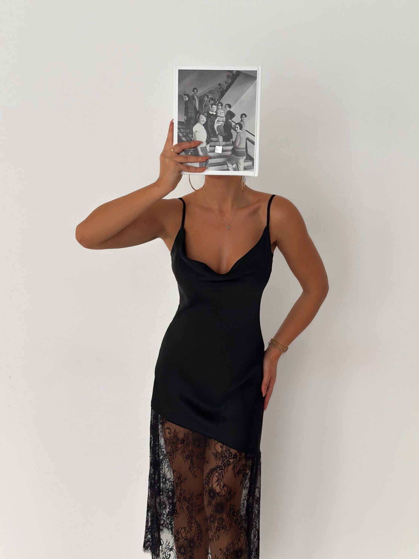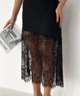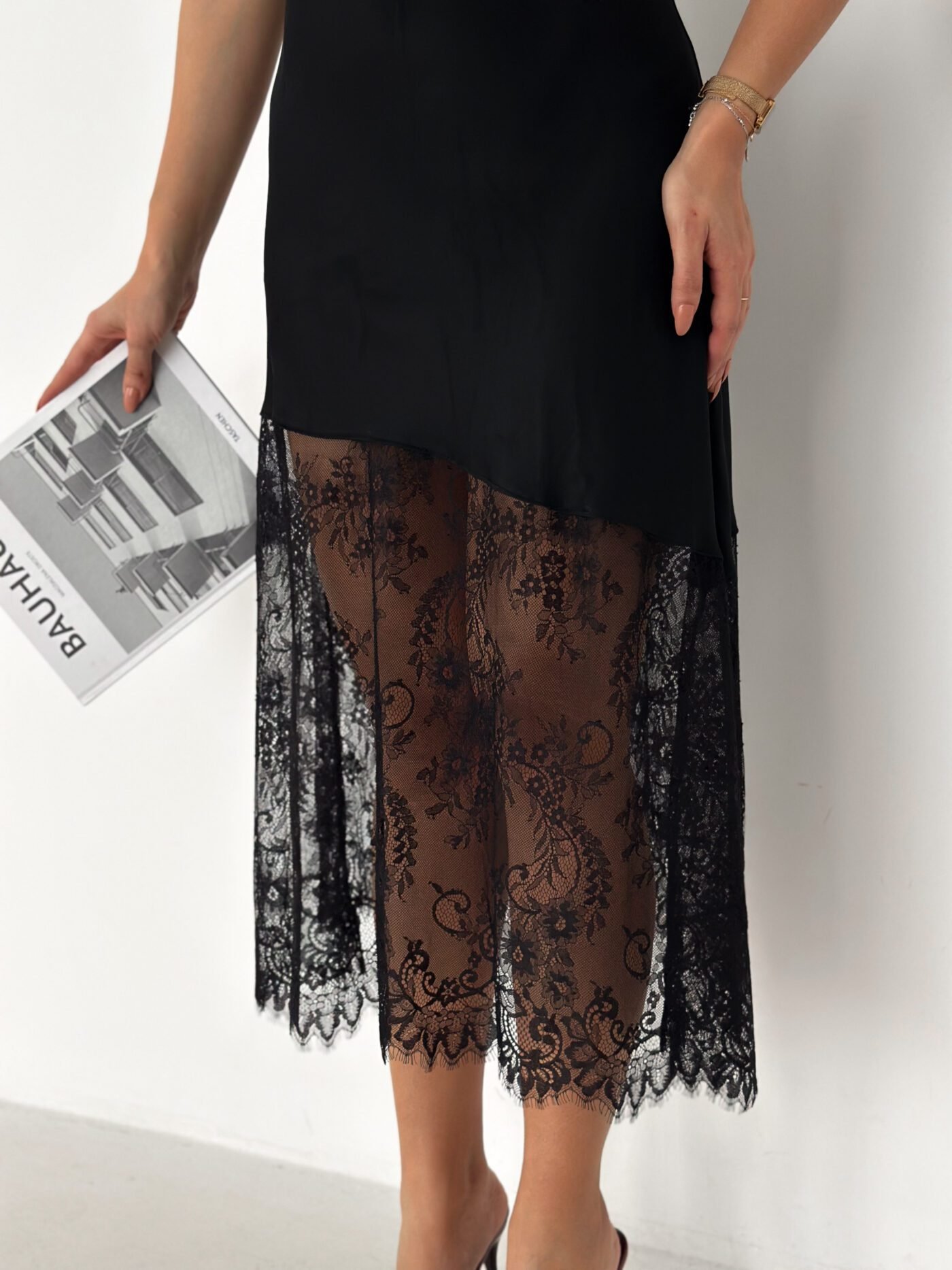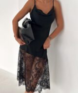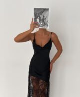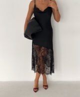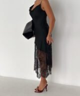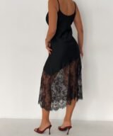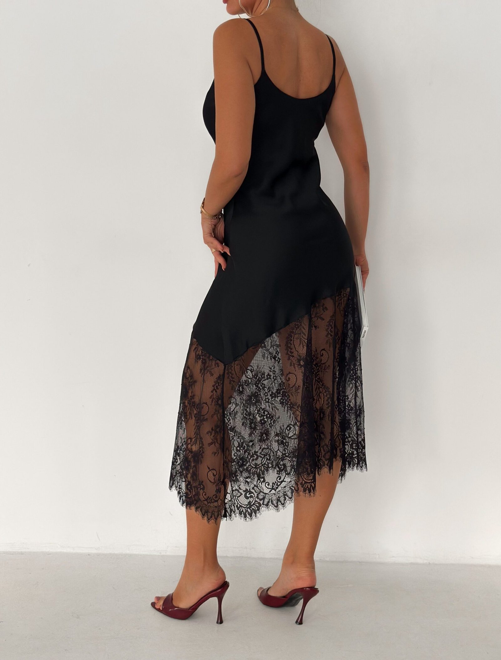 A feminine slip-style midi dress designed with a delicate lace hem for a soft and elegant touch.