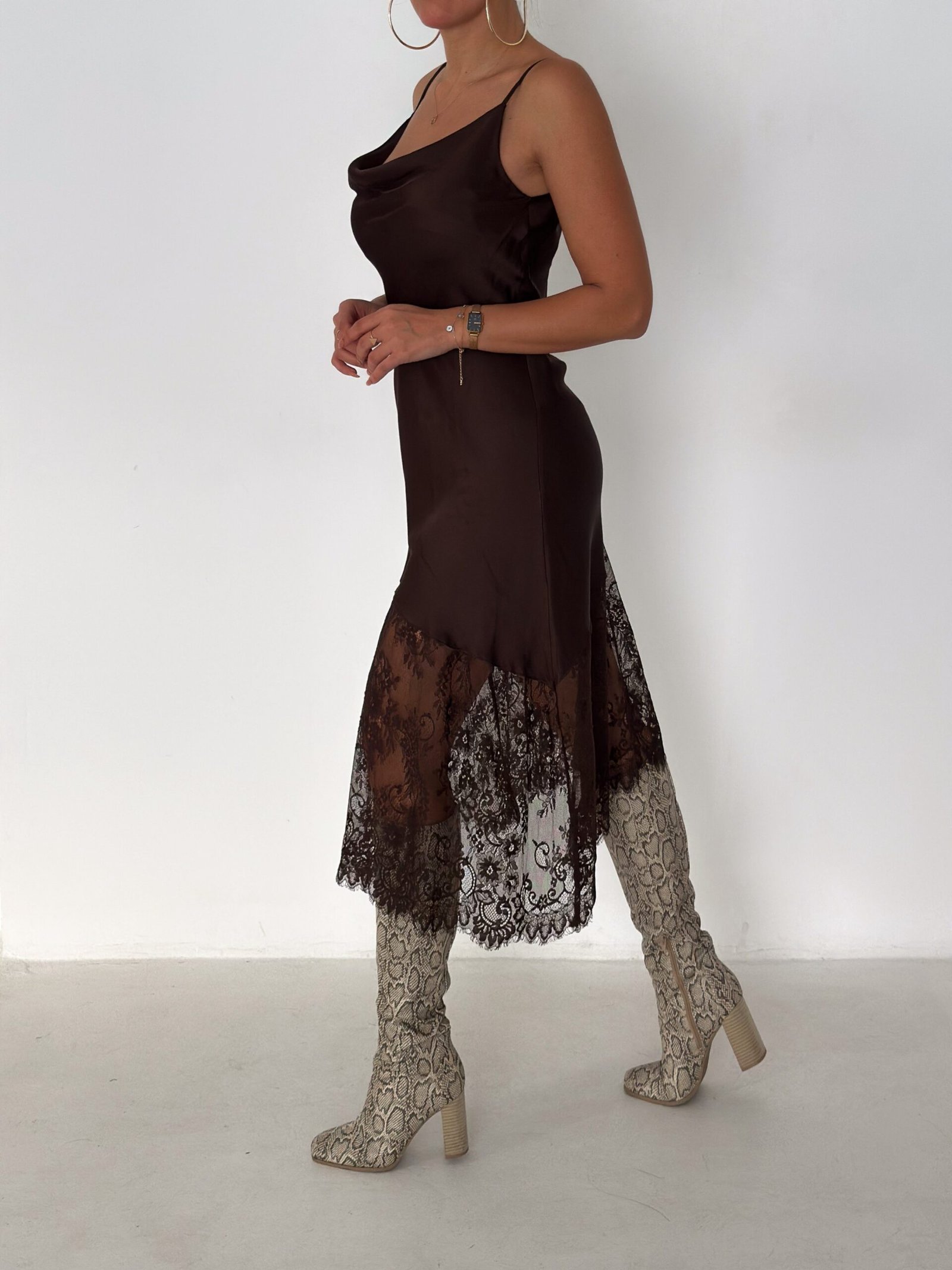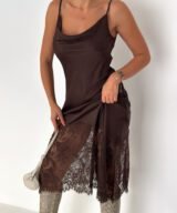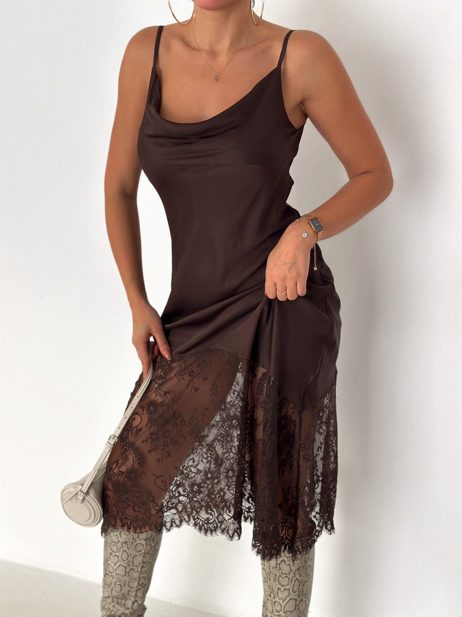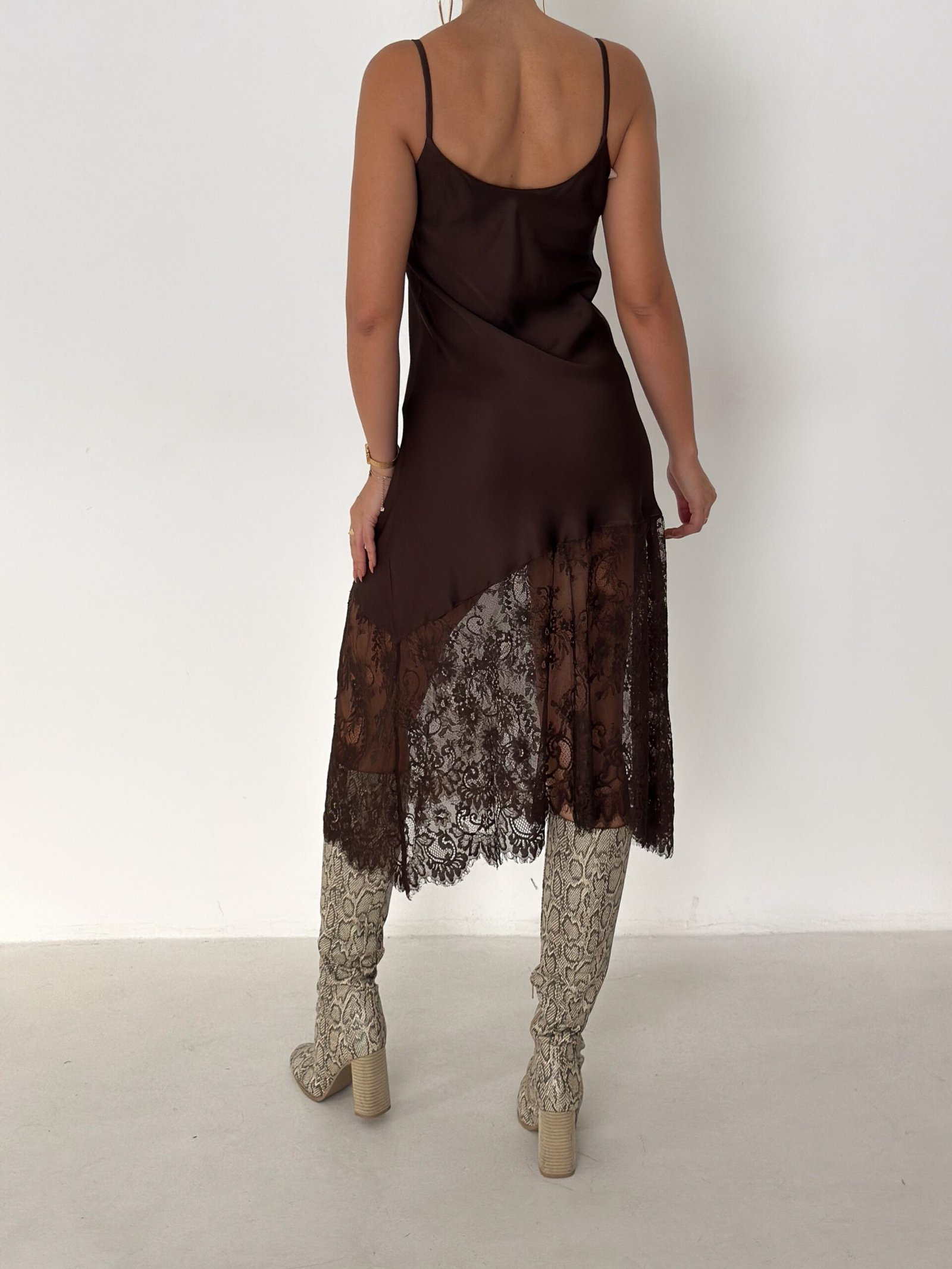 A feminine slip-style midi dress designed with a delicate lace hem for a soft and elegant touch.