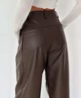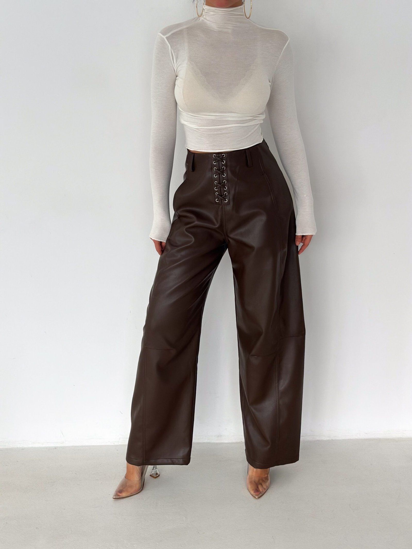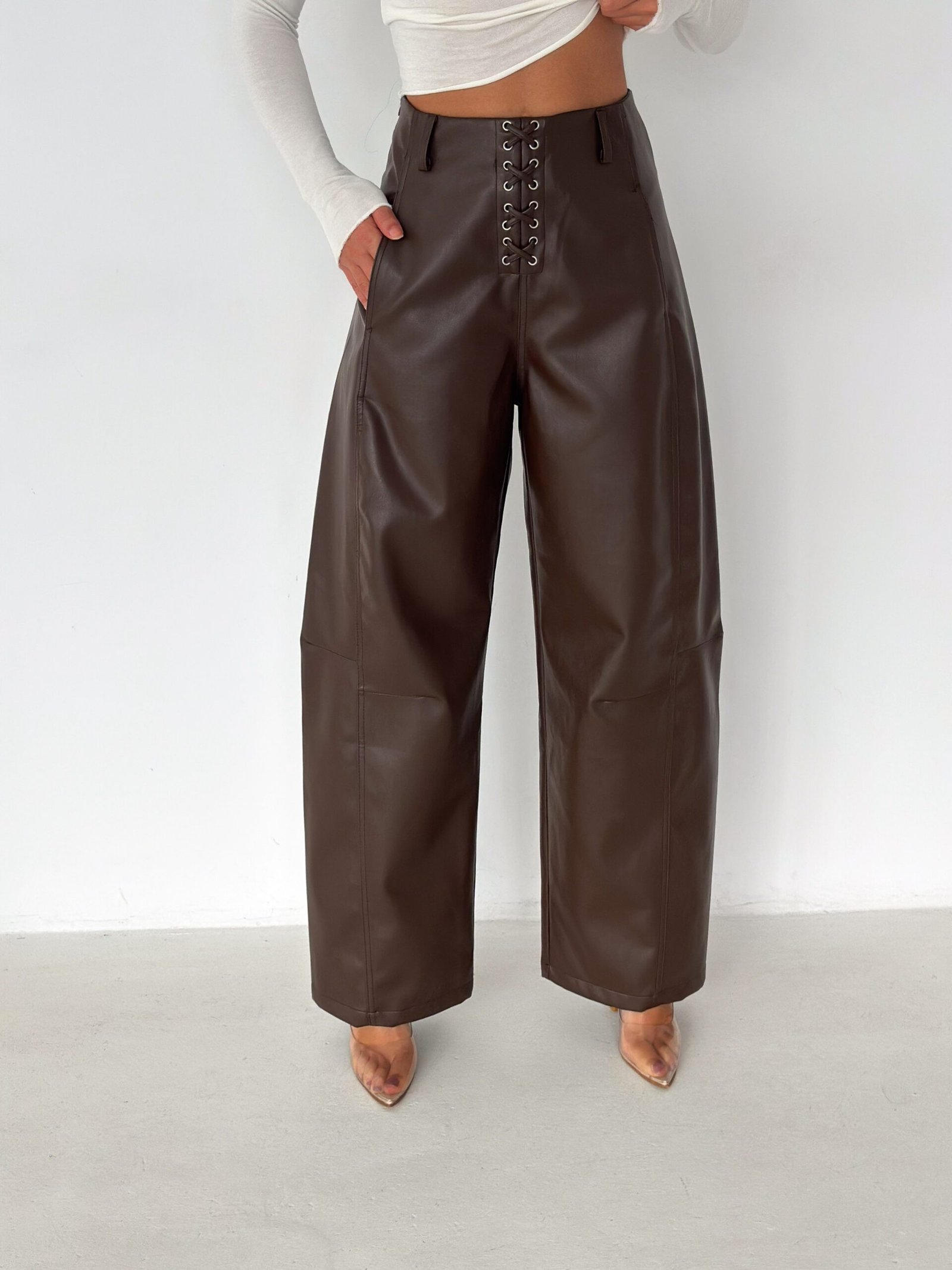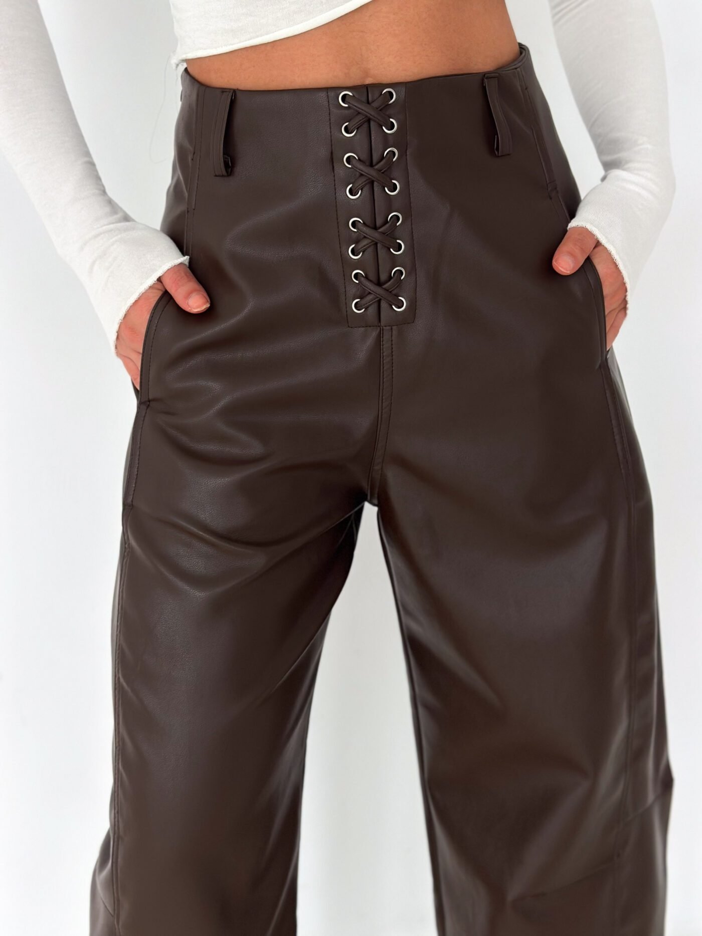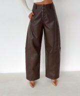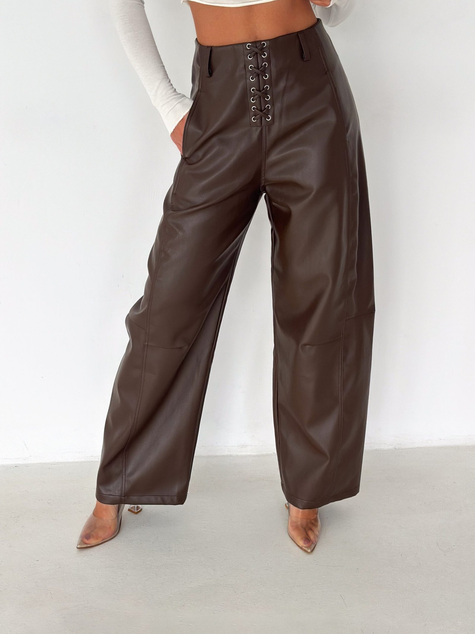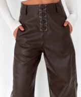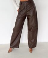 Lace-Up Vegan Leather Wide-Leg Pants – Brown