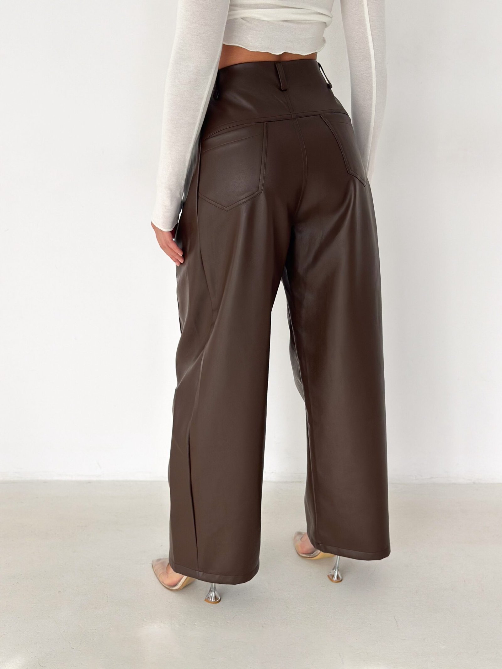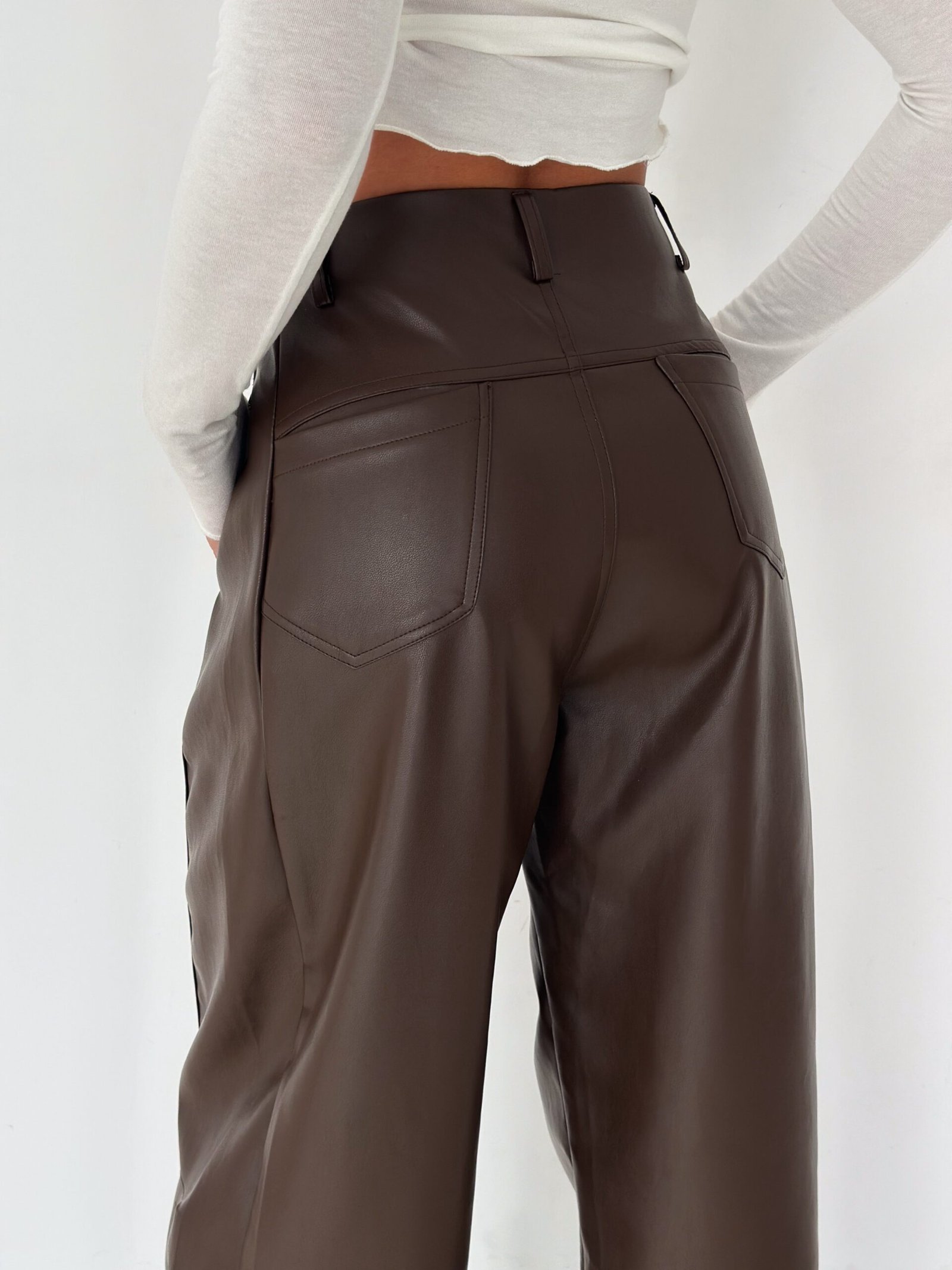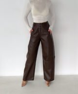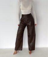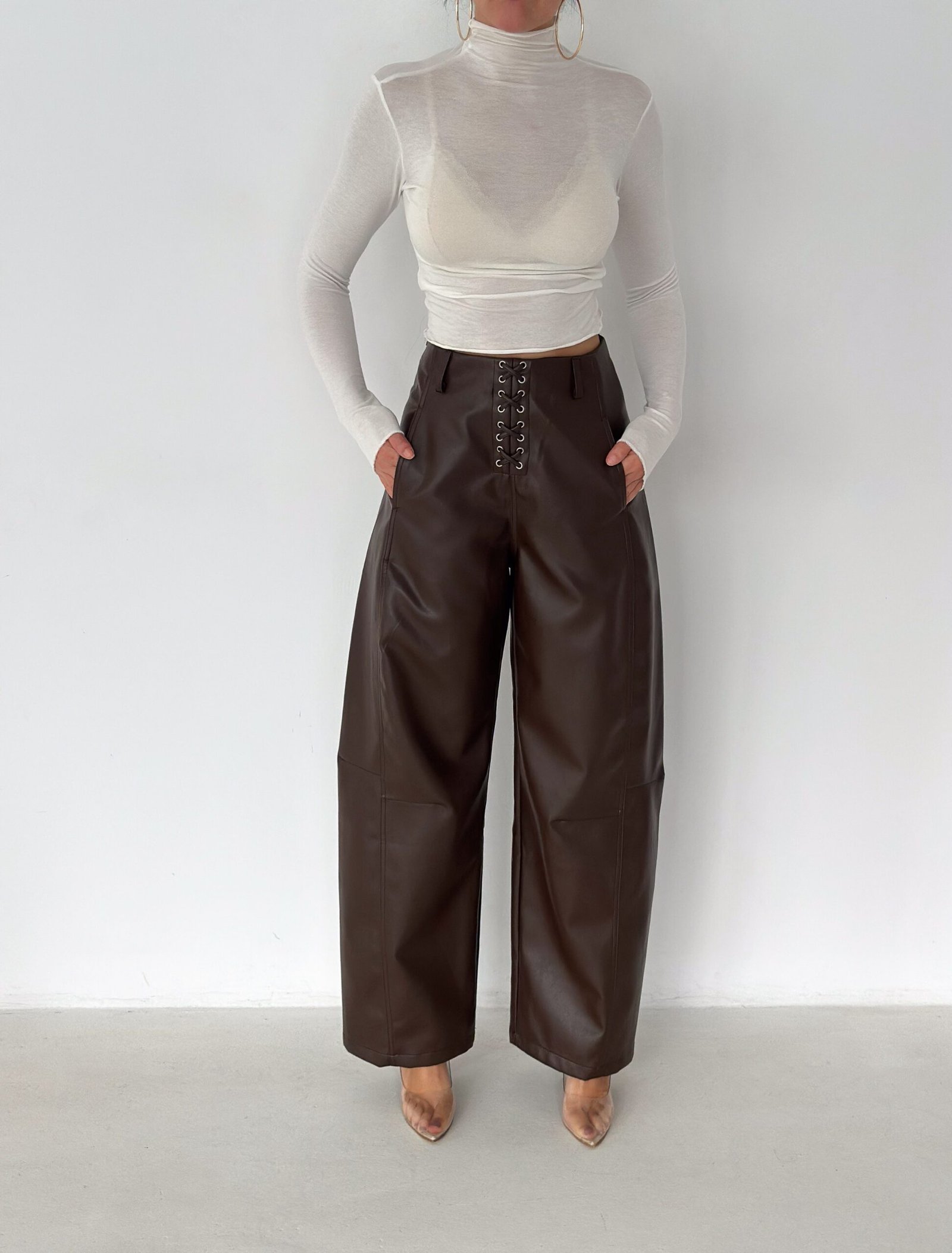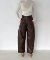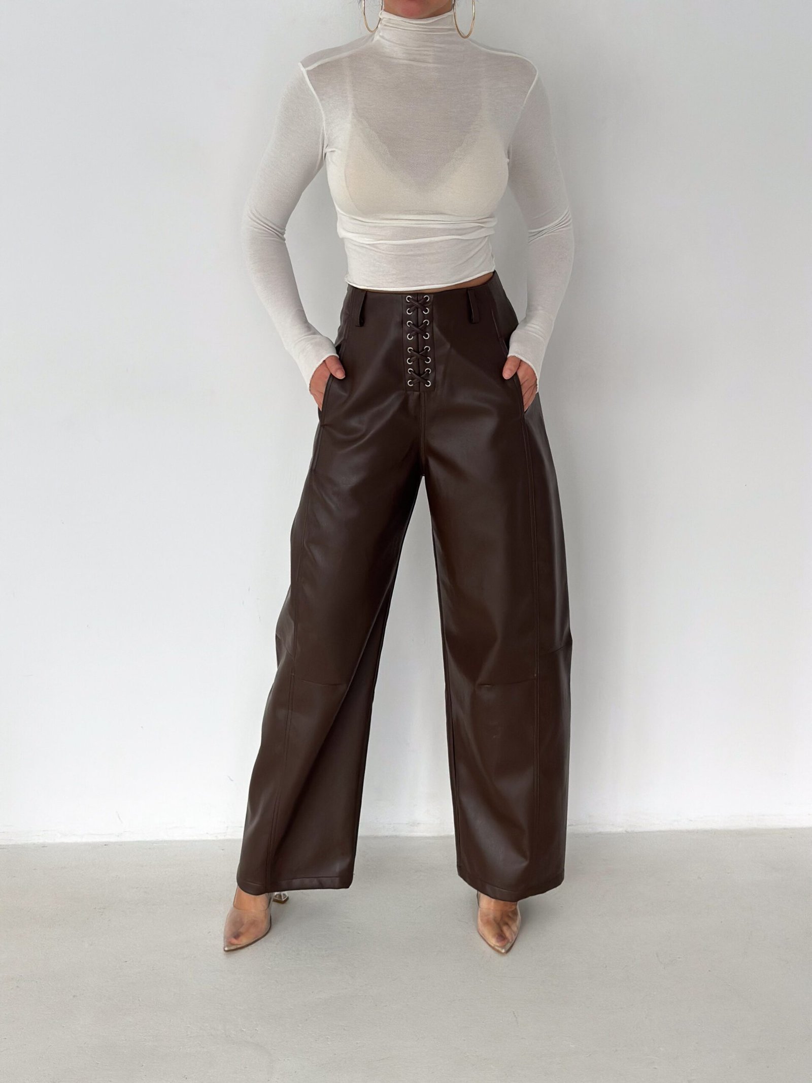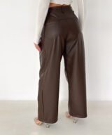 Lace-Up Vegan Leather Wide-Leg Pants – Brown