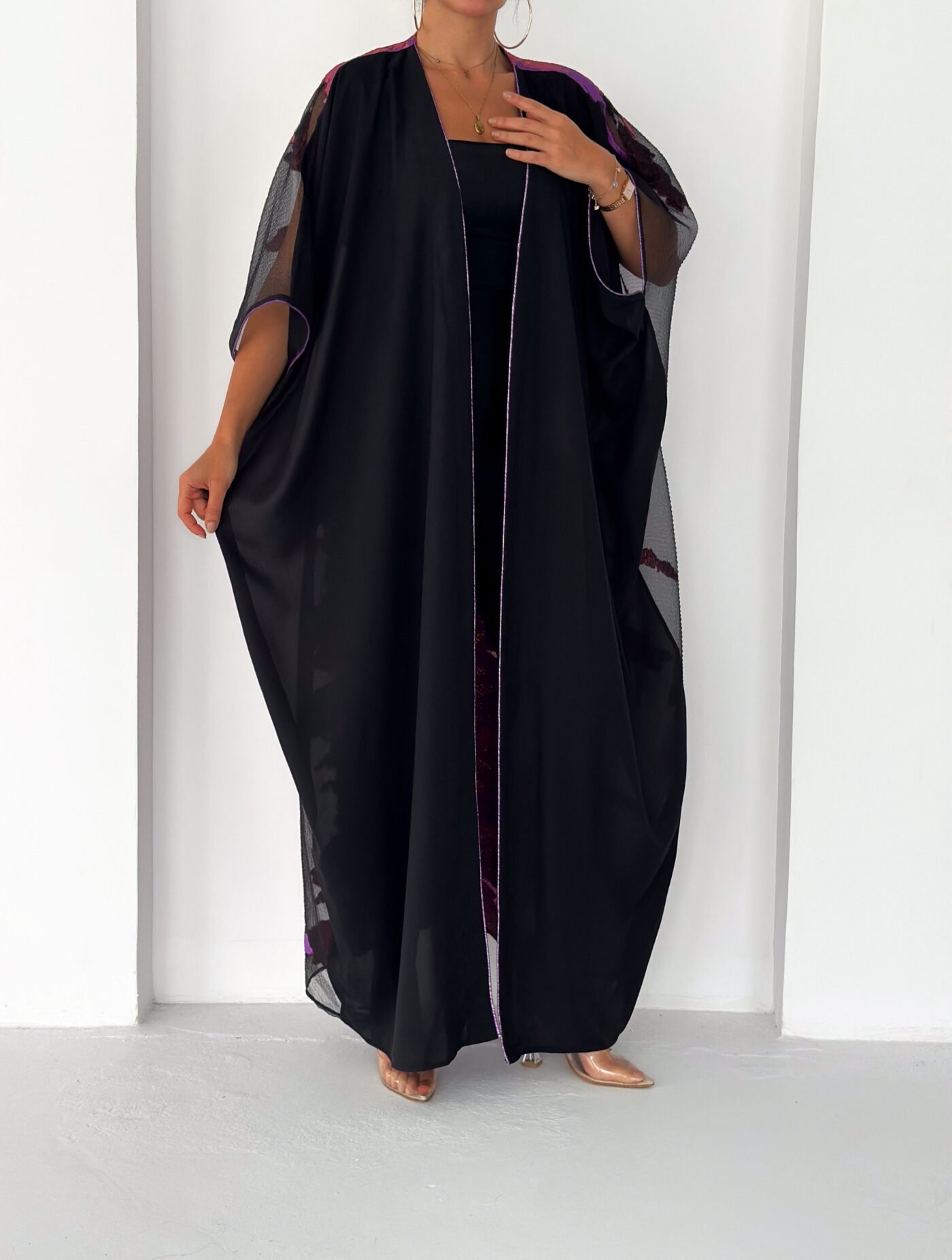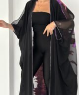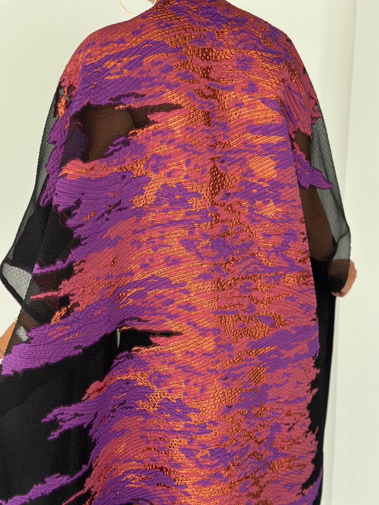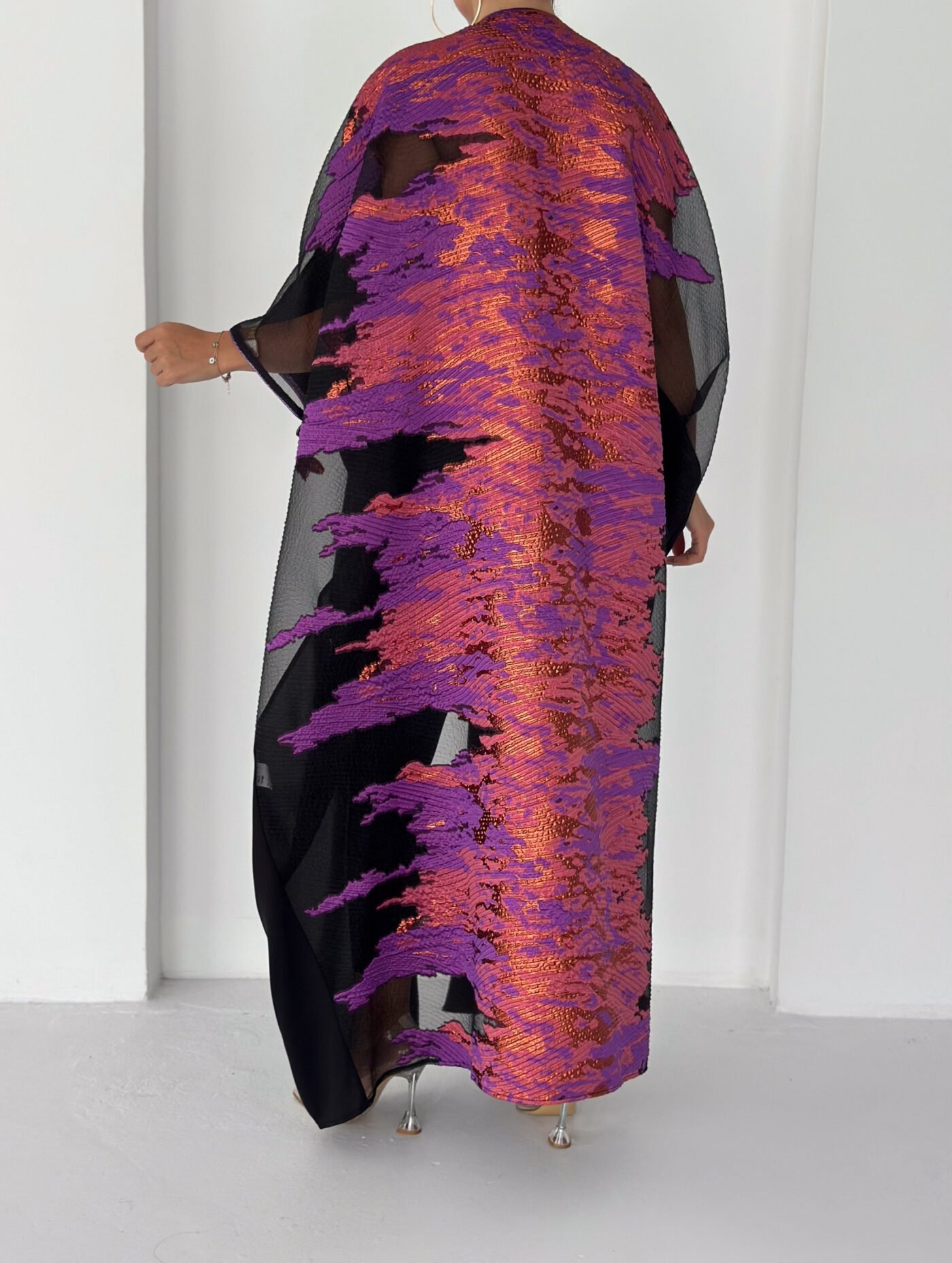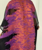 A statement black abaya designed for elegant evenings and special occasions. Featuring sheer sleeves and a striking metallic purple jacquard panel at the back, this piece blends sophistication with modern luxury. Lightweight, flowy and designed to move beautifully with every step.