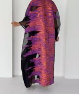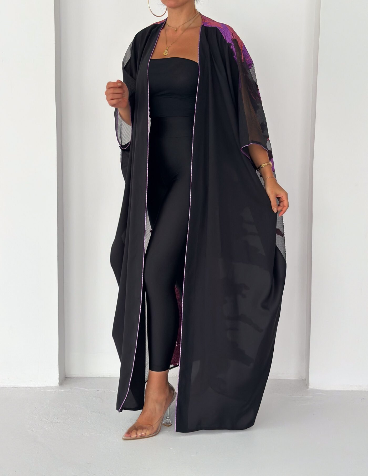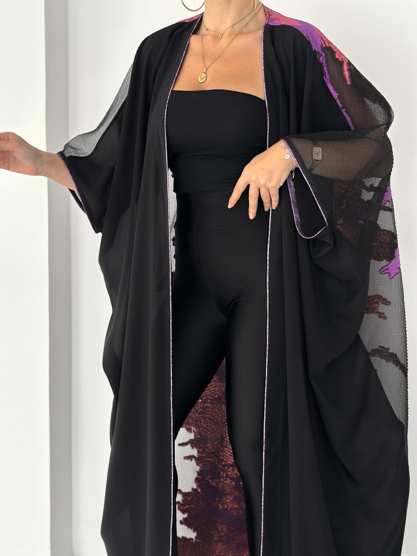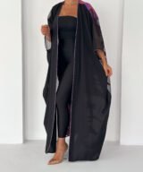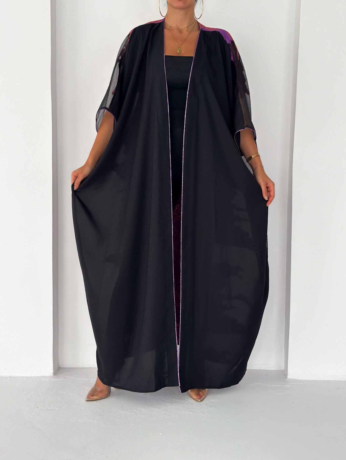 A statement black abaya designed for elegant evenings and special occasions. Featuring sheer sleeves and a striking metallic purple jacquard panel at the back, this piece blends sophistication with modern luxury. Lightweight, flowy and designed to move beautifully with every step.