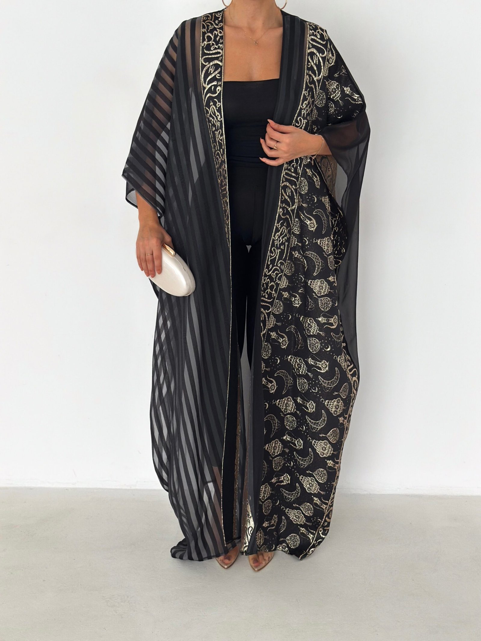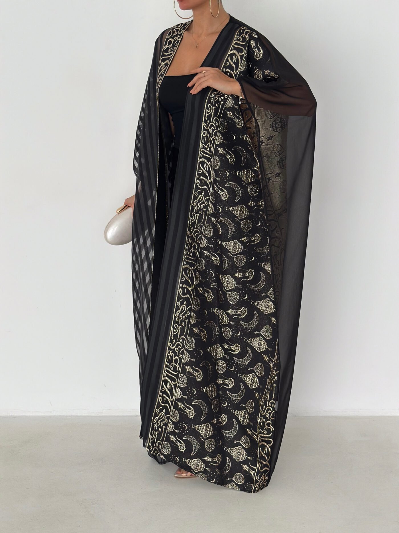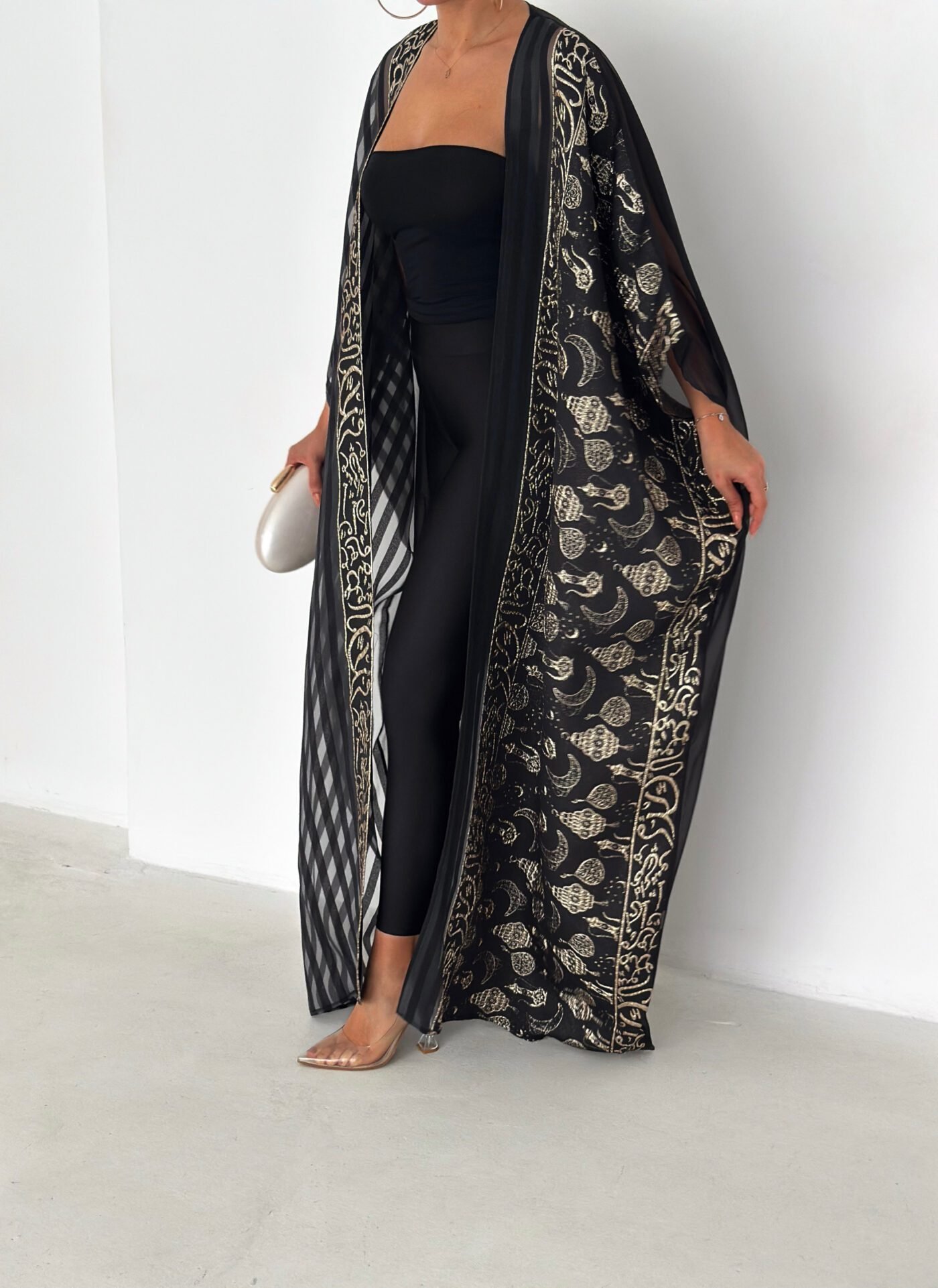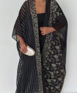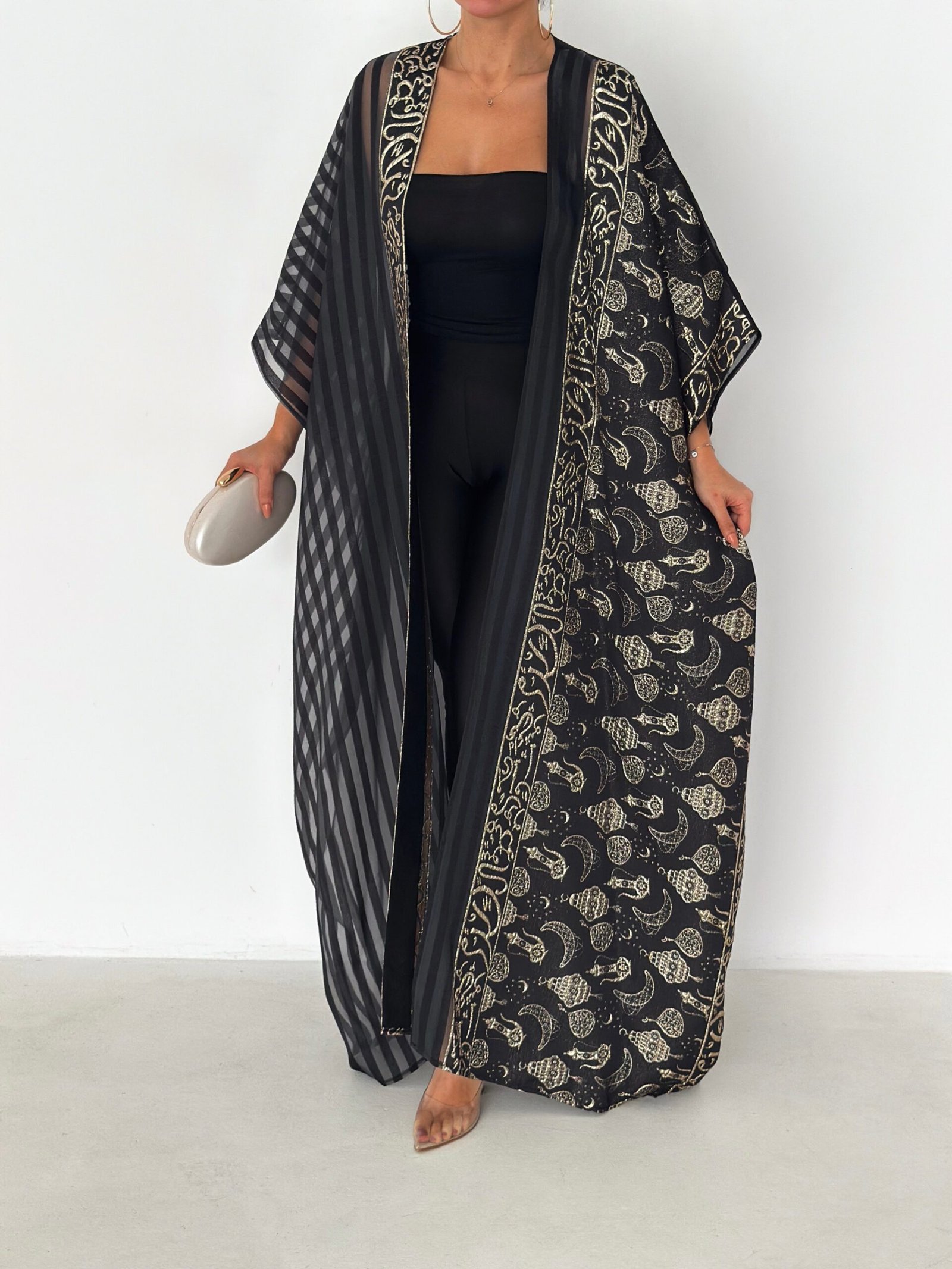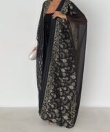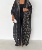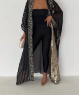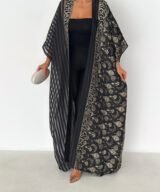A luxurious open abaya designed for elegant evenings and special occasions. Crafted in deep black with rich gold detailing, this statement piece features intricate patterns that add depth and sophistication. Flowy and graceful, it elevates any outfit with timeless elegance.