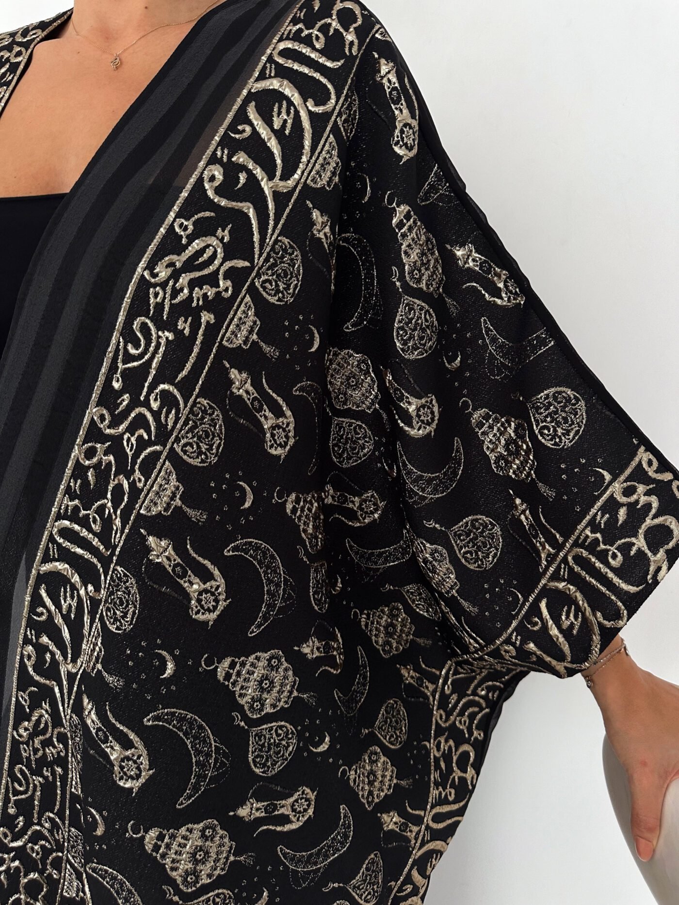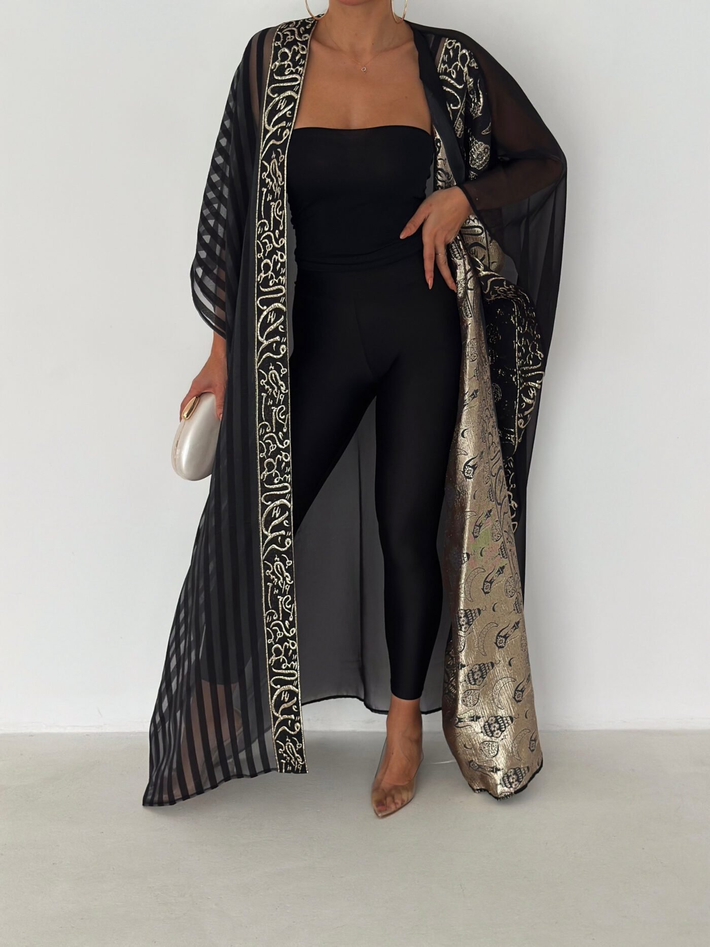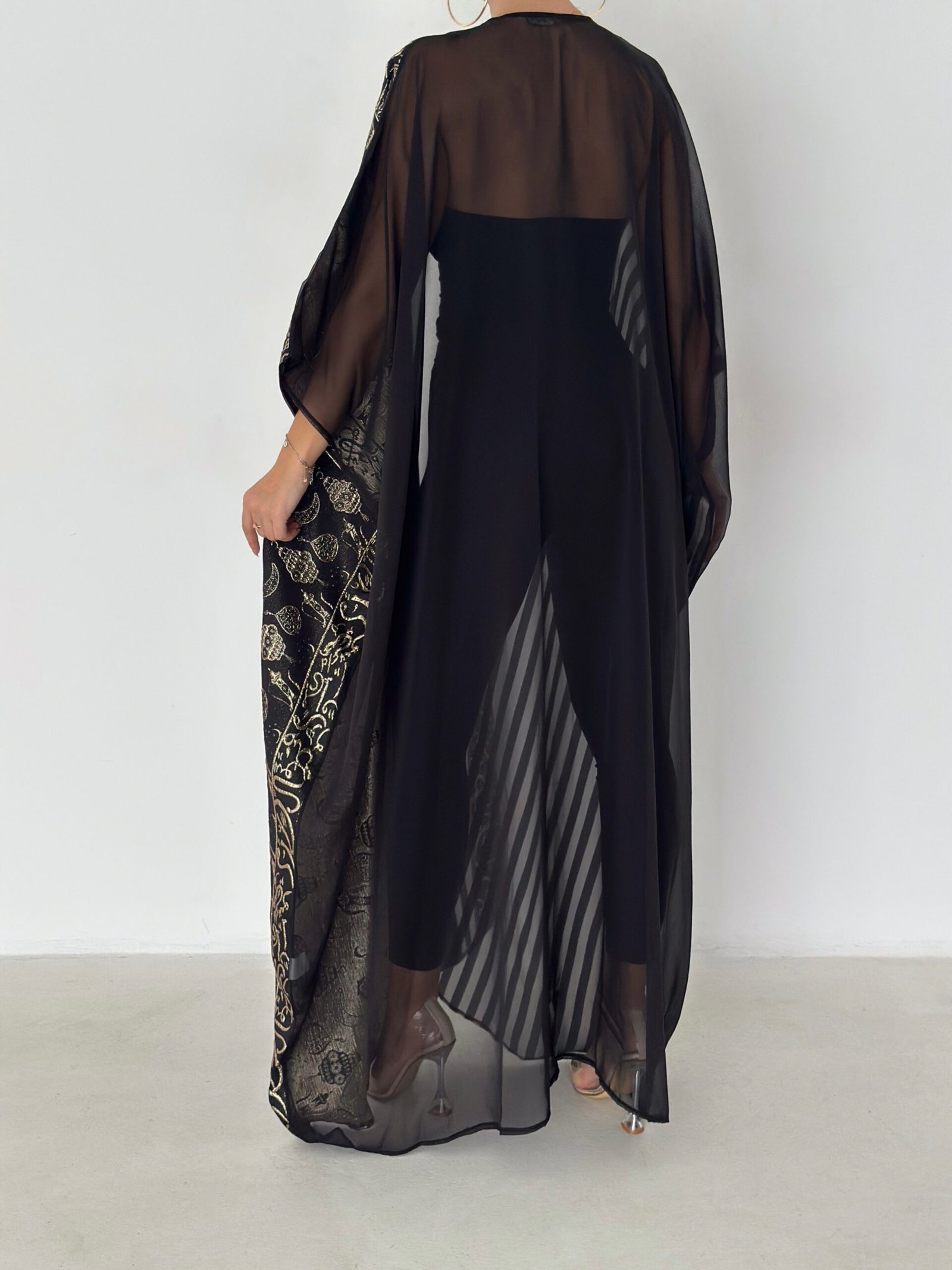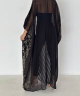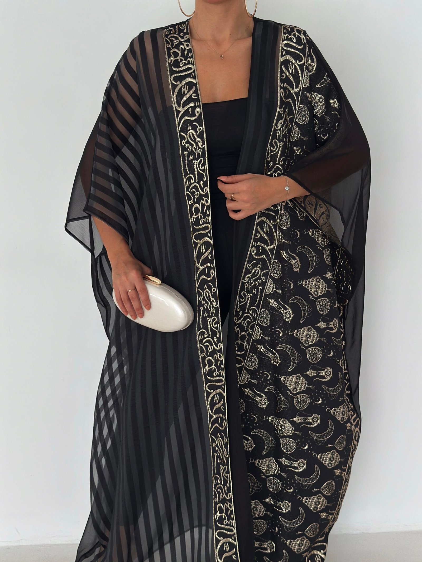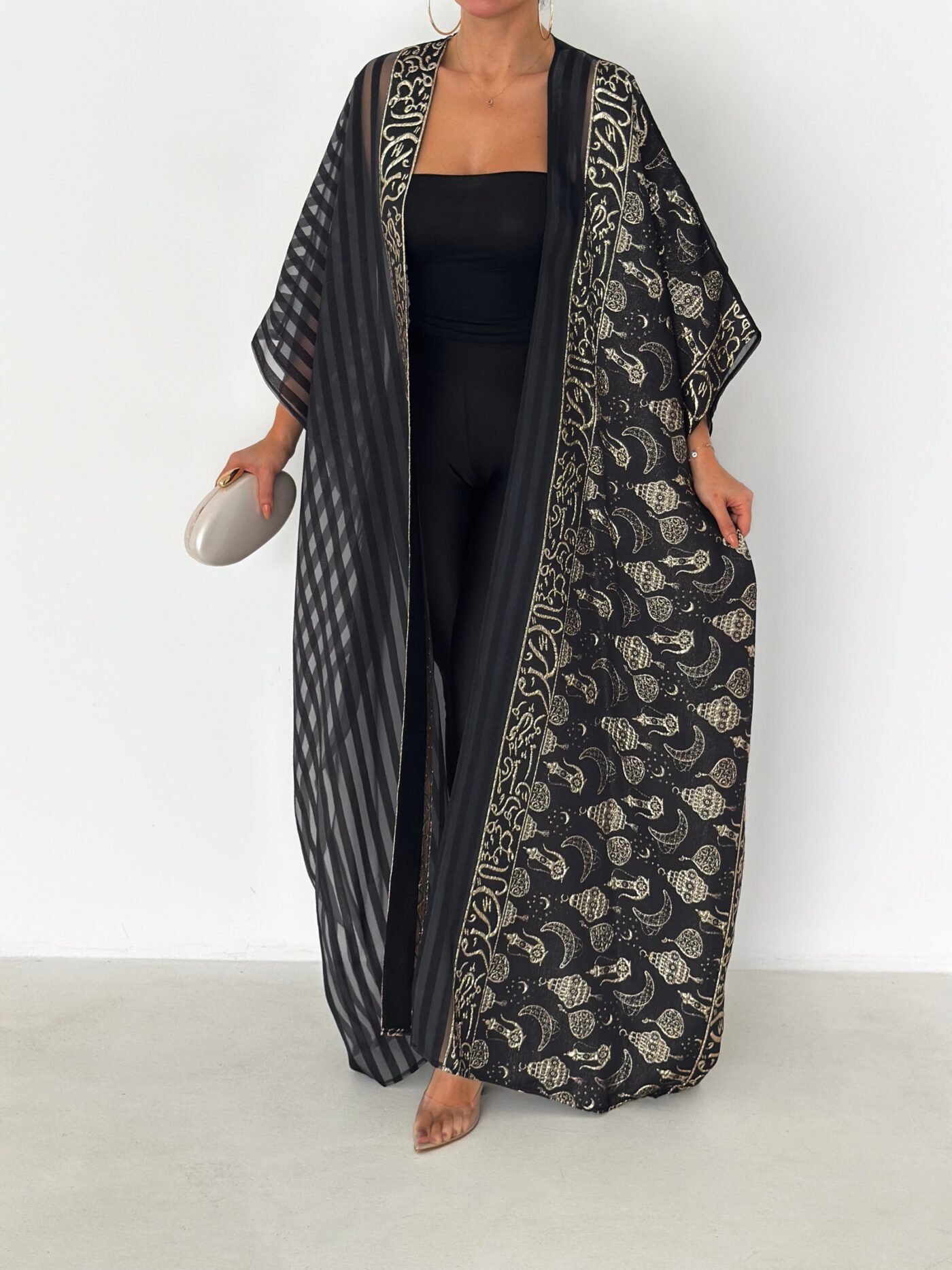 A luxurious open abaya designed for elegant evenings and special occasions. Crafted in deep black with rich gold detailing, this statement piece features intricate patterns that add depth and sophistication. Flowy and graceful, it elevates any outfit with timeless elegance.
