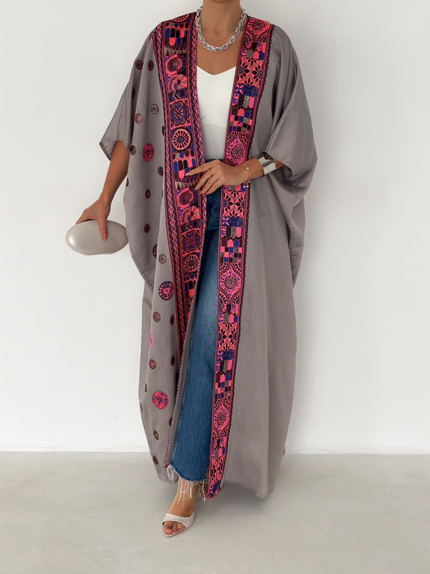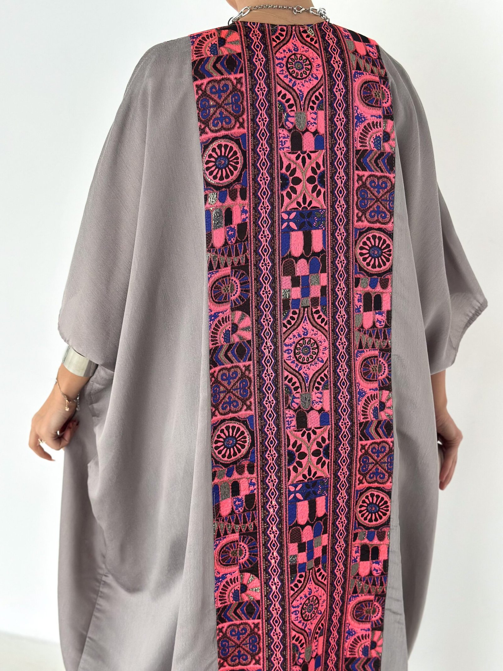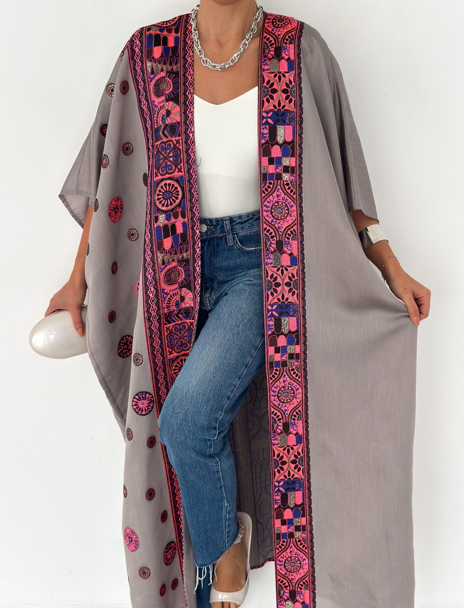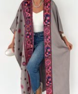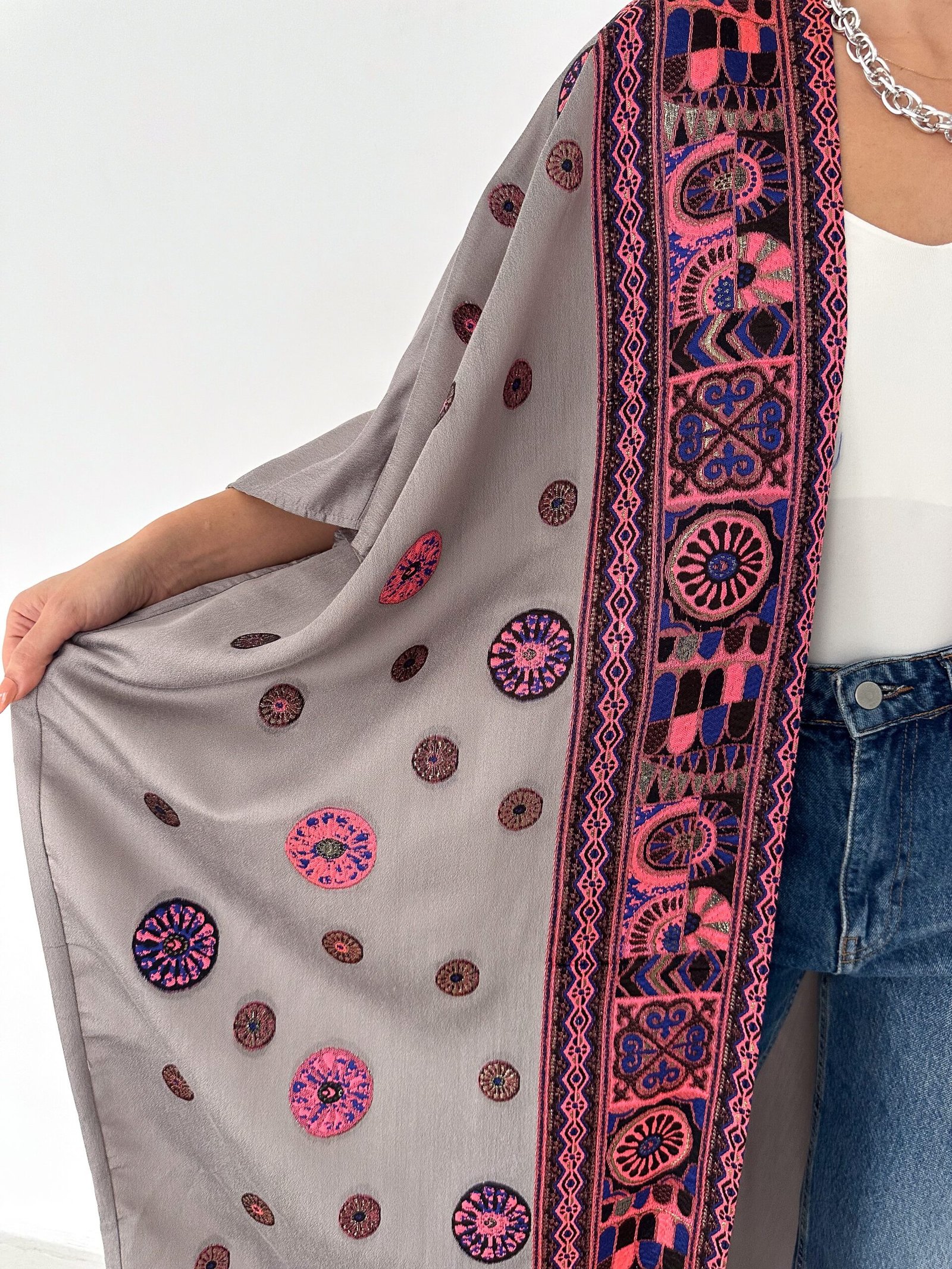 Crafted in a soft grey tone and elevated with vibrant ethnic embroidery along the front and back, this piece blends tradition with a modern, bohemian touch.