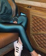 Lycra® high waisted women’s jungle green leggings with high elasticity, shiny finish, tight shape, high waist and anatomical waistband.