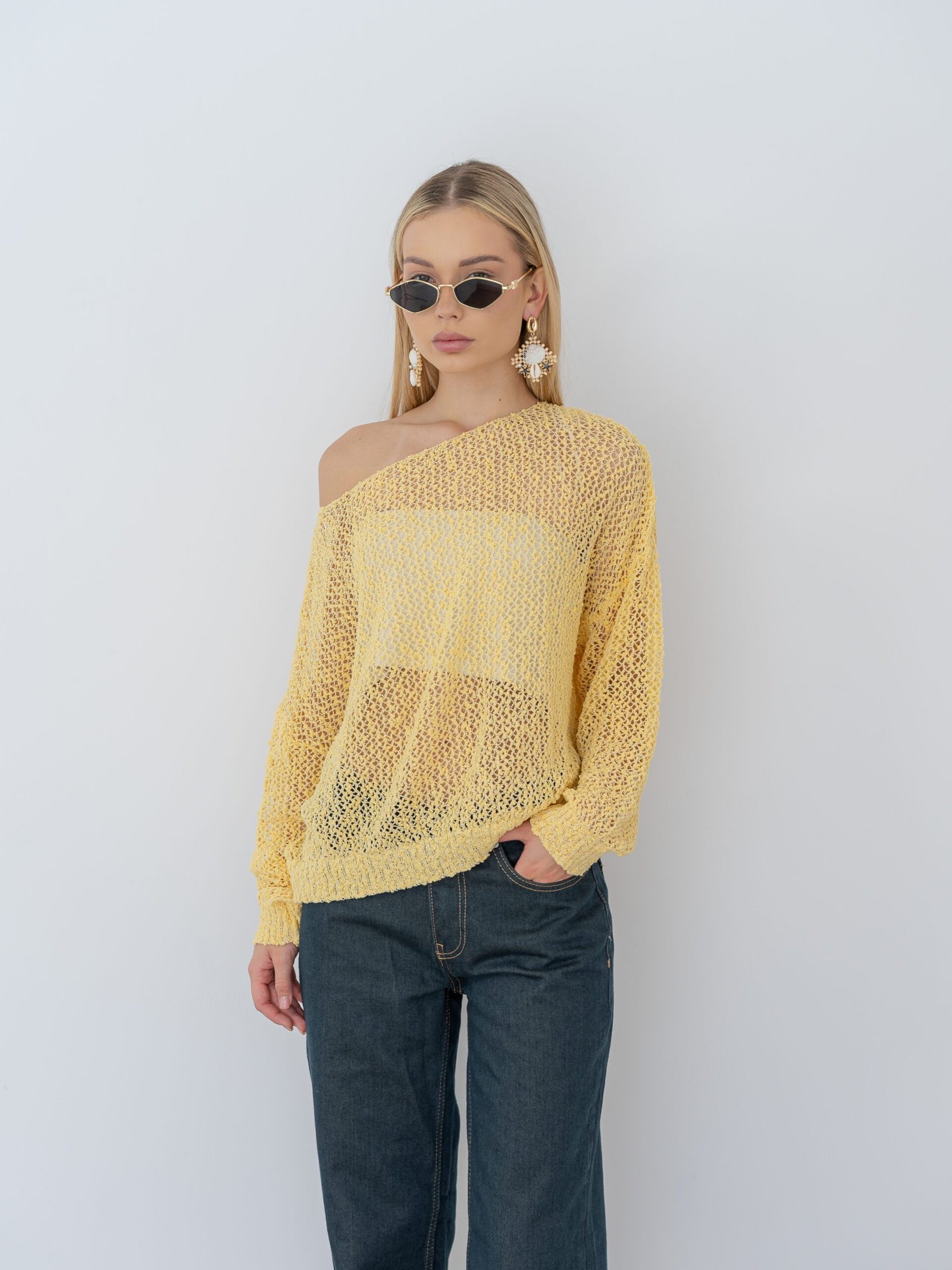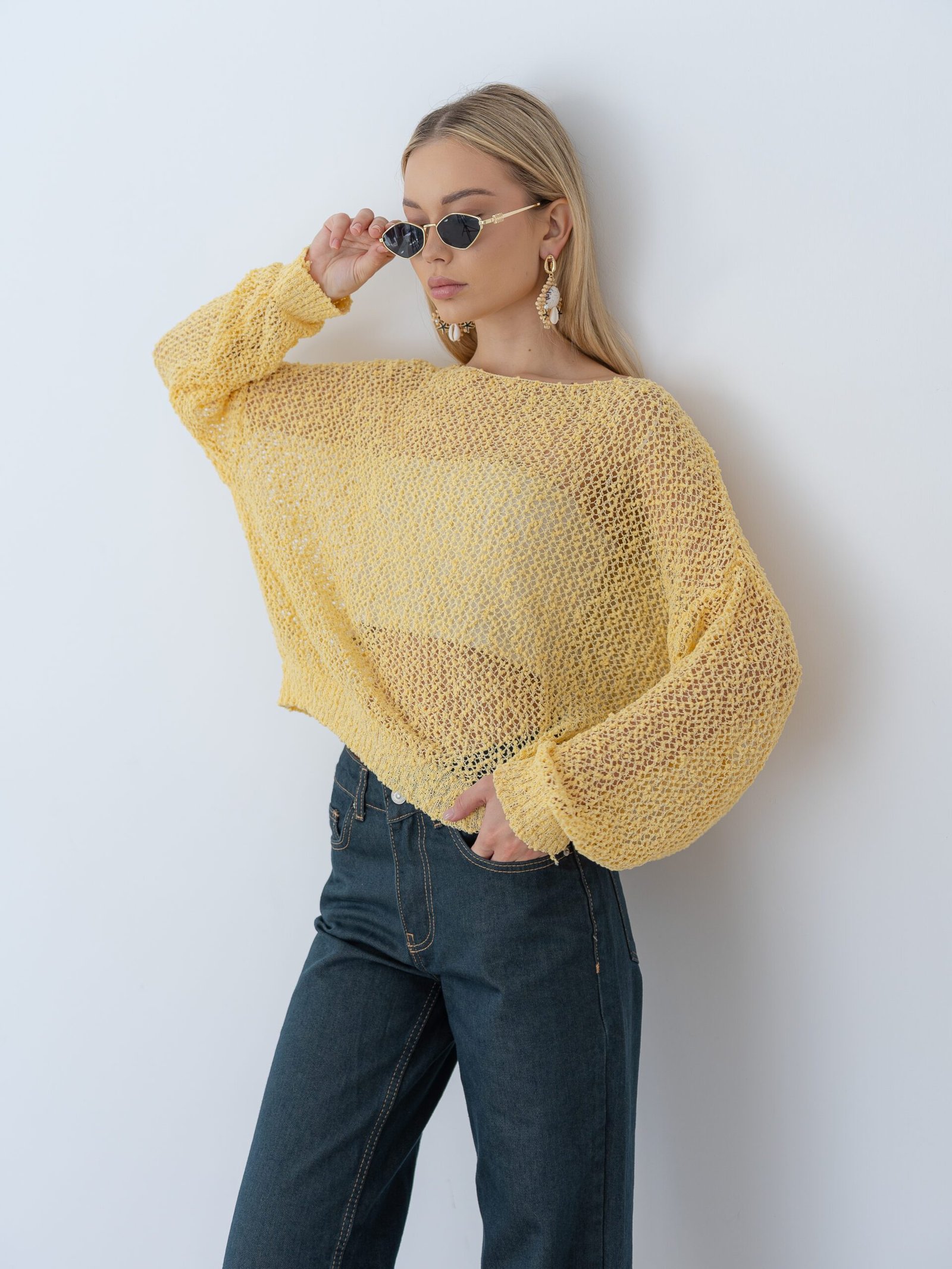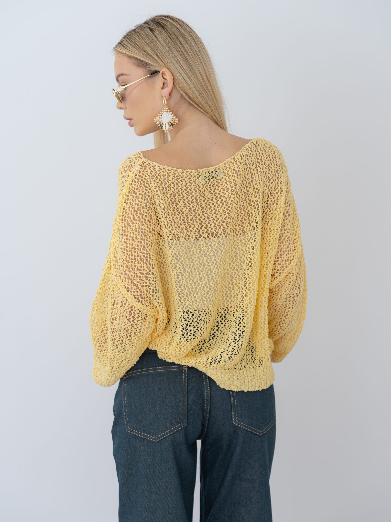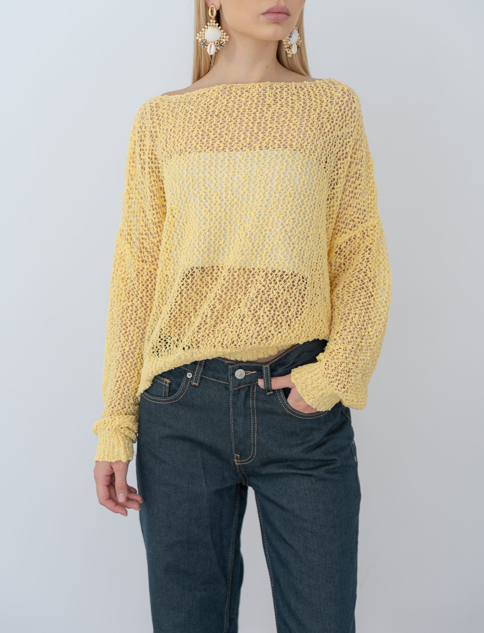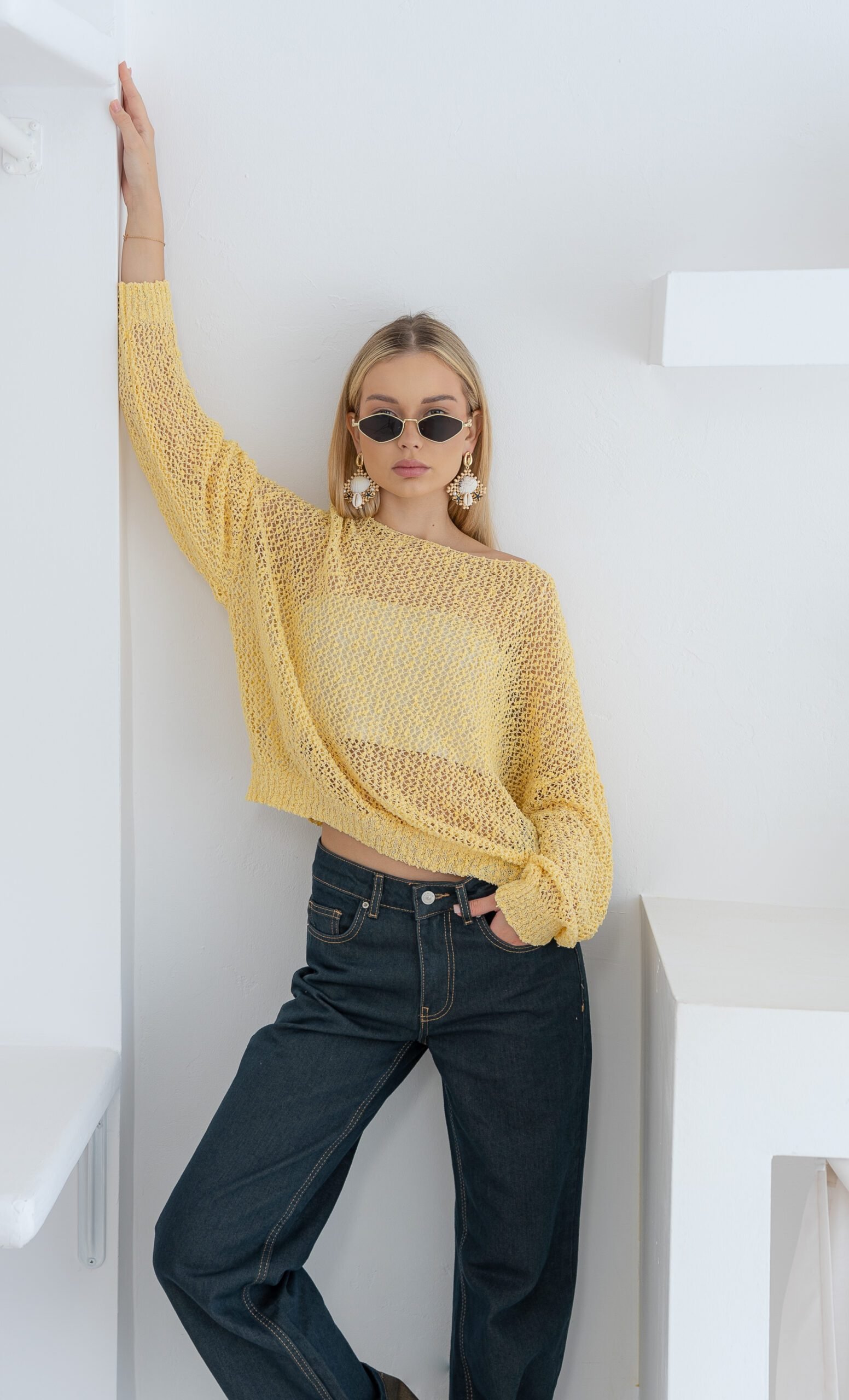 A bright mesh knit sweater in sunshine yellow. Perfect to uplift any outfit with a cheerful vibe.