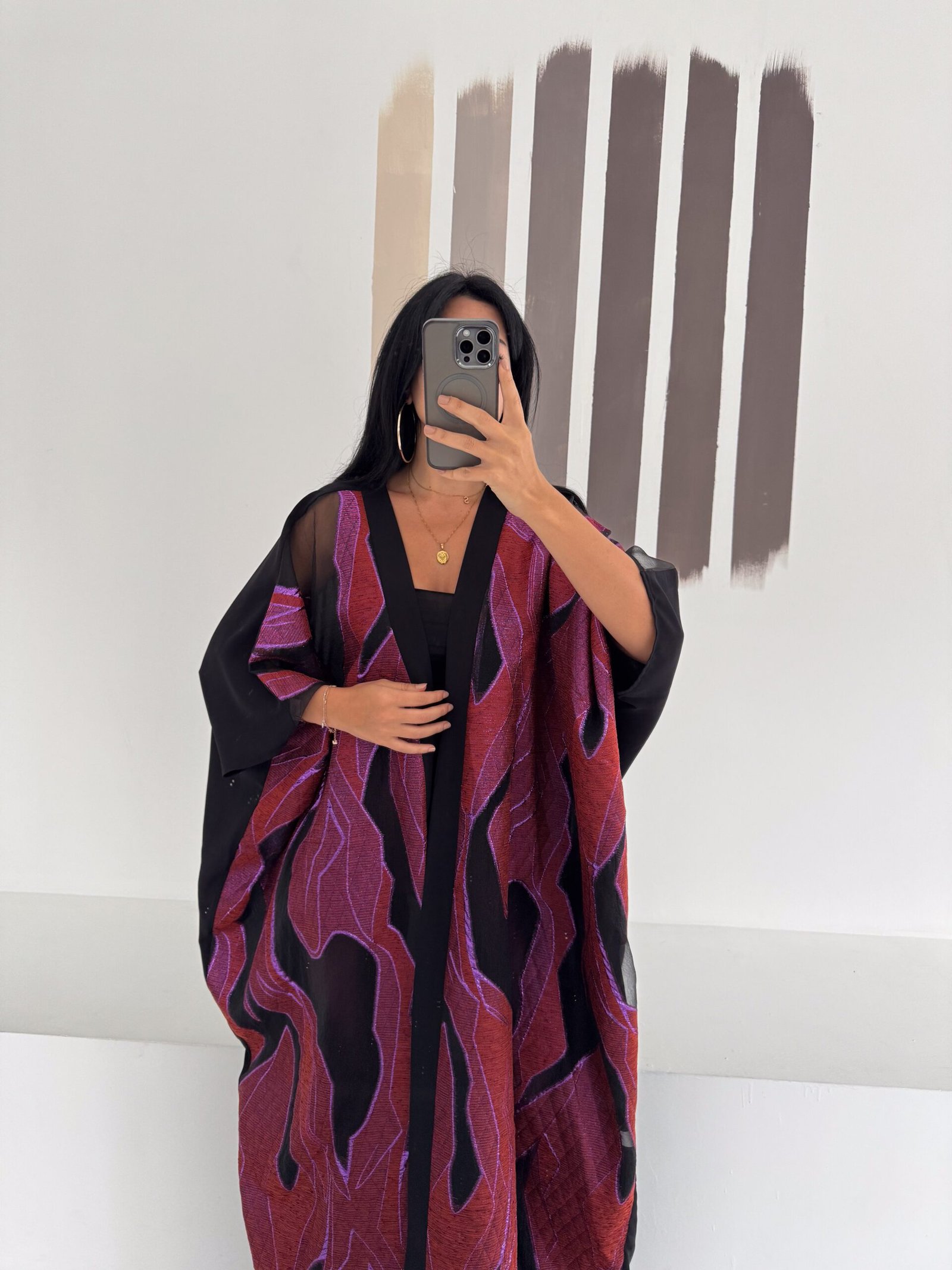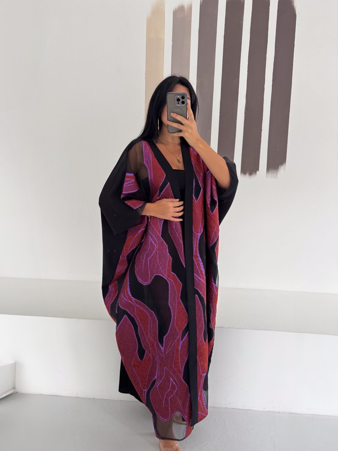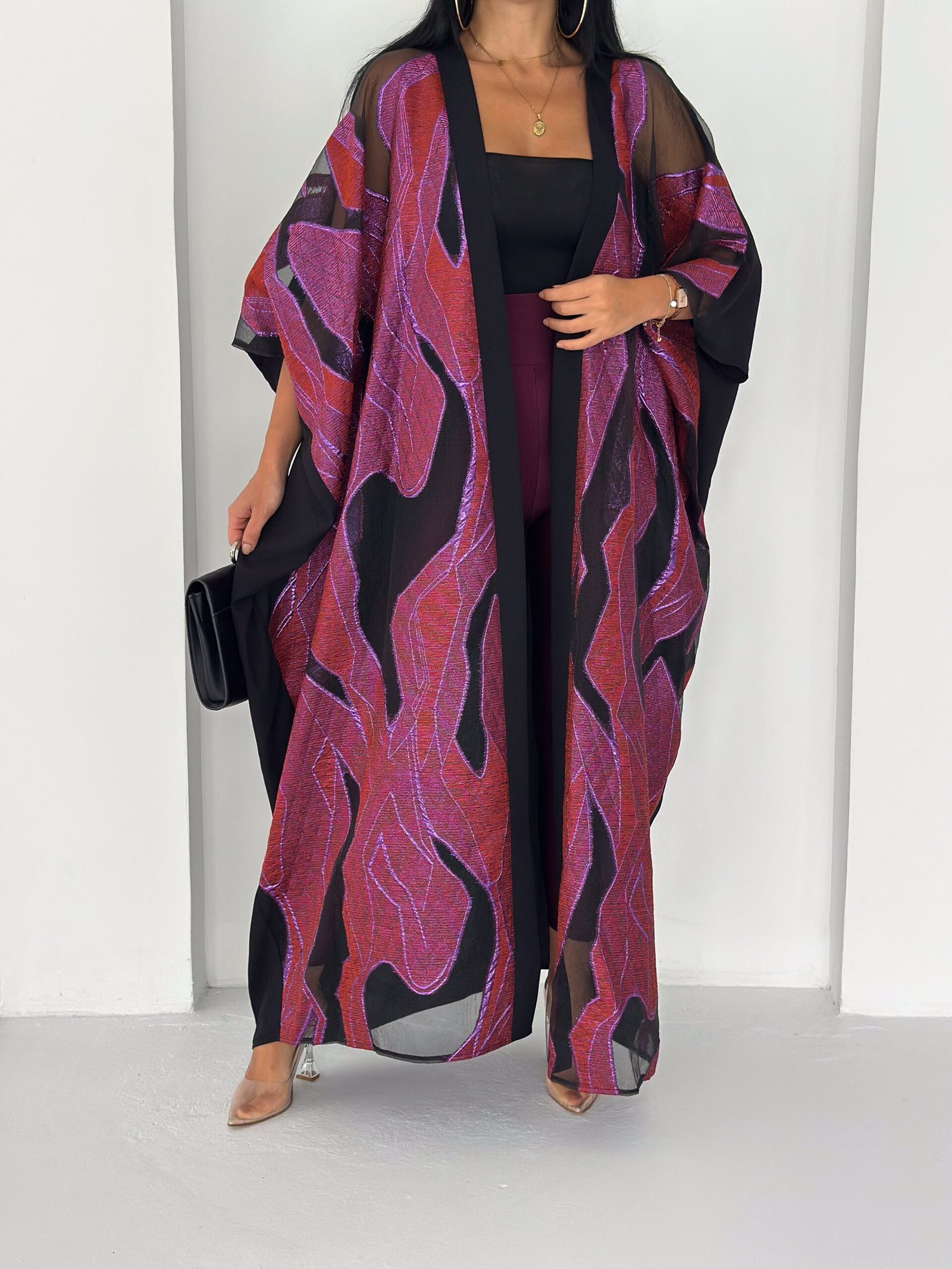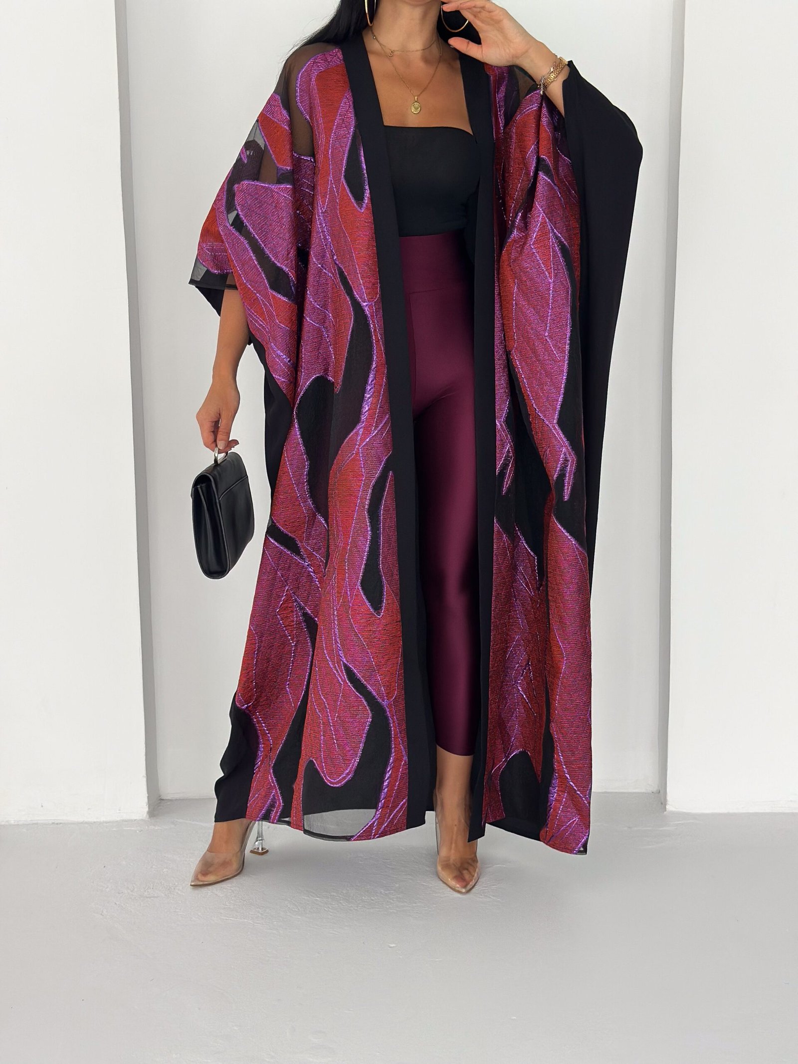 A statement abaya crafted from sheer black organza layered with luminous fuchsia and wine abstract patterns. Designed with a bold black front trim and wide flowing sleeves, this piece blends elegance with modern drama. Perfect for evening outings, special events, or elevating everyday looks.