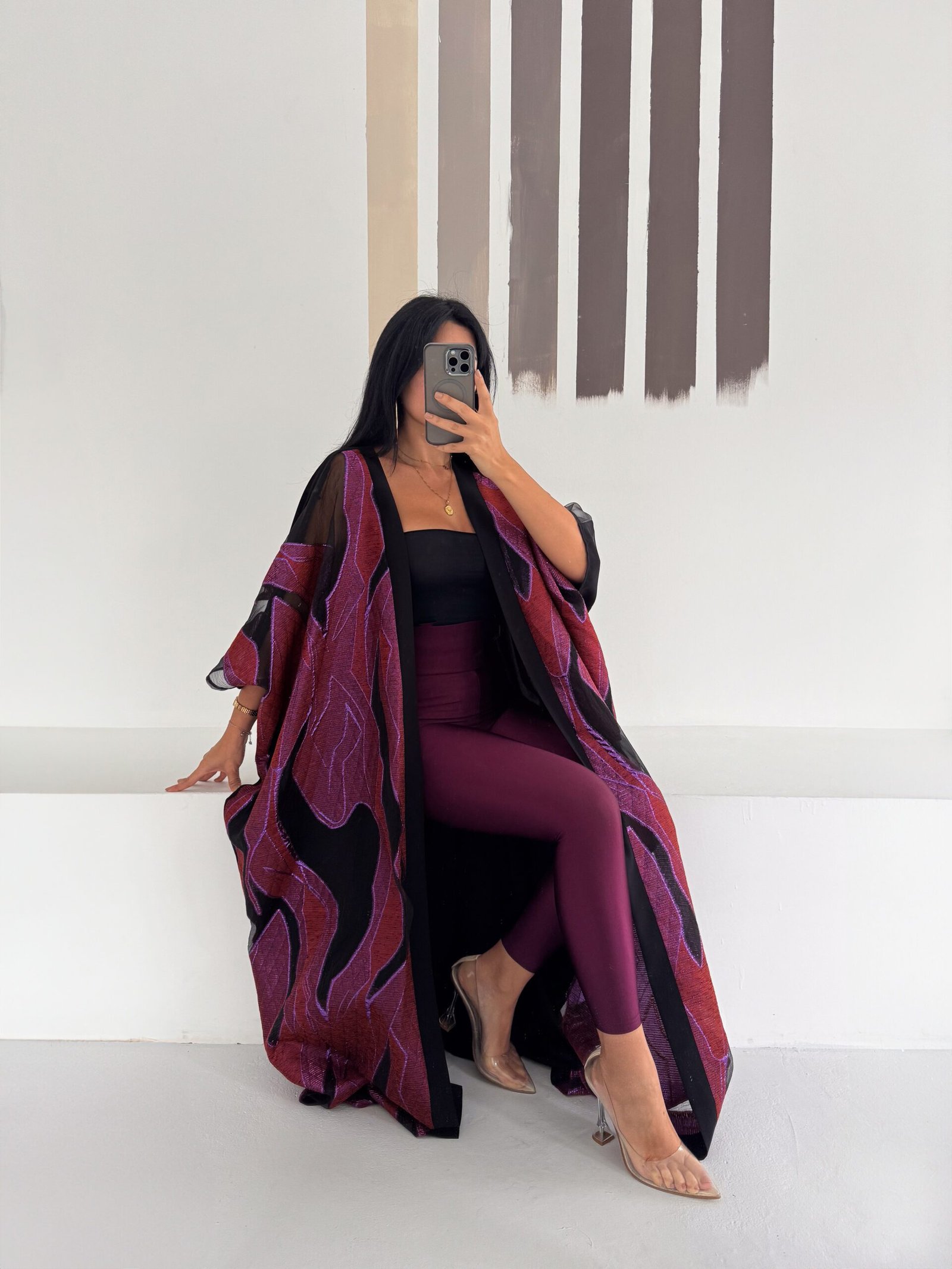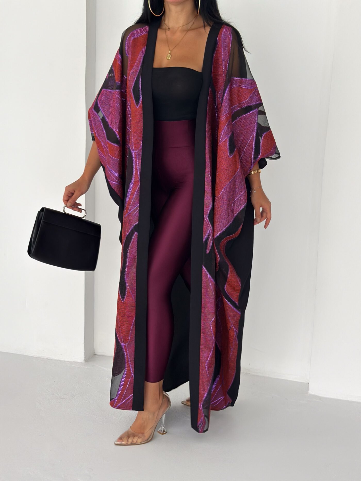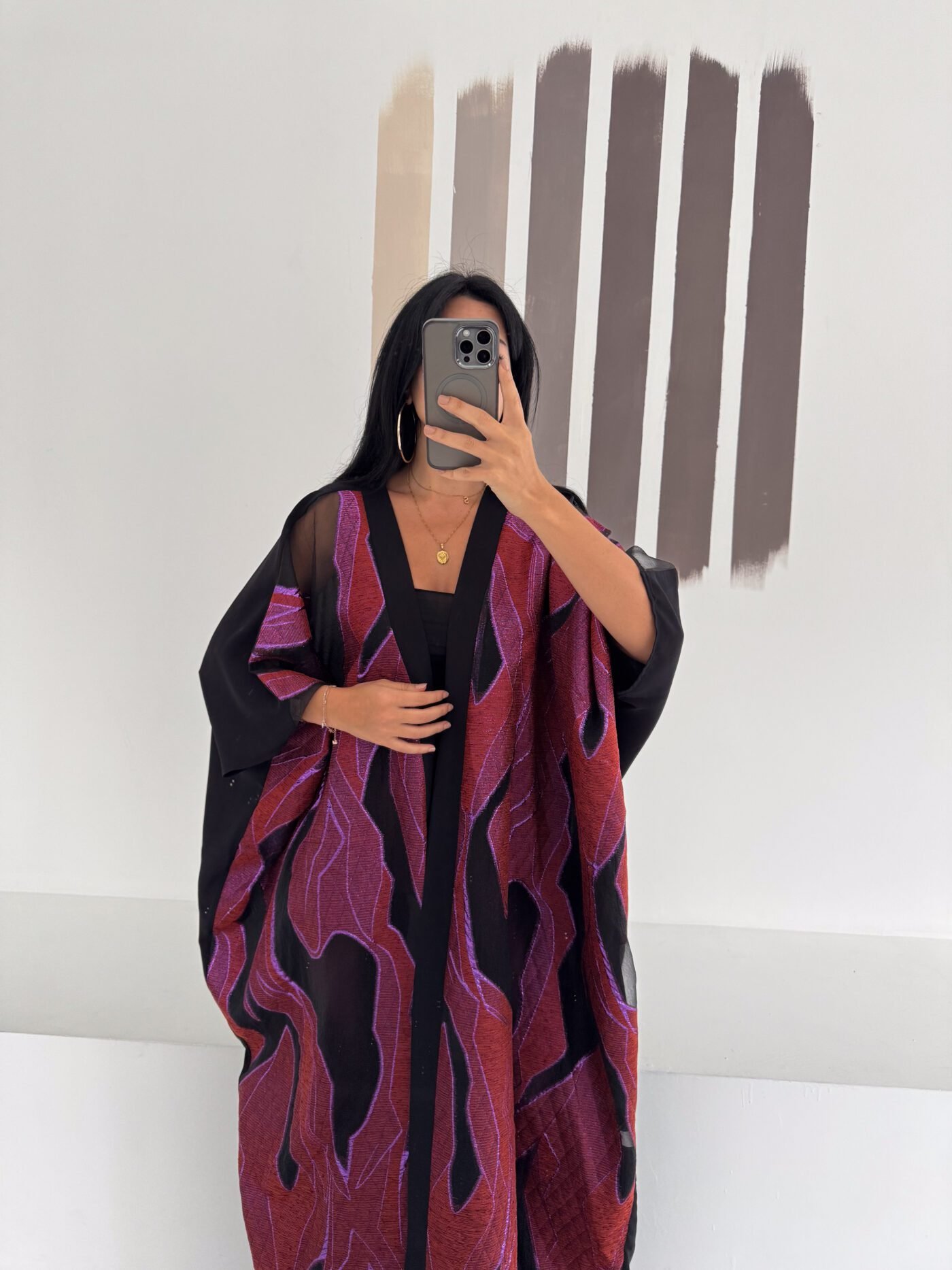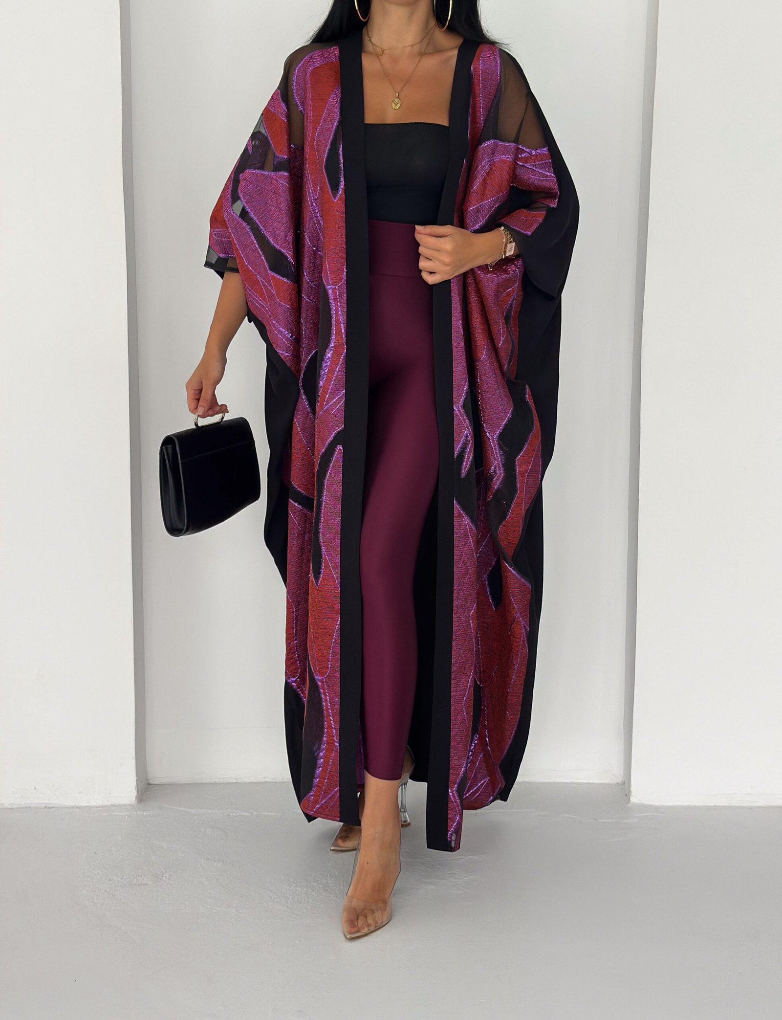 A statement abaya crafted from sheer black organza layered with luminous fuchsia and wine abstract patterns. Designed with a bold black front trim and wide flowing sleeves, this piece blends elegance with modern drama. Perfect for evening outings, special events, or elevating everyday looks.