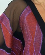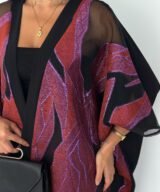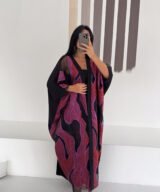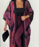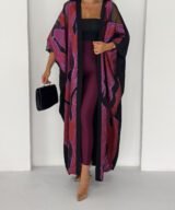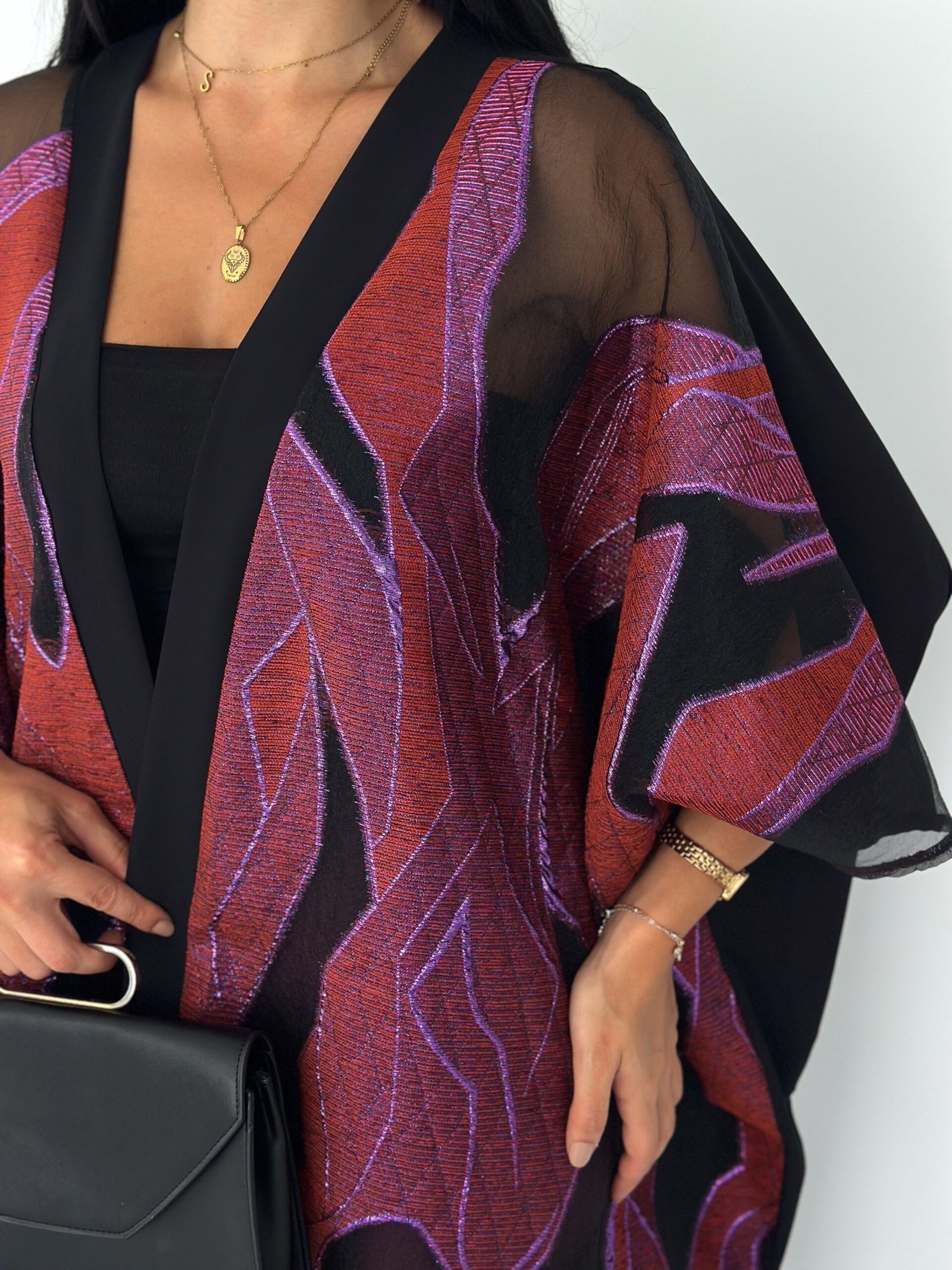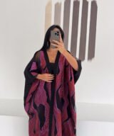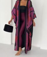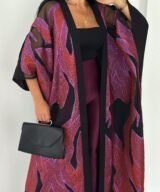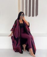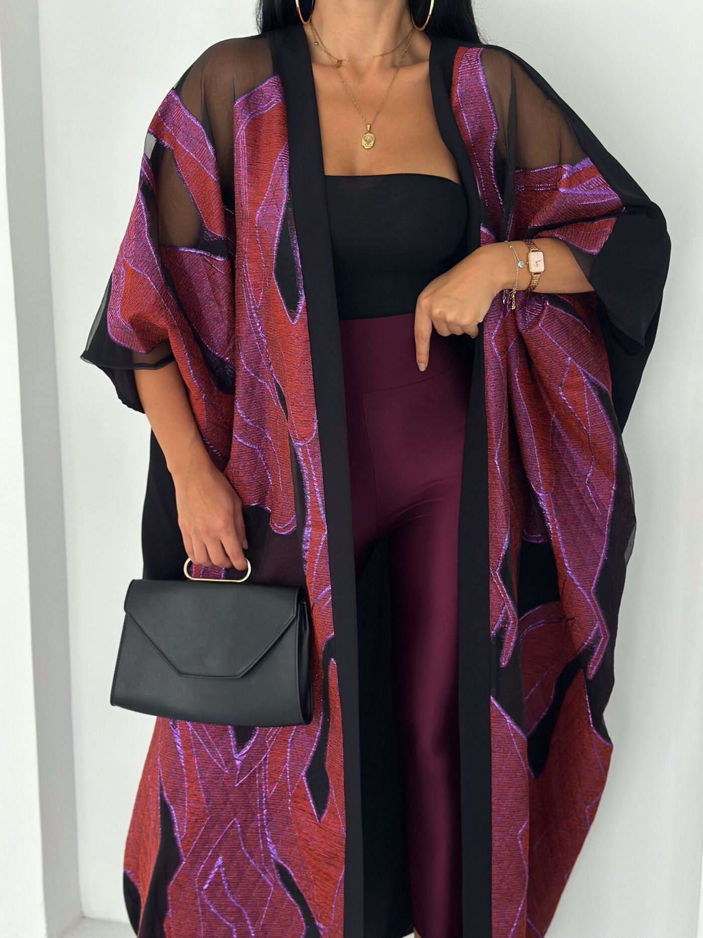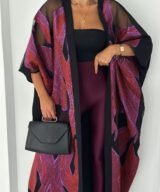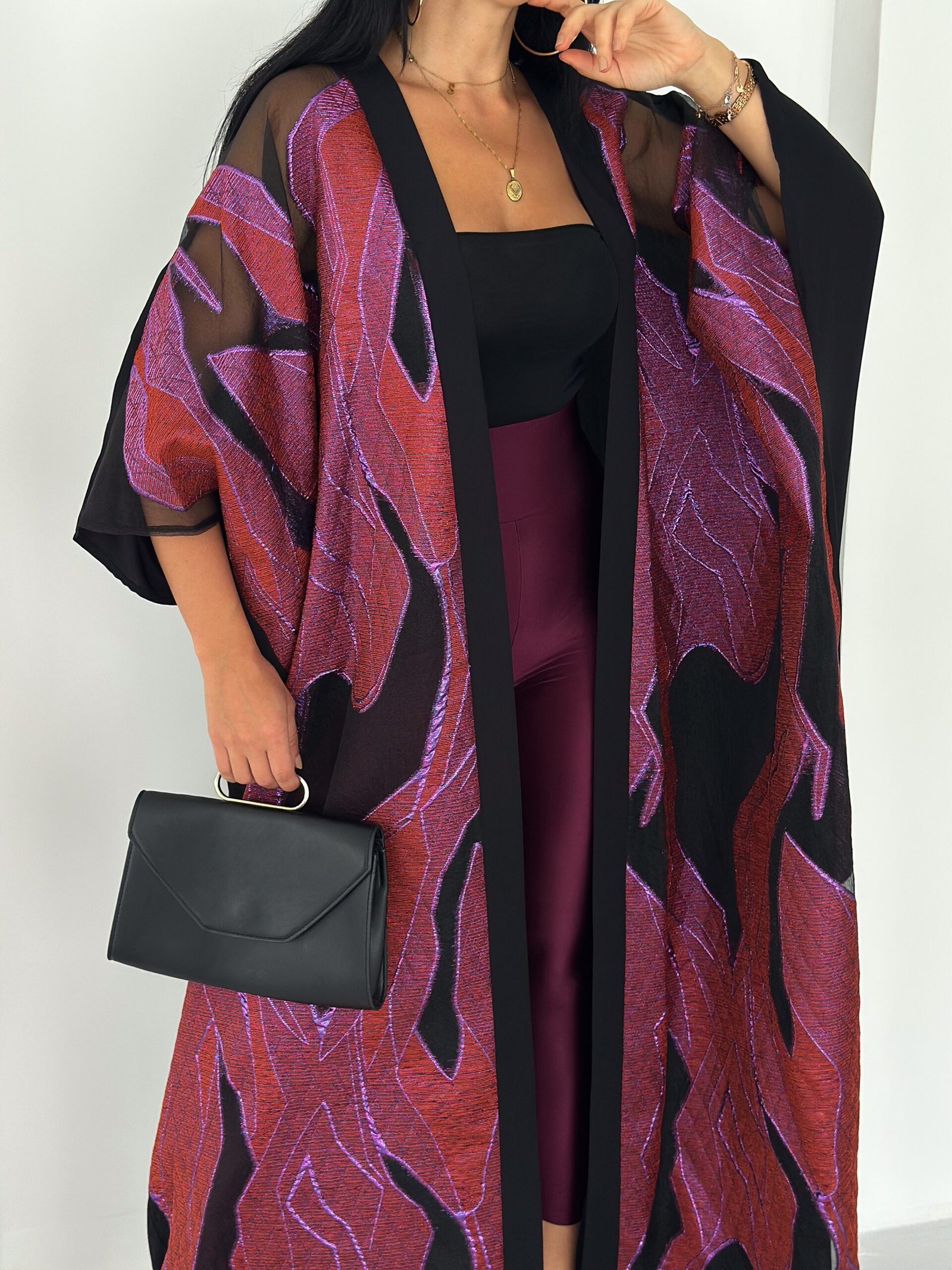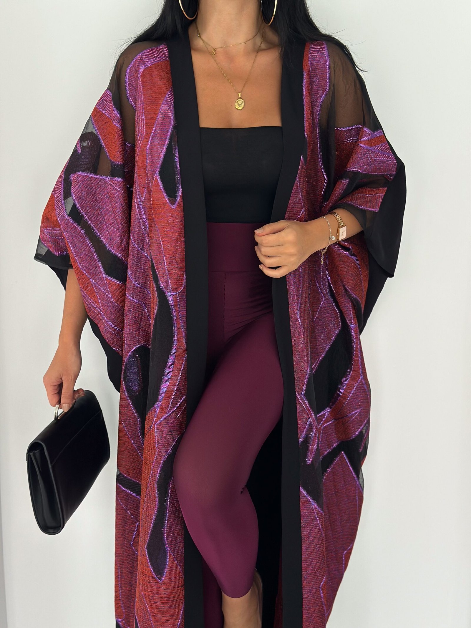 A statement abaya crafted from sheer black organza layered with luminous fuchsia and wine abstract patterns. Designed with a bold black front trim and wide flowing sleeves, this piece blends elegance with modern drama. Perfect for evening outings, special events, or elevating everyday looks.