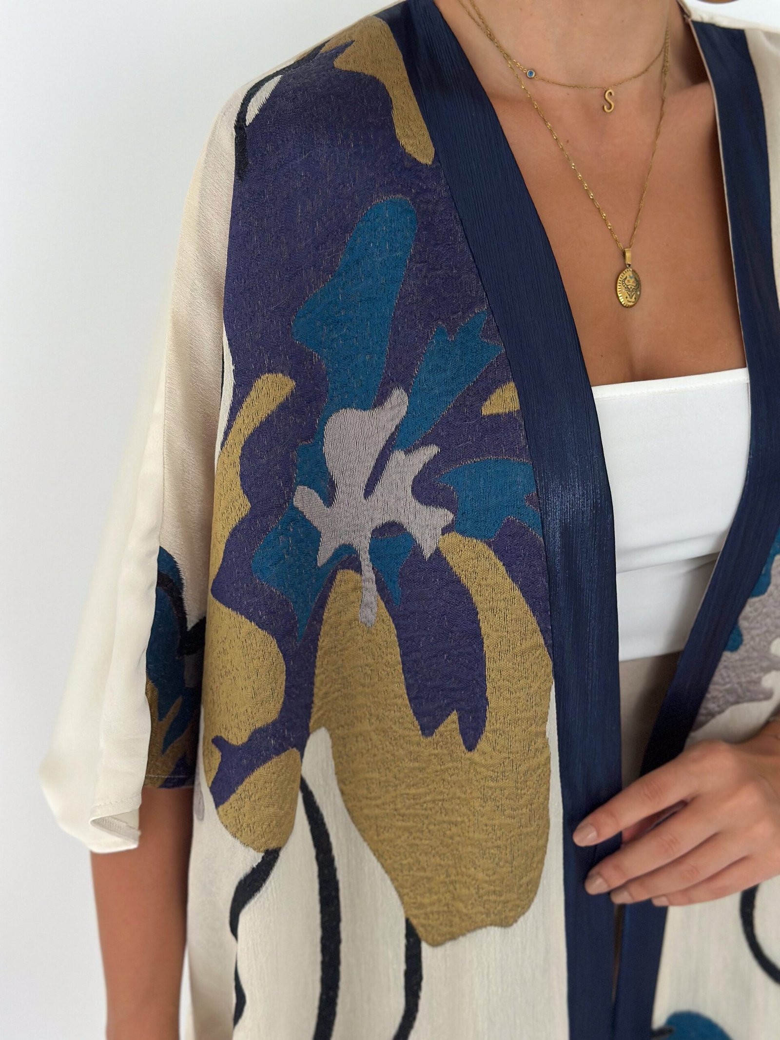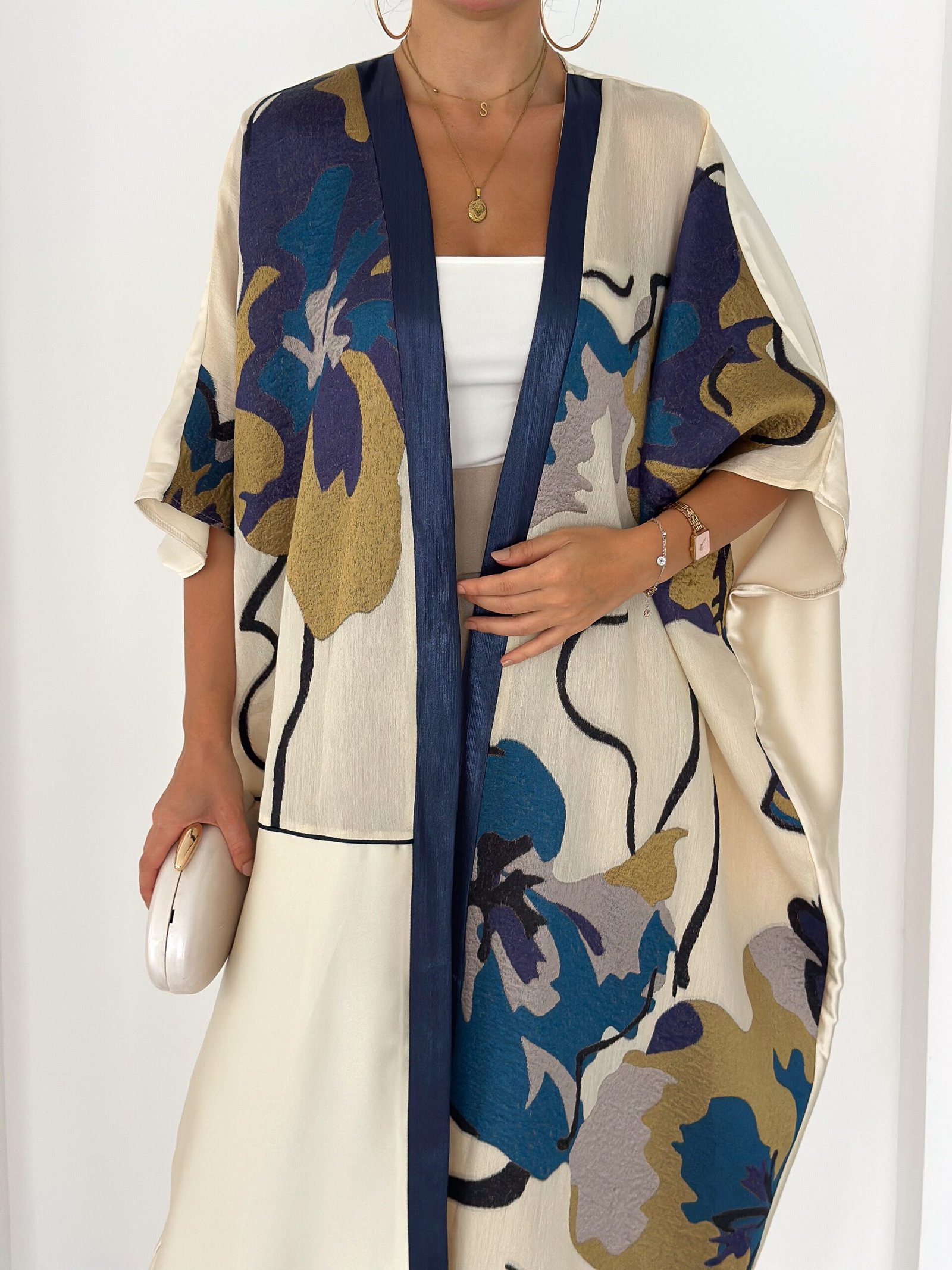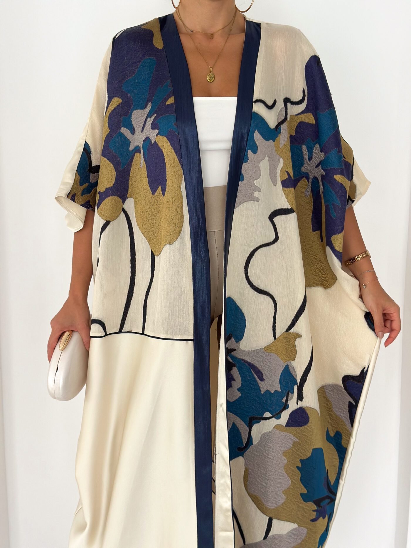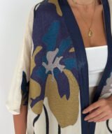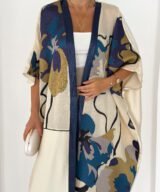 This piece features a soft ivory base enriched with artistic floral prints in deep navy, teal, and warm gold tones, finished with a refined navy front trim for a sophisticated touch.