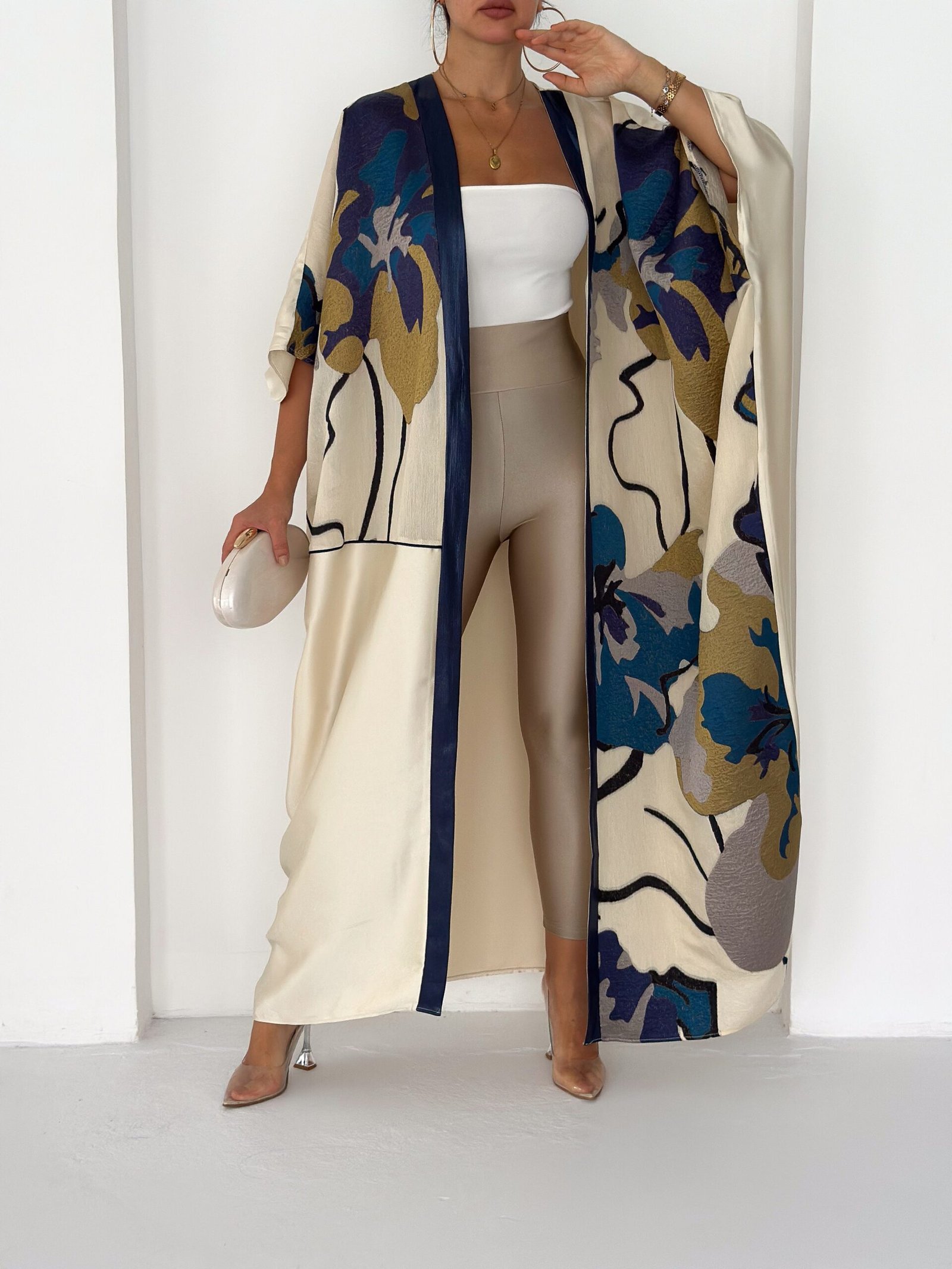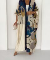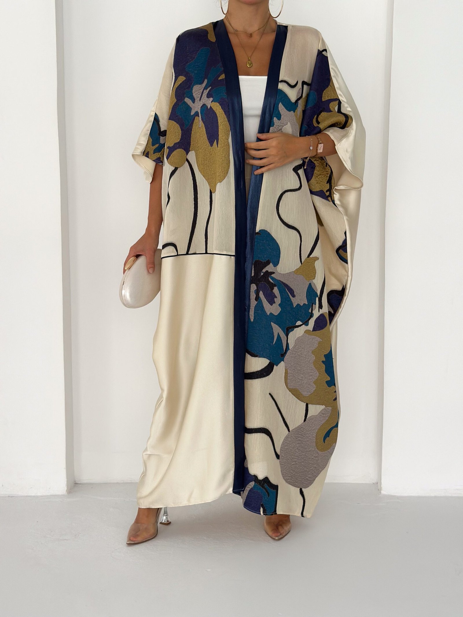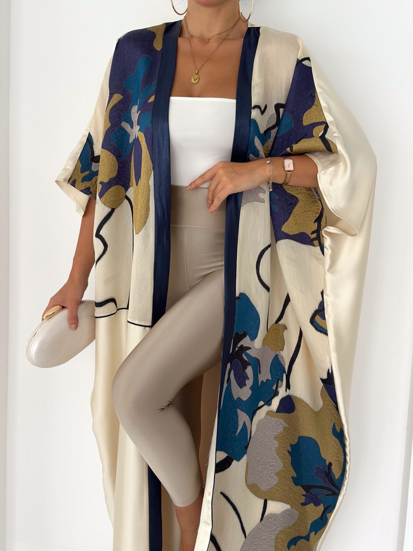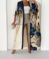This piece features a soft ivory base enriched with artistic floral prints in deep navy, teal, and warm gold tones, finished with a refined navy front trim for a sophisticated touch.
