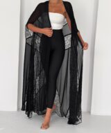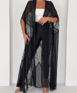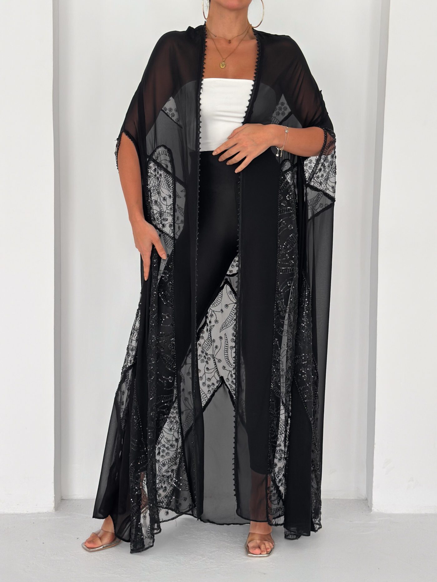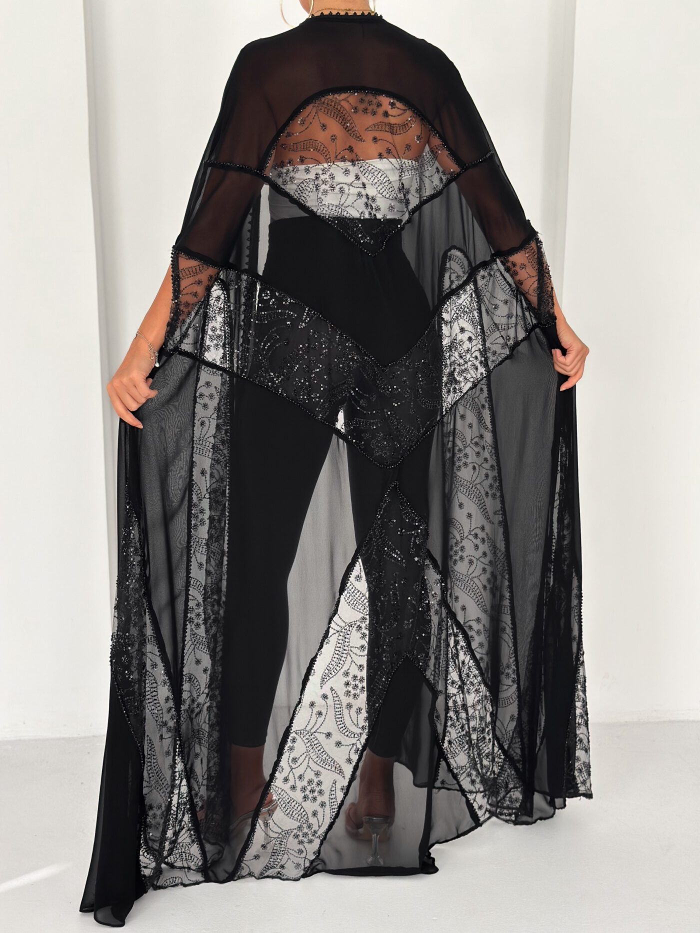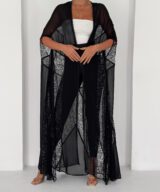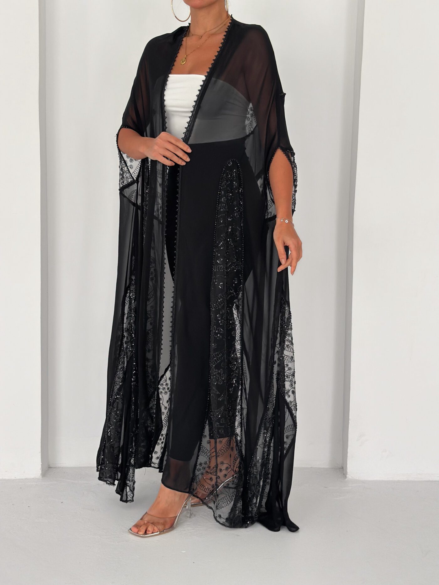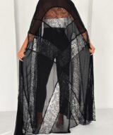 A statement black abaya crafted from lightweight sheer chiffon, elevated with intricate lace panel detailing along the sides and inner layers.