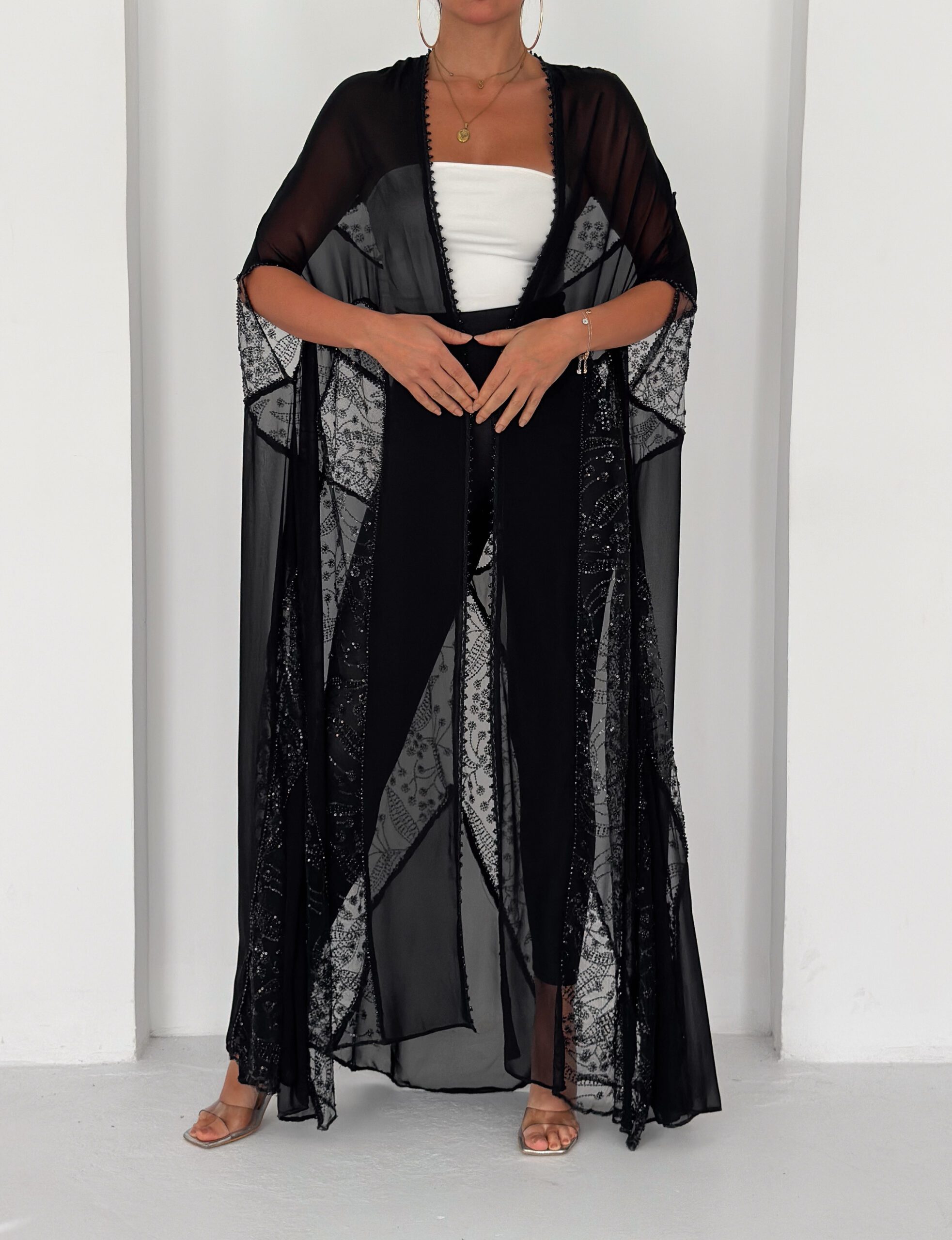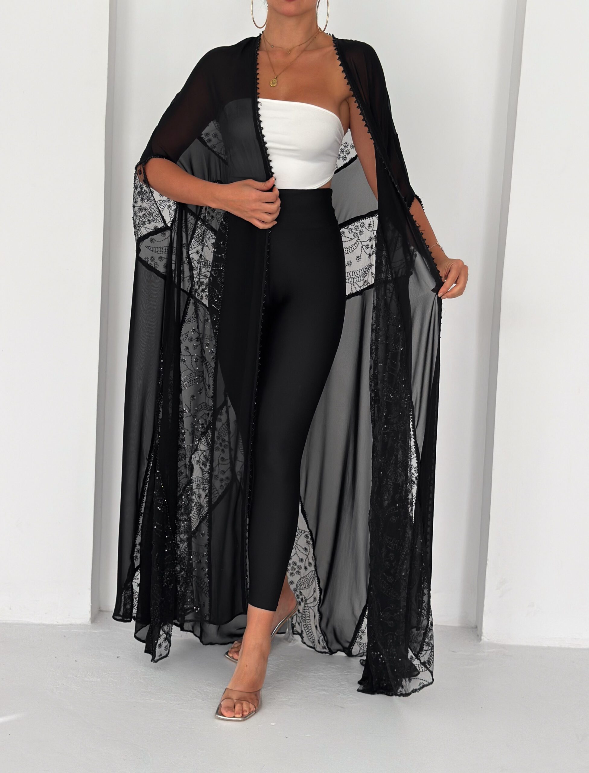 A statement black abaya crafted from lightweight sheer chiffon, elevated with intricate lace panel detailing along the sides and inner layers.