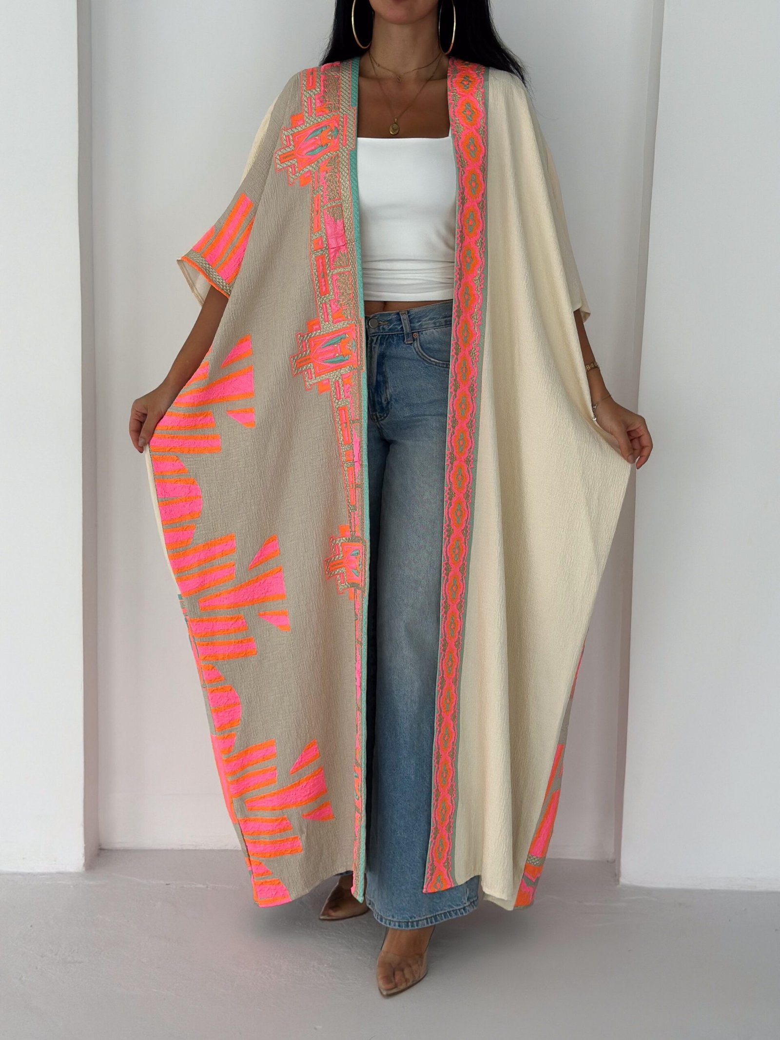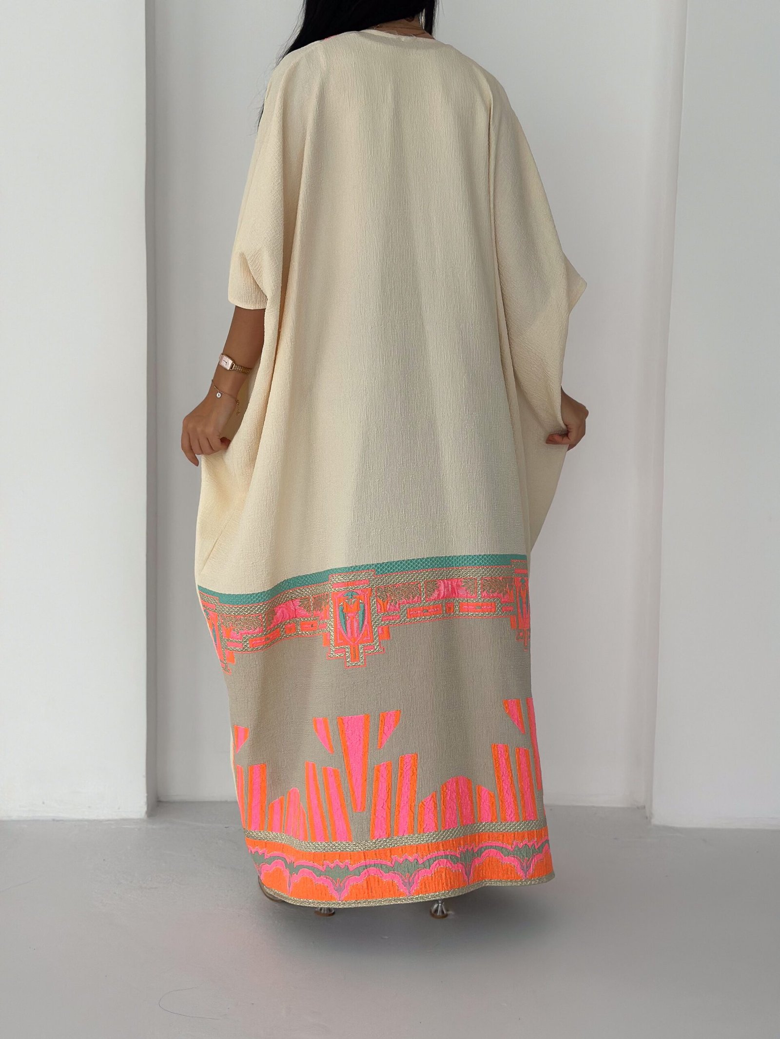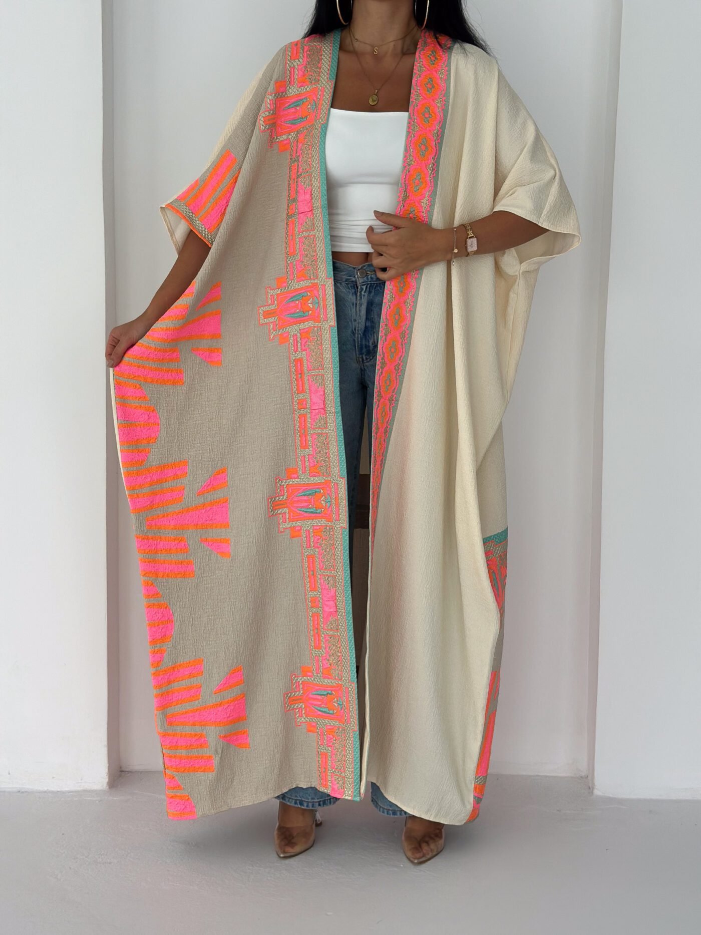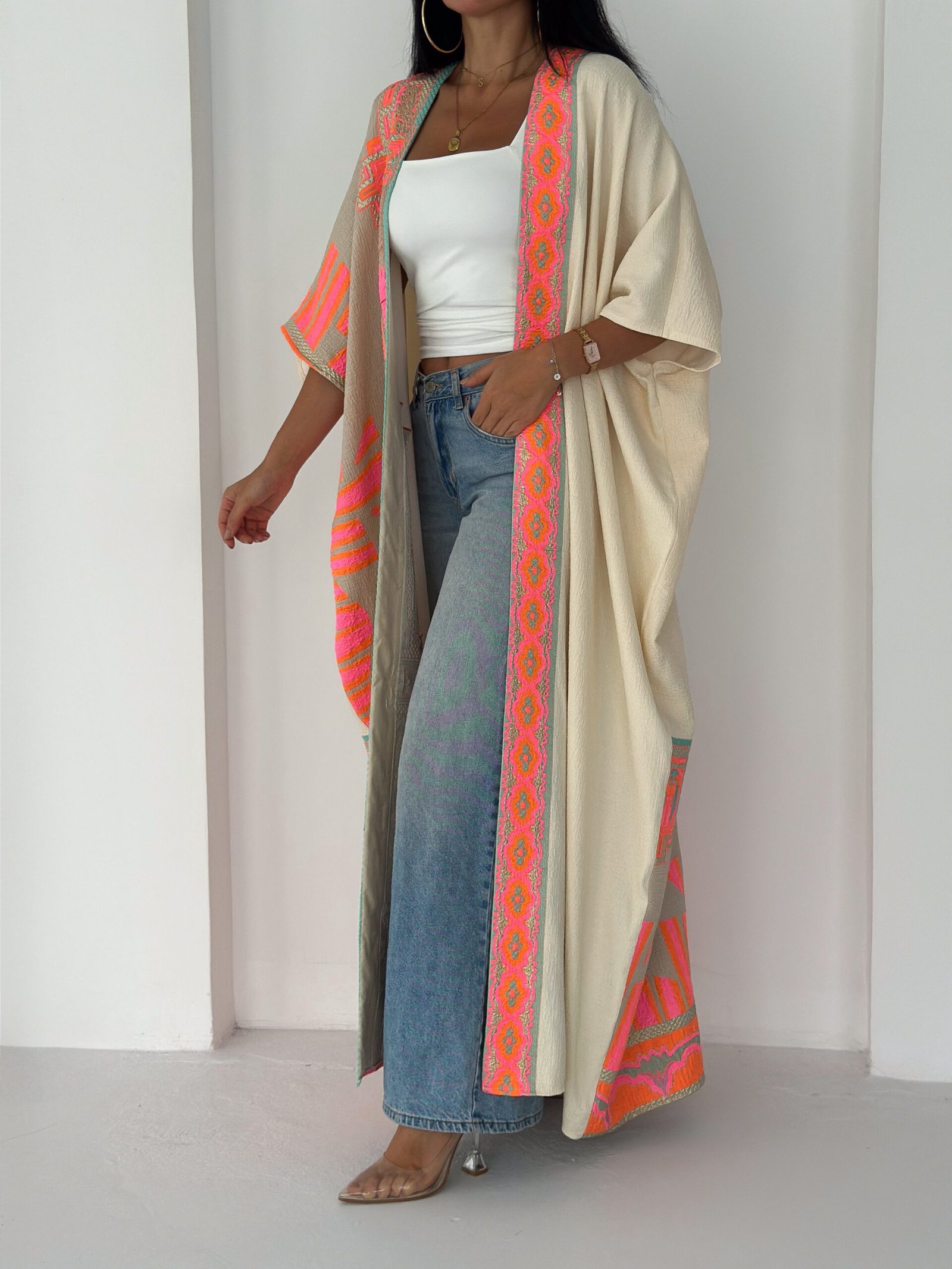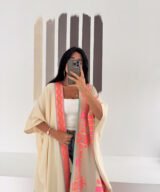 A modern statement abaya designed with vibrant neon embroidery that adds a bold twist to a classic silhouette. Crafted from lightweight textured fabric, this piece flows beautifully and offers effortless elegance for both day and evening looks. Perfect to style casually with denim or dress up for special outings.