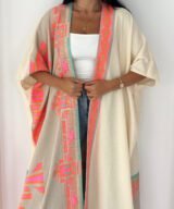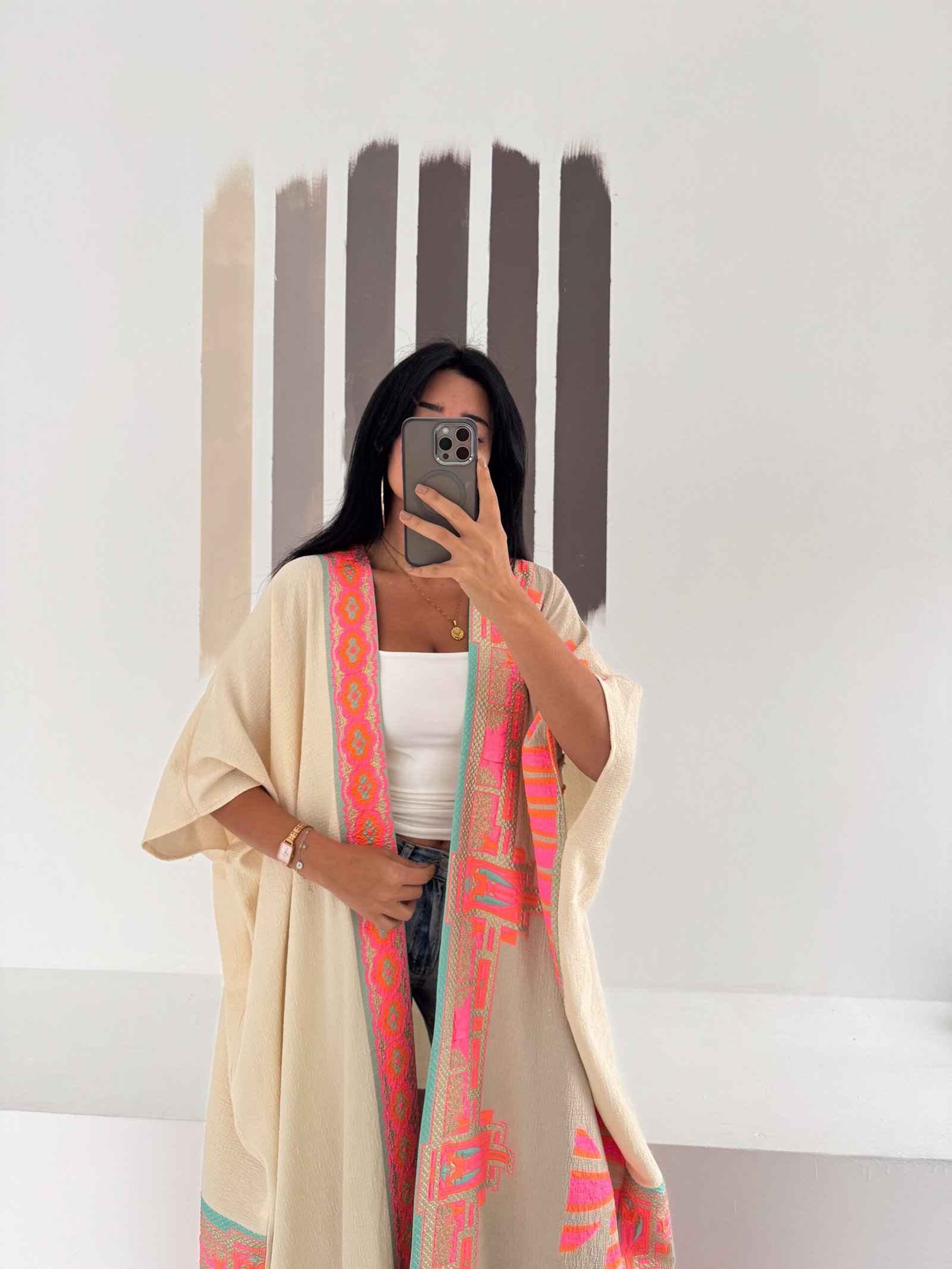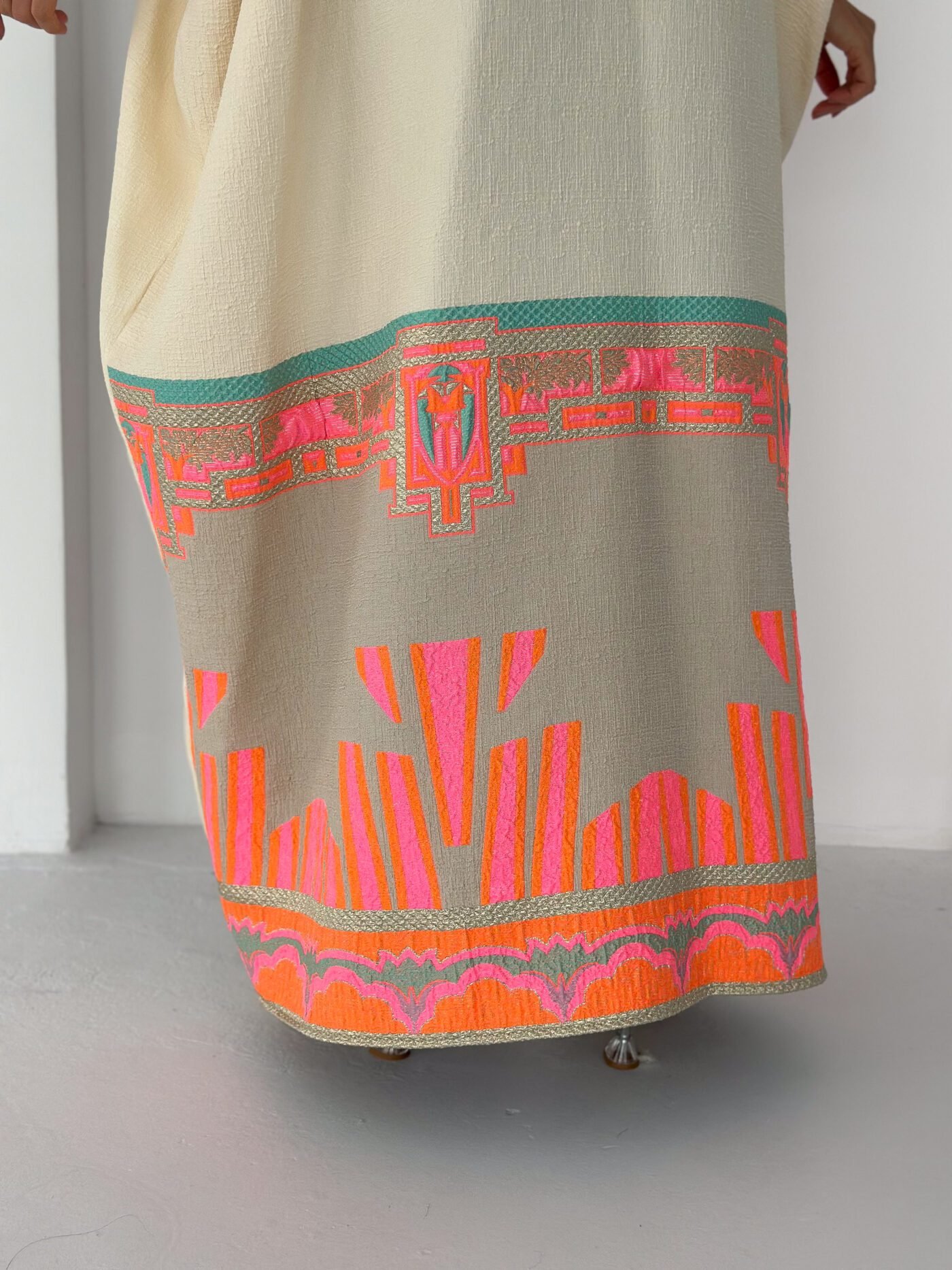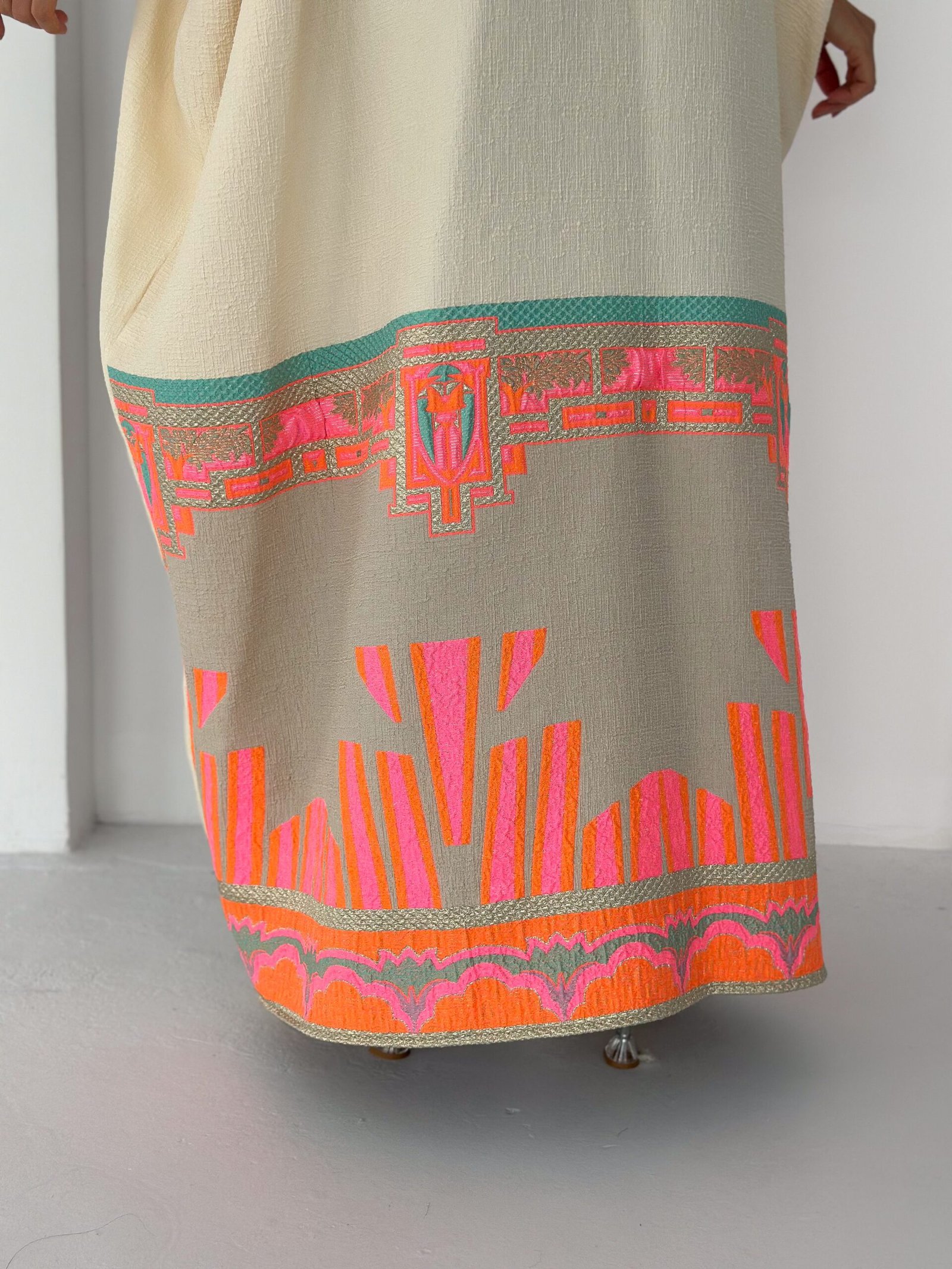 A modern statement abaya designed with vibrant neon embroidery that adds a bold twist to a classic silhouette. Crafted from lightweight textured fabric, this piece flows beautifully and offers effortless elegance for both day and evening looks. Perfect to style casually with denim or dress up for special outings.