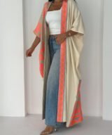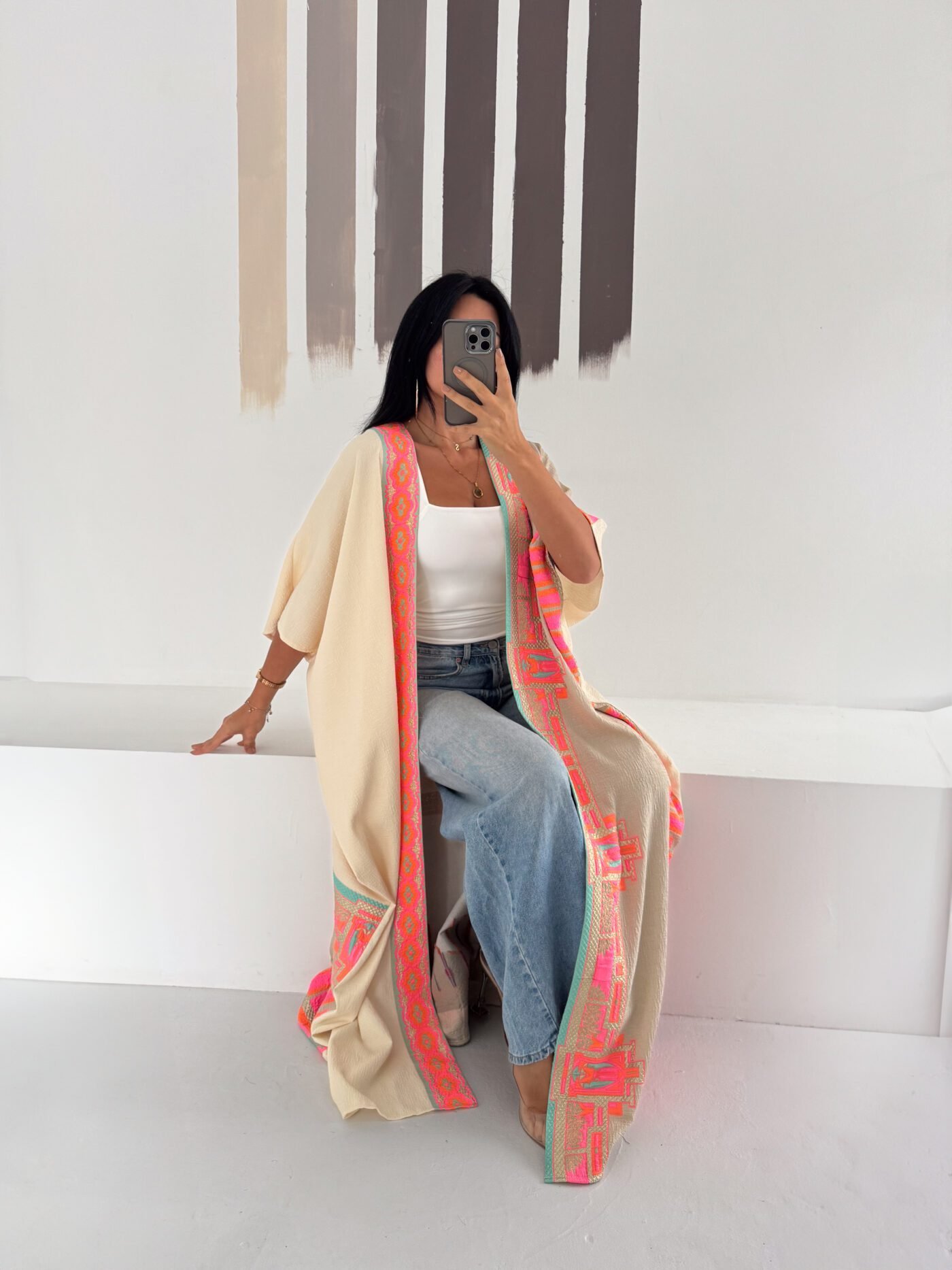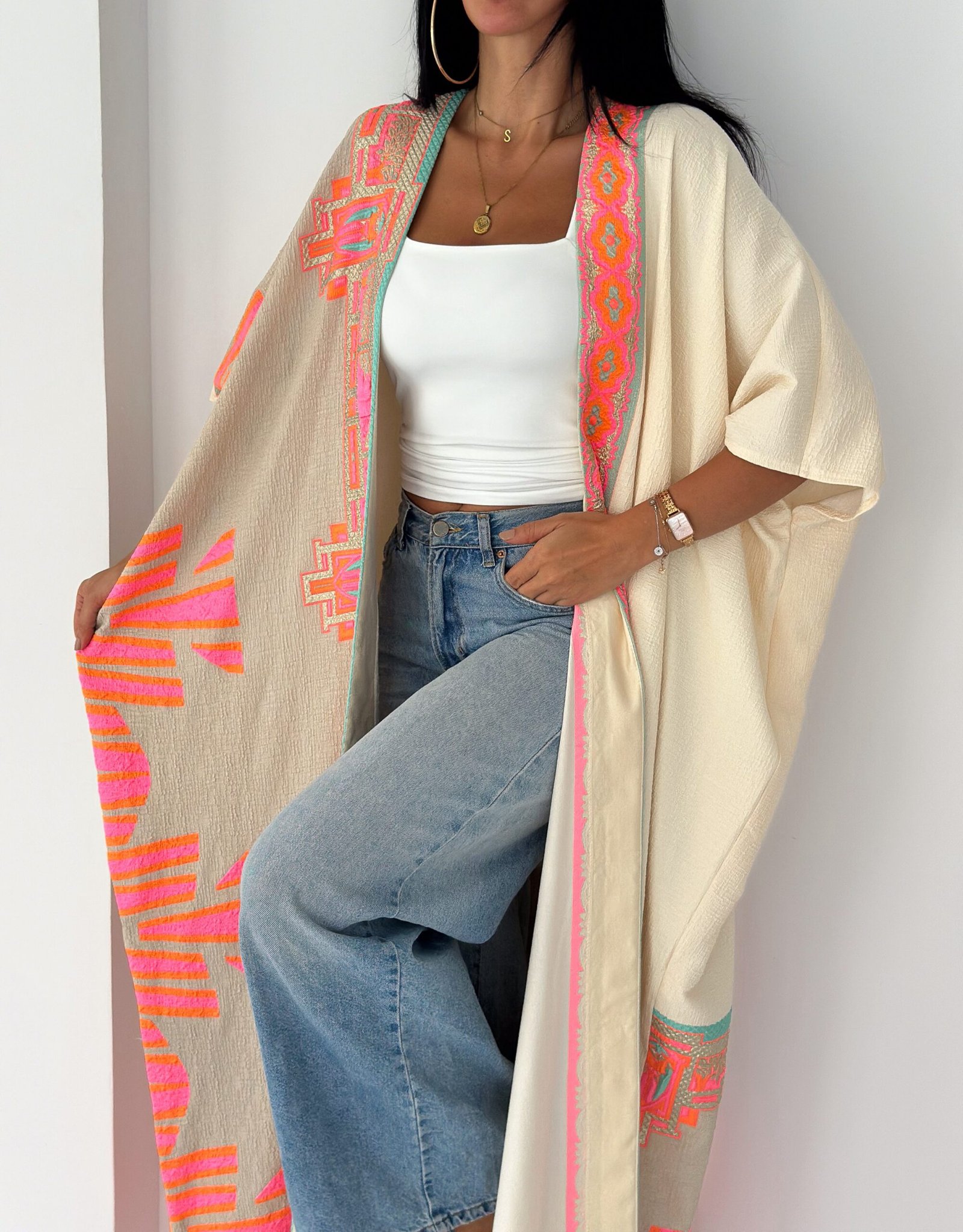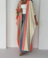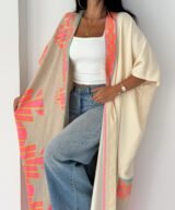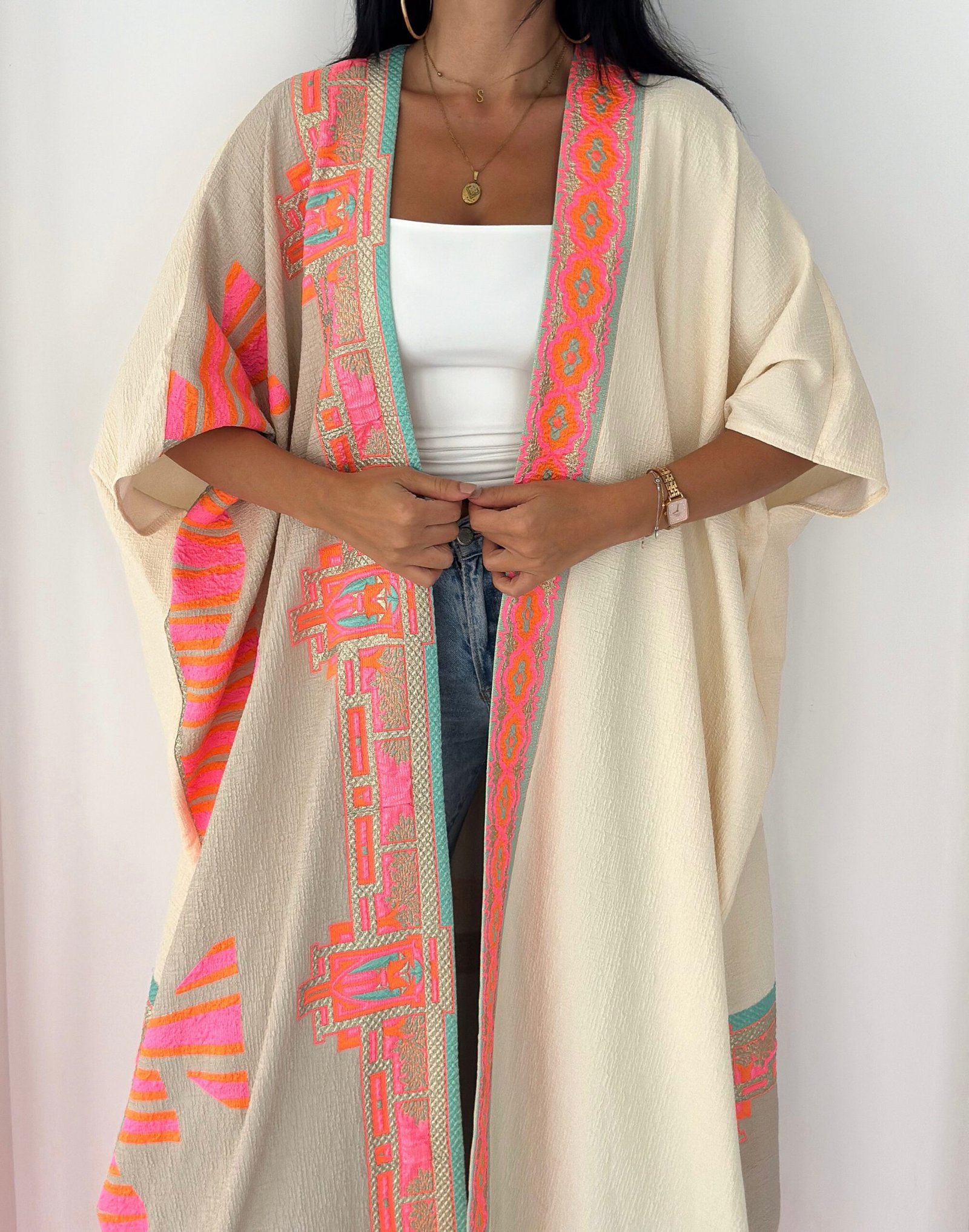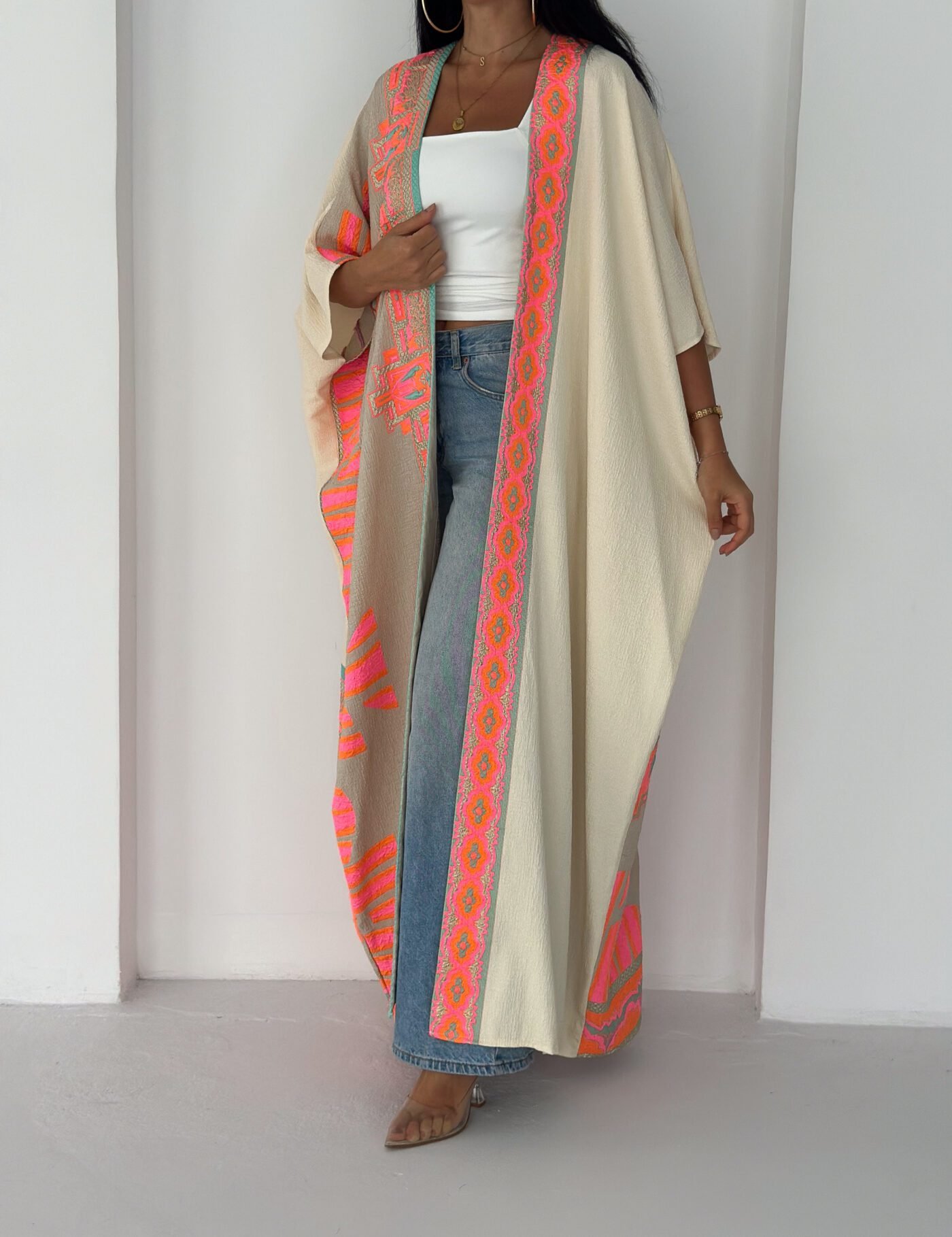A modern statement abaya designed with vibrant neon embroidery that adds a bold twist to a classic silhouette. Crafted from lightweight textured fabric, this piece flows beautifully and offers effortless elegance for both day and evening looks. Perfect to style casually with denim or dress up for special outings.